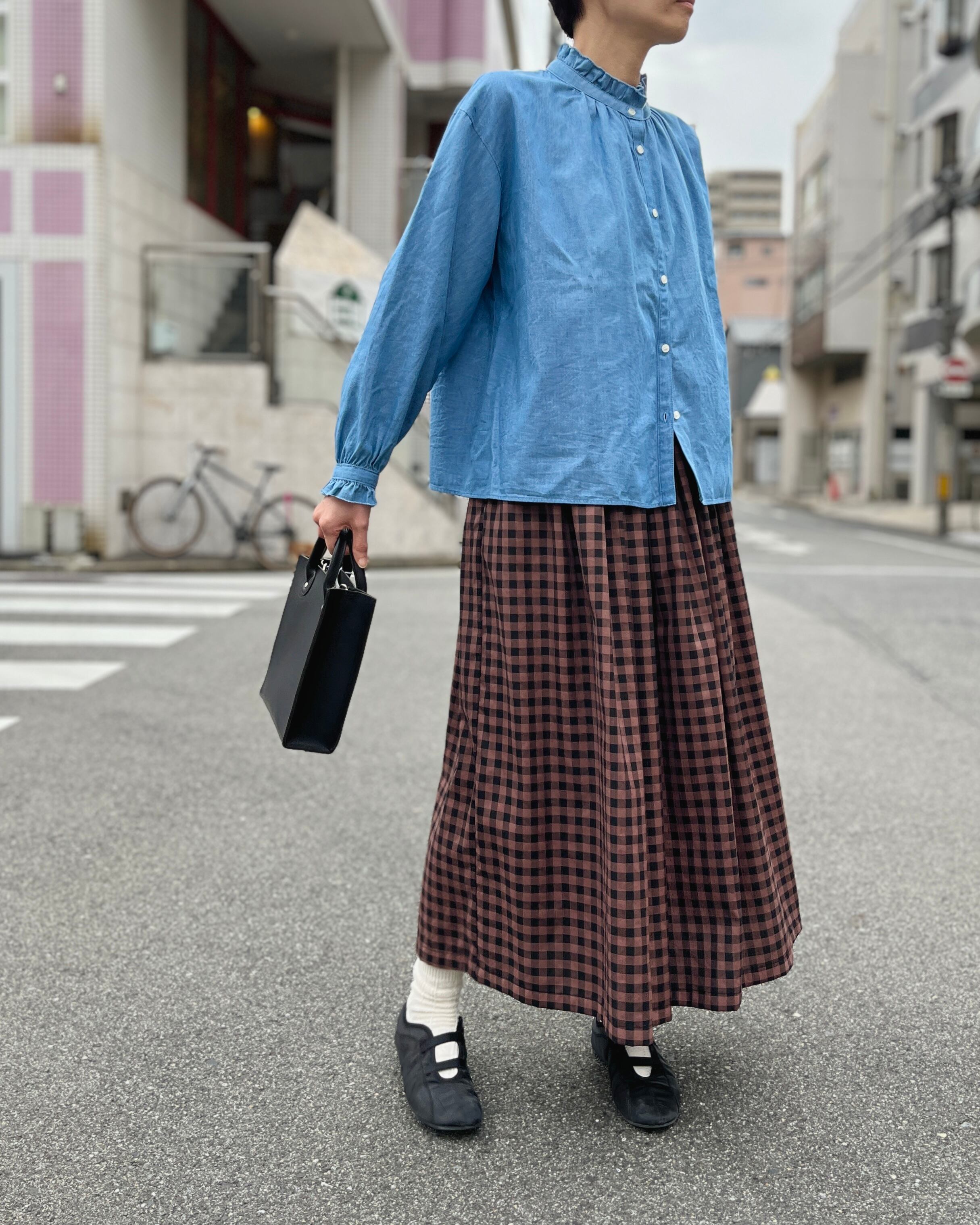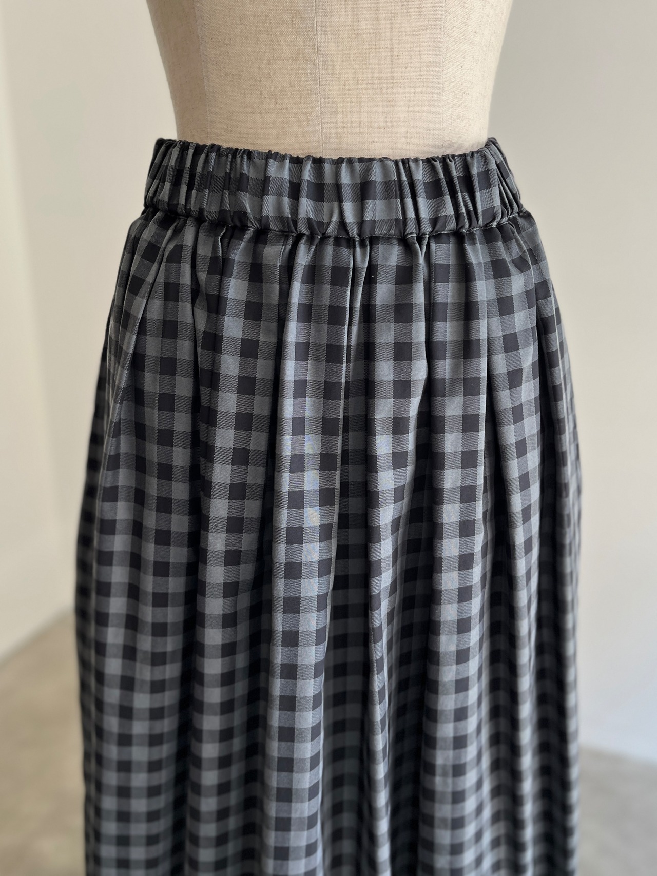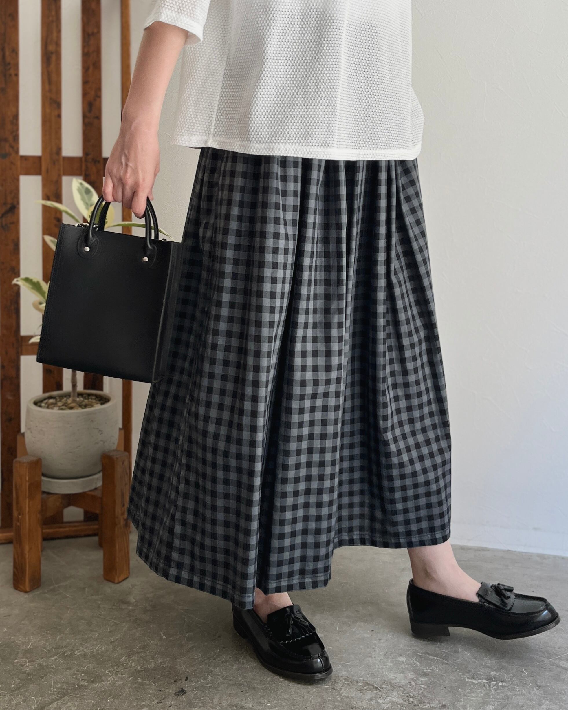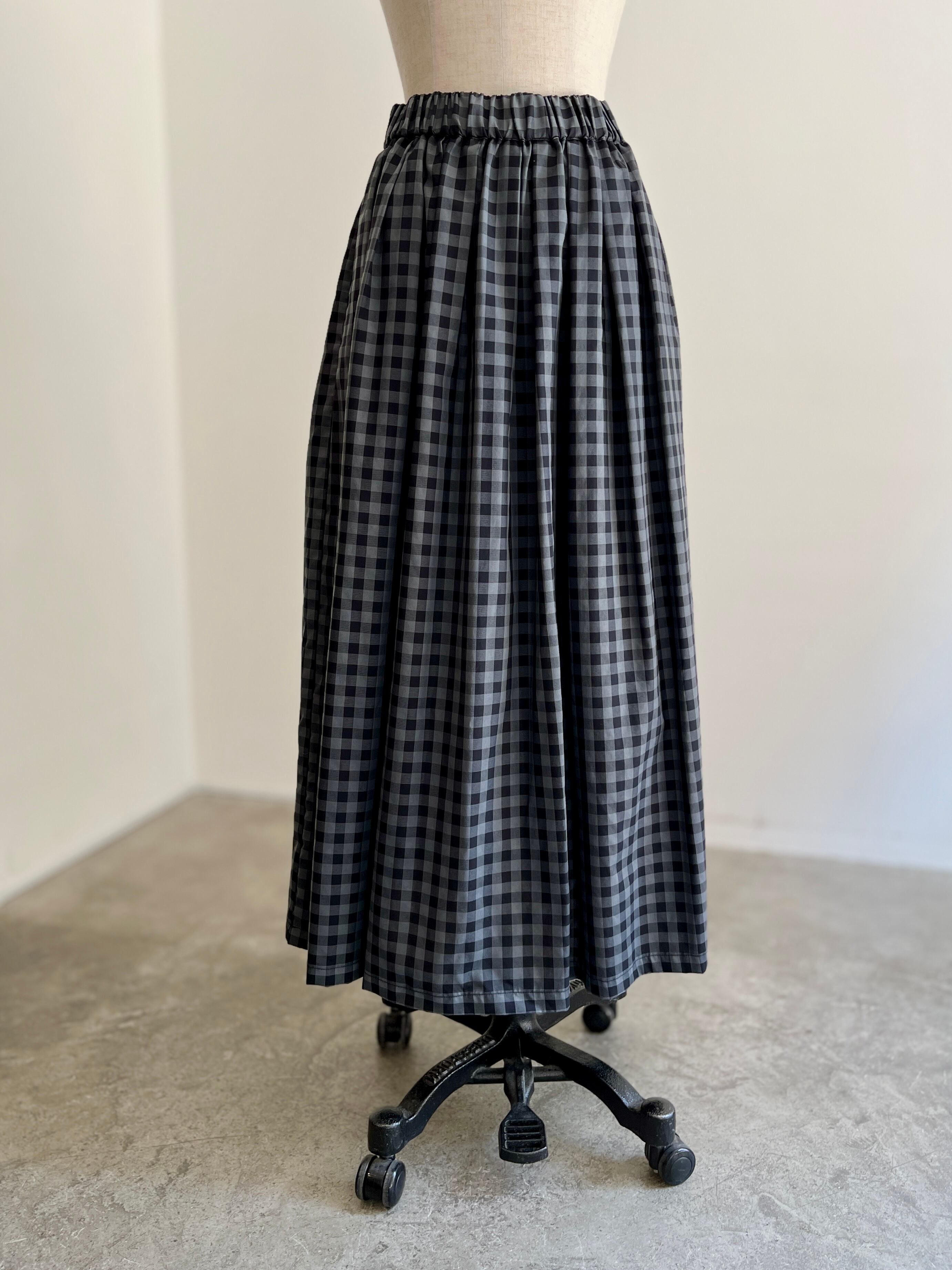 ダークカラーのチェック生地で作ったボリュームたっぷりのタックスカート。