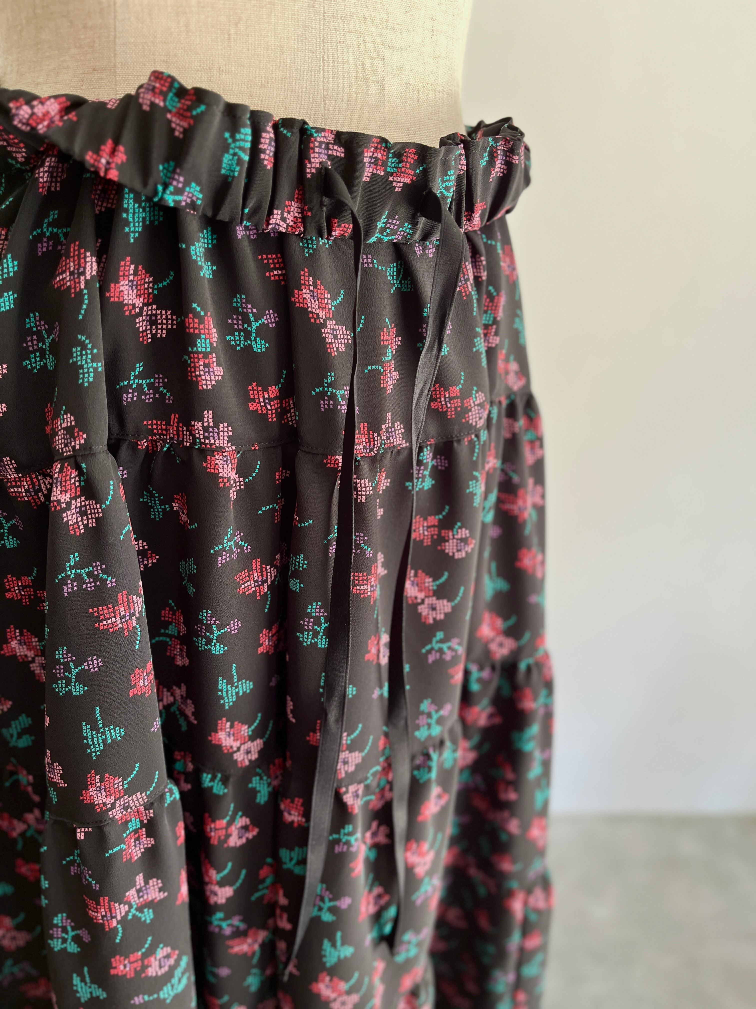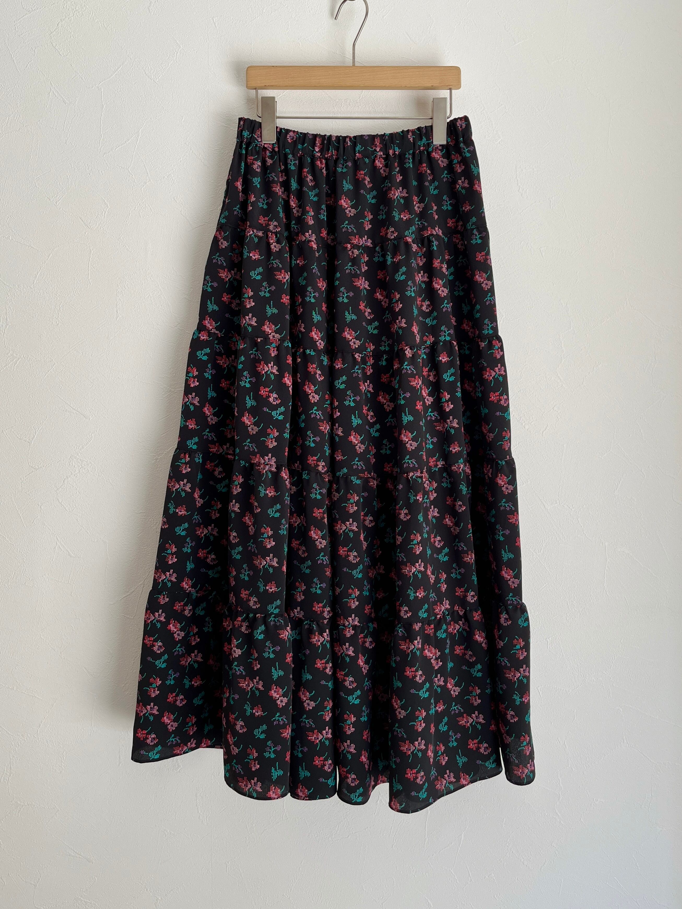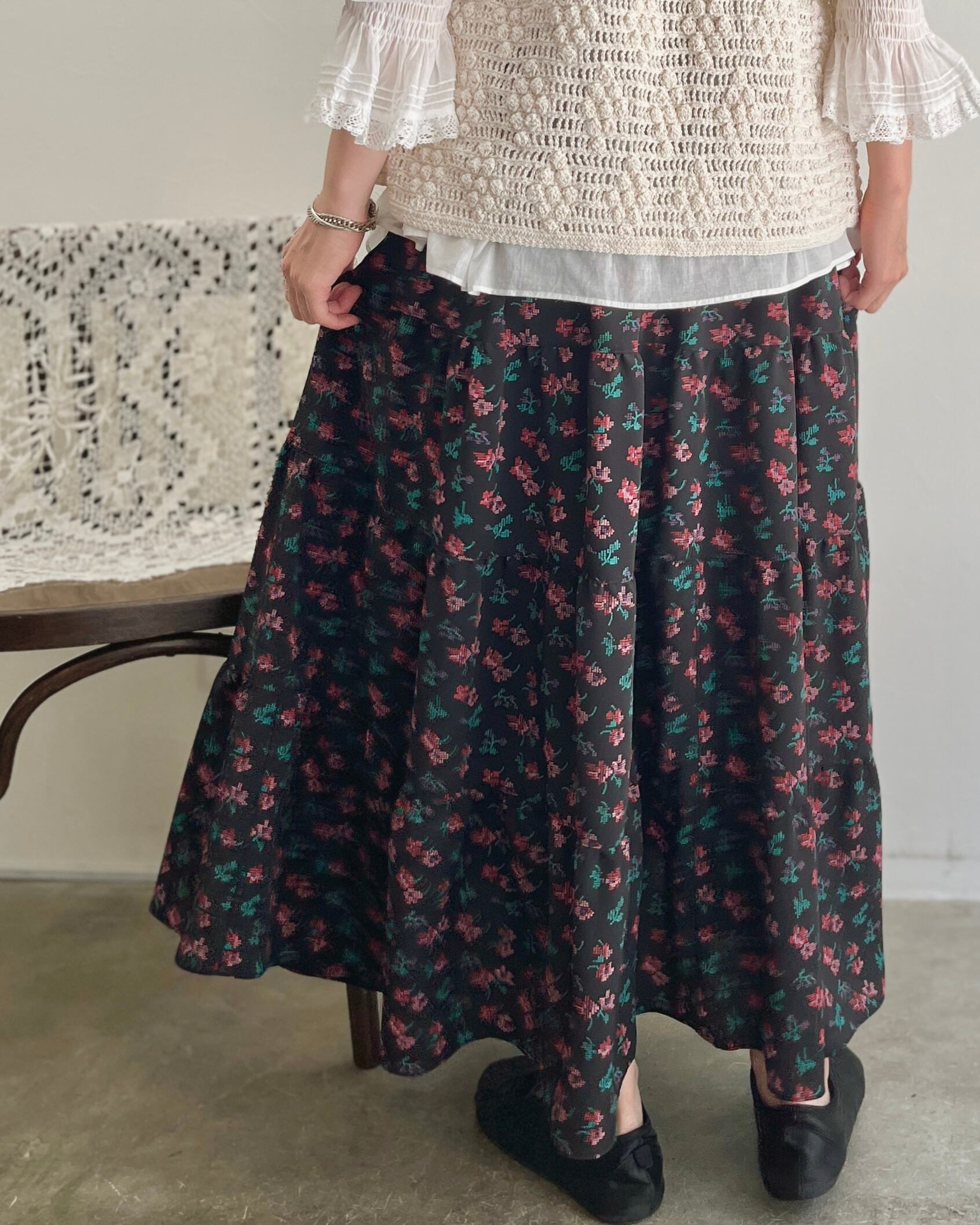 クロスステッチのような花柄がノスタルジックな雰囲気のティアードスカート。
