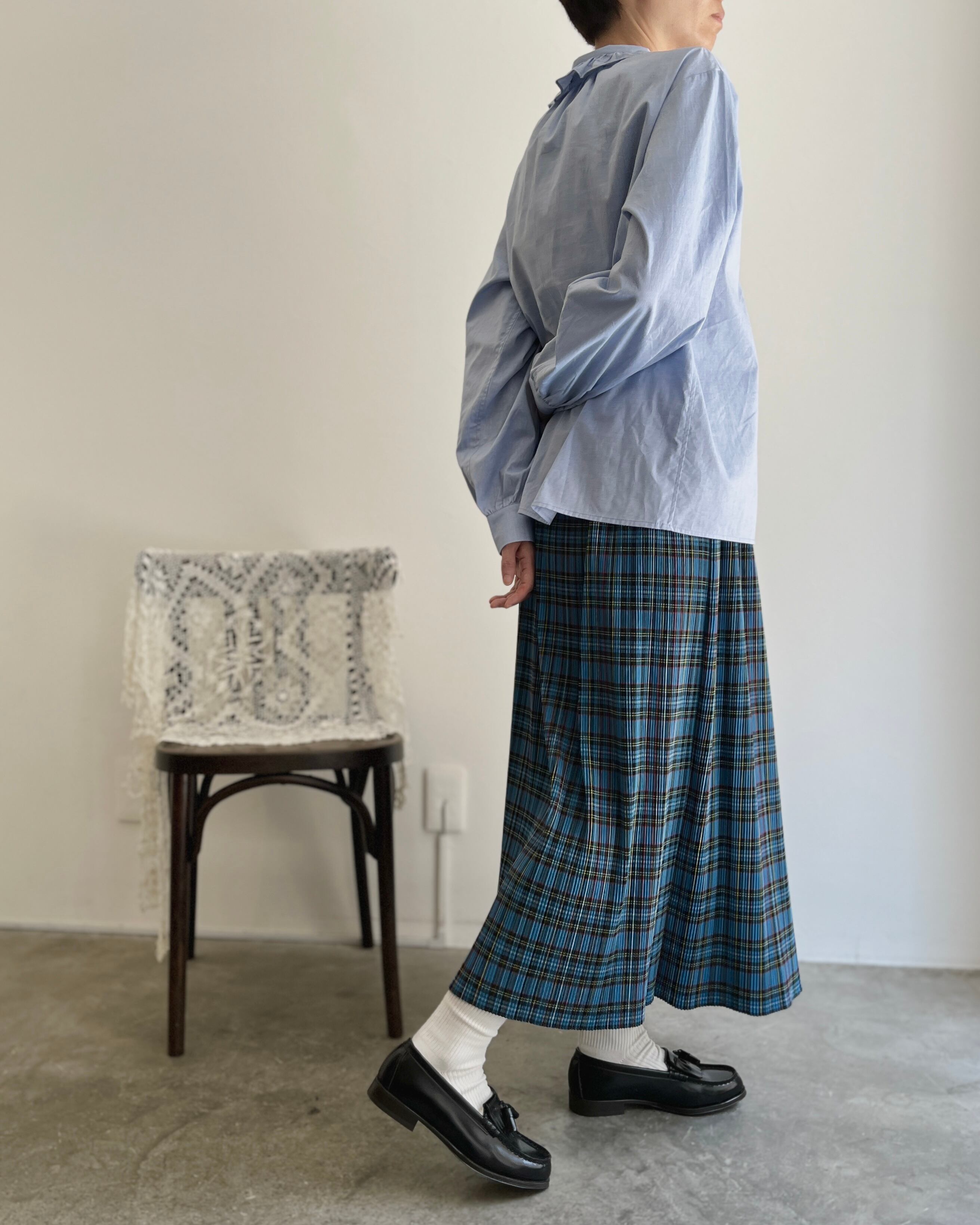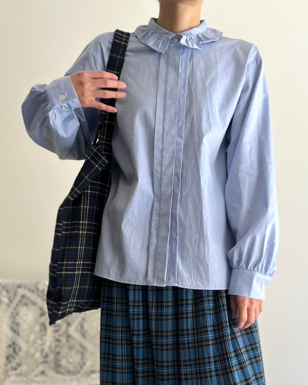 甘くなりすぎないよう衿は離れ気味に、ボディのフロントには大きめのタックを入れてすっきりとした印象に仕上げられています。