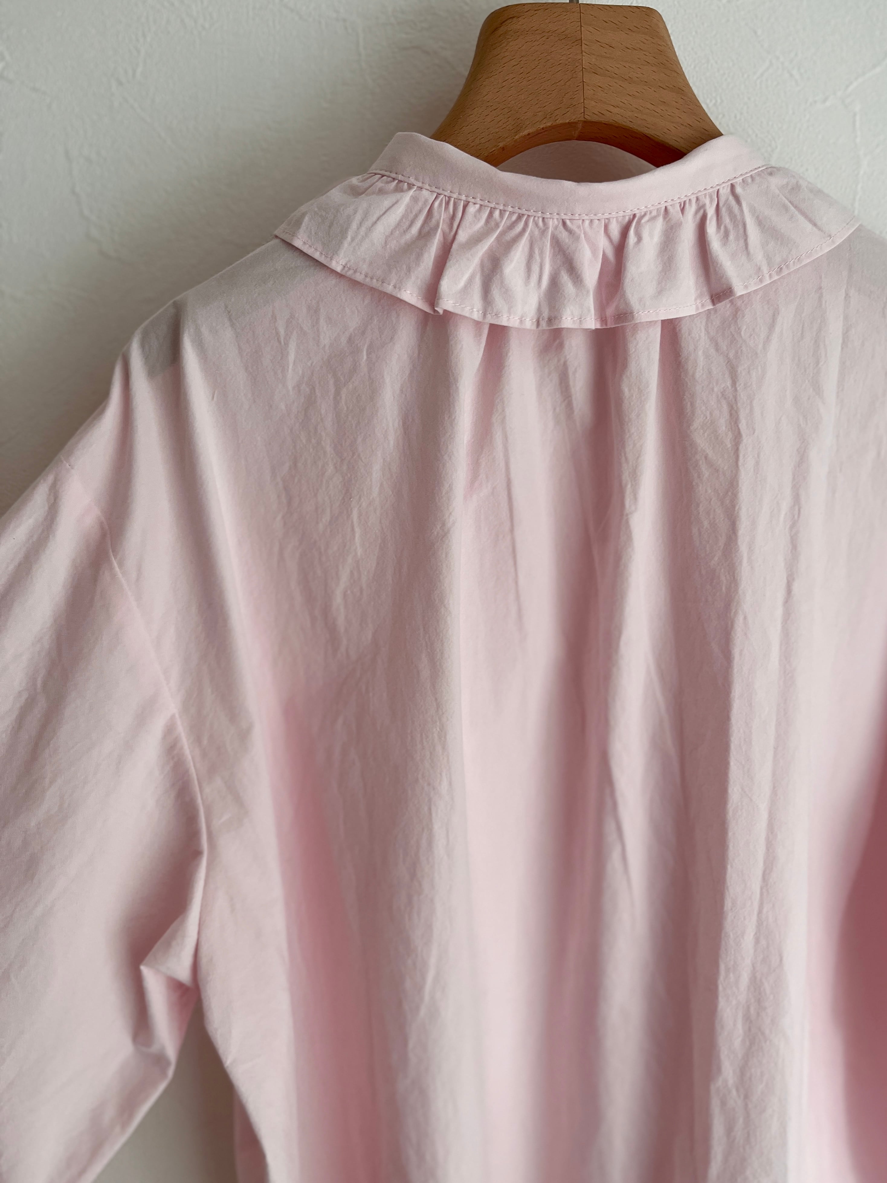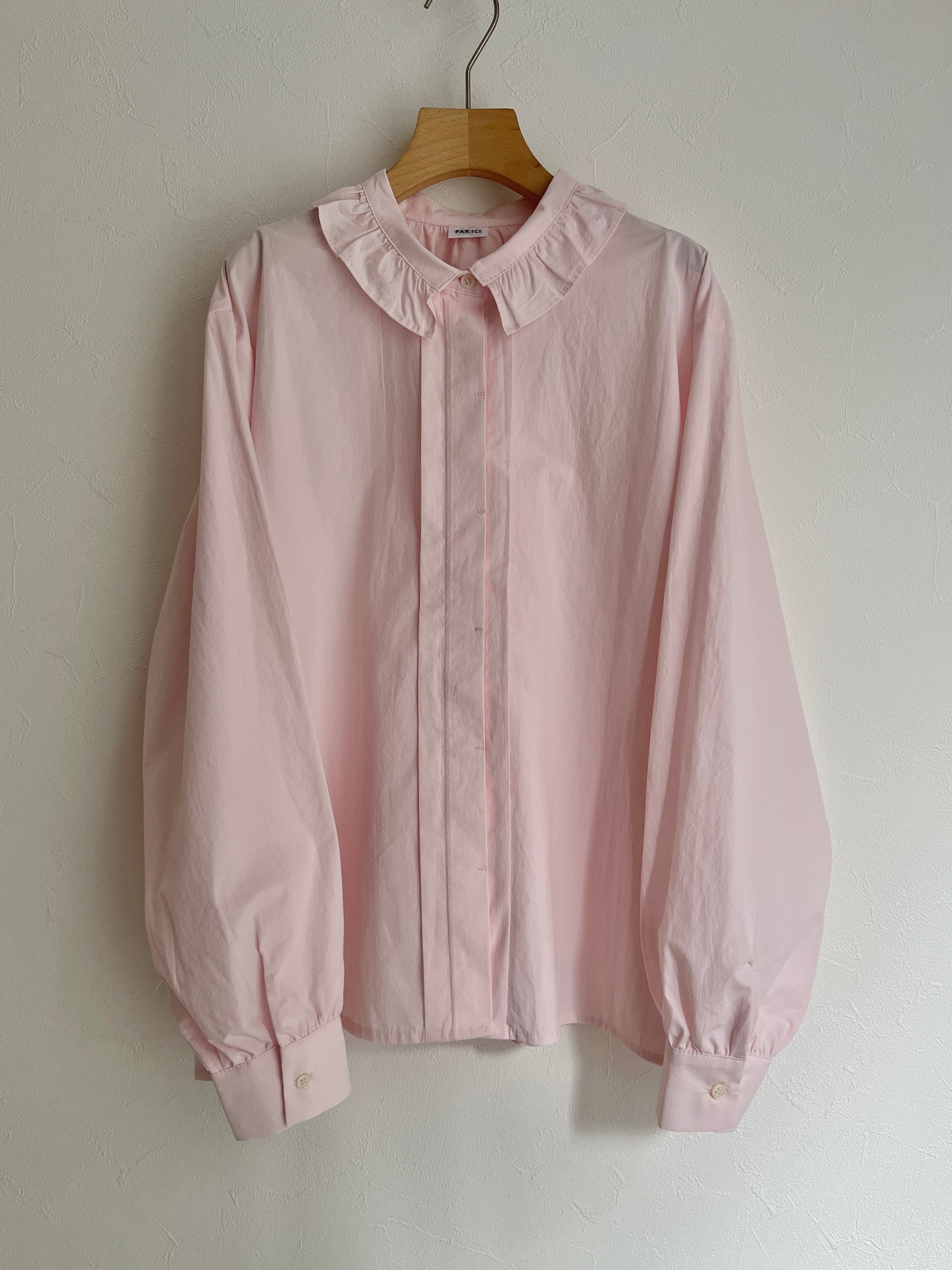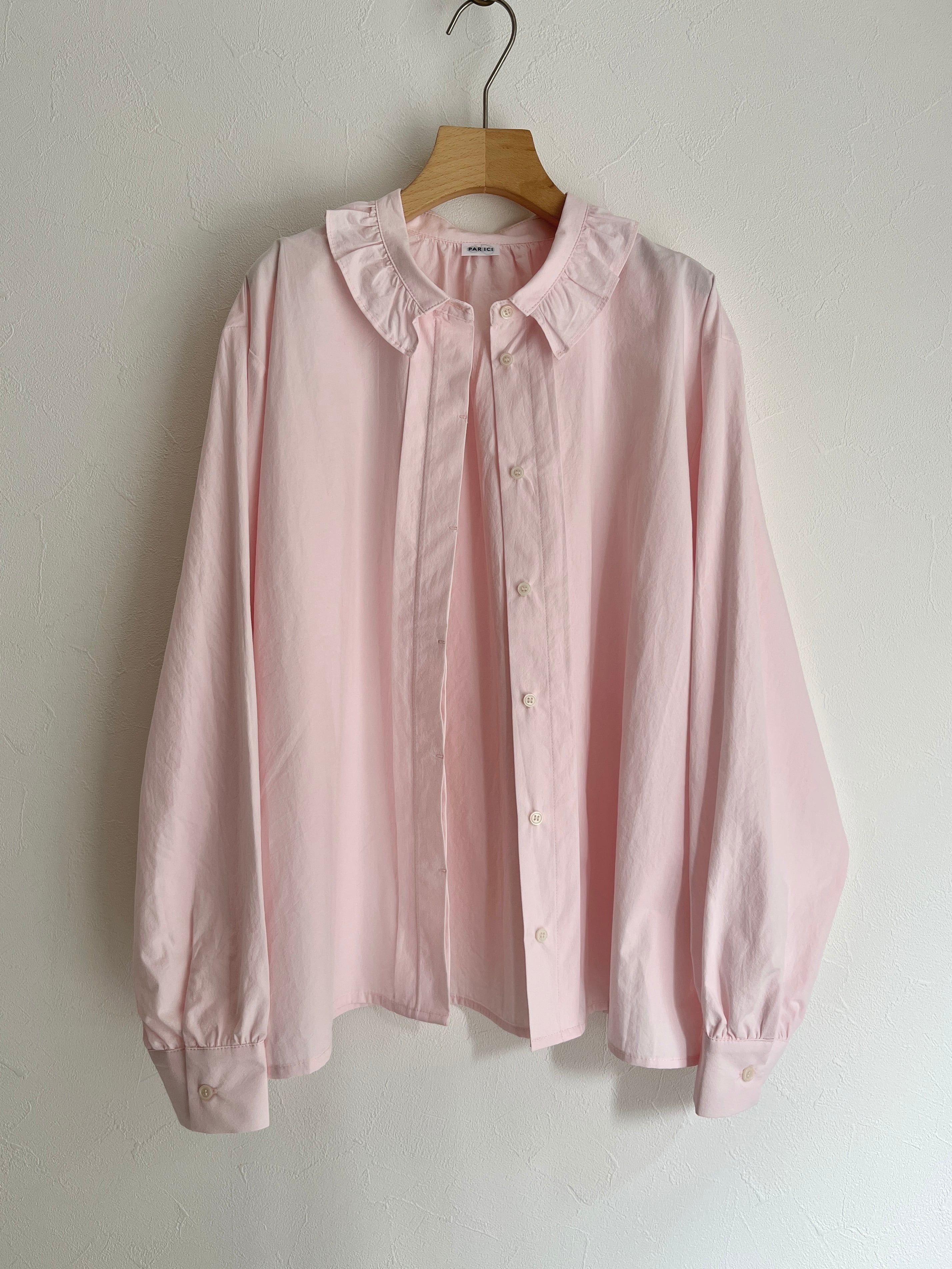 甘くなりすぎないよう衿は離れ気味に、ボディのフロントには大きめのタックを入れてすっきりとした印象に仕上げられています。
