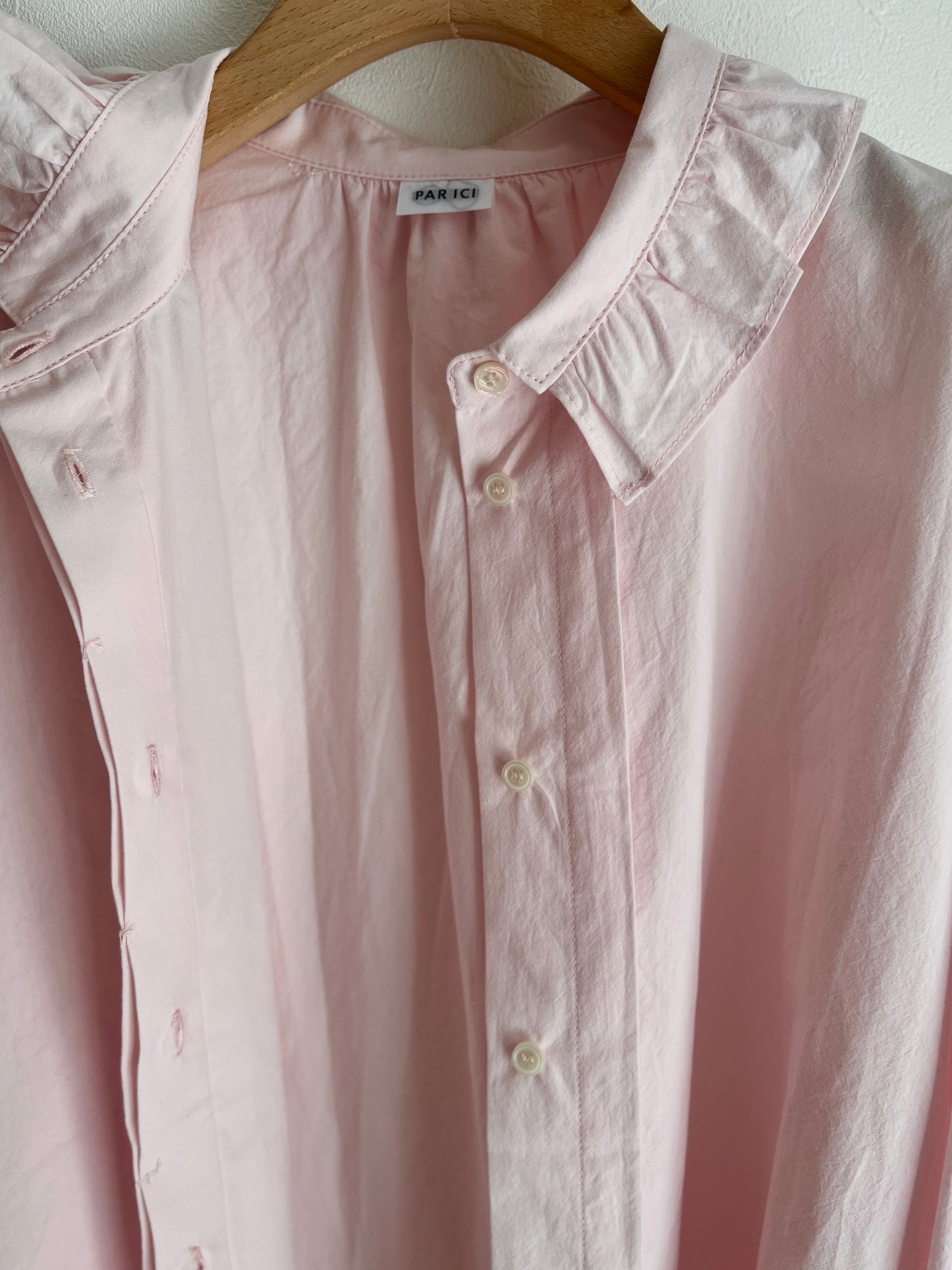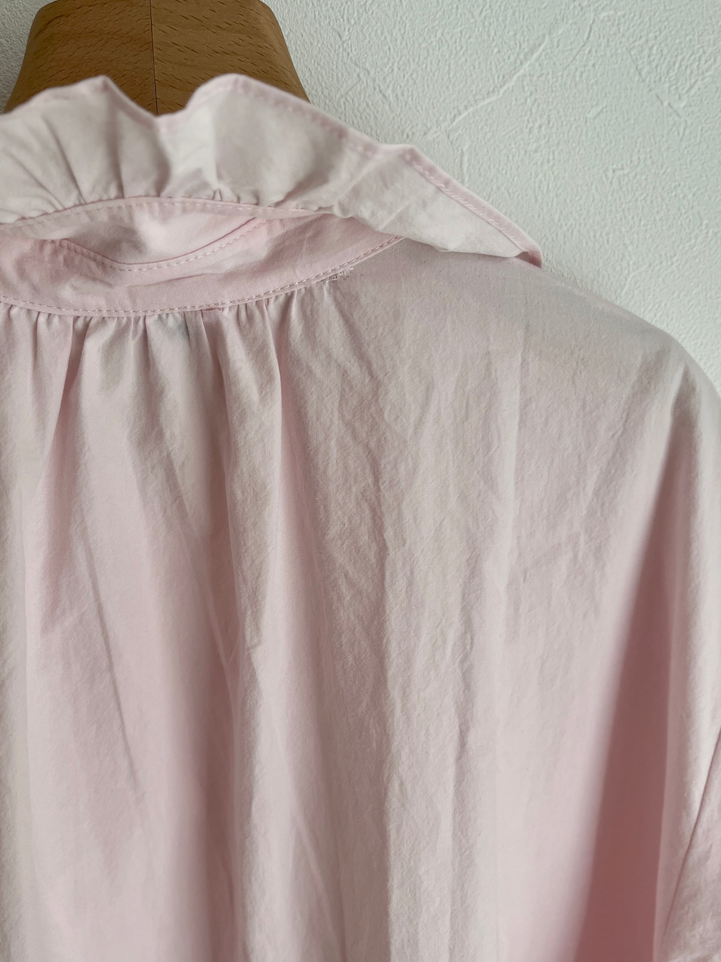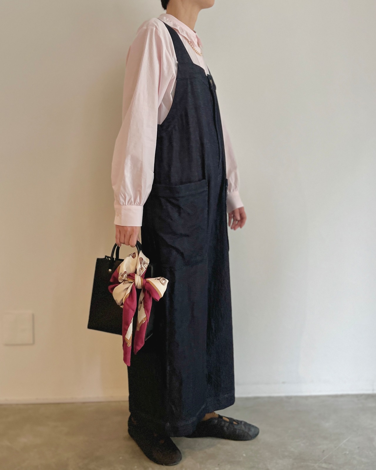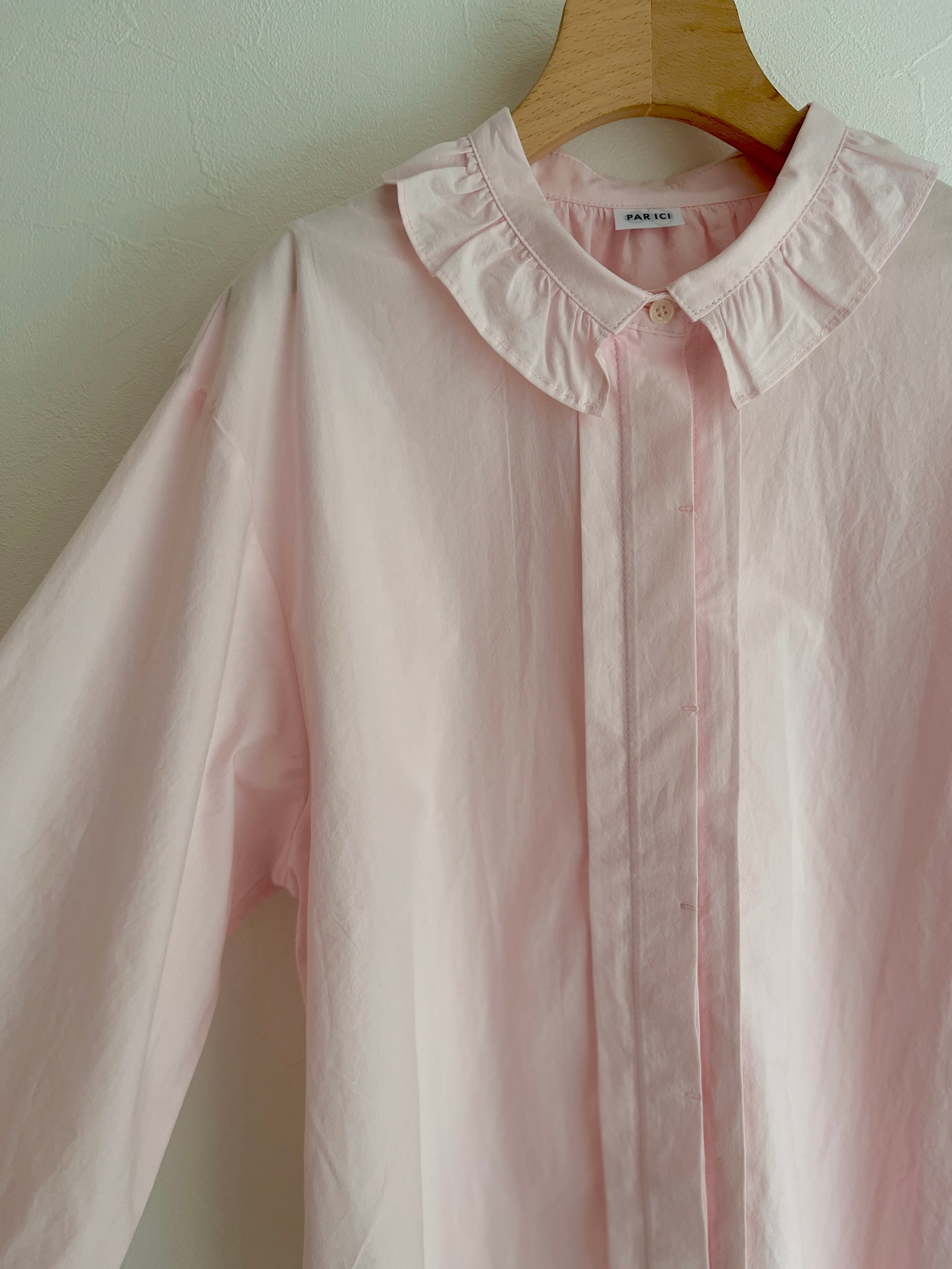 甘くなりすぎないよう衿は離れ気味に、ボディのフロントには大きめのタックを入れてすっきりとした印象に仕上げられています。
