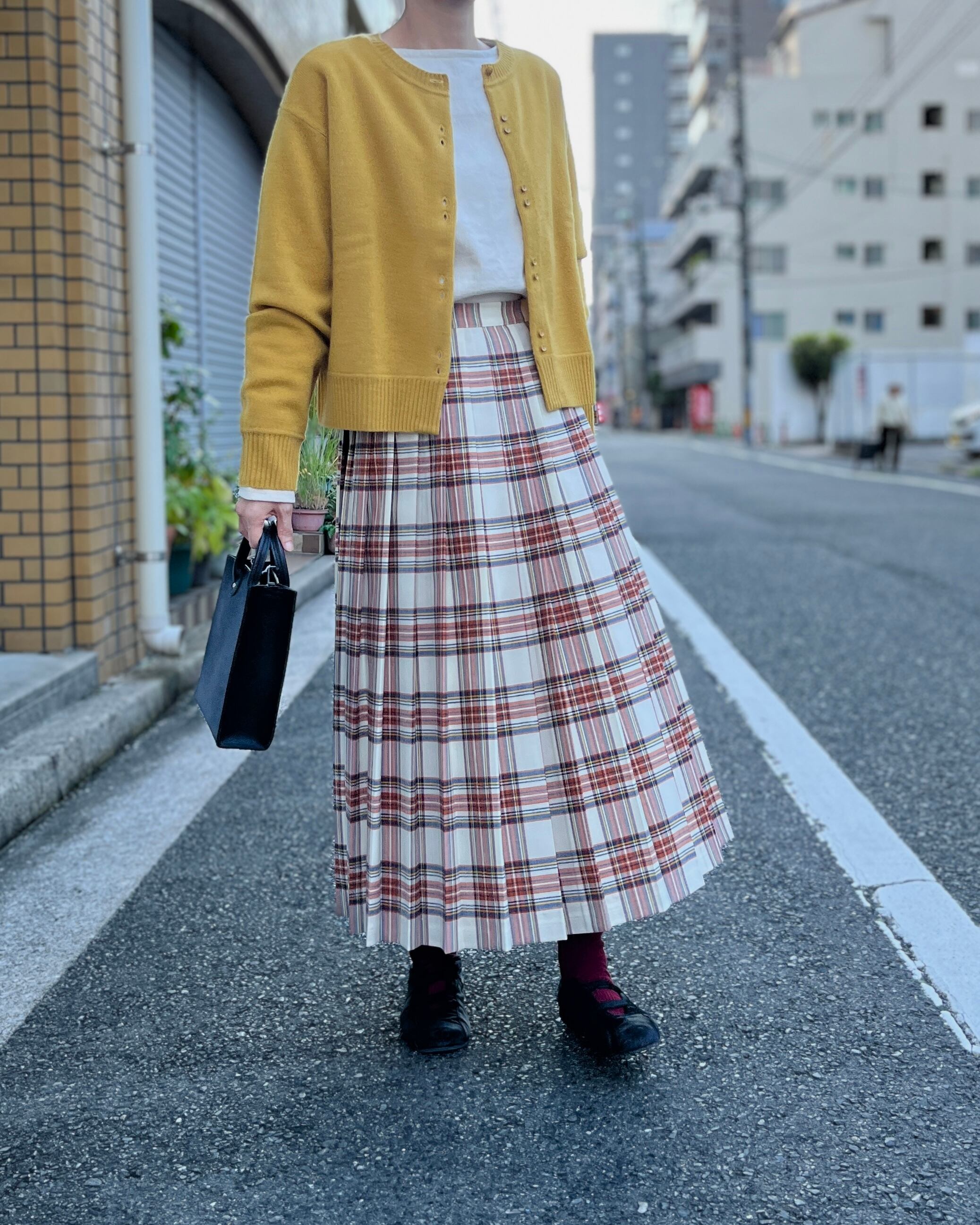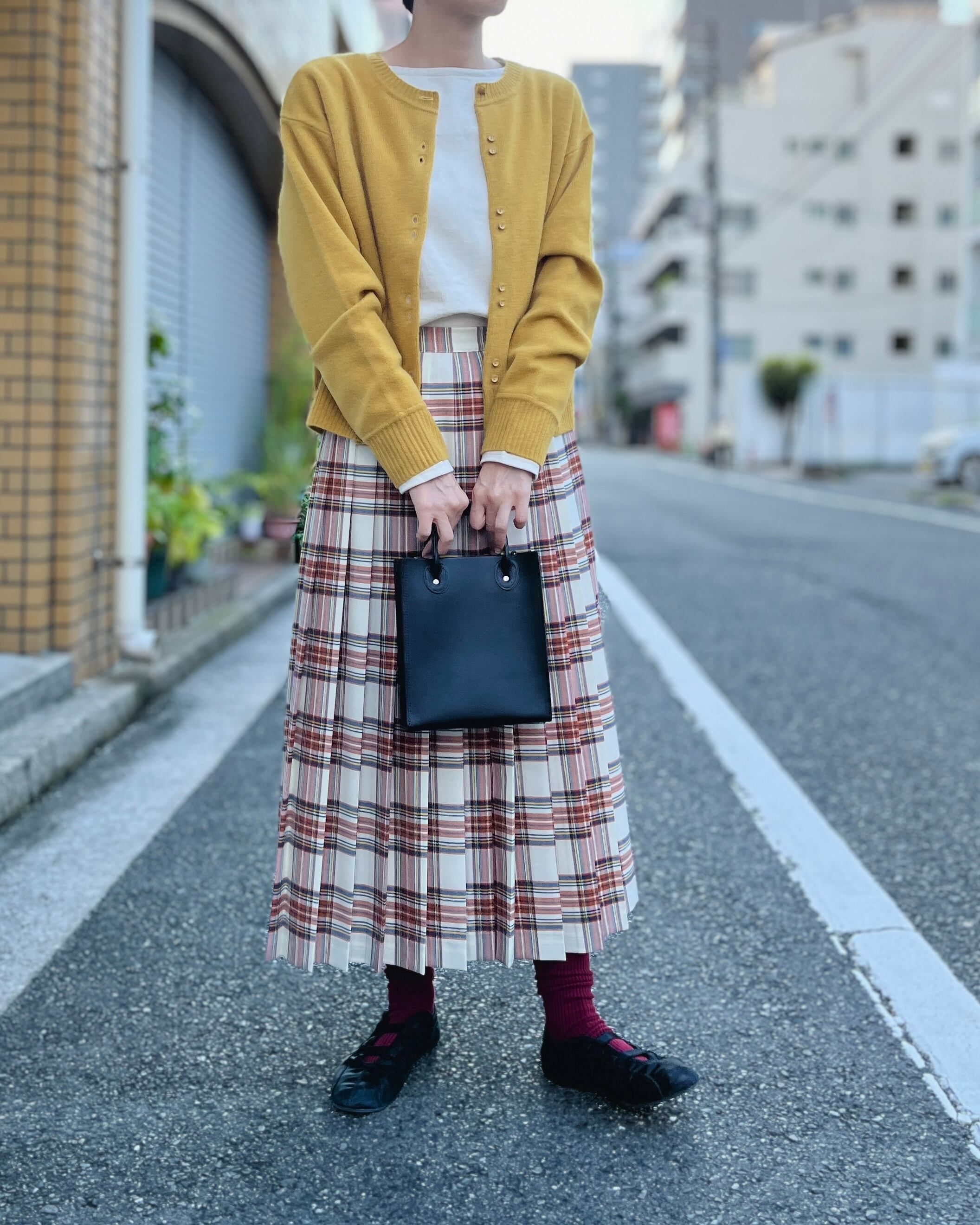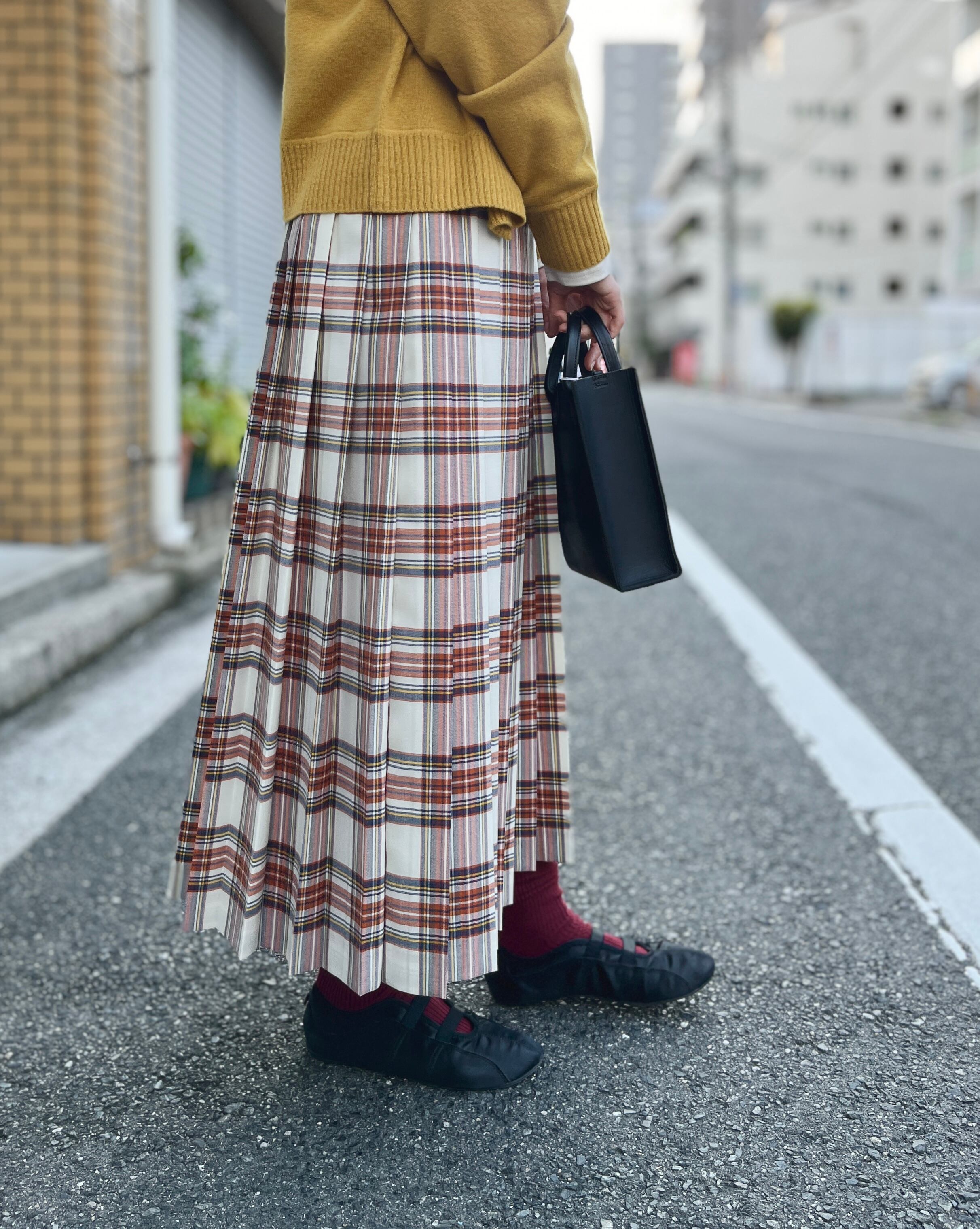 きちんと感のあるプリーツと、ちょうど足首が見える丈感ですっきりとした印象に仕上げました。