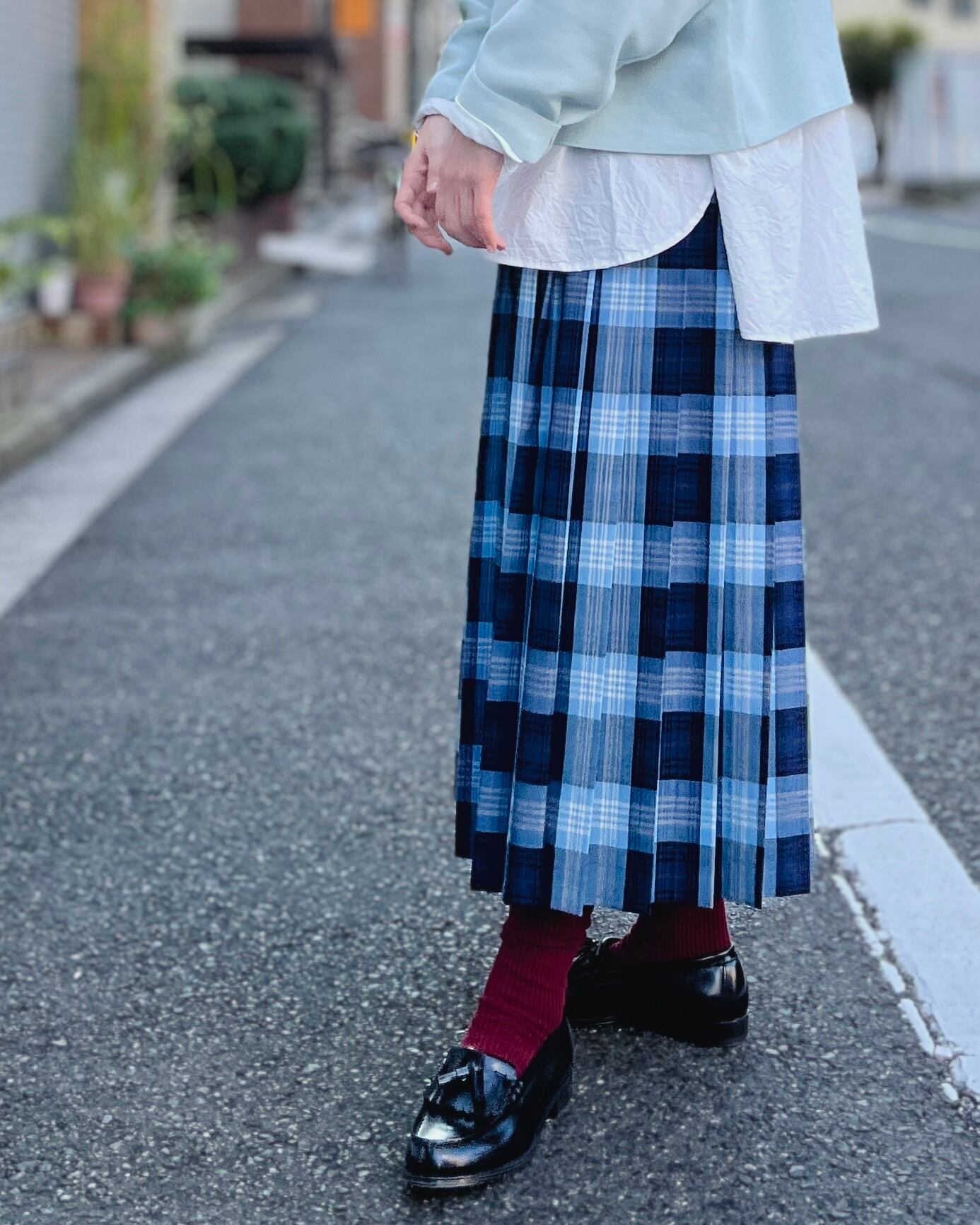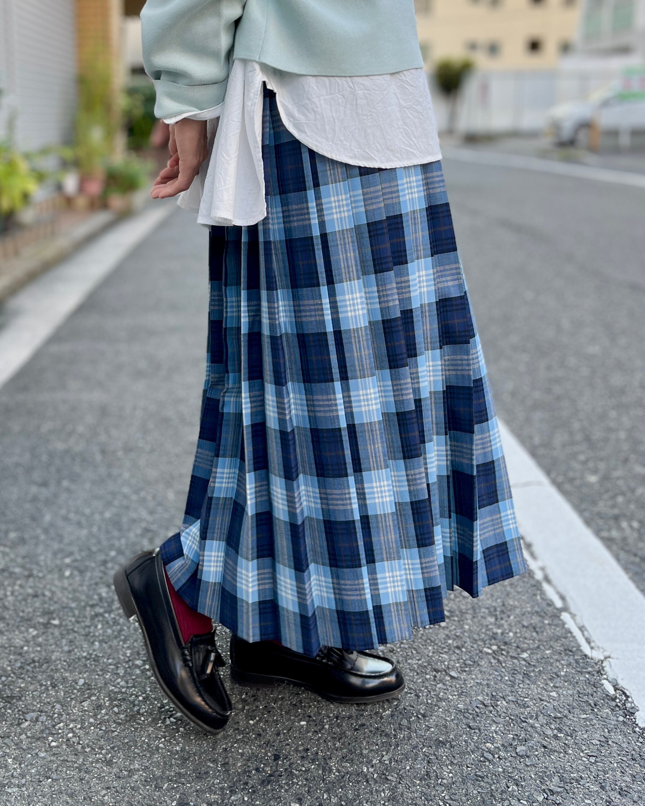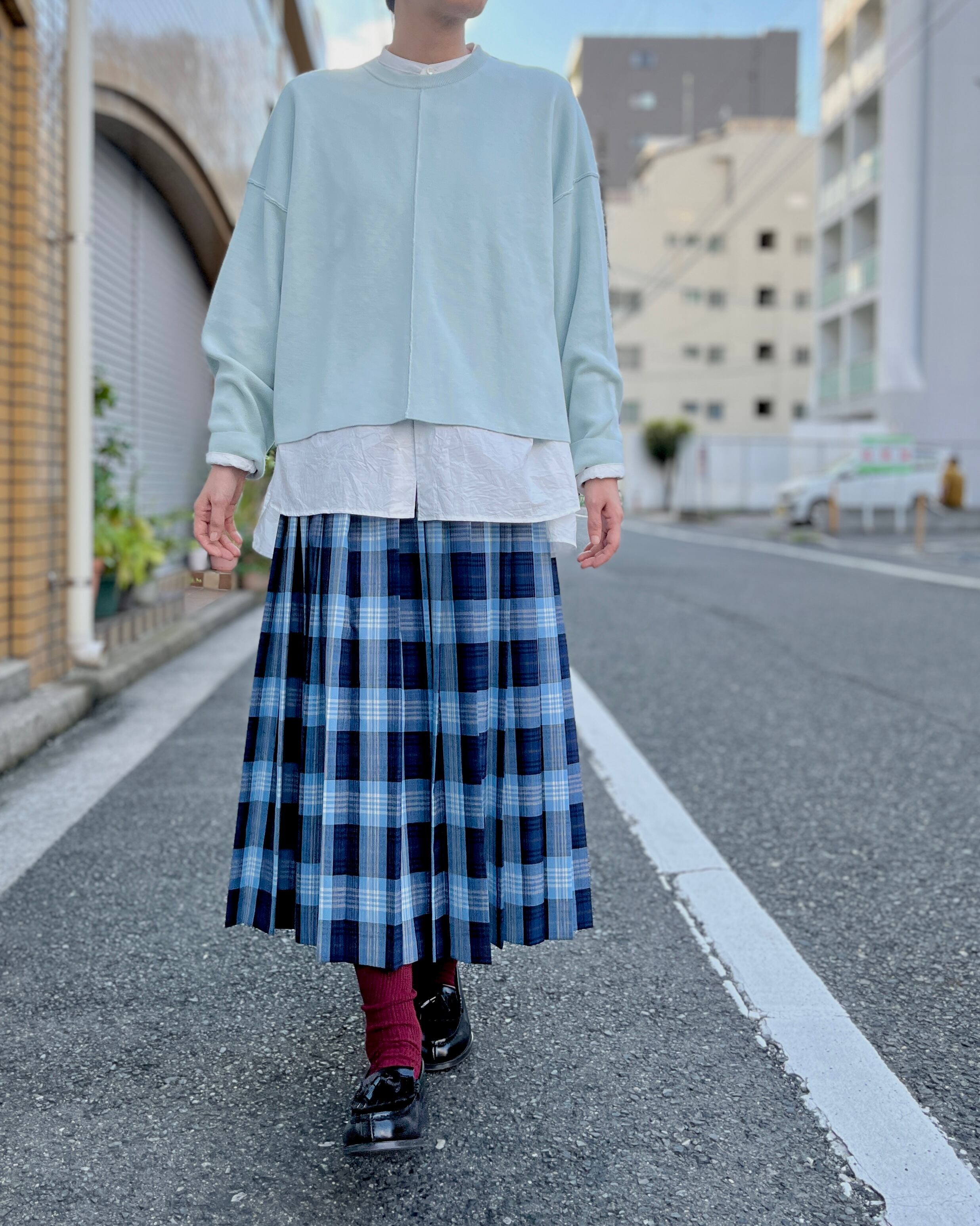 きちんと感のあるプリーツと、ちょうど足首が見える丈感ですっきりとした印象に仕上げました。