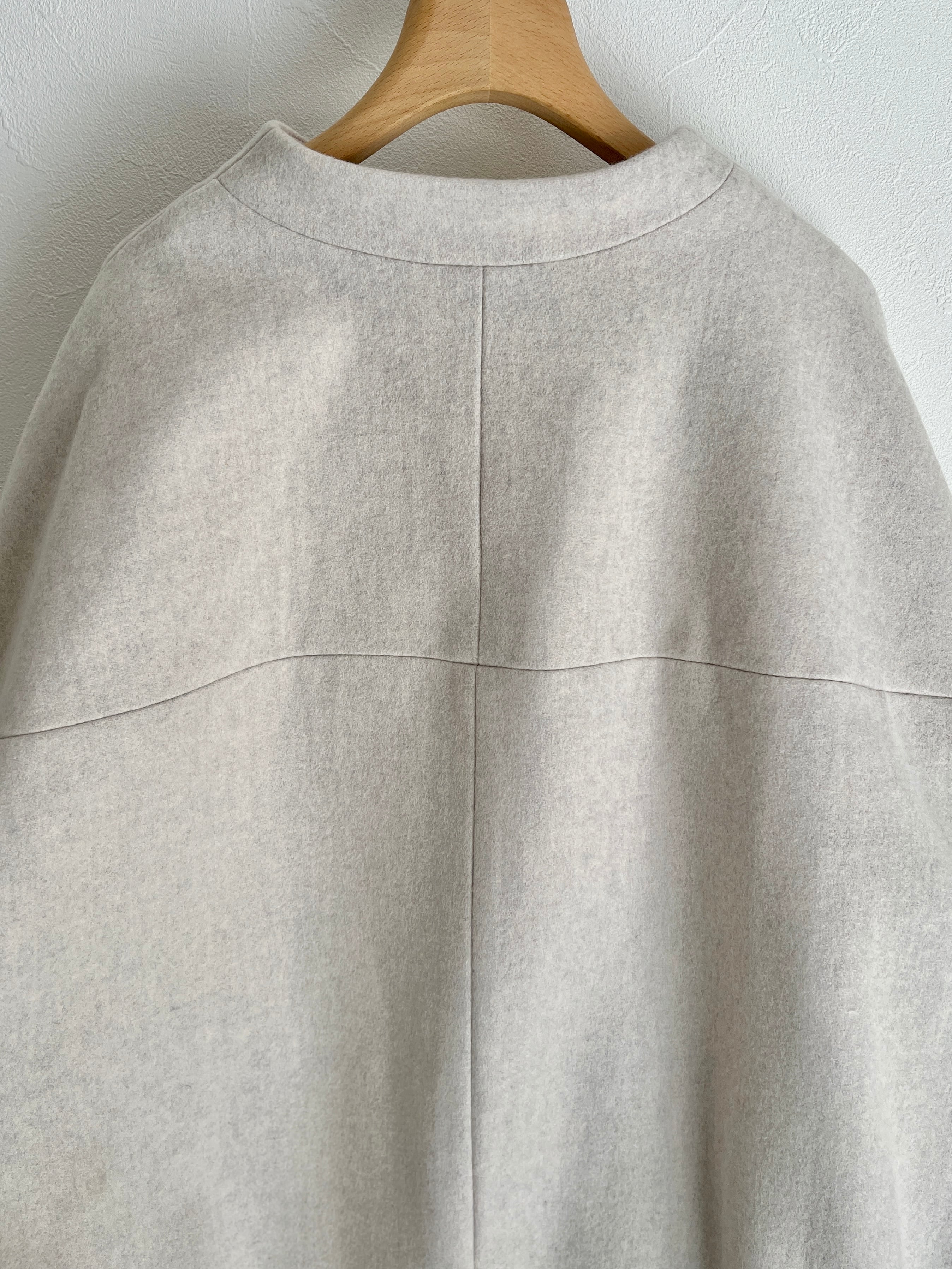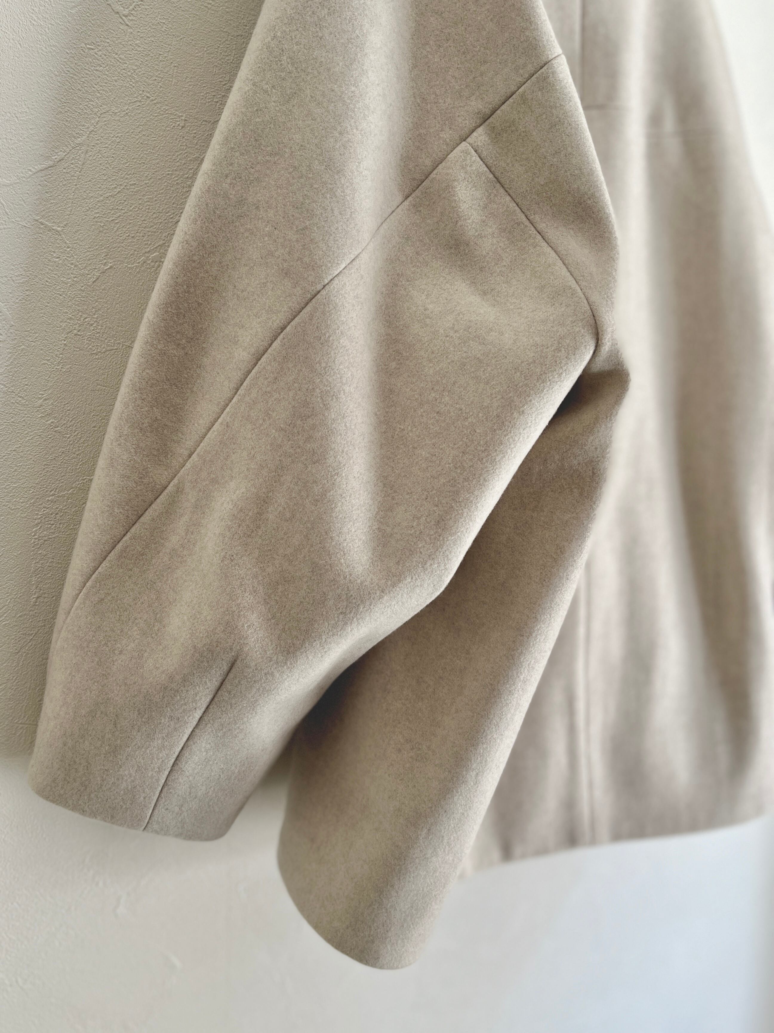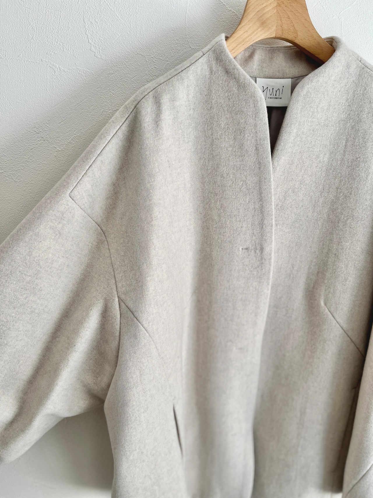 繊維の長いウールを贅沢に使用し、尾州で丁寧に織り上げたyuni定番のスーパー100素材のノーカラーコート 。