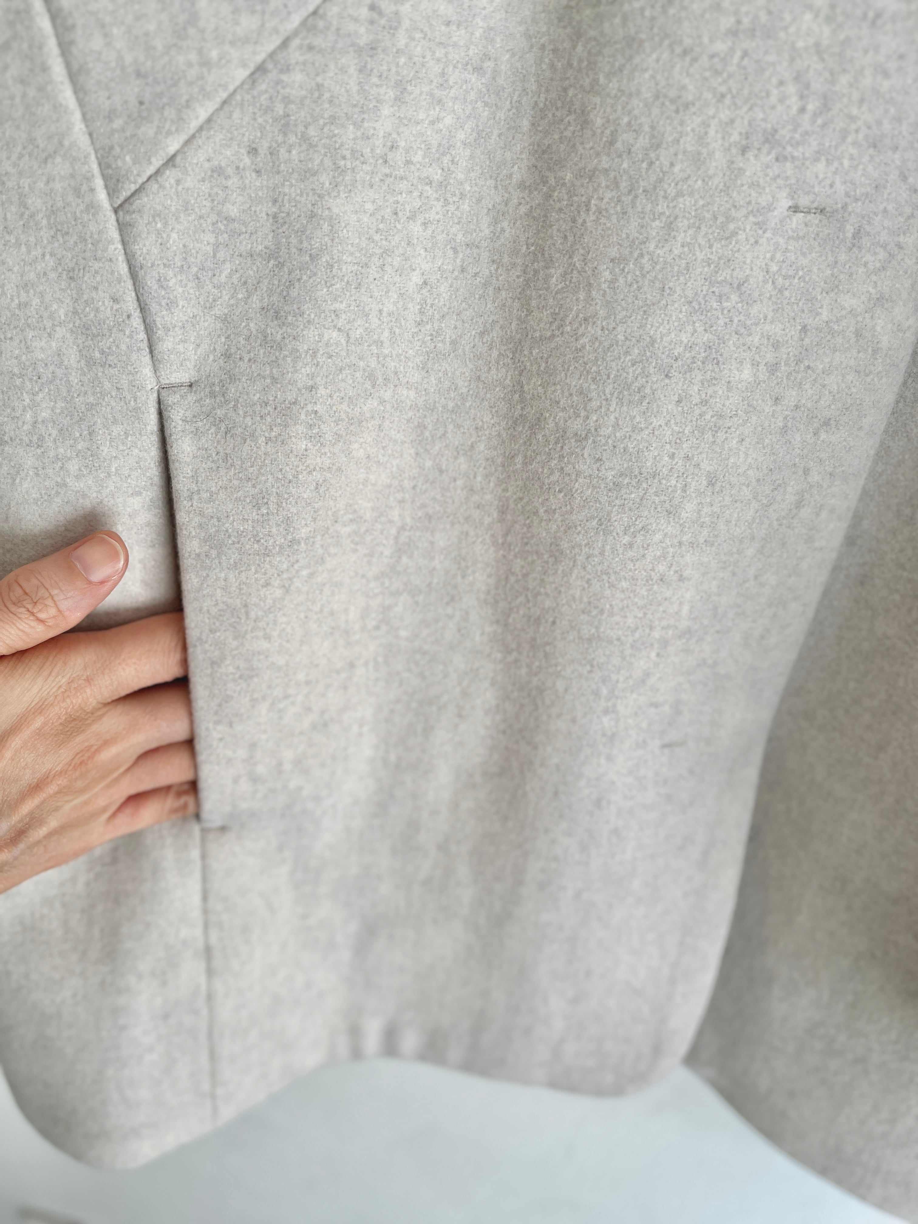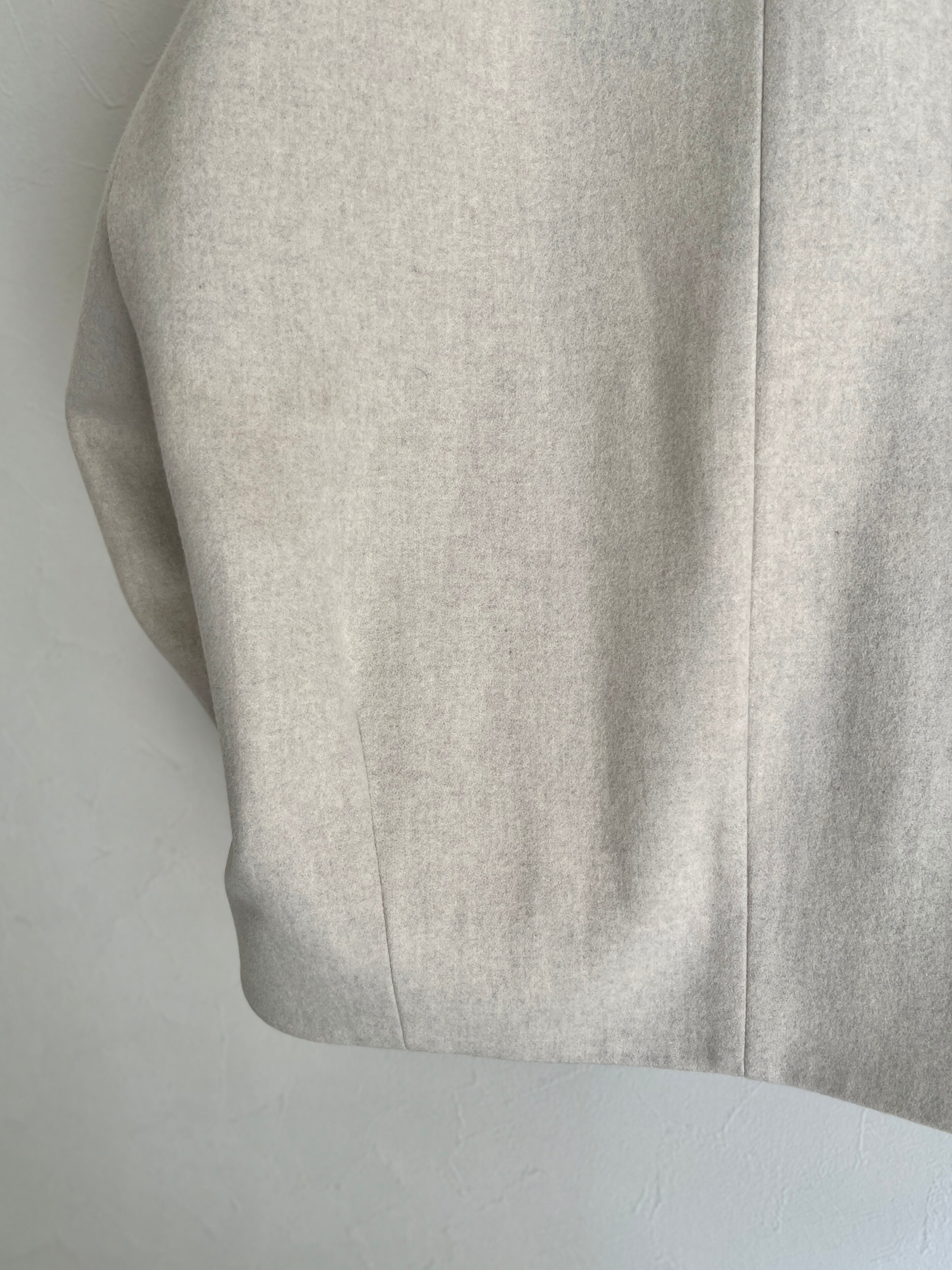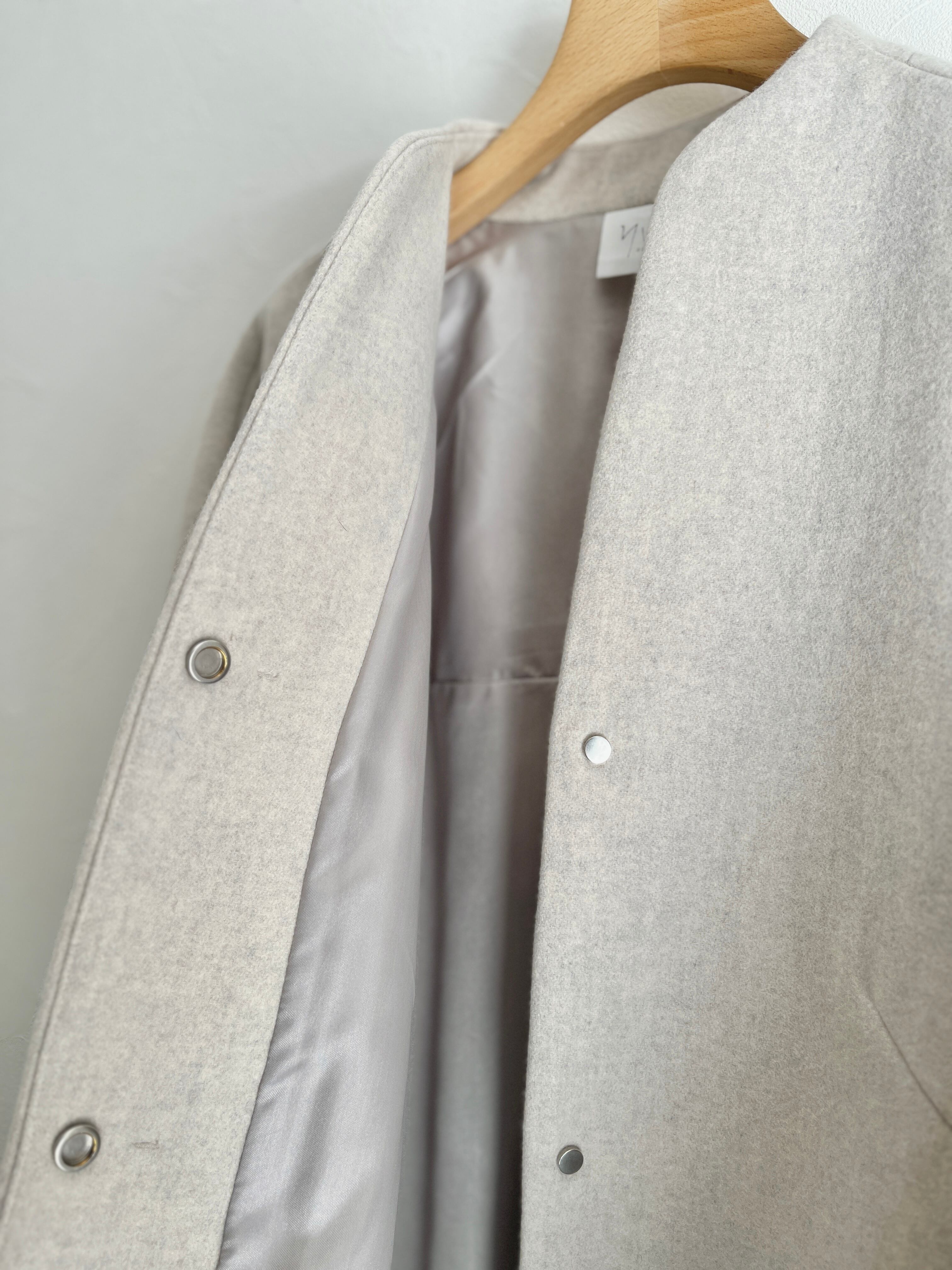 繊維の長いウールを贅沢に使用し、尾州で丁寧に織り上げたyuni定番のスーパー100素材のノーカラーコート 。