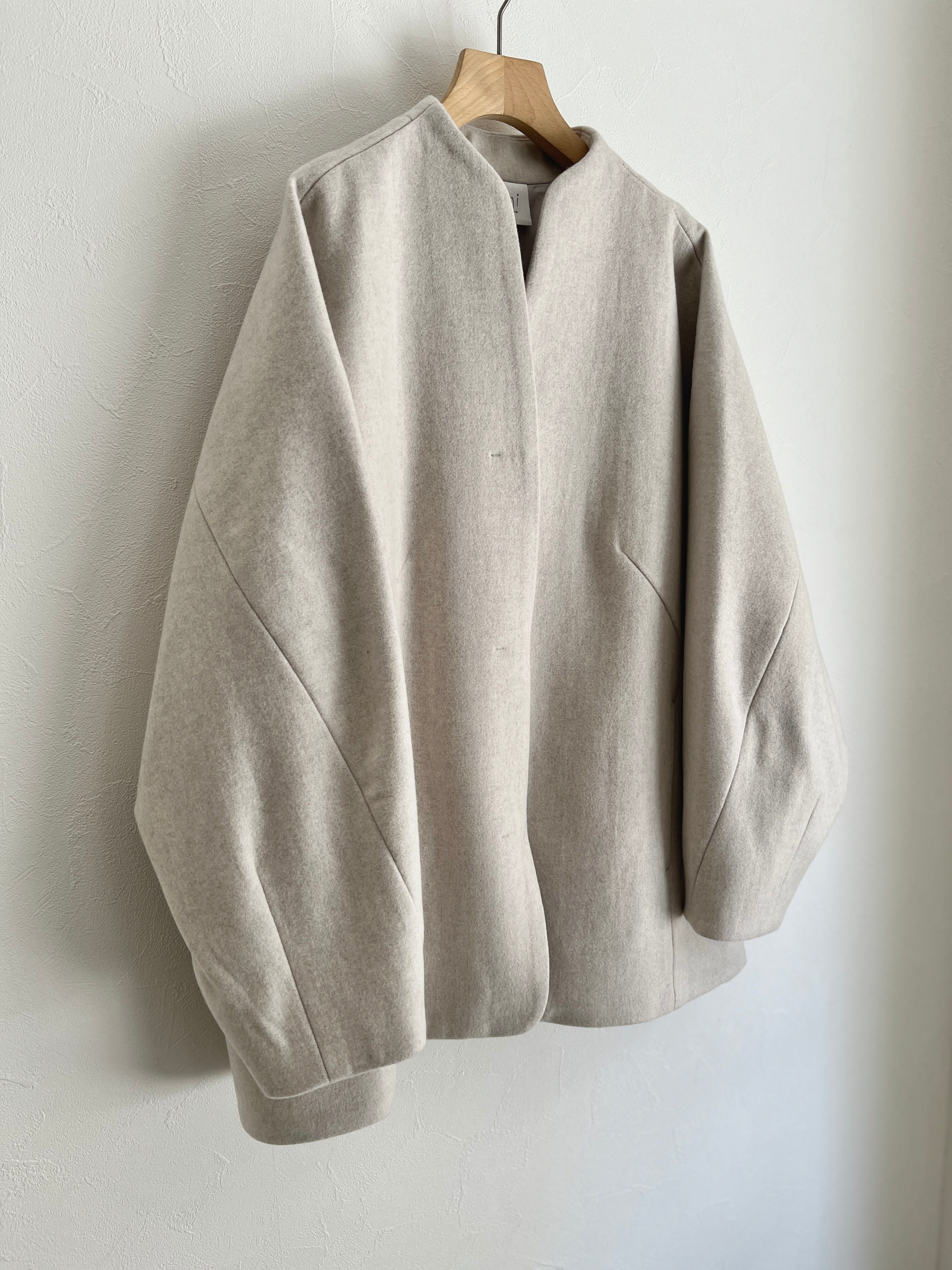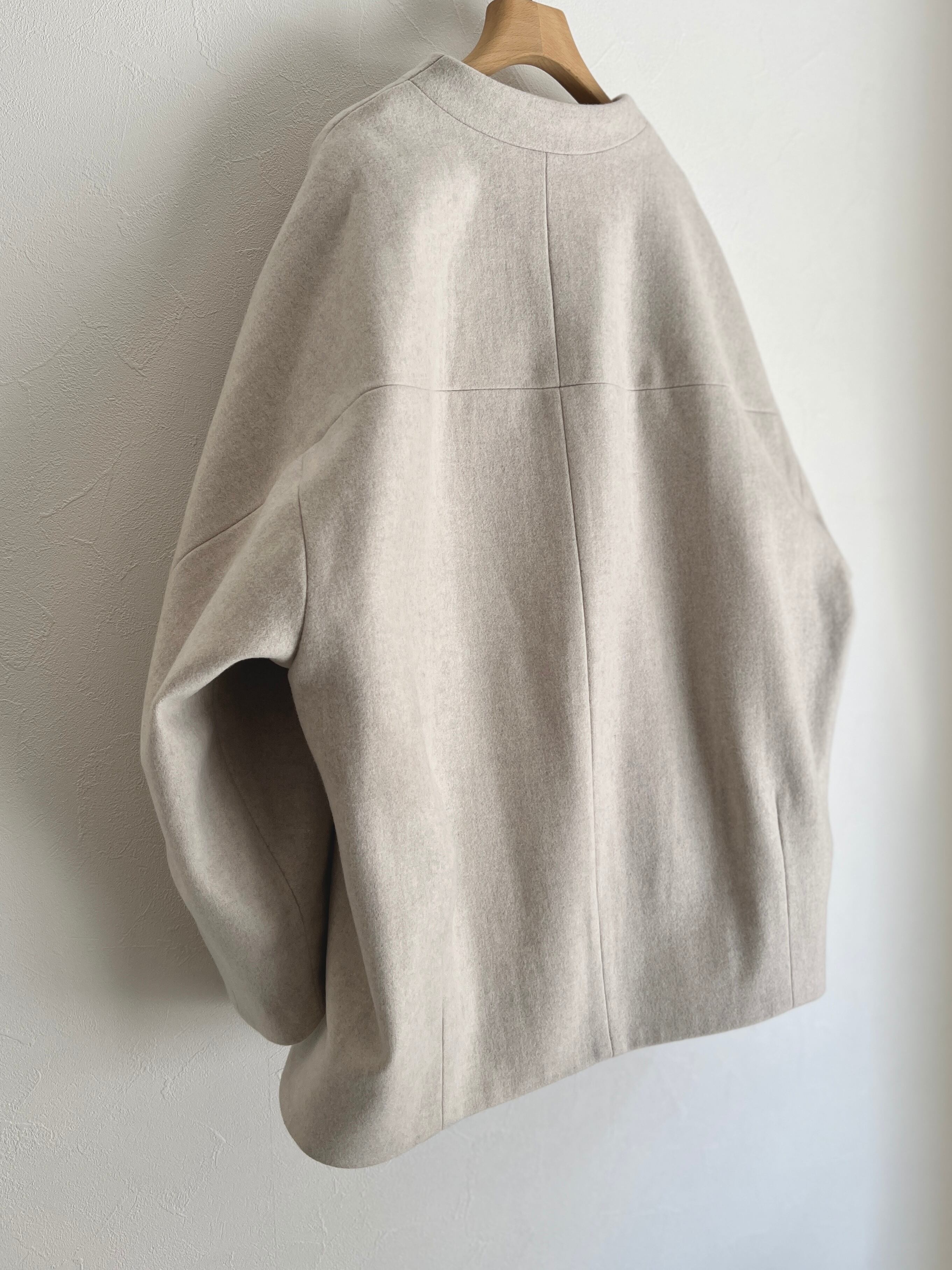 少し立ち上がった後ろ衿のノーカラーデザインが、顔まわりをすっきり見せてくれます。