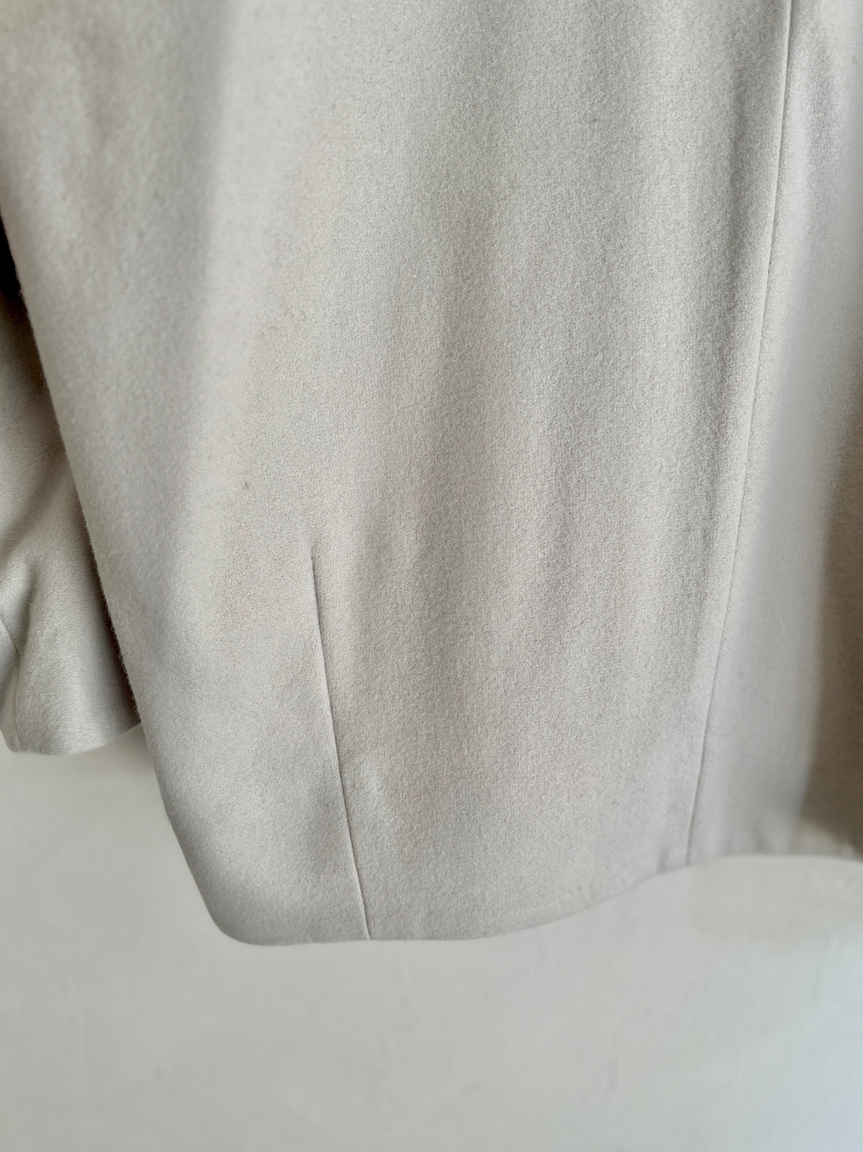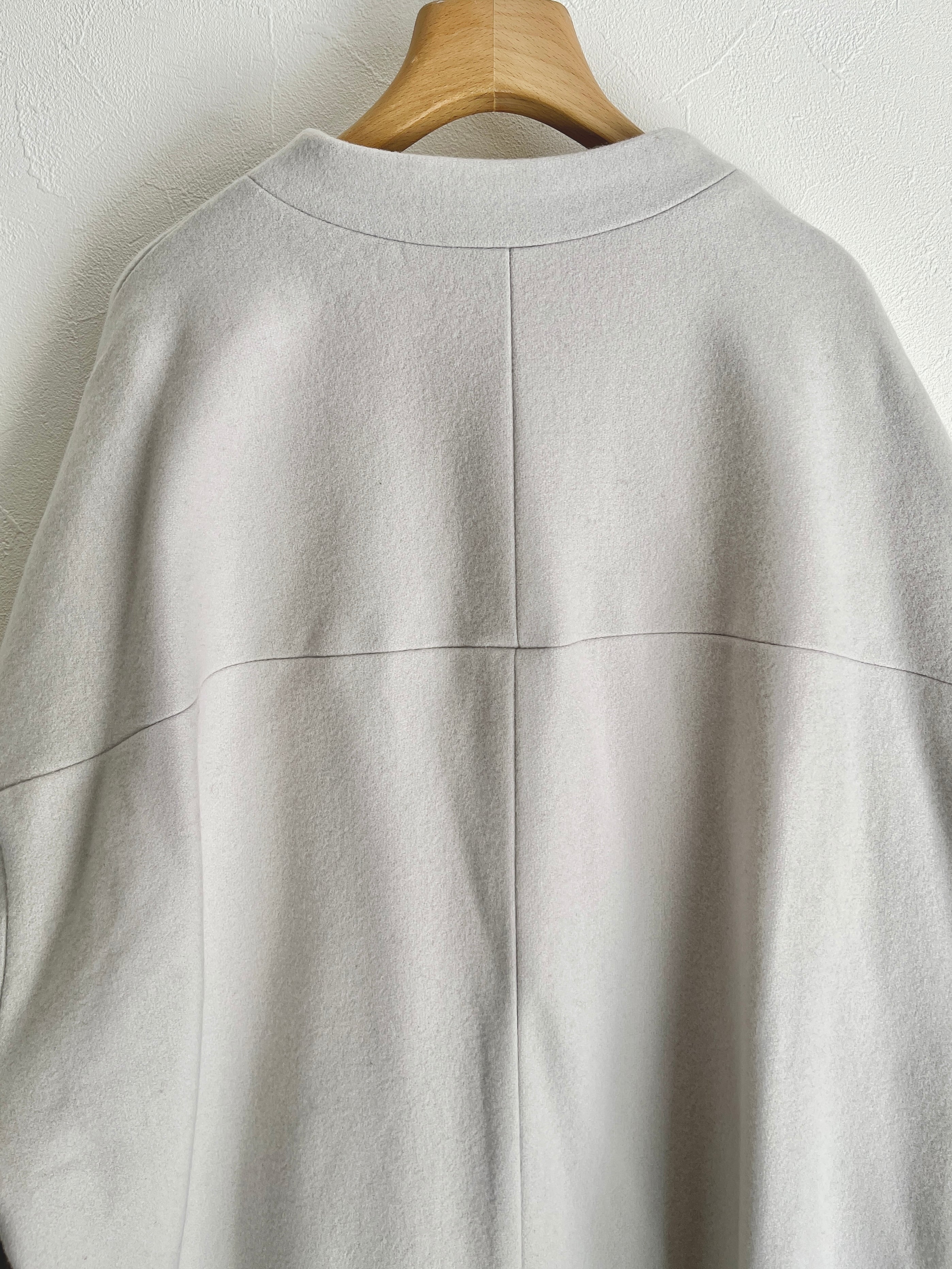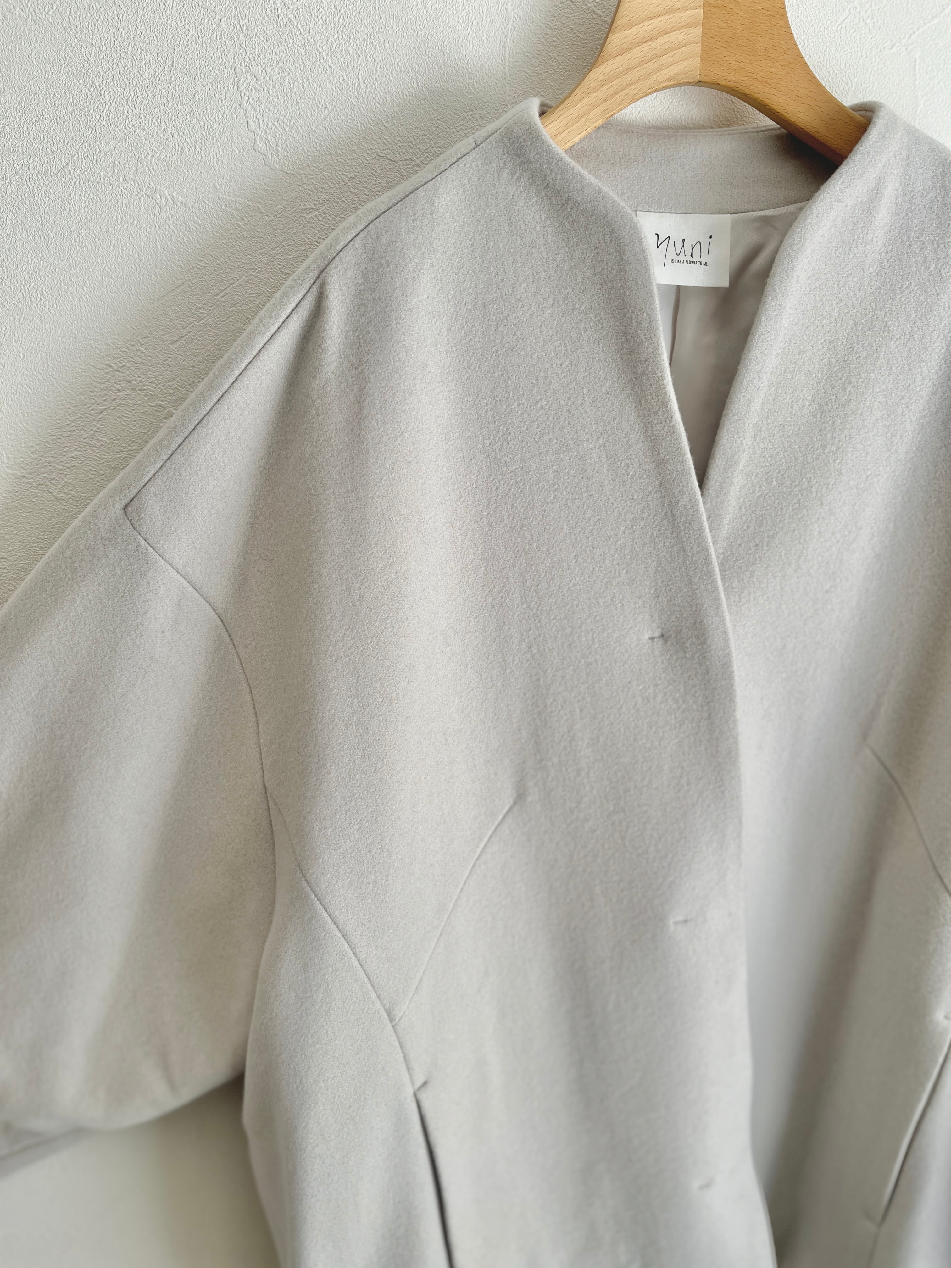 繊維の長いウールを贅沢に使用し、尾州で丁寧に織り上げたyuni定番のスーパー100素材のノーカラーコート 。