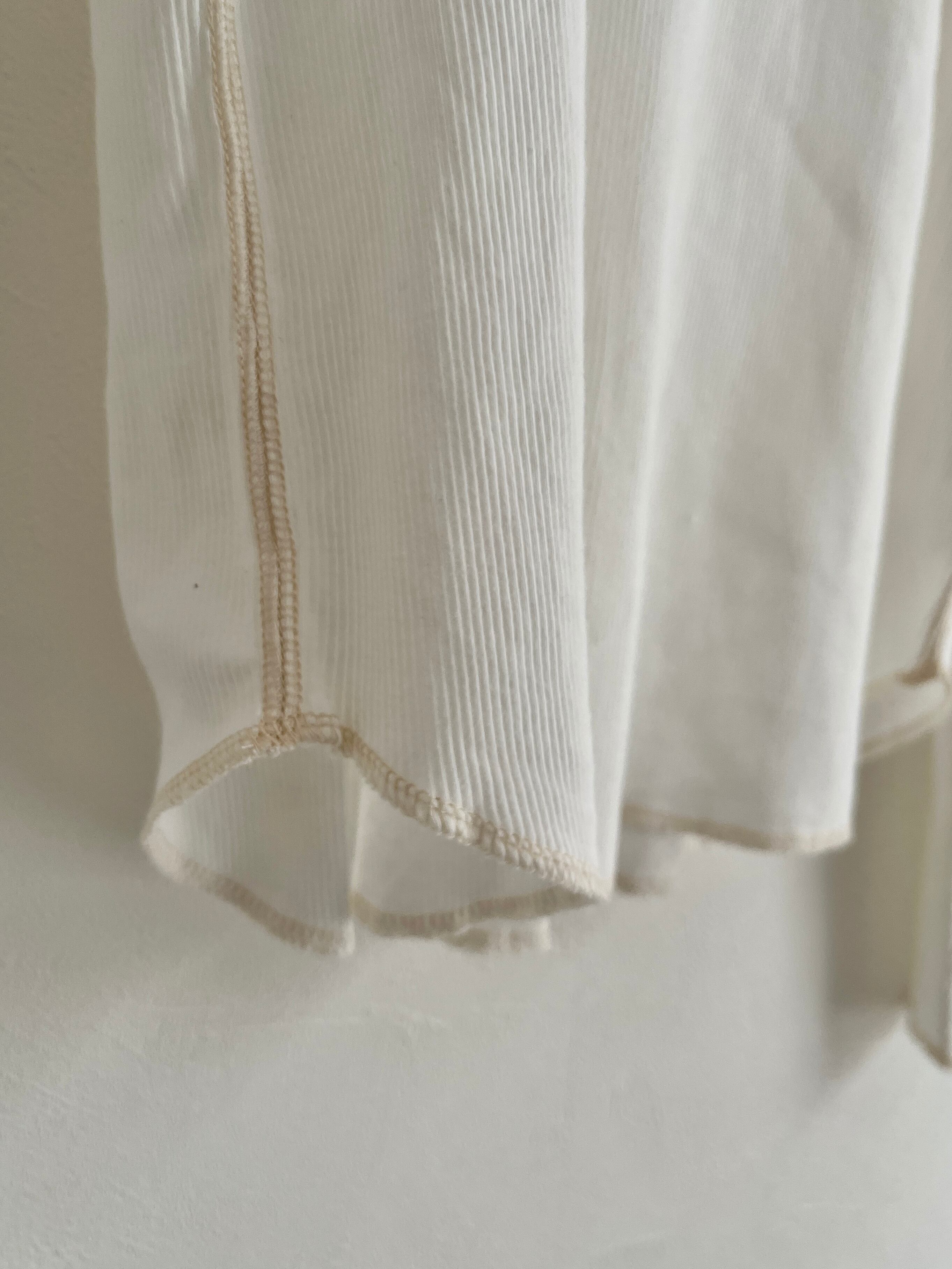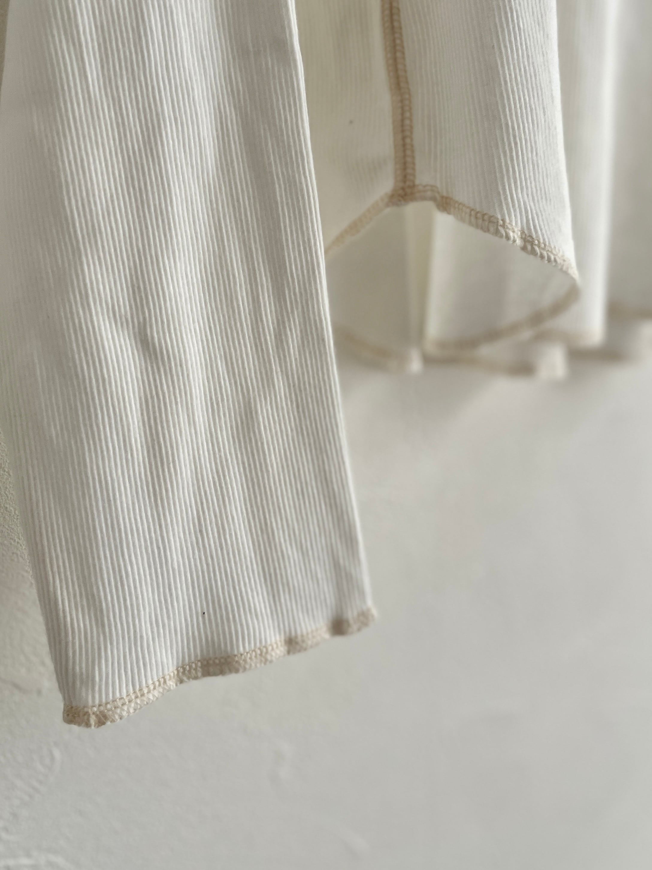 シンプルなデザインながらも、袖口や裾口、肩の切り替えを配色のロック始末にしてさりげないミシンステッチを施しました。スウェットとレイヤードしたときに、裾からテールを見せてもこなれた雰囲気に。襟元は折り返さずに、伸ばしたままくしゃっとさせてもシックに着られます。秋口から春先まで長いシーズン活躍し、色違いで揃えたくなるアイテムです。