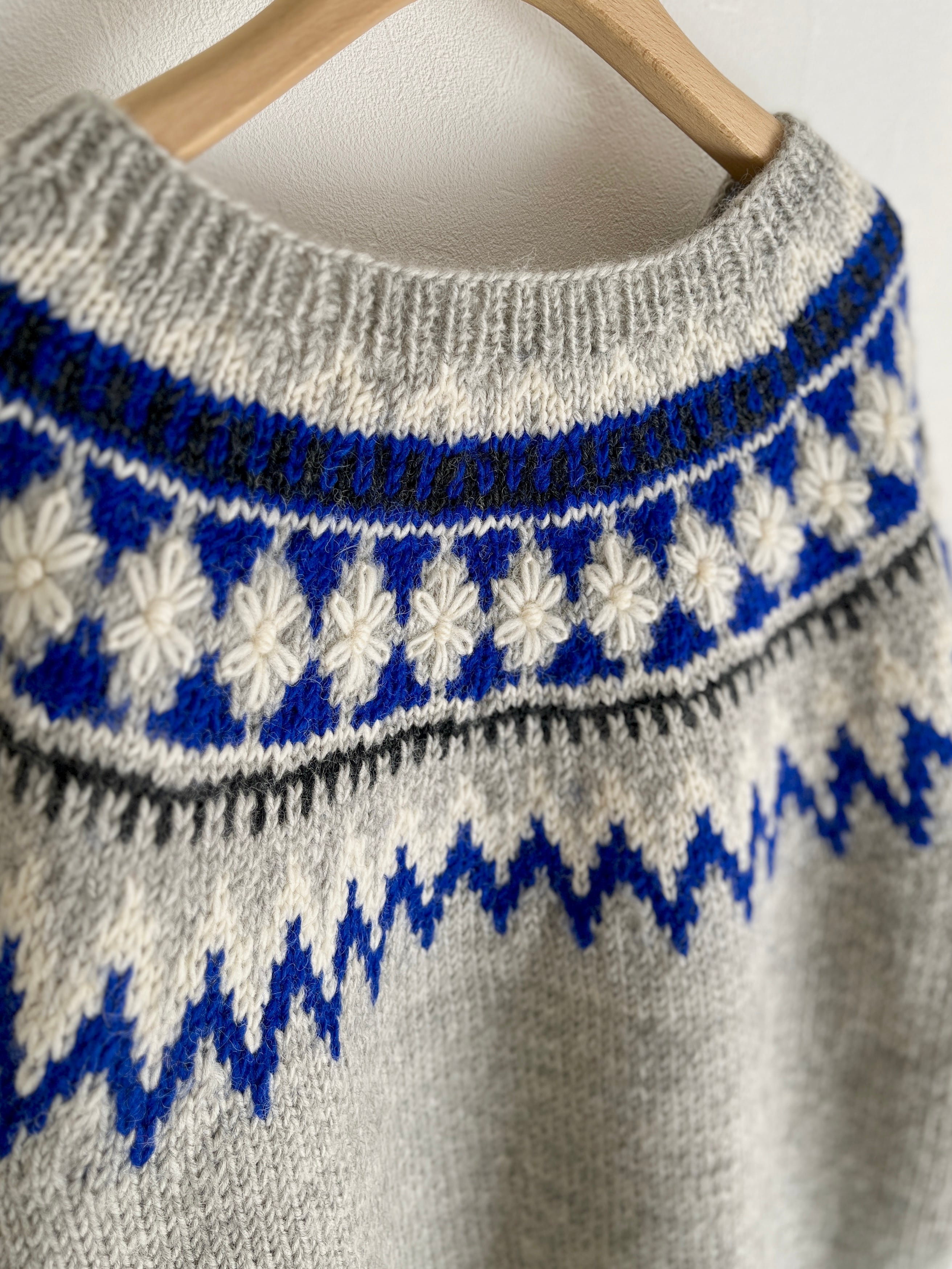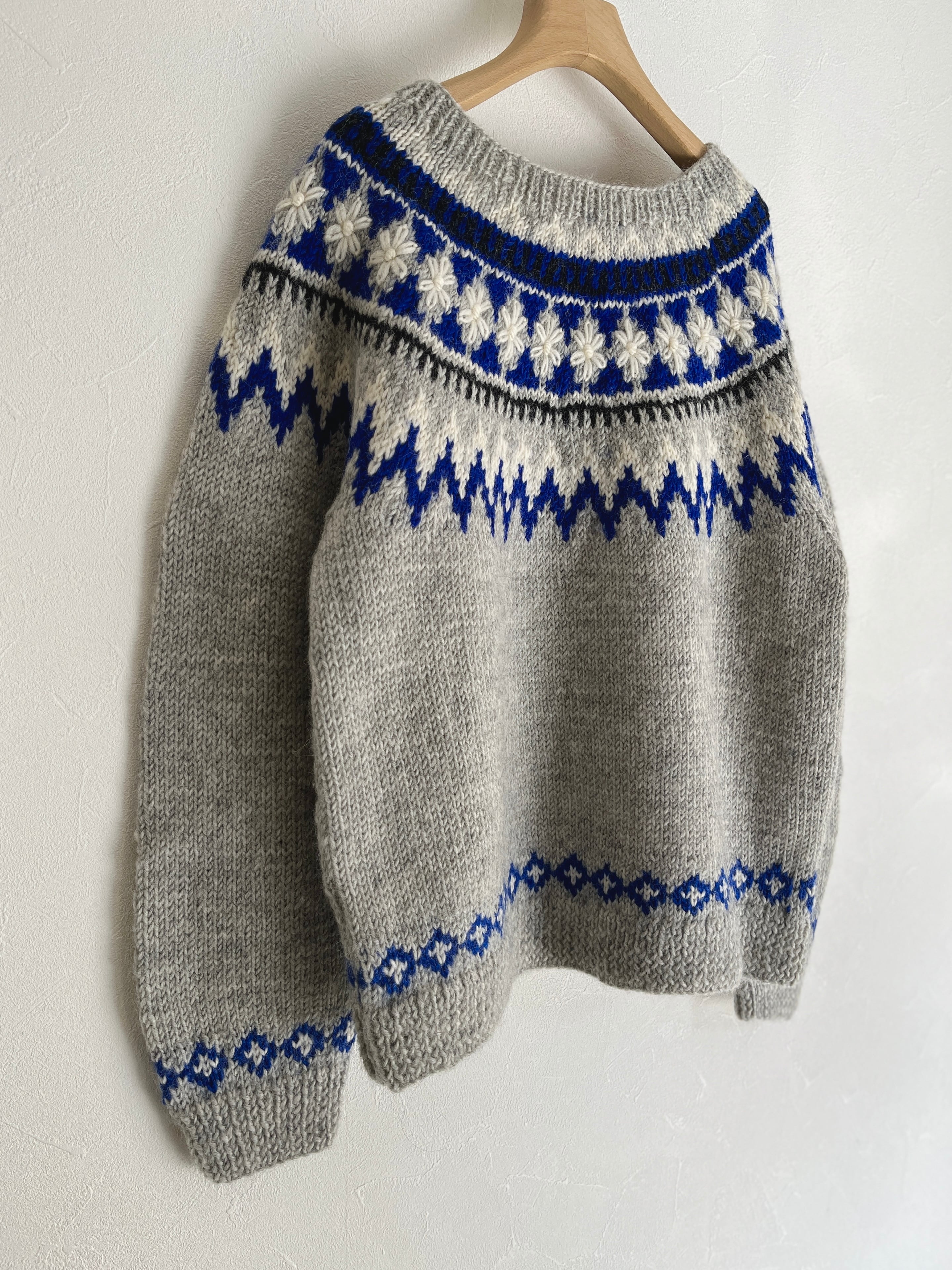ジグザグとした求心柄に刺繍を施した手編みのニット。