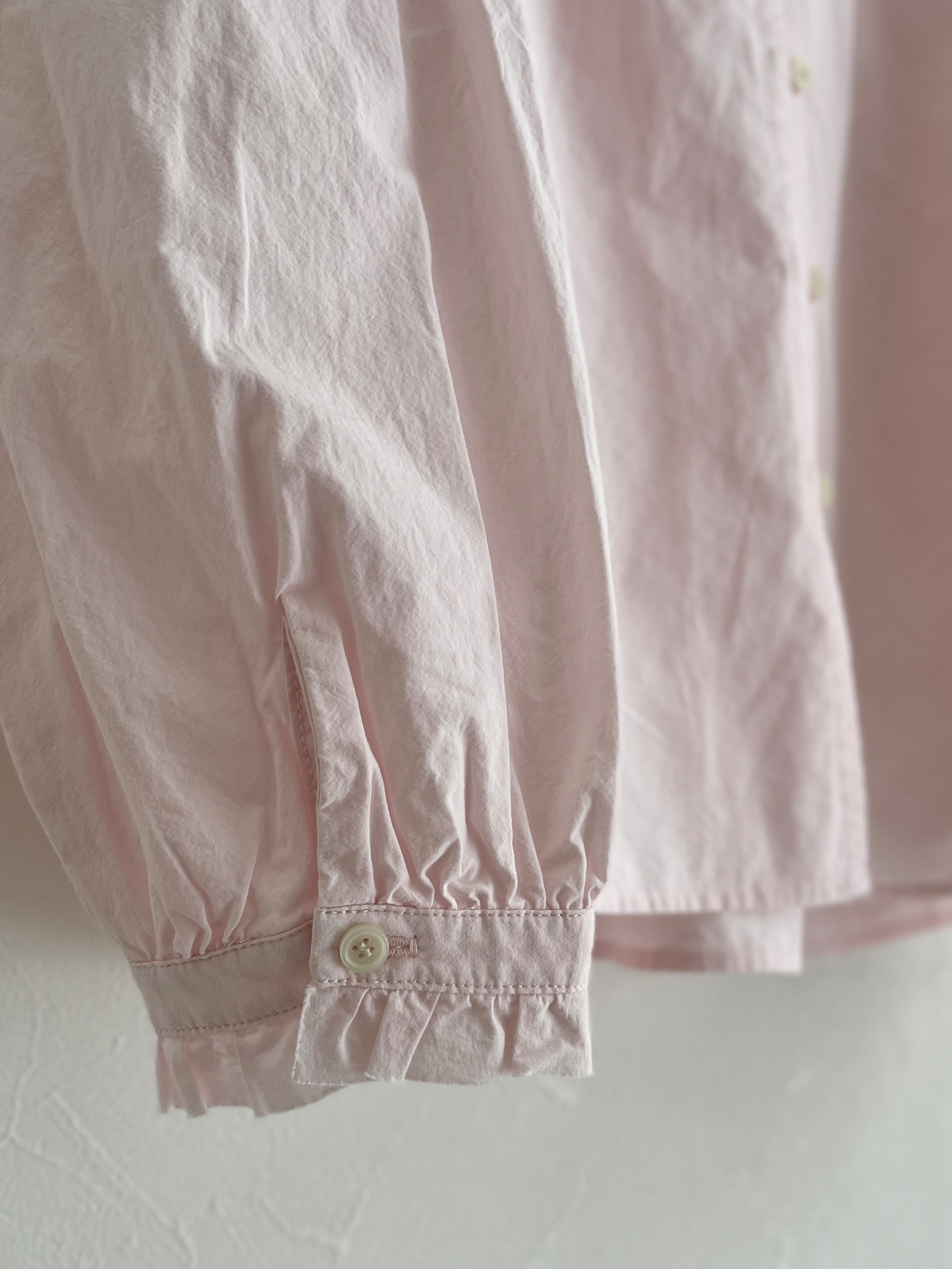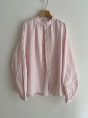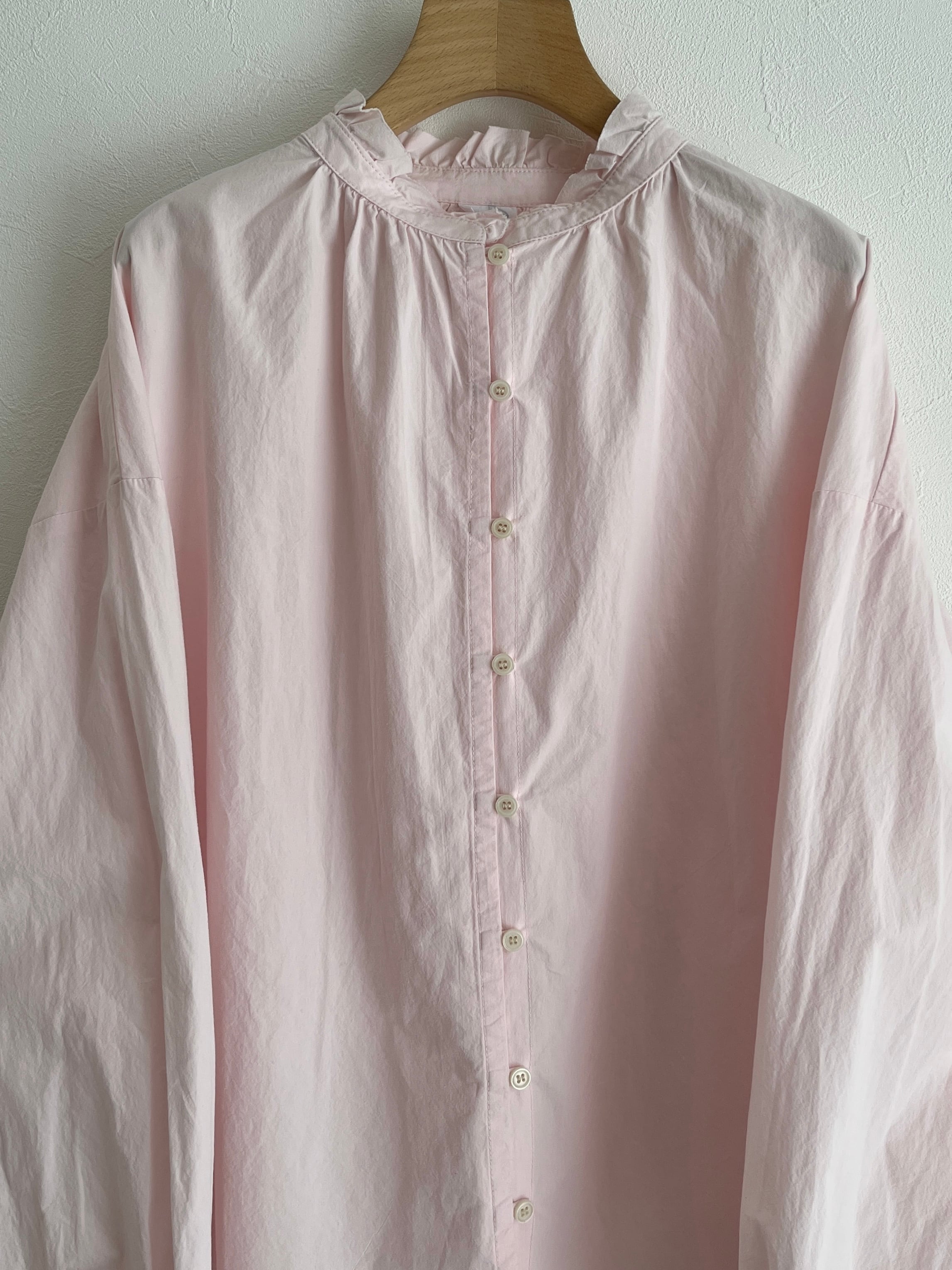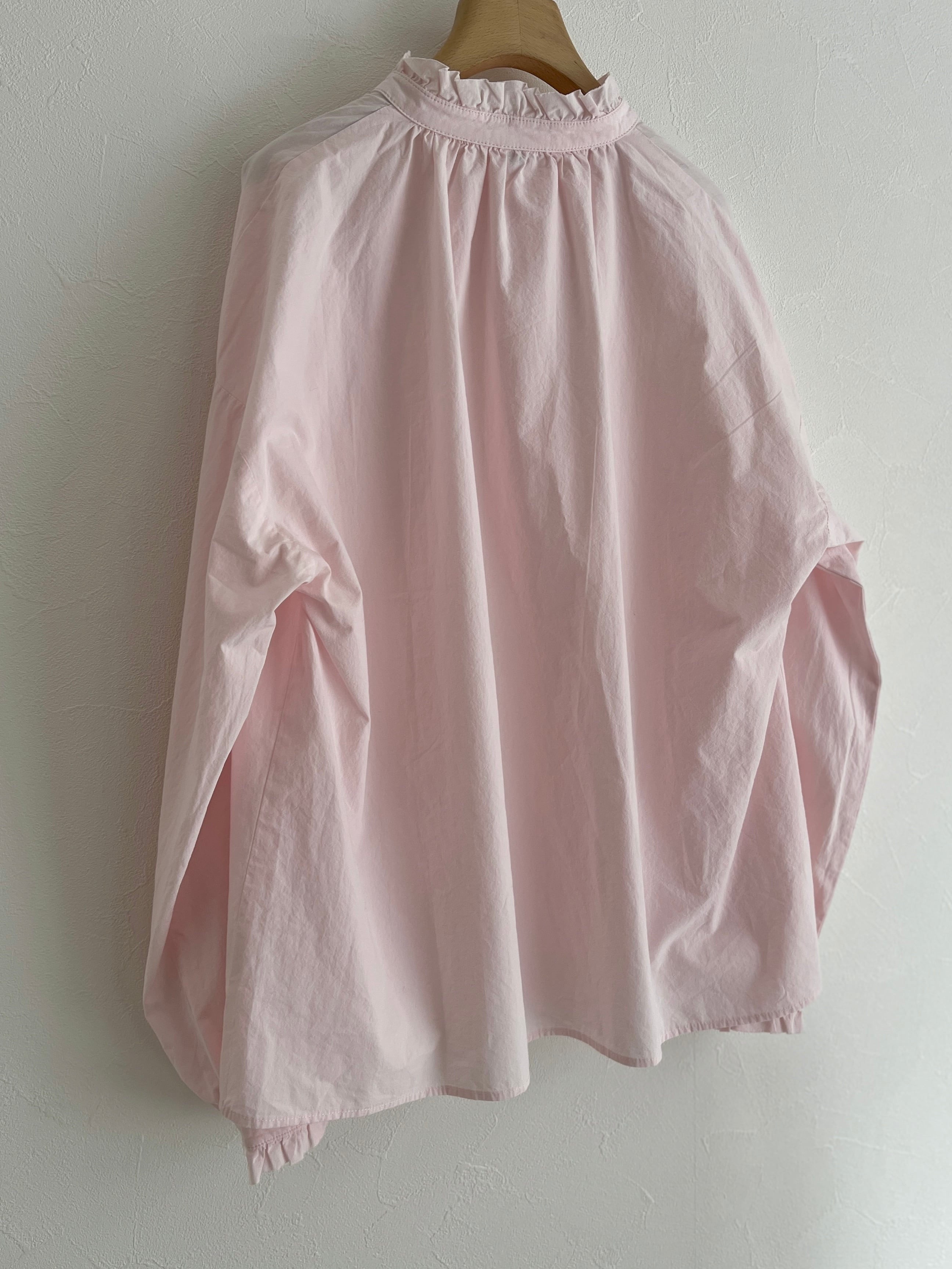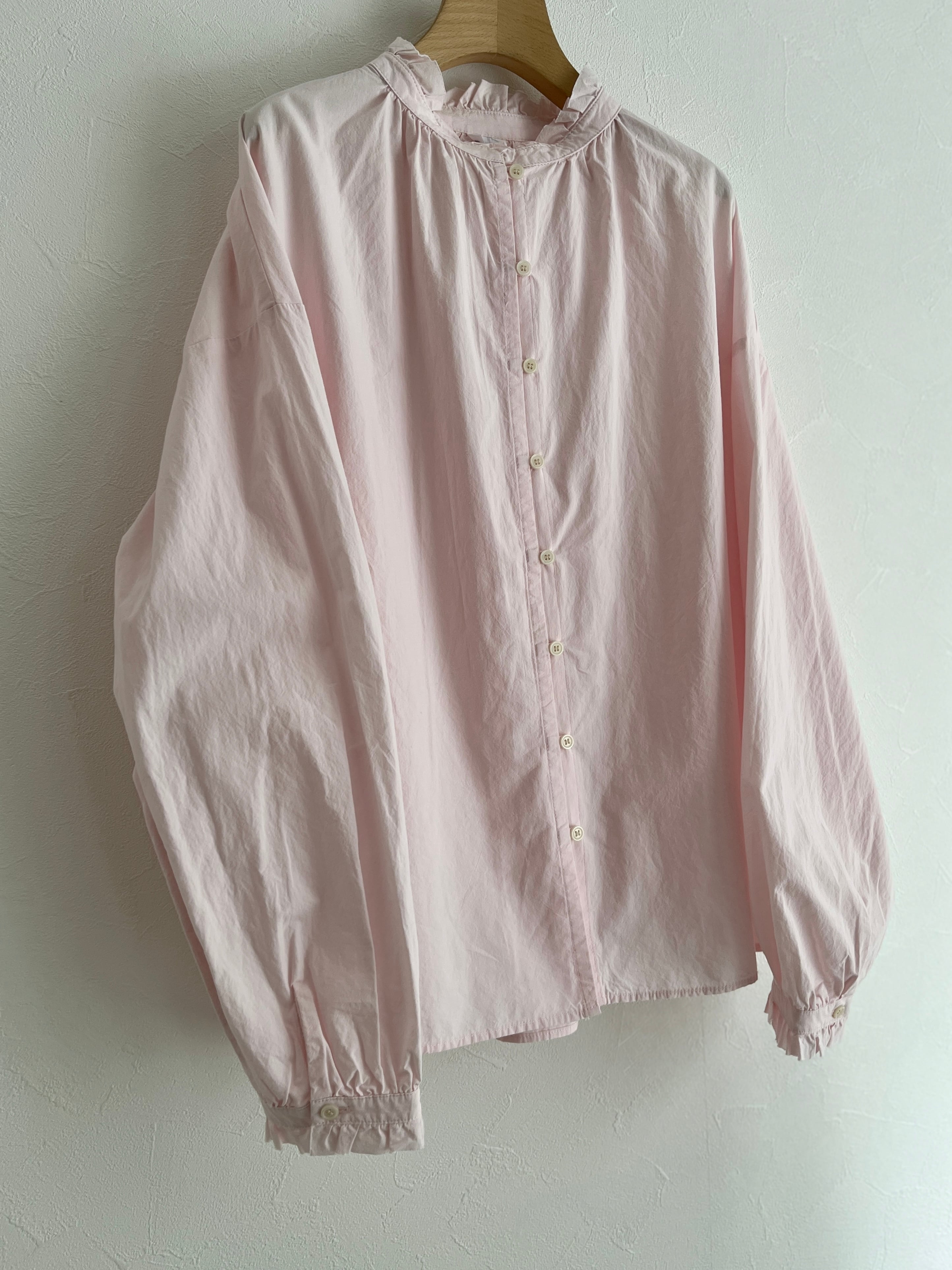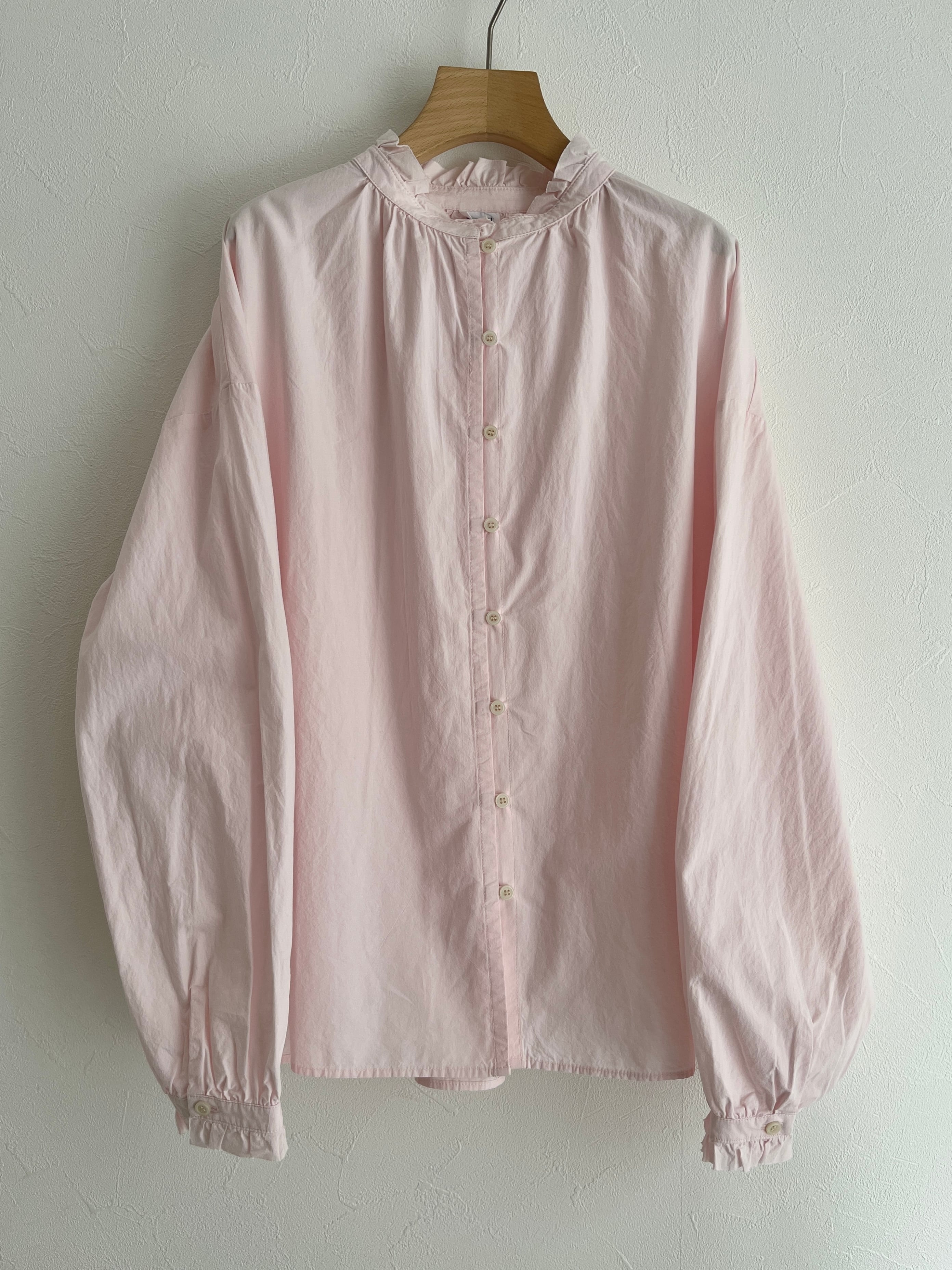襟と袖のフリル始末を断ち切りにして軽さと抜け感を出した、程よい甘さのフリルブラウス。