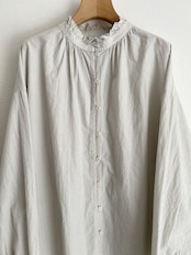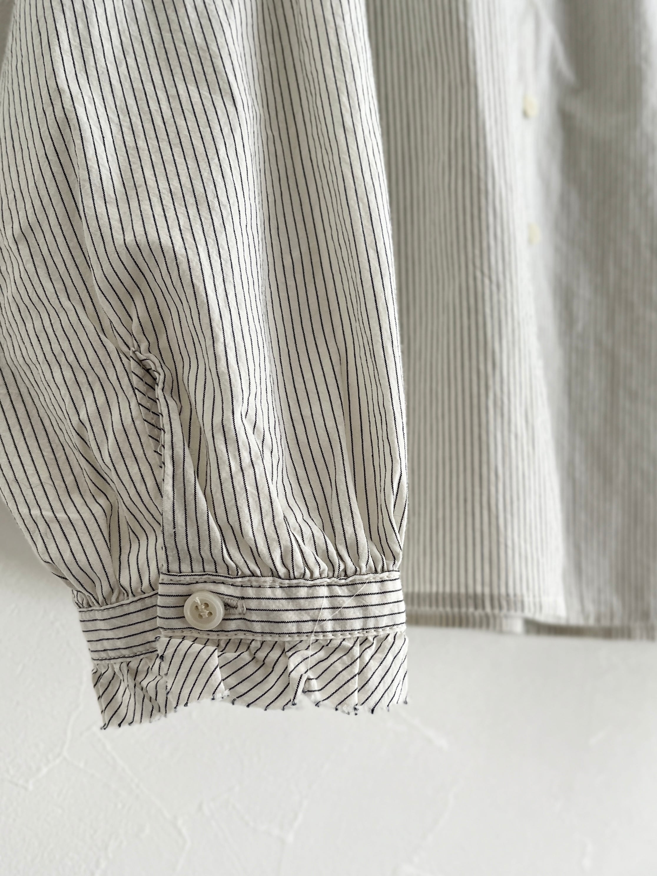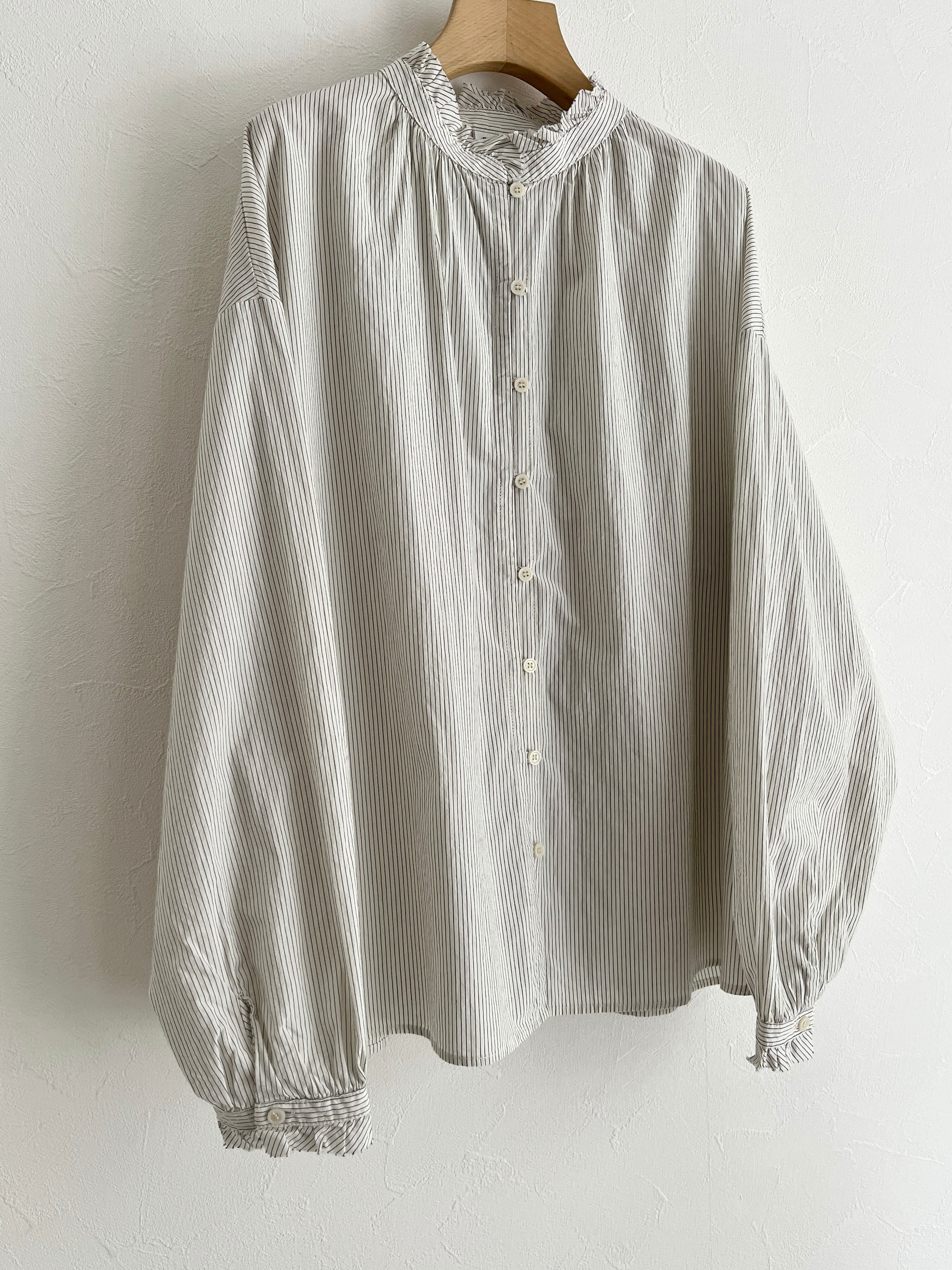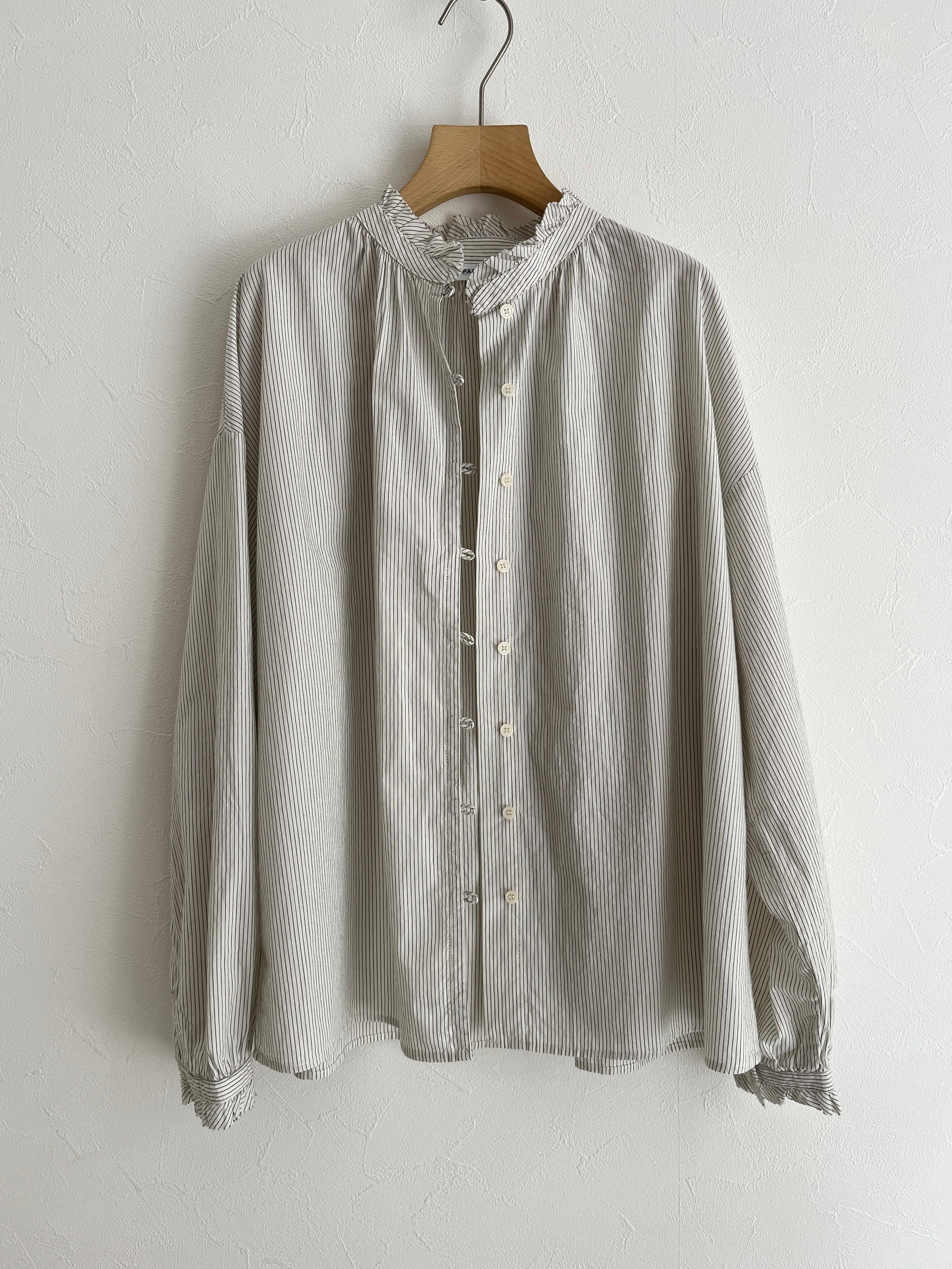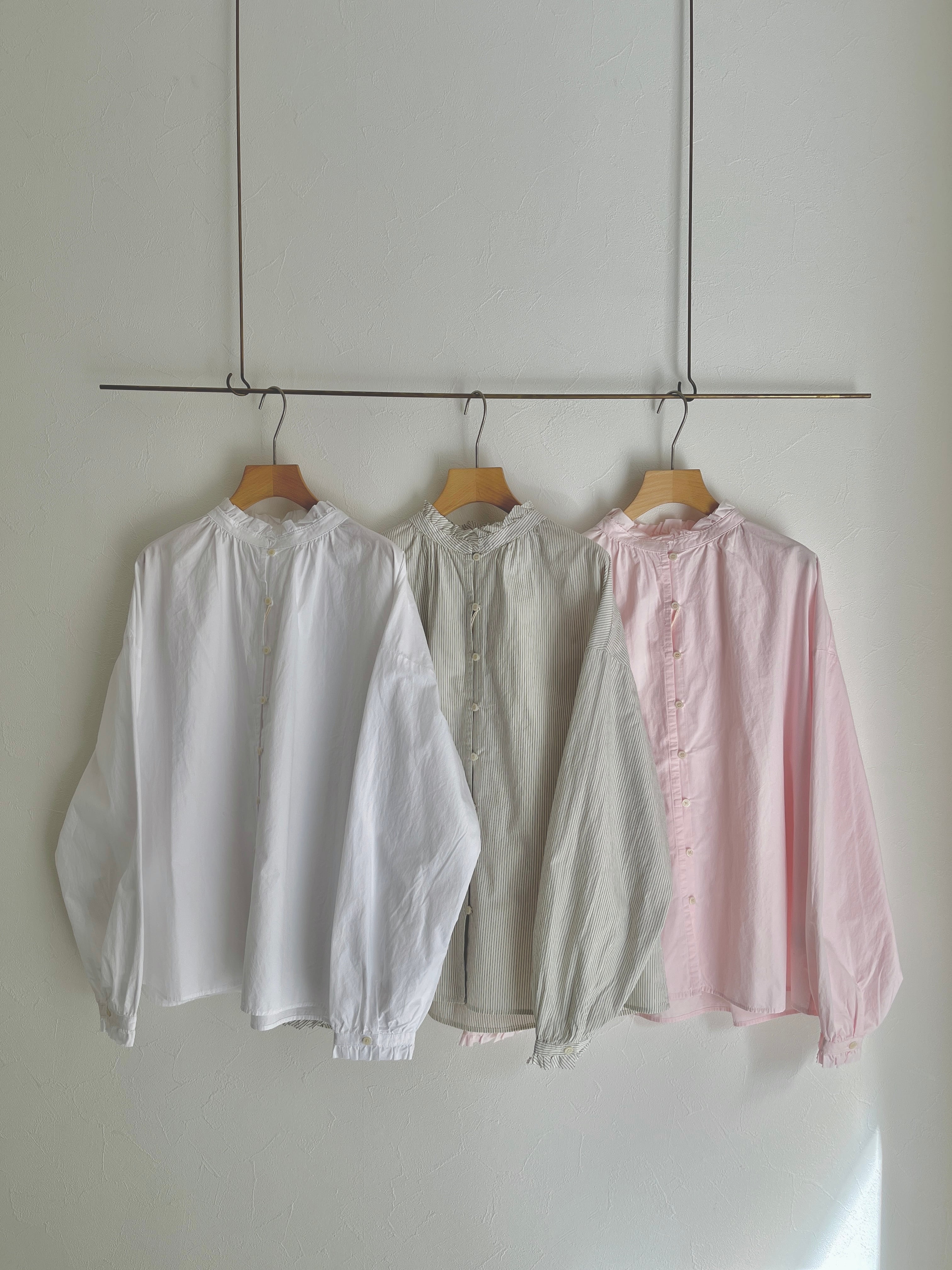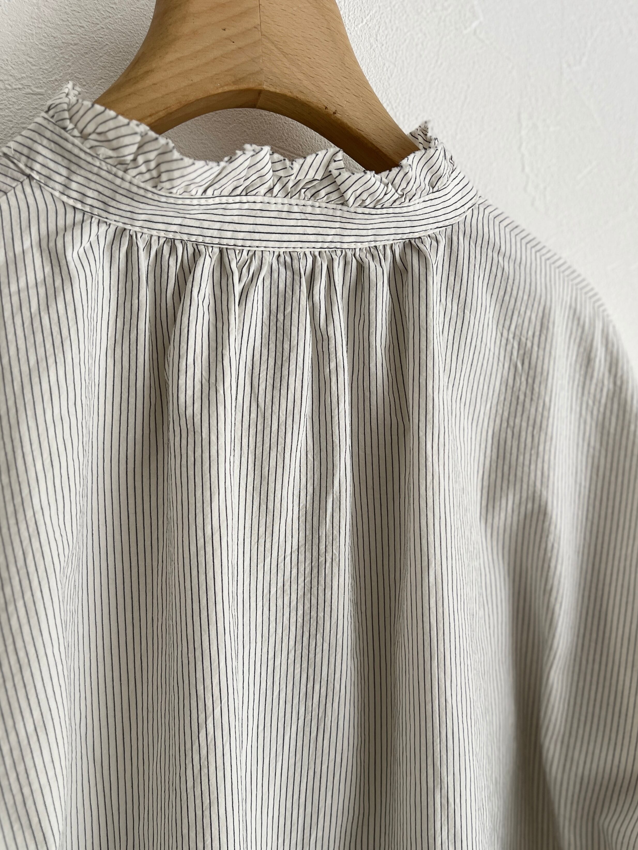 襟と袖のフリル始末を断ち切りにして軽さと抜け感を出した、程よい甘さのフリルブラウス。