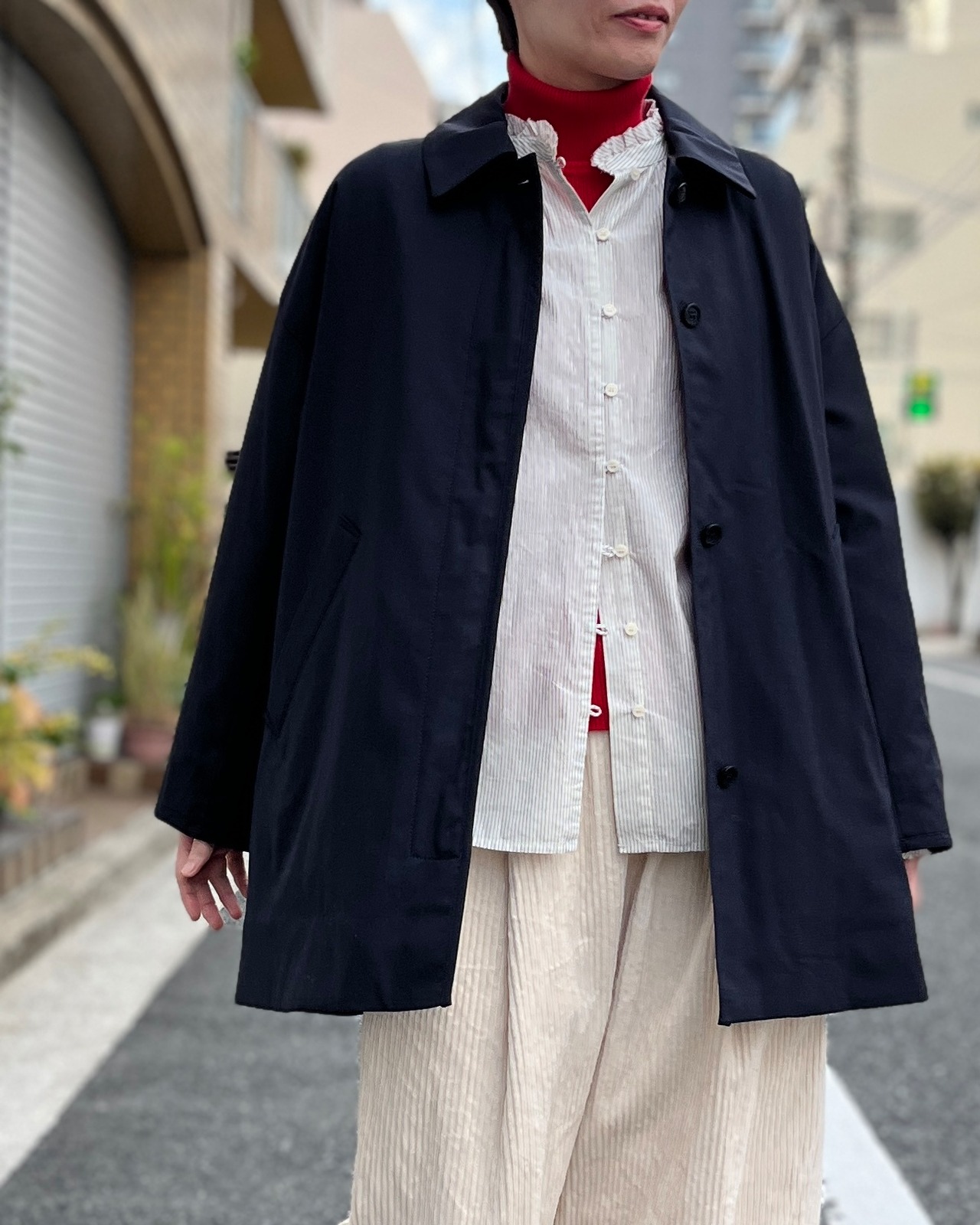 クラシックな印象のループボタンホールは、前を開けて羽織った時にもさりげないポイントに。かわいいだけではなくメンズライクなアイテムに合わせても馴染みの良いPAR ICIらしいこだわりです。デニムやカーゴパンツを合わせれば、丁度良い甘さ加減のカジュアルスタイルに。チノやデニムなど硬めの素材のロングスカートと合わせても、上品ながらもどこかカレッジな雰囲気に。