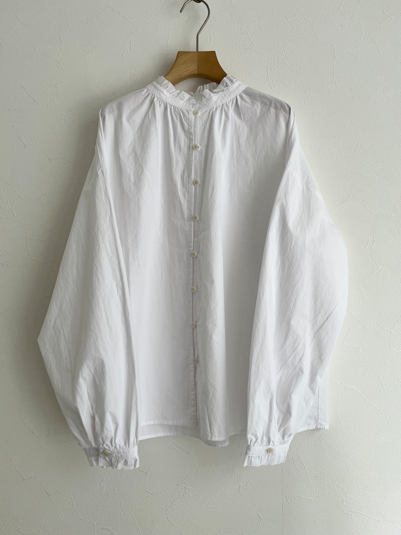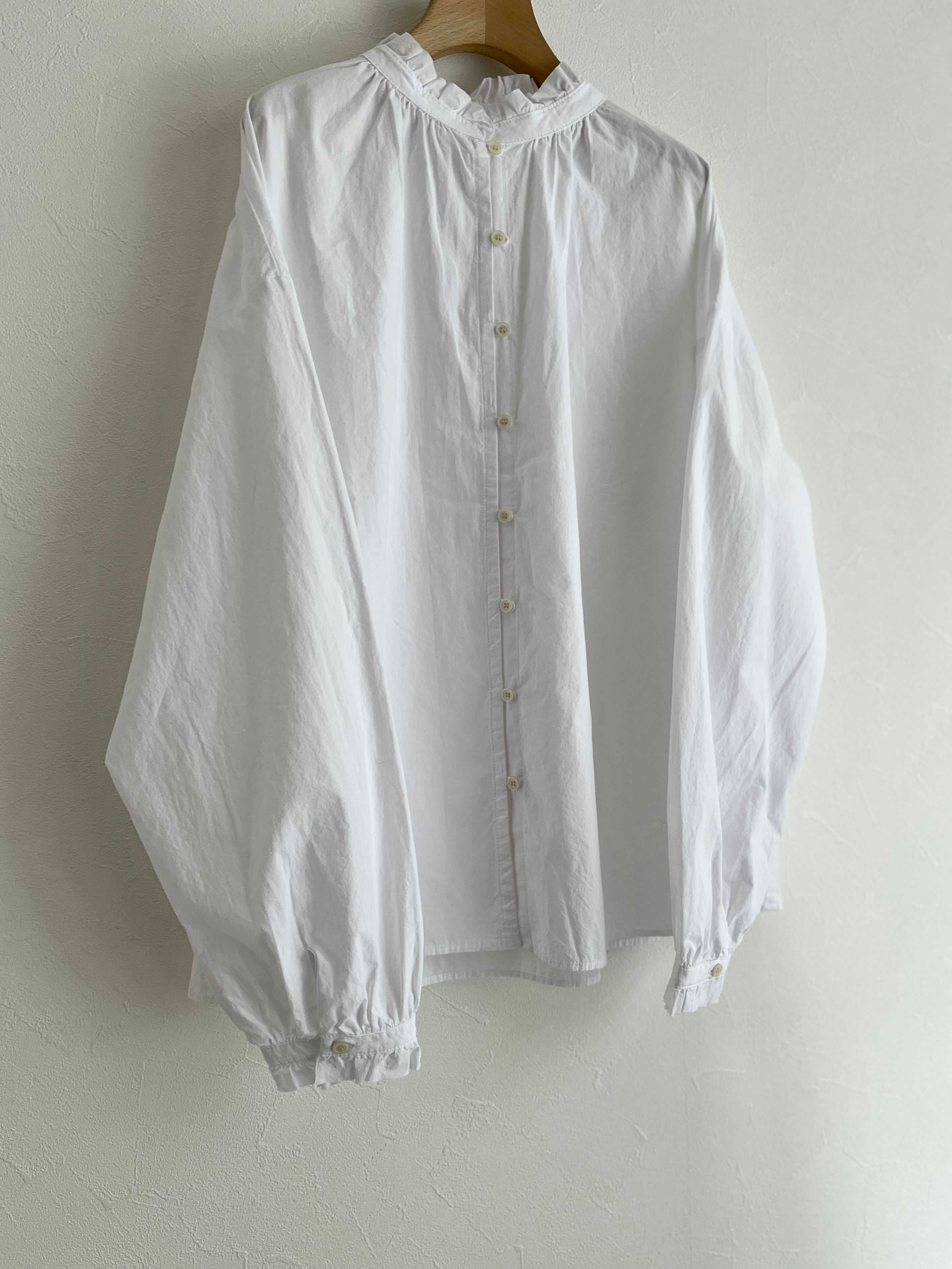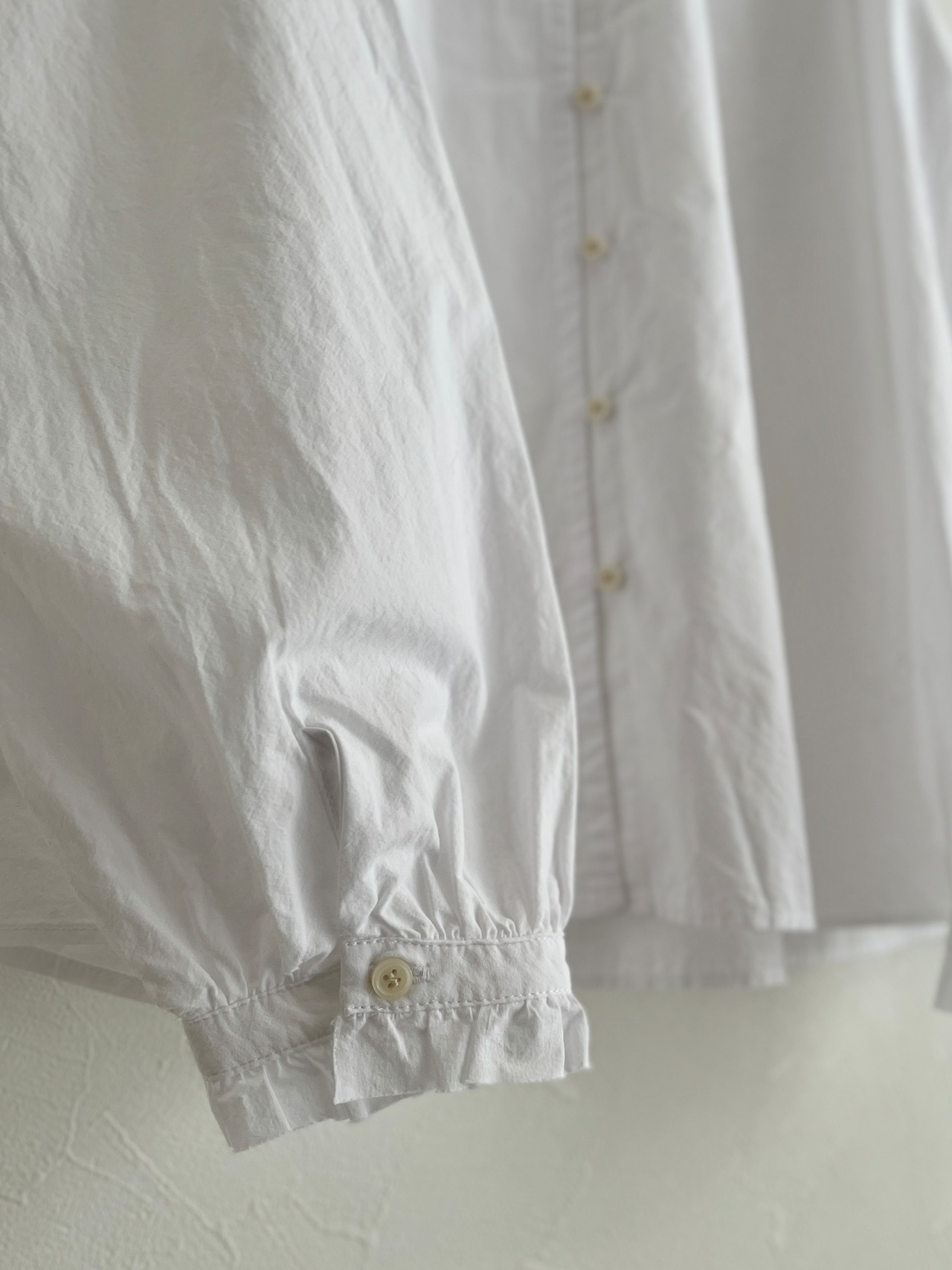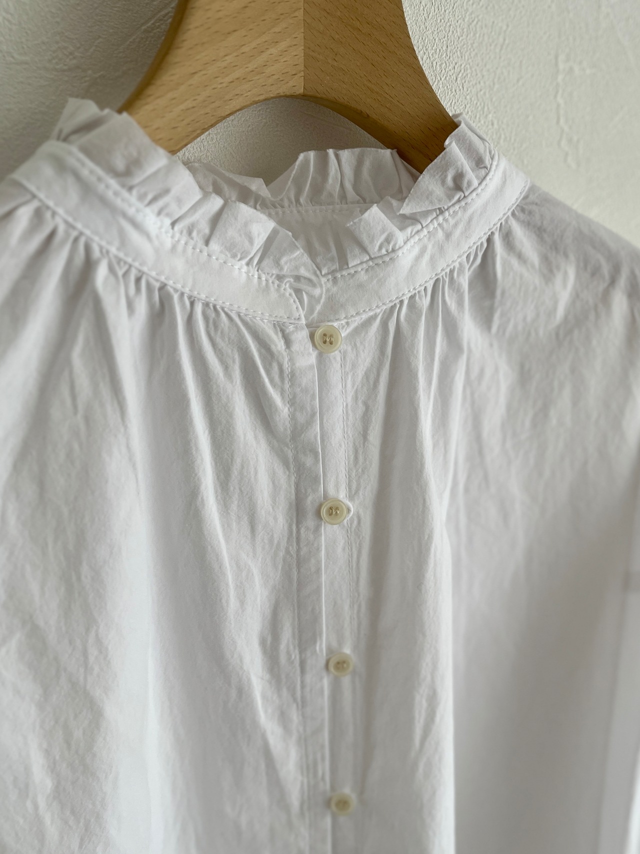 襟と袖のフリル始末を断ち切りにして軽さと抜け感を出した、程よい甘さのフリルブラウス。
