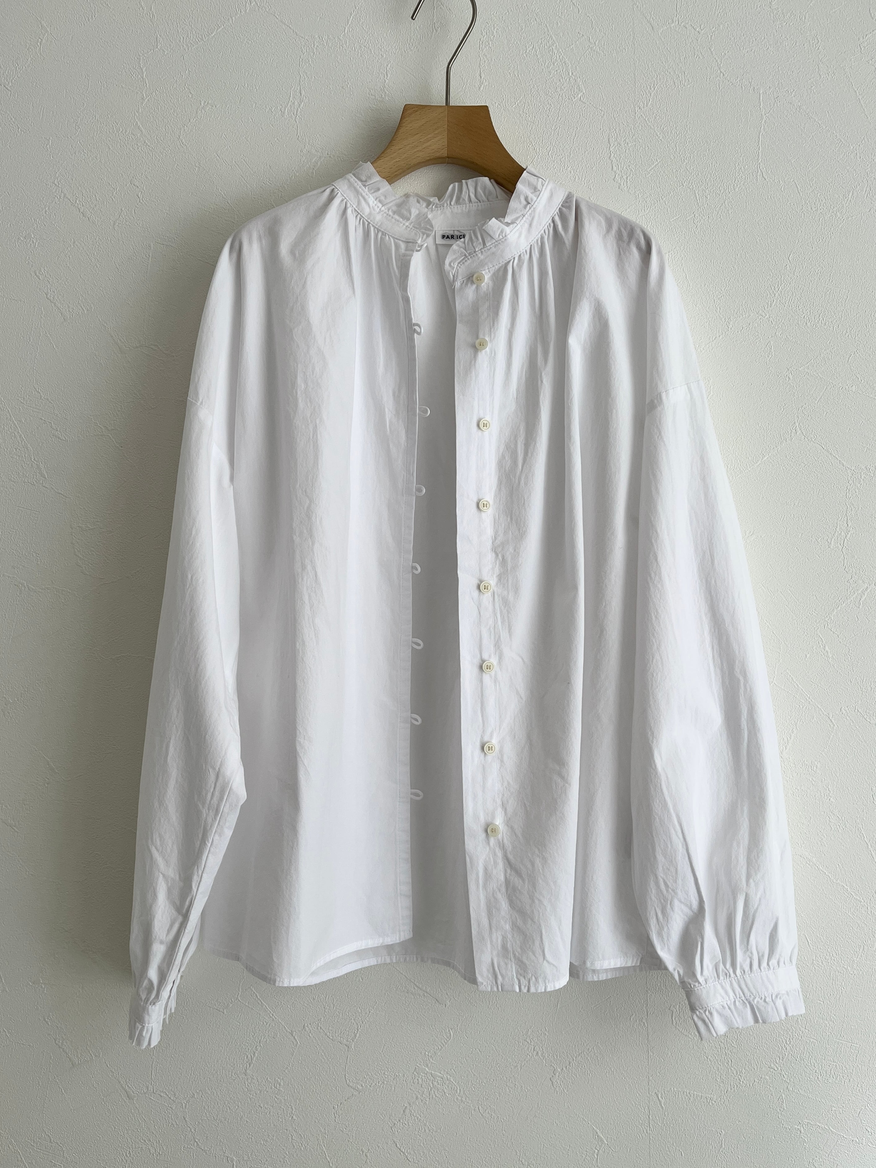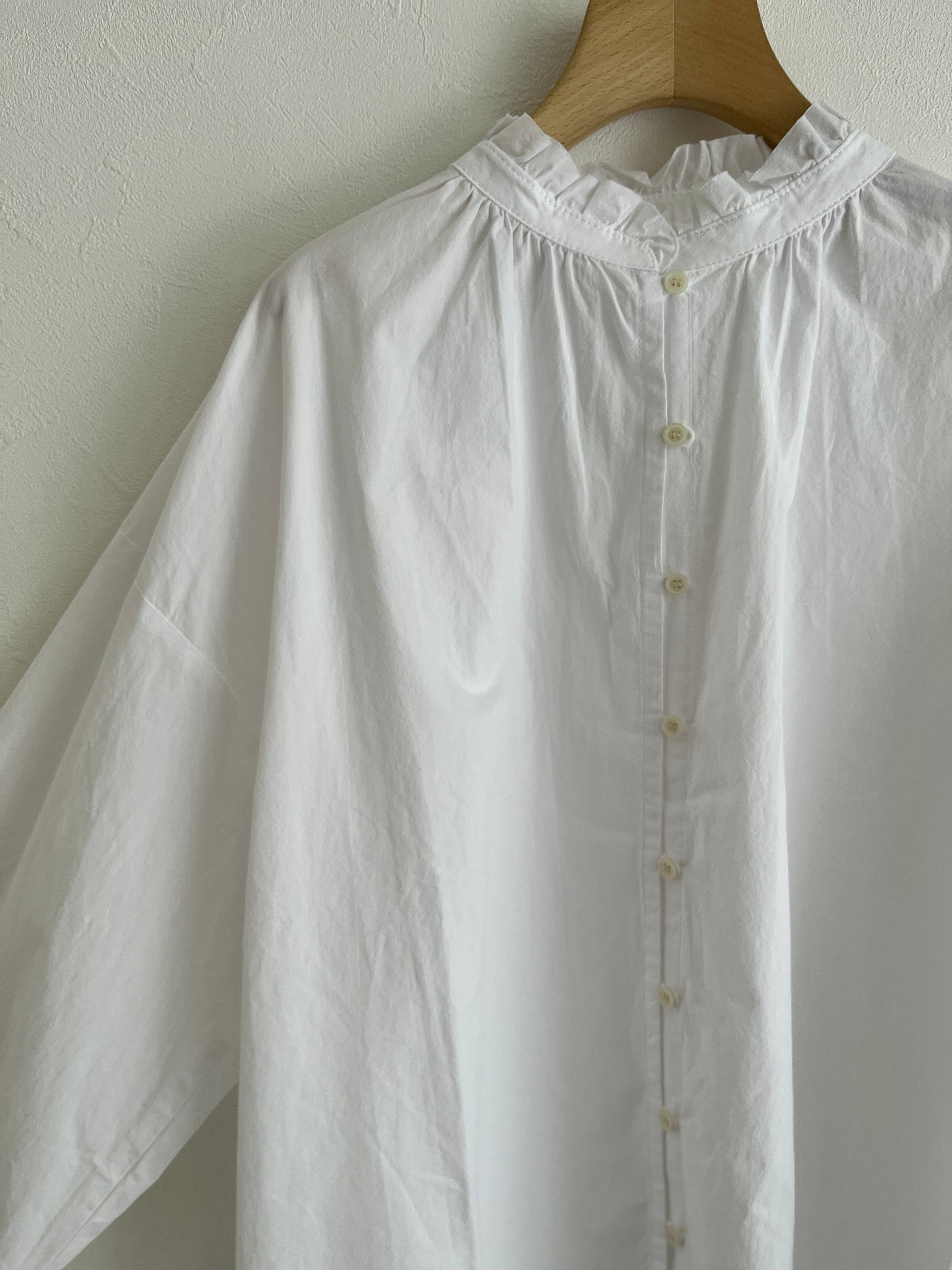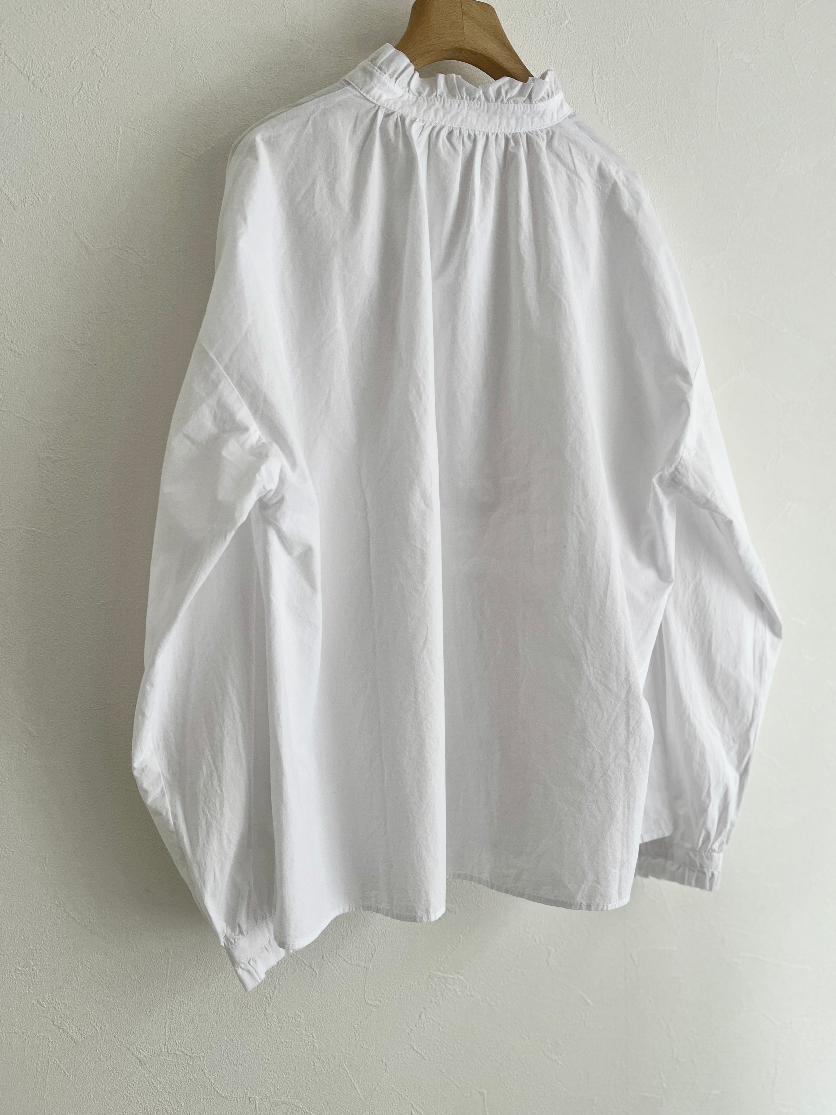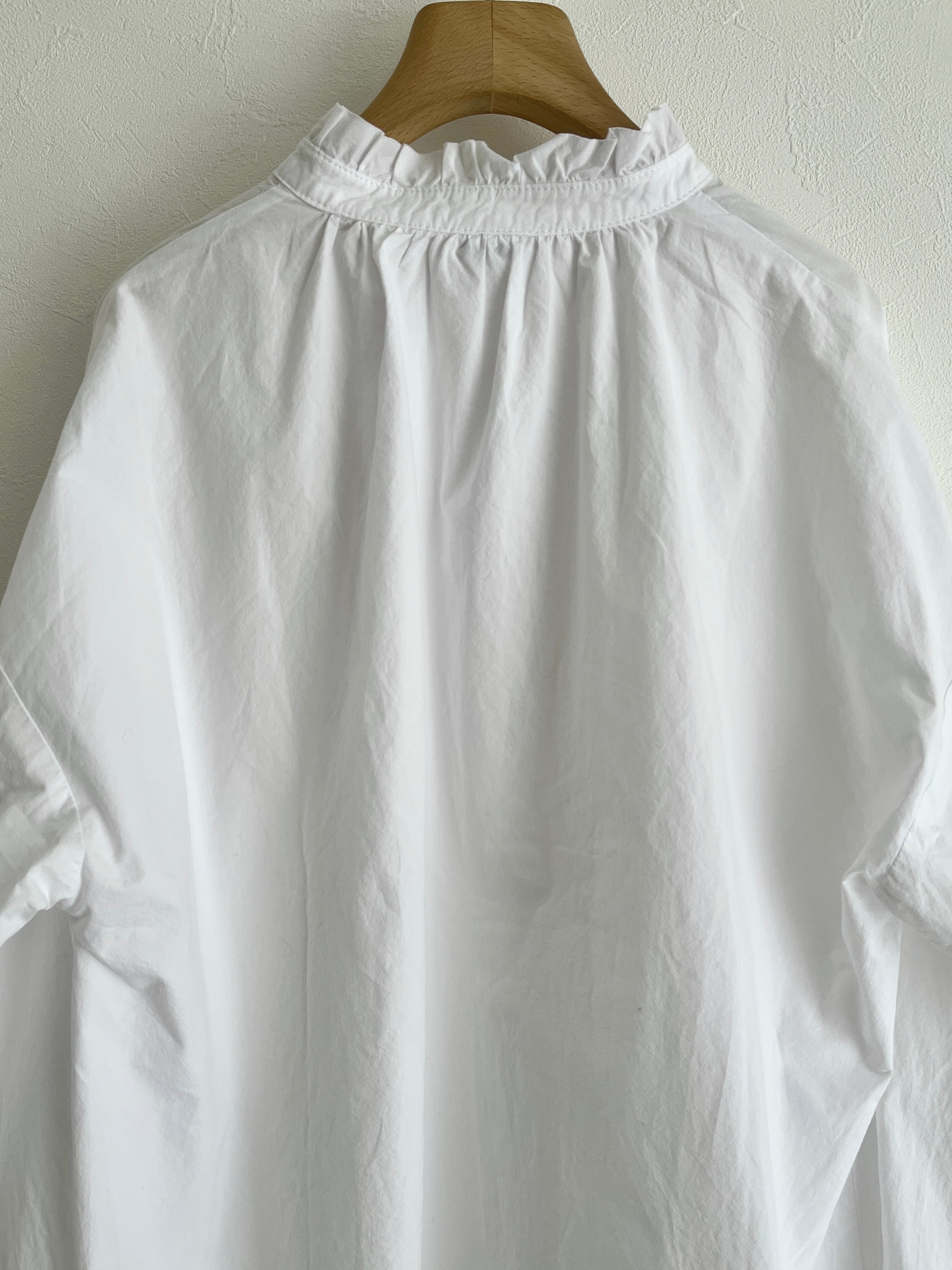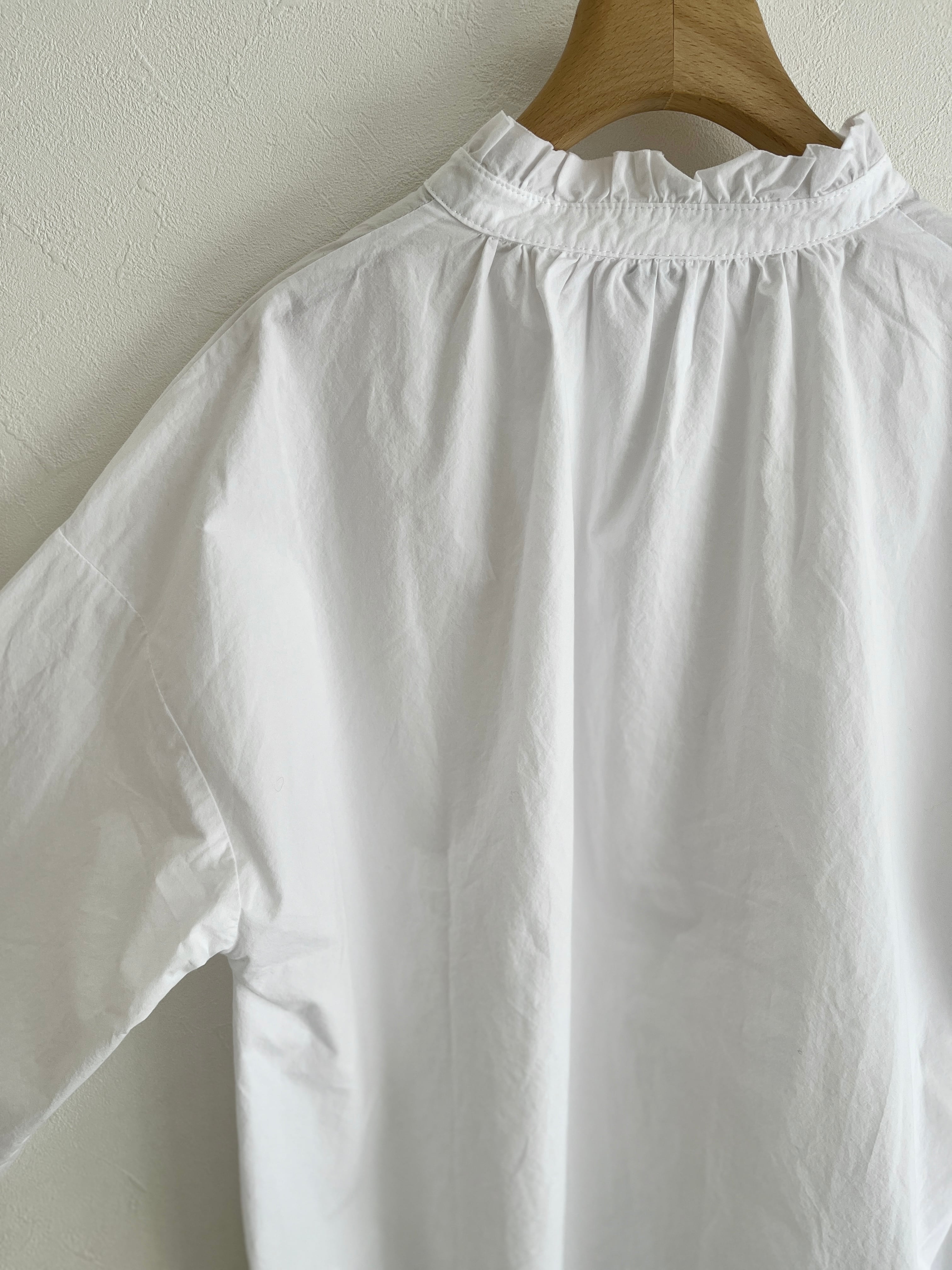 襟と袖のフリル始末を断ち切りにして軽さと抜け感を出した、程よい甘さのフリルブラウス。