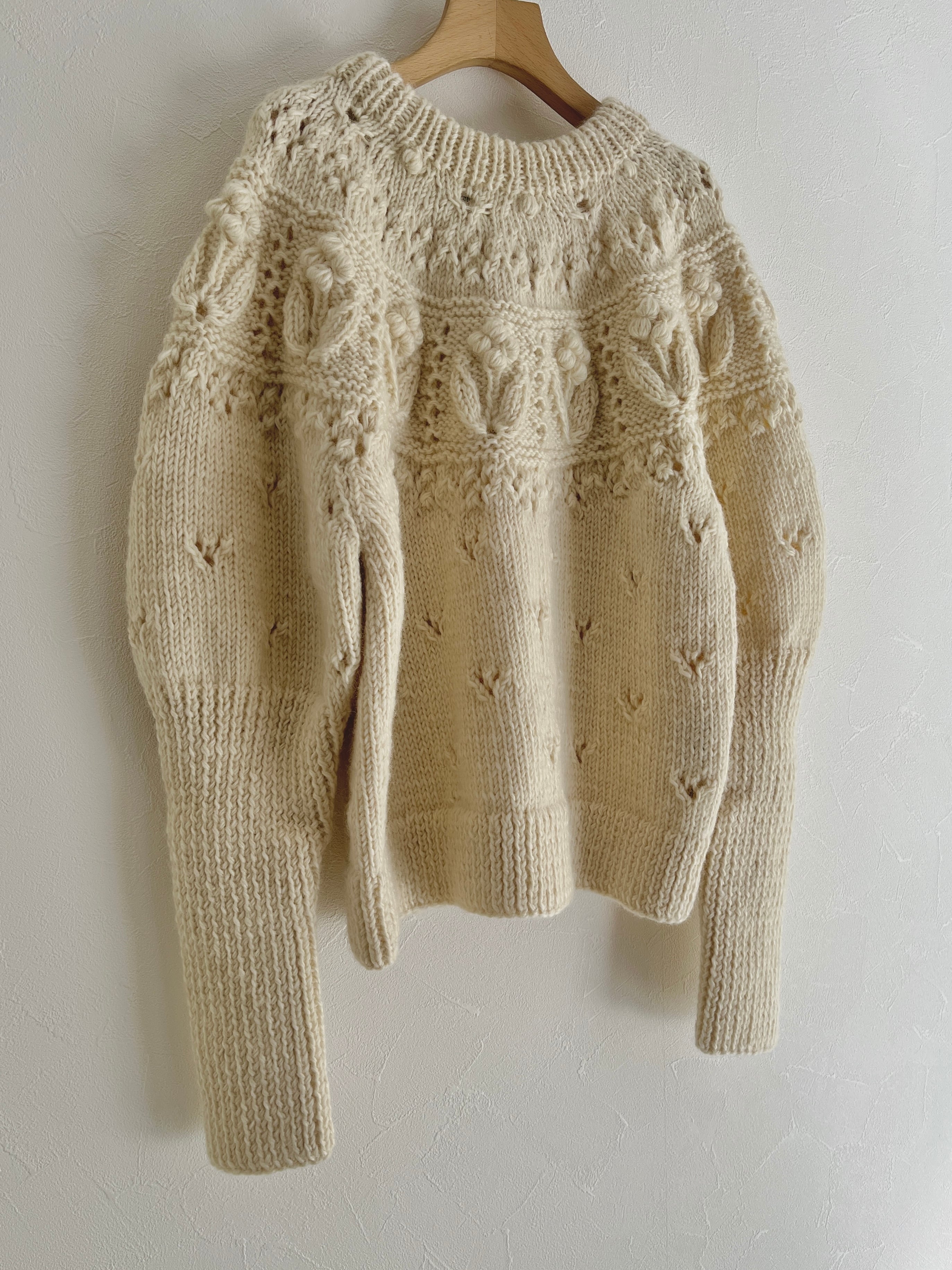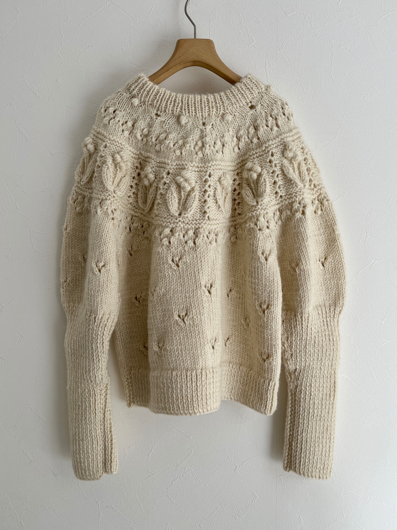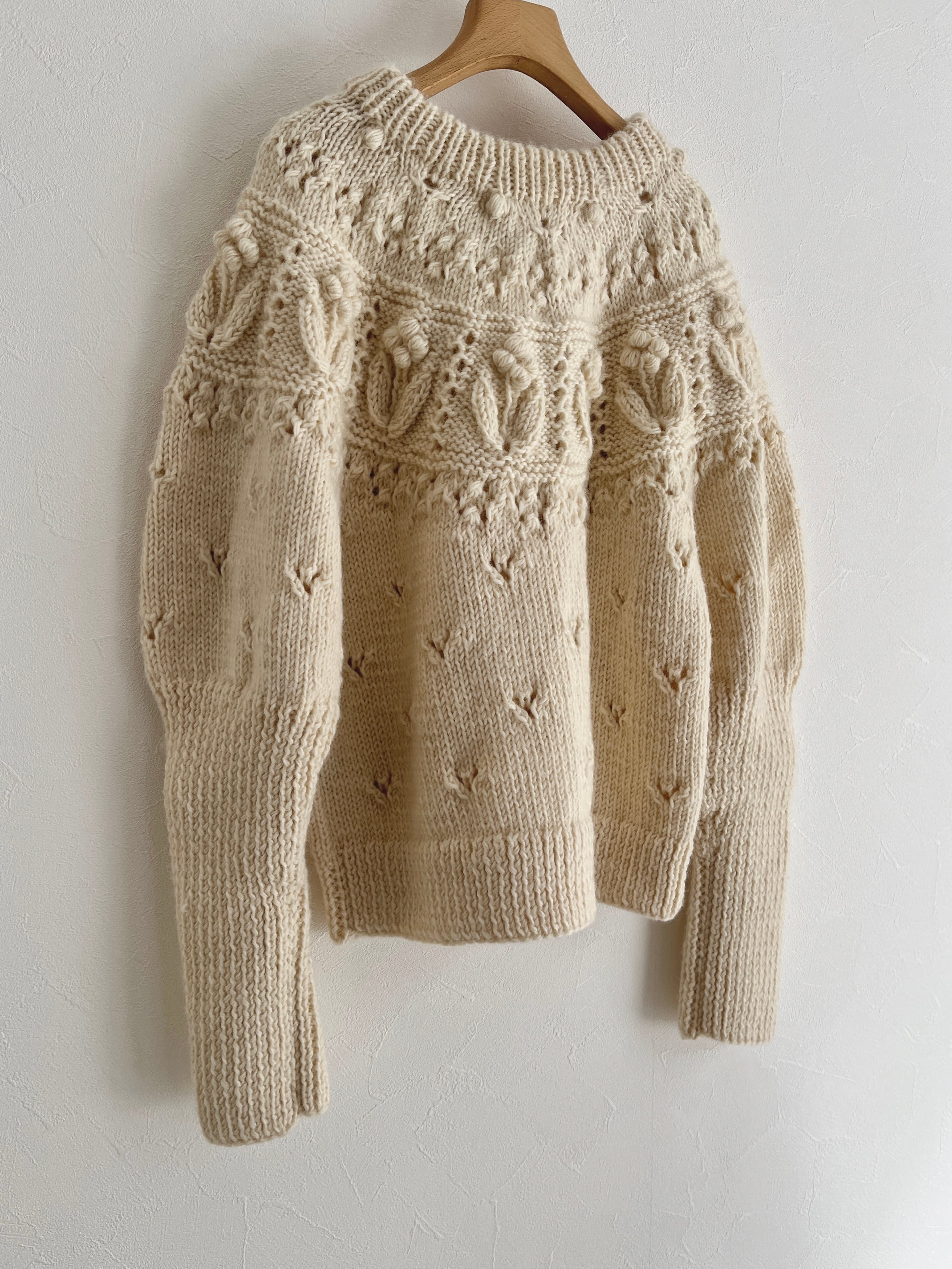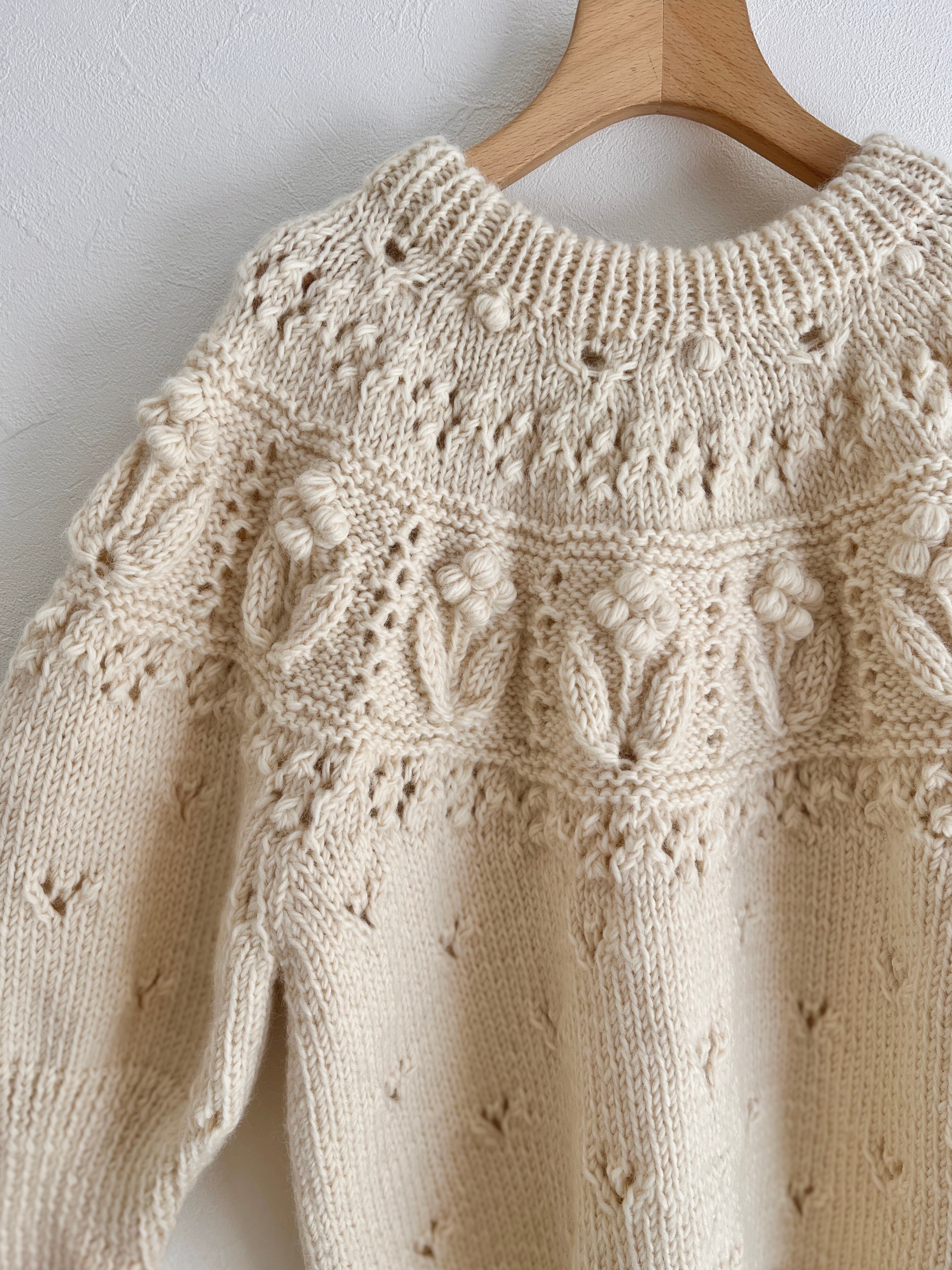 ぽこぽことした立体的な編みや透かしなどさまざまな編地を組み合わせたノスタルジックな求心ニット。