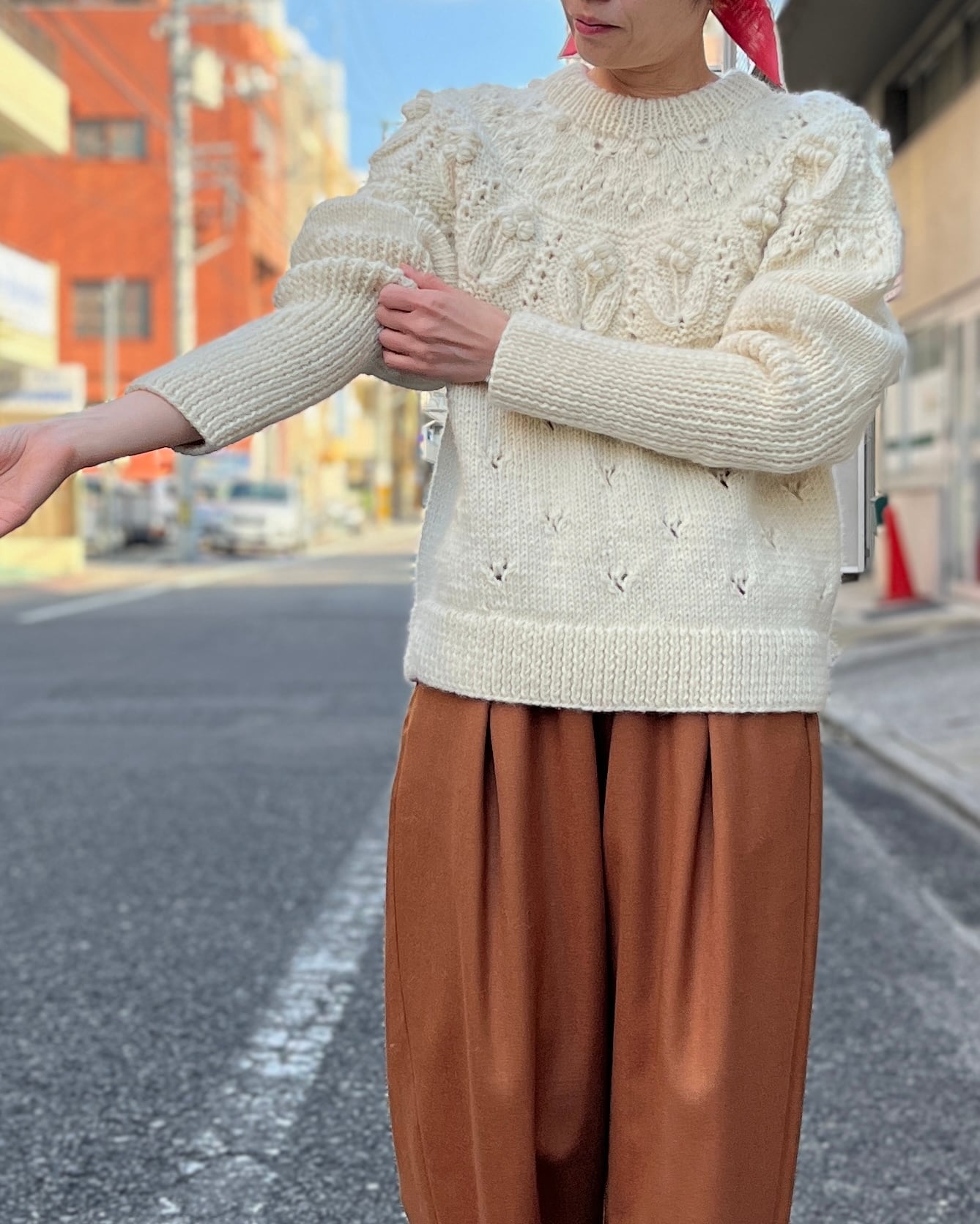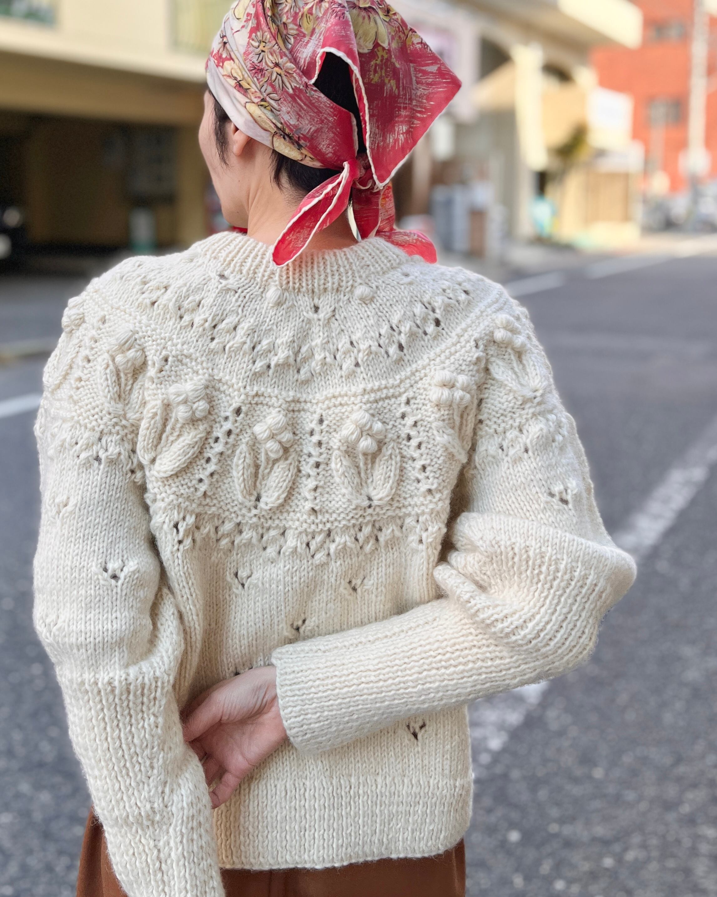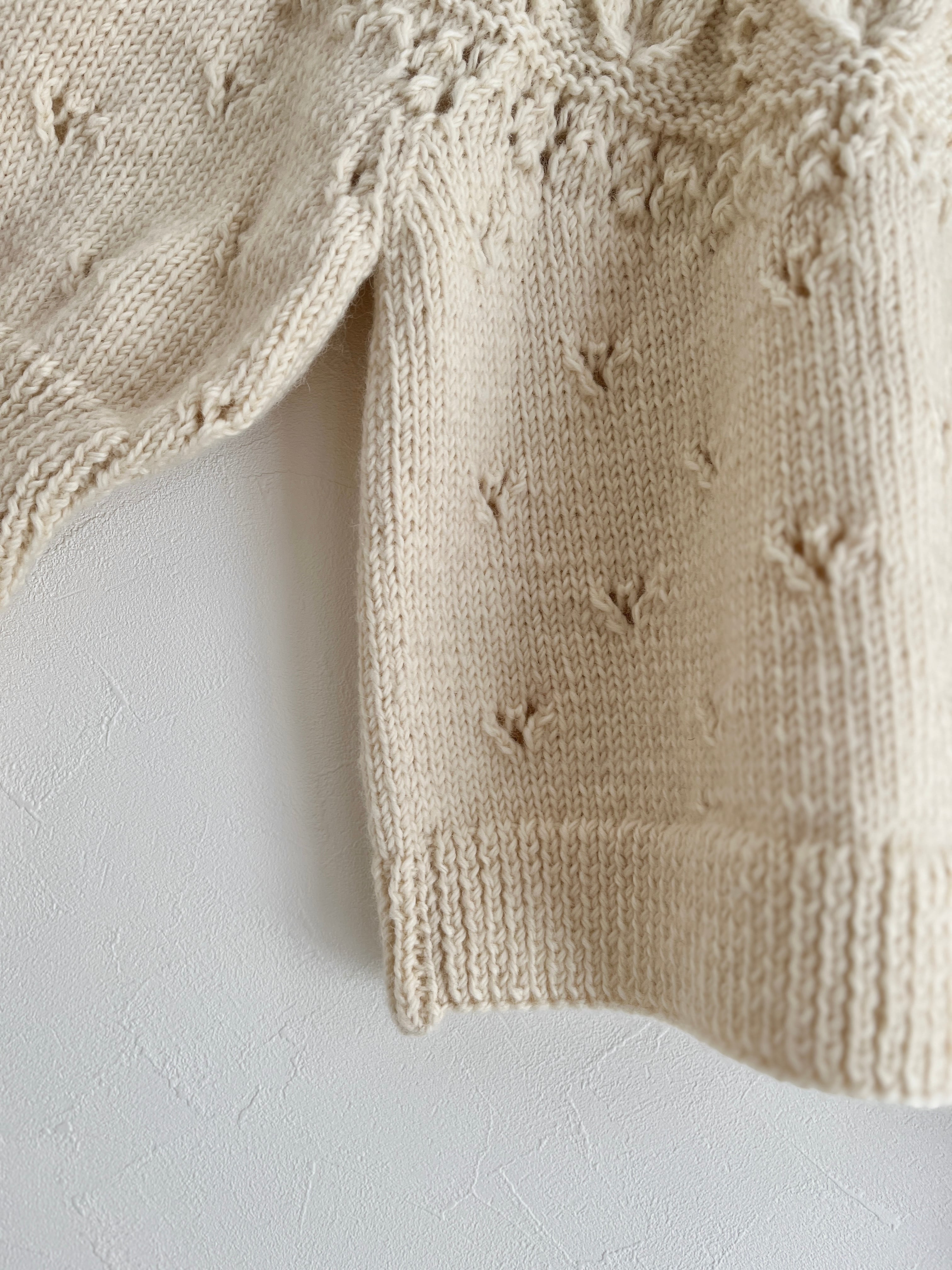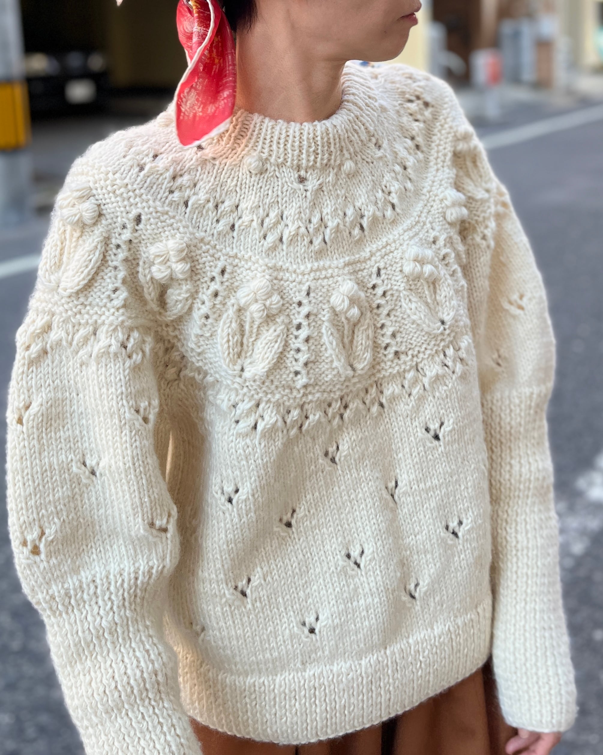 ぽこぽことした立体的な編みや透かしなどさまざまな編地を組み合わせたノスタルジックな求心ニット。