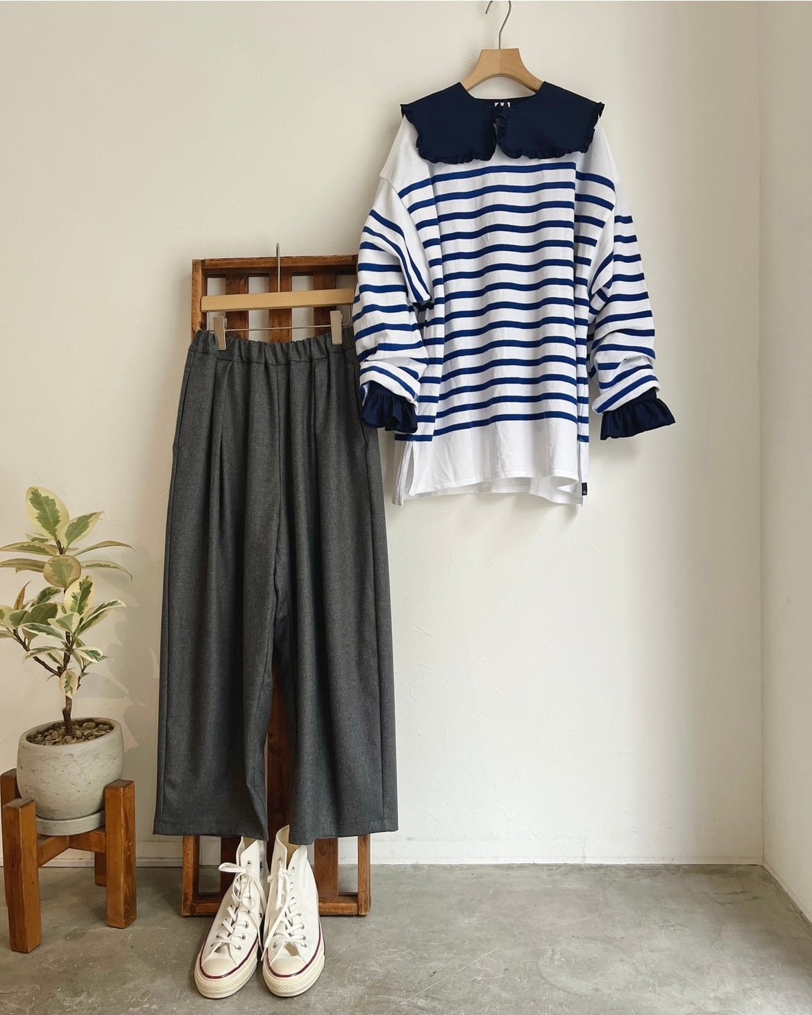 ガーリーで高級感のある印象なので、ボトムはデニムやカーゴパンツなどカジュアルアイテムとの合わせも◎