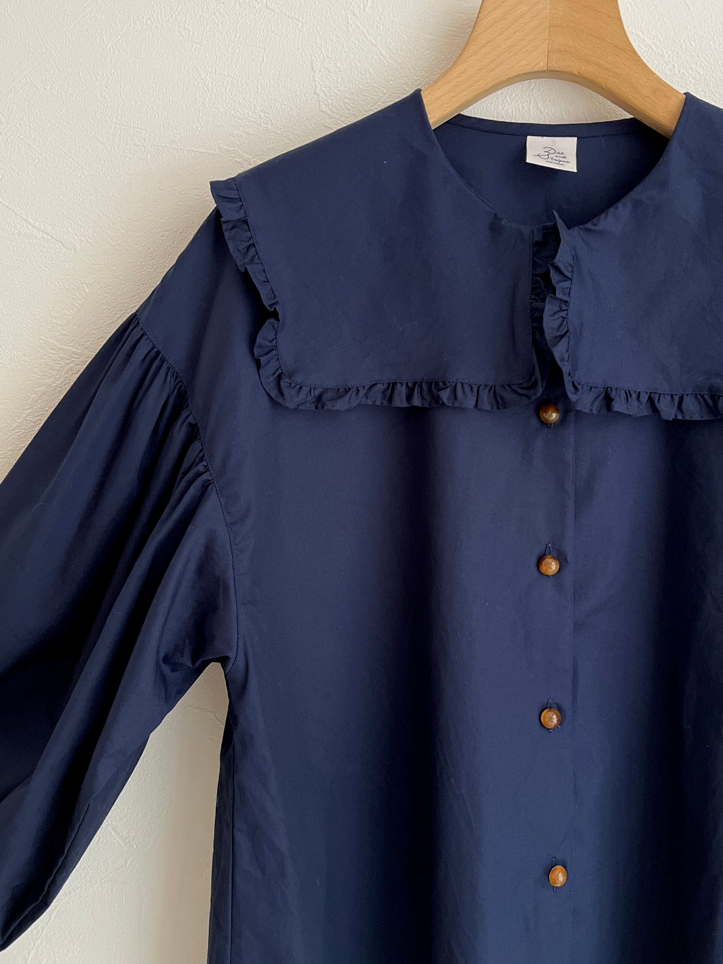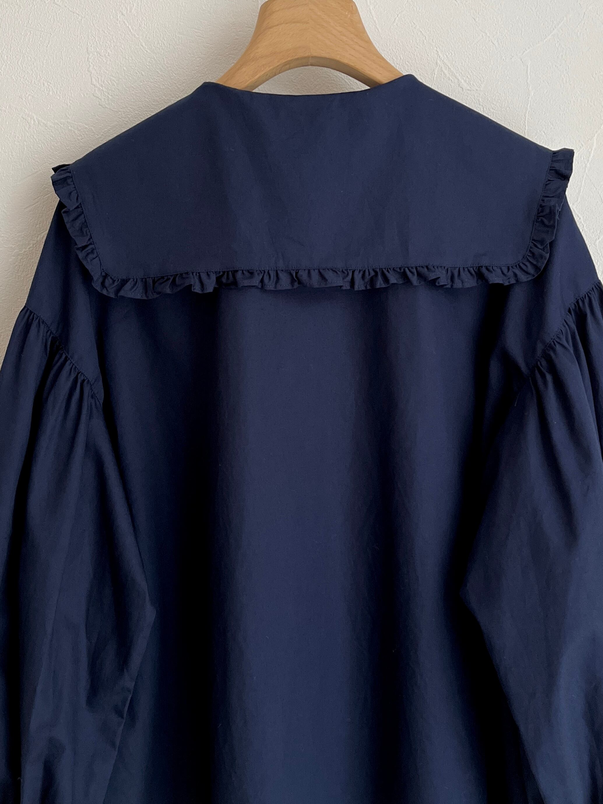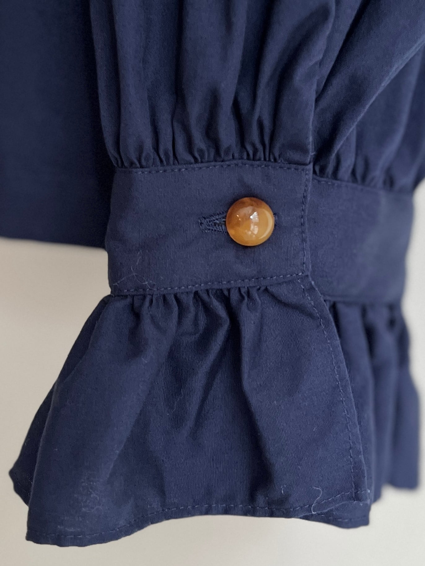 工場の技術によって袖に寄せたたっぷりのギャザーが綺麗に仕上がっているのも魅力の一つで、目を引く飴のようなコロンとした釦もポイントです。