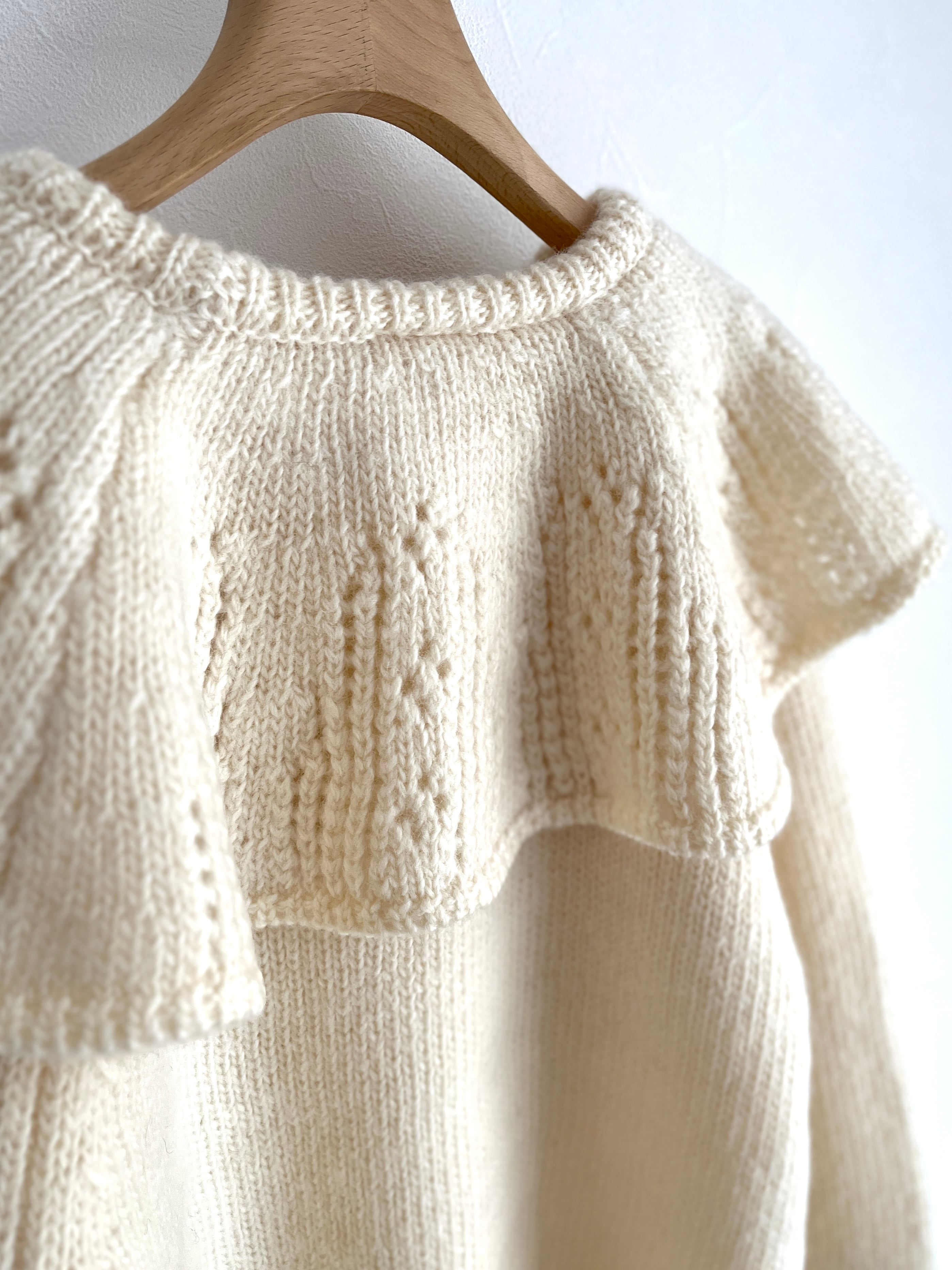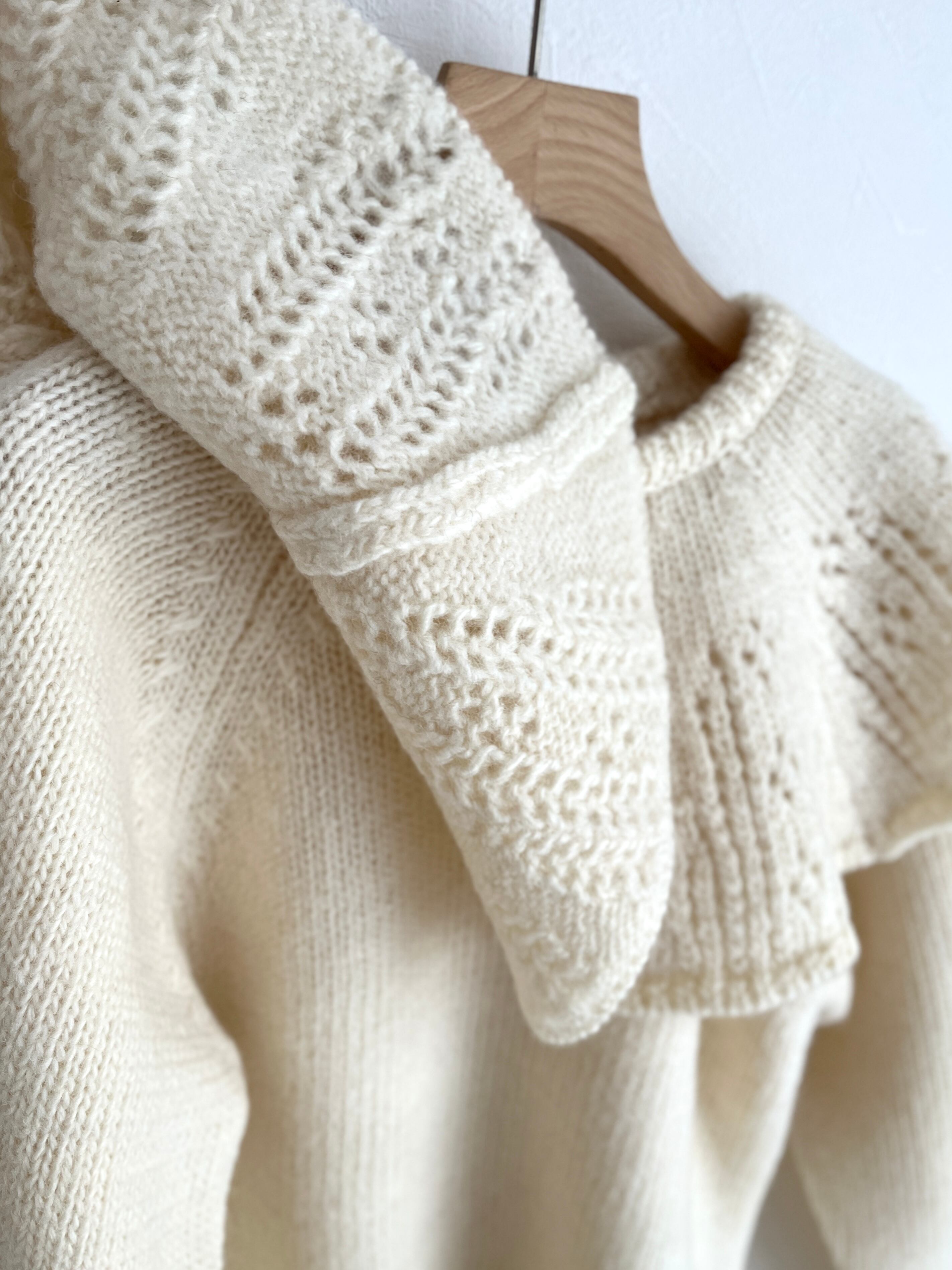ケープ襟の部分は透かし編みにすることで、軽やかな印象に。緩やかなフレアが広がり、立体感なシルエットも魅力的です。