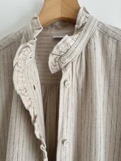 顔周りがパッと華やかになるフリルや、襟元と袖、後ろヨークに施したギャザーでふんわりと立体的な一着に仕上げました。何かと便利なポケットと、安心感のある長めの着丈も嬉しいポイント。甘さのあるディテールを取り入れた分、ベーシックカラーをチョイスし幅広い年代の方に着ていただきやすいアイテムを目指しました。