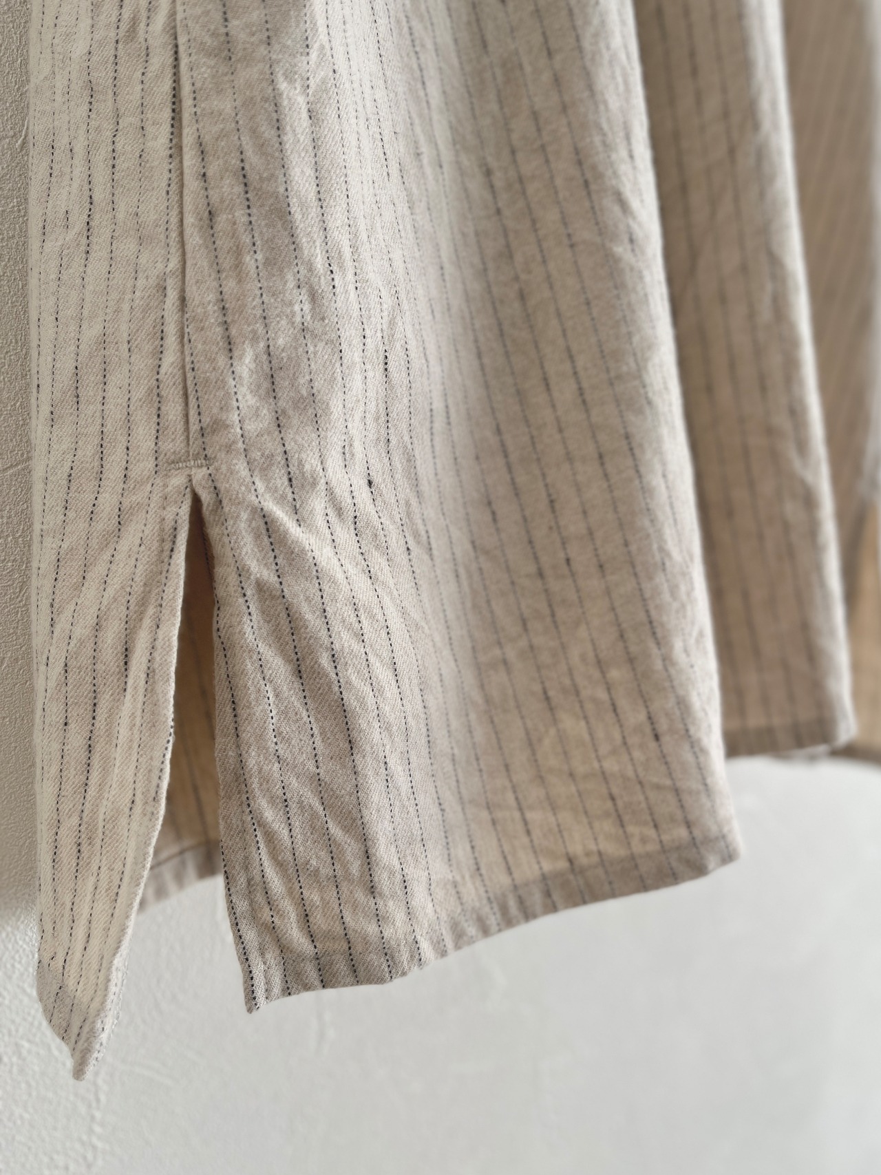 適度に起毛感のあるふっくらとした風合いの生地は、ステッチ状のストライプ柄が引き立つ事でほっこりせず凛とした印象。