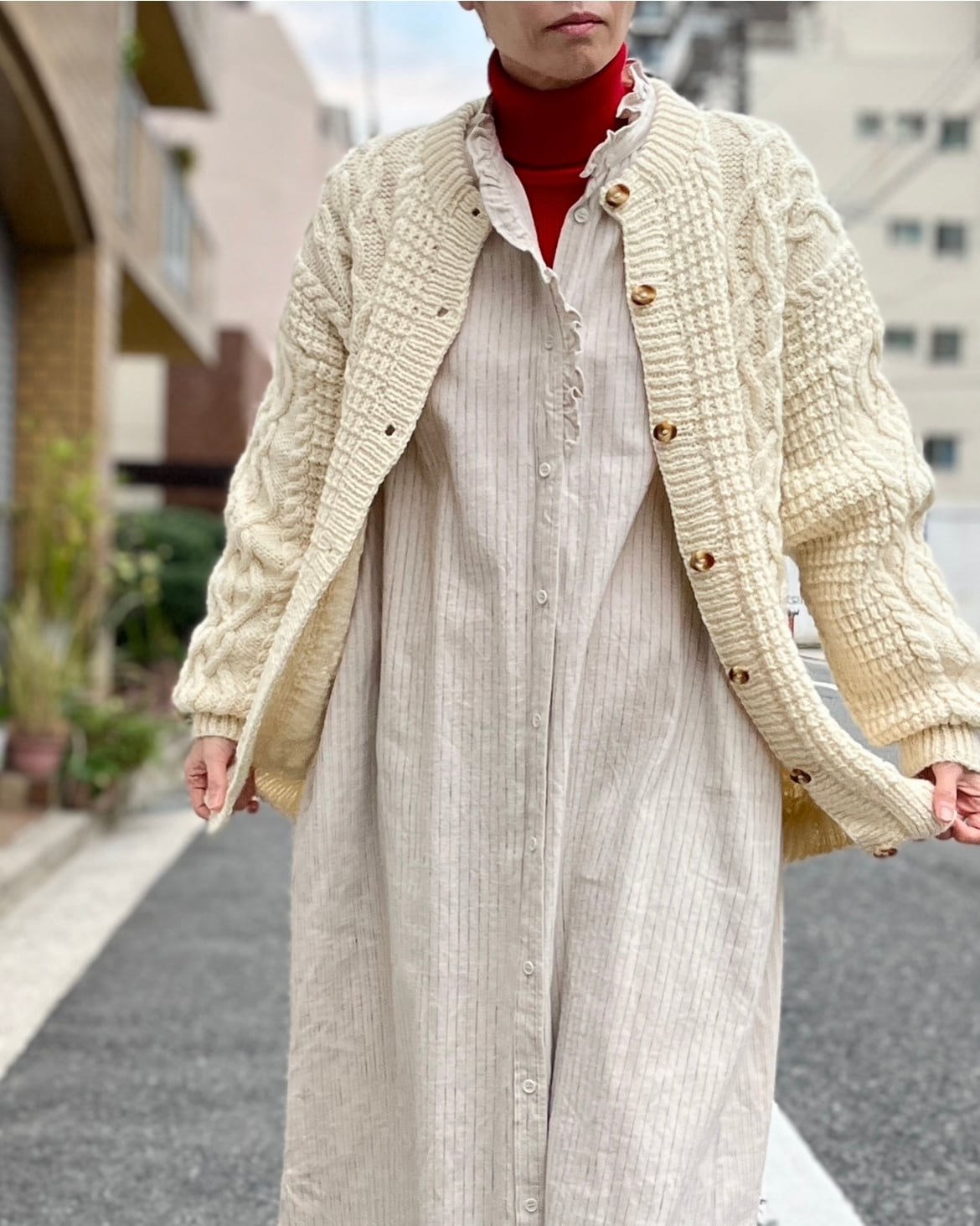 季節の変わり目にはベストとレイヤードした軽めのスタイリングを楽しんで。気温が低い日にはニットカーディガンを羽織って、デニムやチノパンツなどメンズライクなボトムとの合わせもおすすめです。
