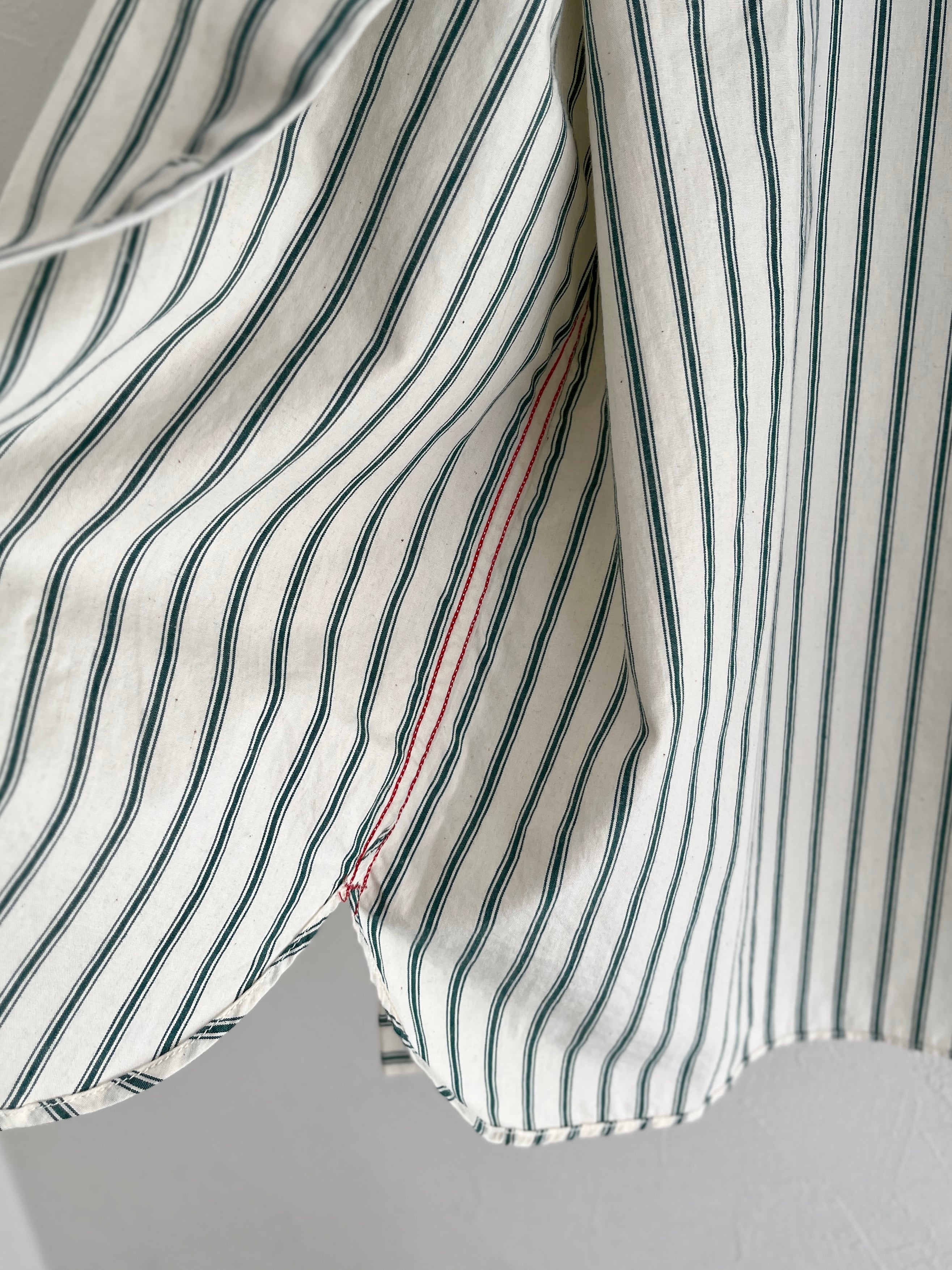 袖まくりをしたときにさりげなく見える袖裏から脇にかけては、表と裏の見え方が異なる赤のチェーンステッチを走らせ裏の始末までこだわりました。ステッチが鎖状のため太く見えるので、ロールアップしたときのさりげないアクセントに。デニムの縫製に使われることの多いチェーンステッチはパッカリングという波打つようなアタリが特徴。ピシッと機械的な仕上がりではなく、立体的で遊びのあるシルエットとなります。羽織った時にのぞく前ボタンの端部分と袖口に使用した赤耳も、よく見るとわかるどこかワークなこだわり。