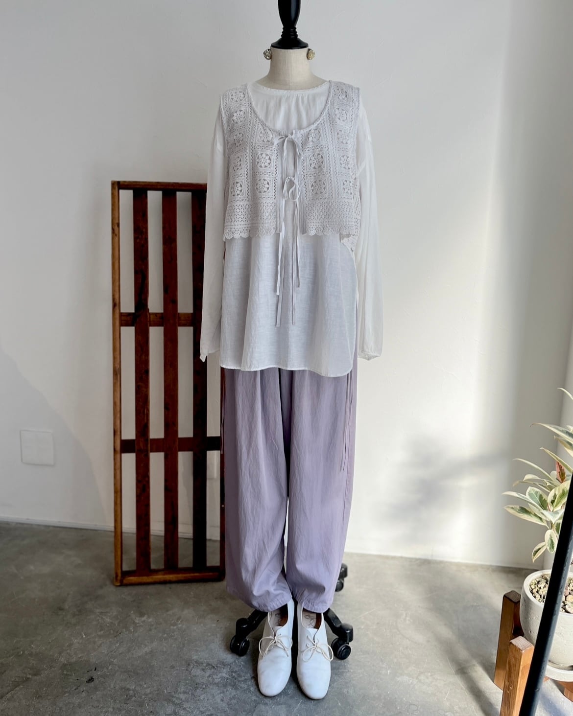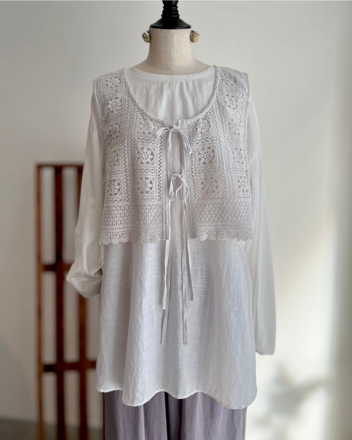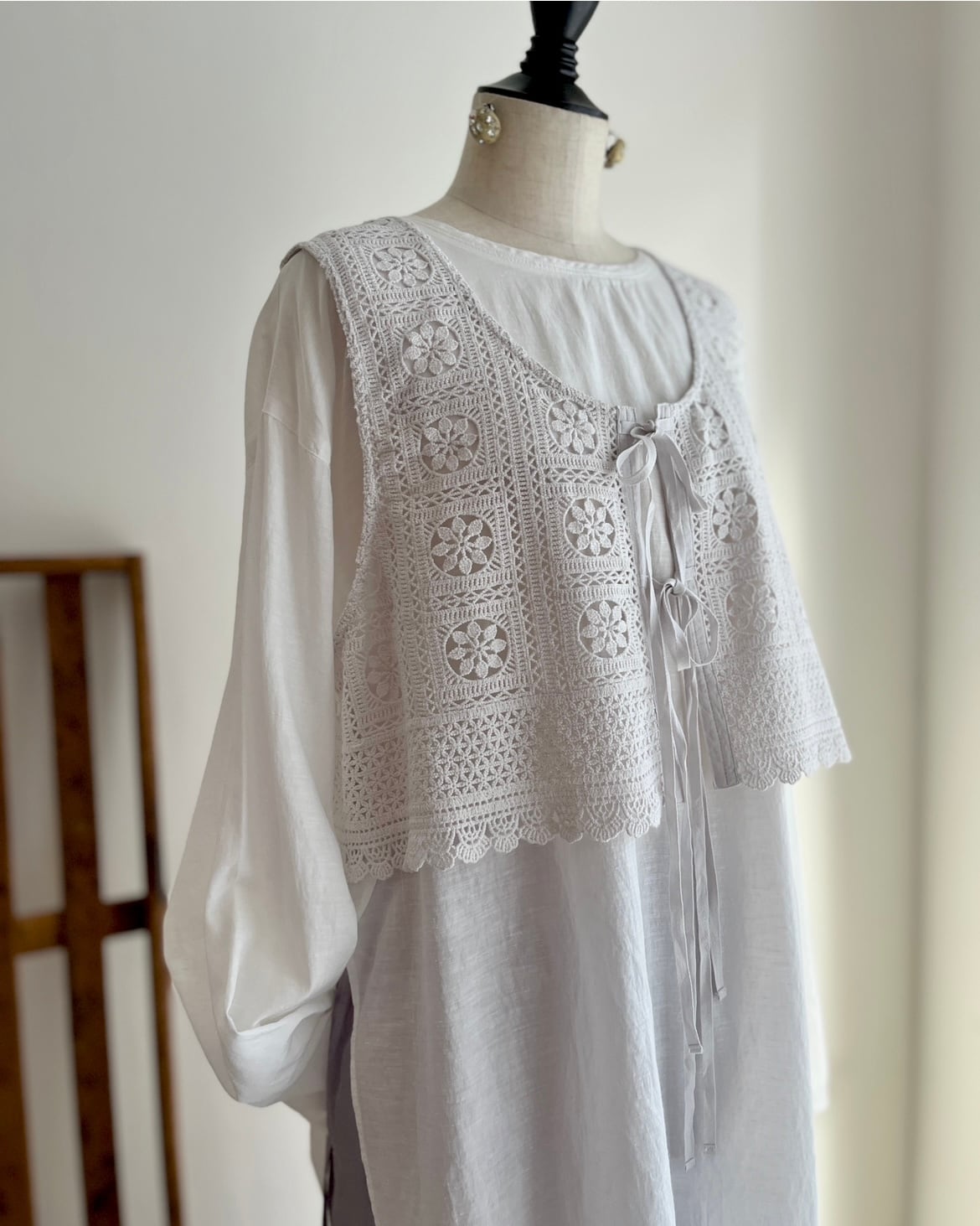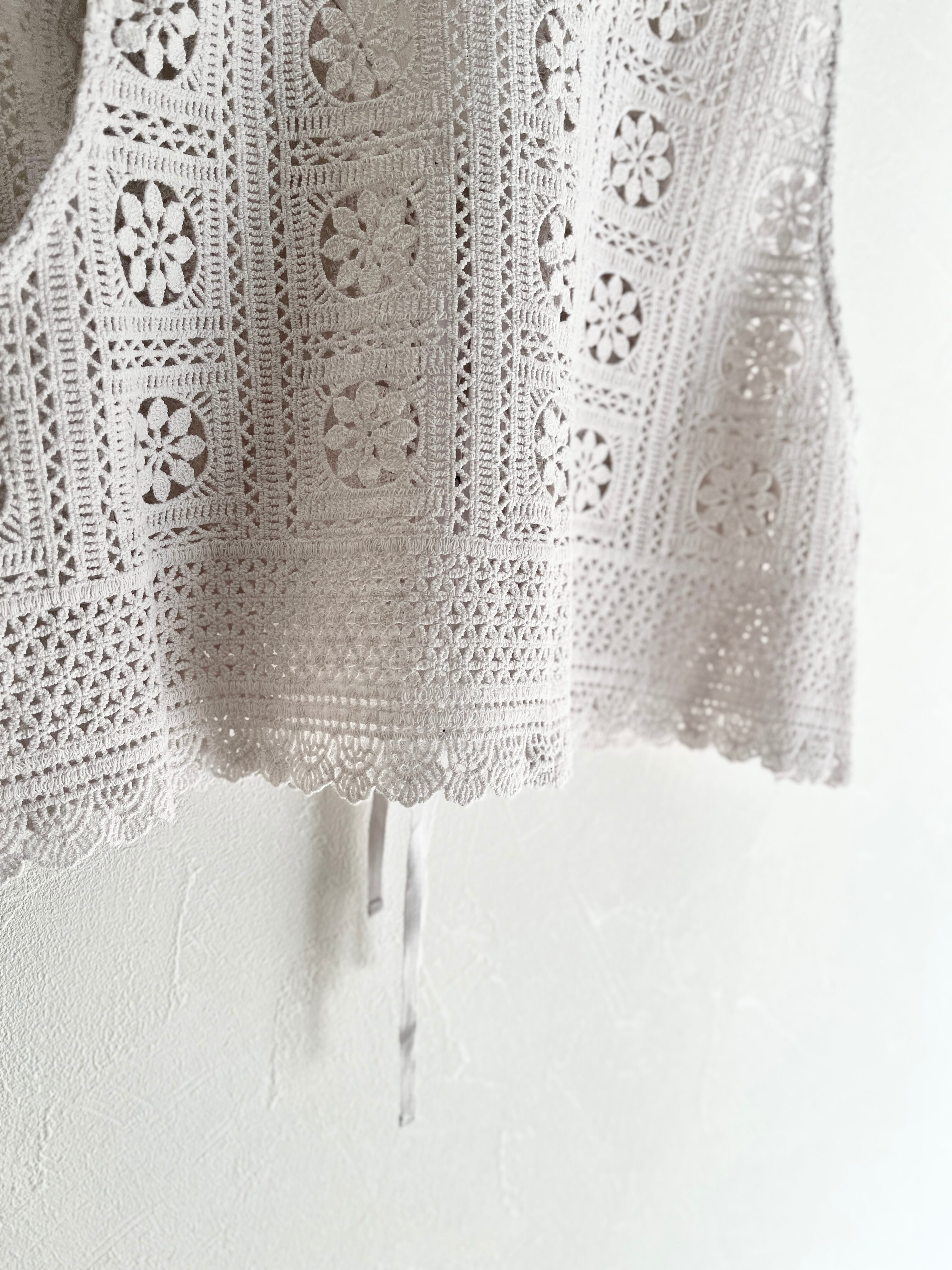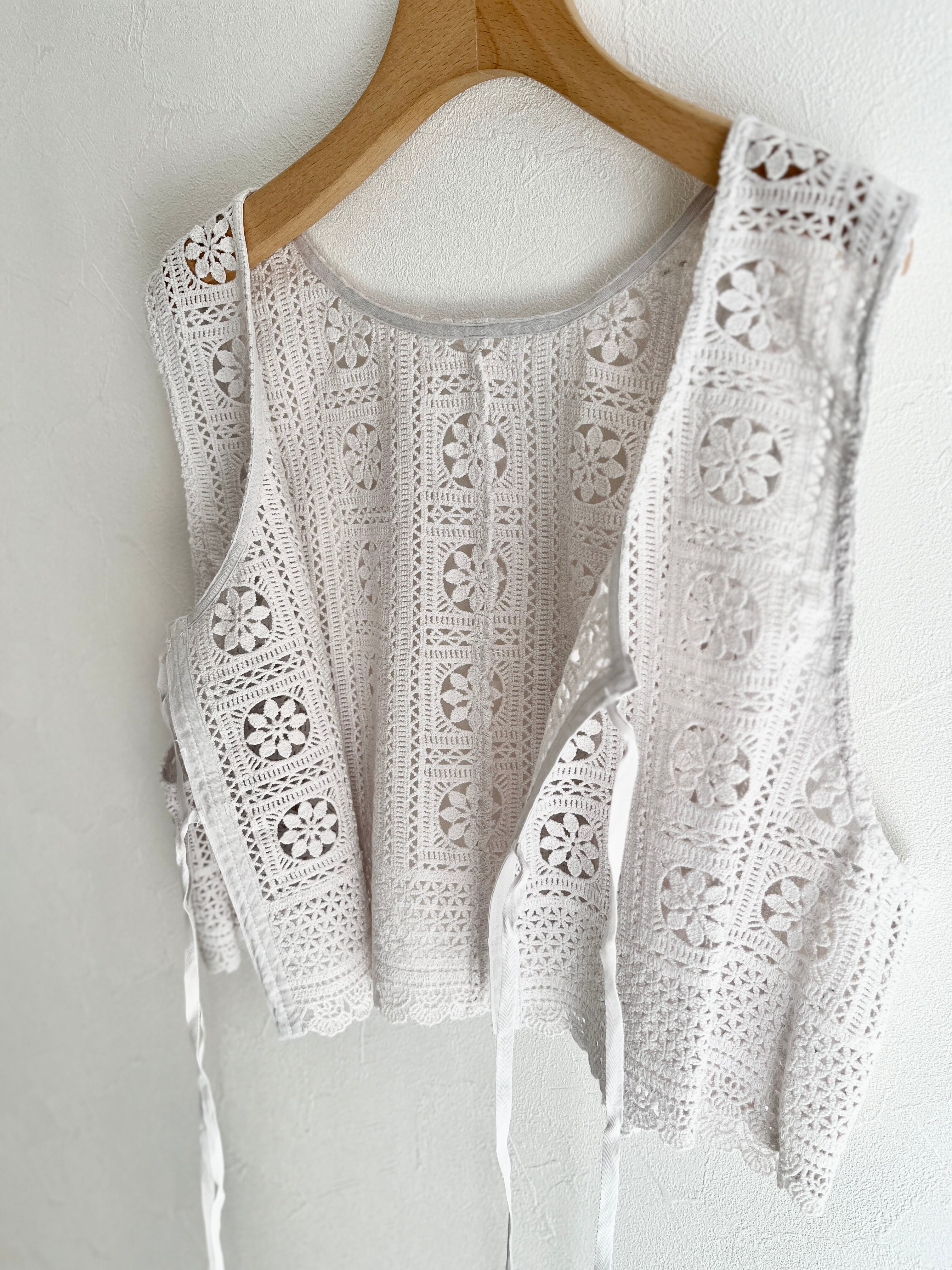 コットンレースに、花の模様をタイルのようにつなぎ合わせた、どこかクラシックでやさしい空気をまとうシンプルなかたちの、レースベスト。