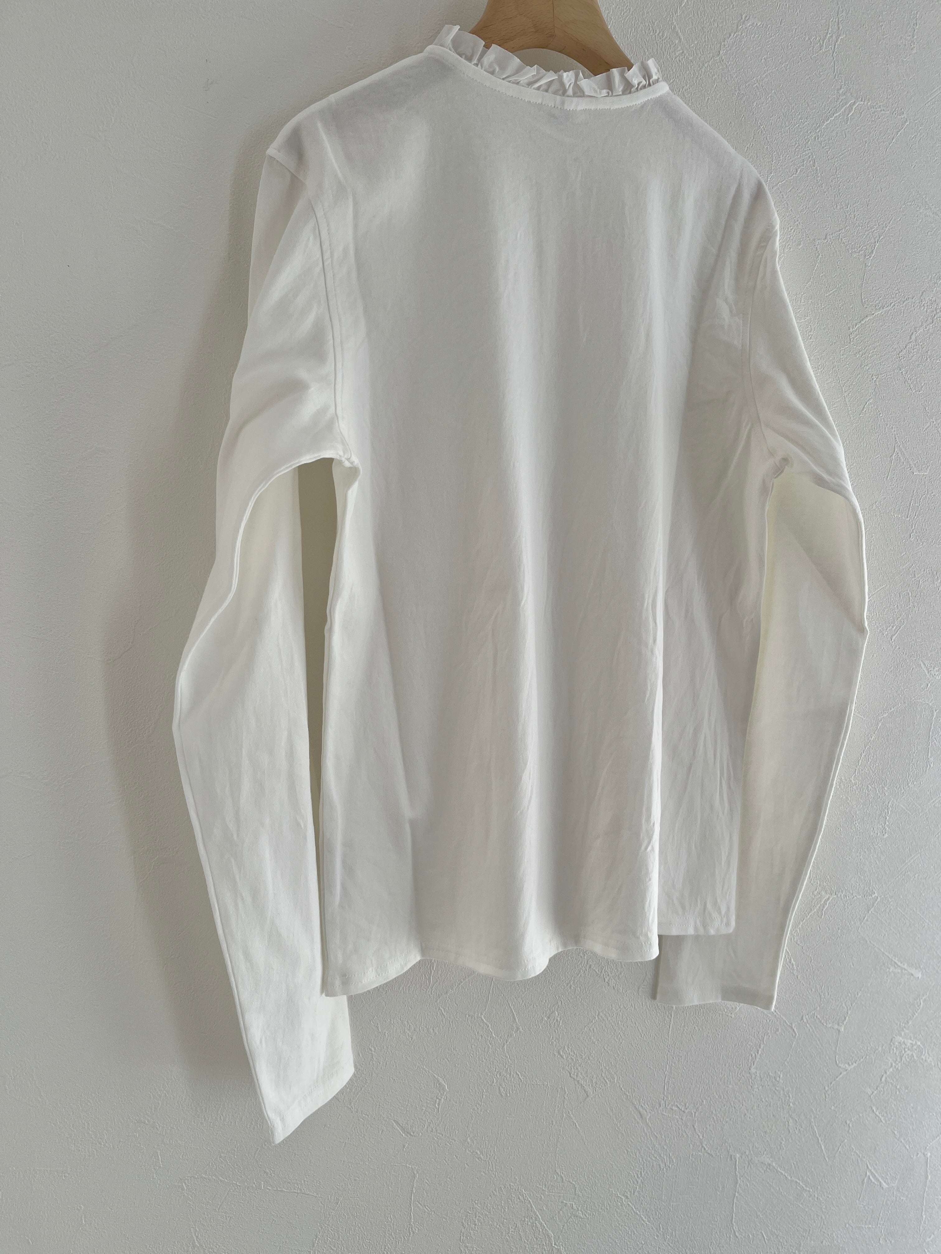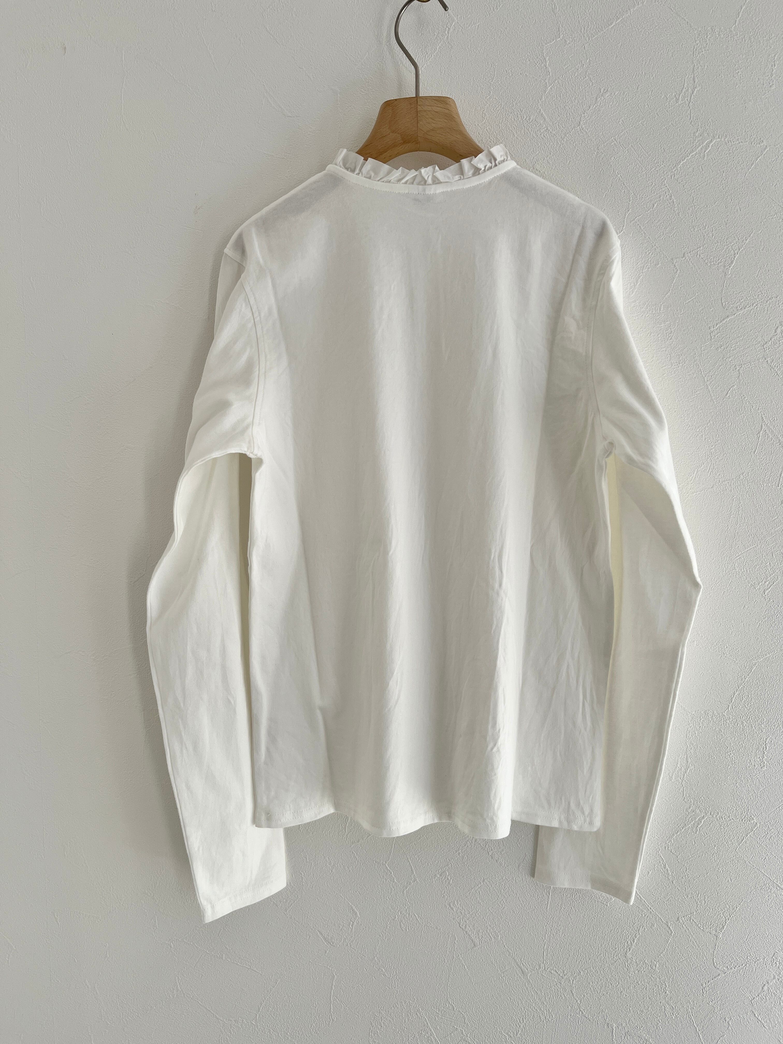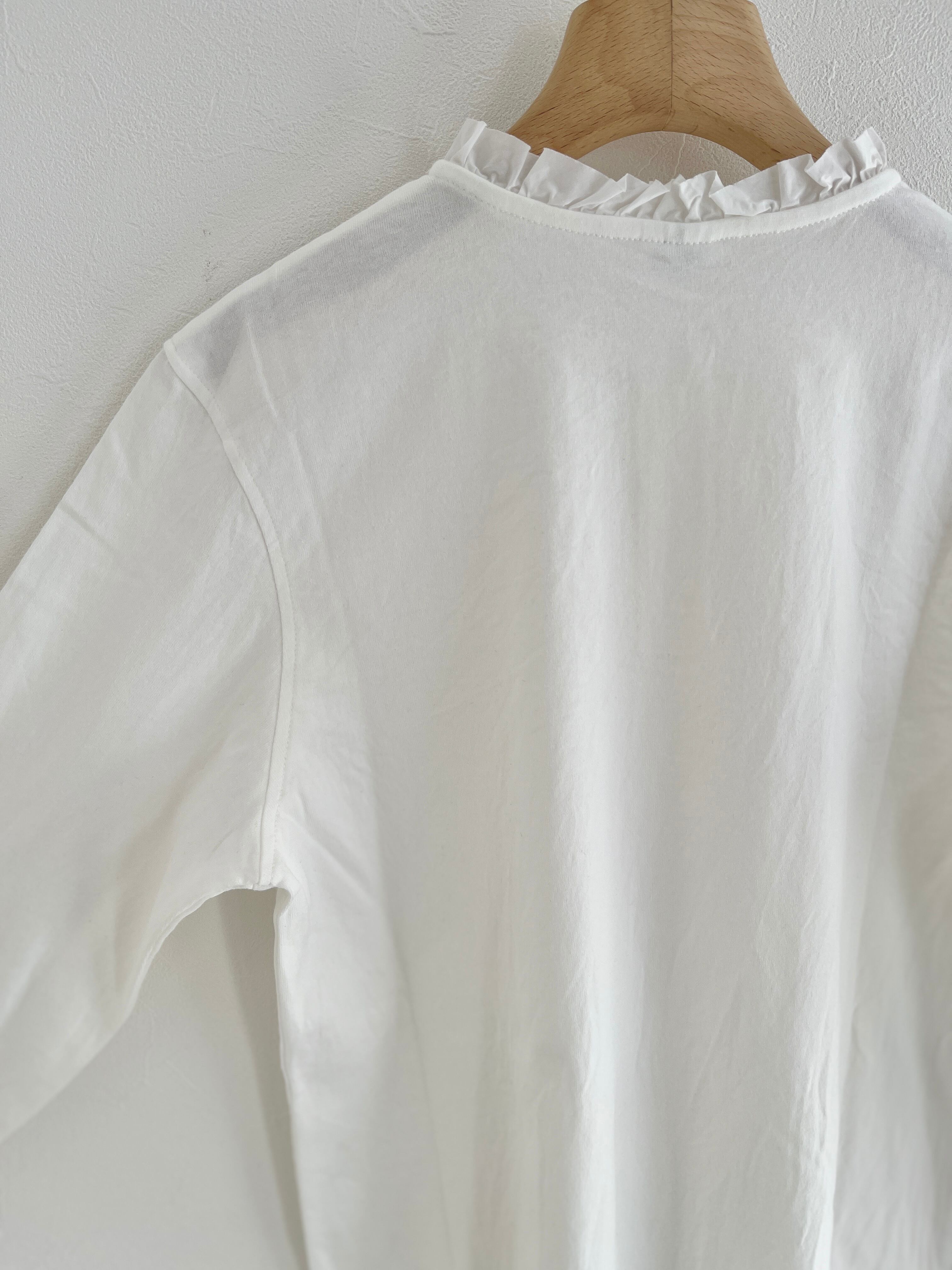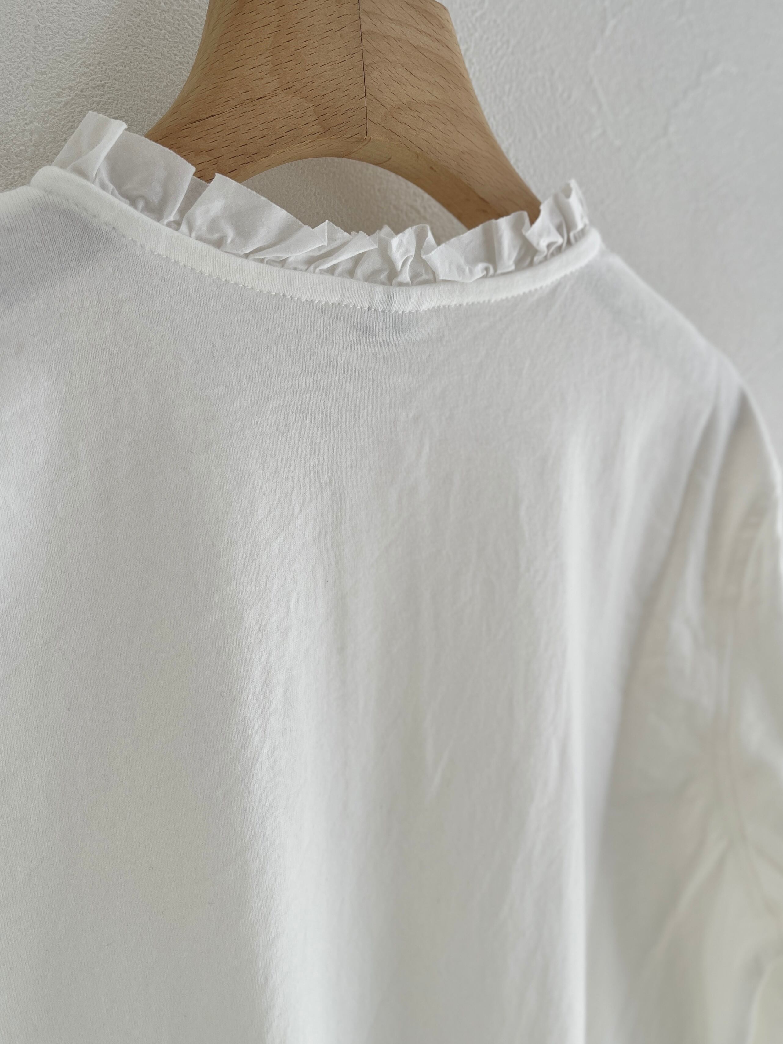 襟元のさりげないフリルがかわいらしい、レイヤードのスタイリングで活躍するカットソー。