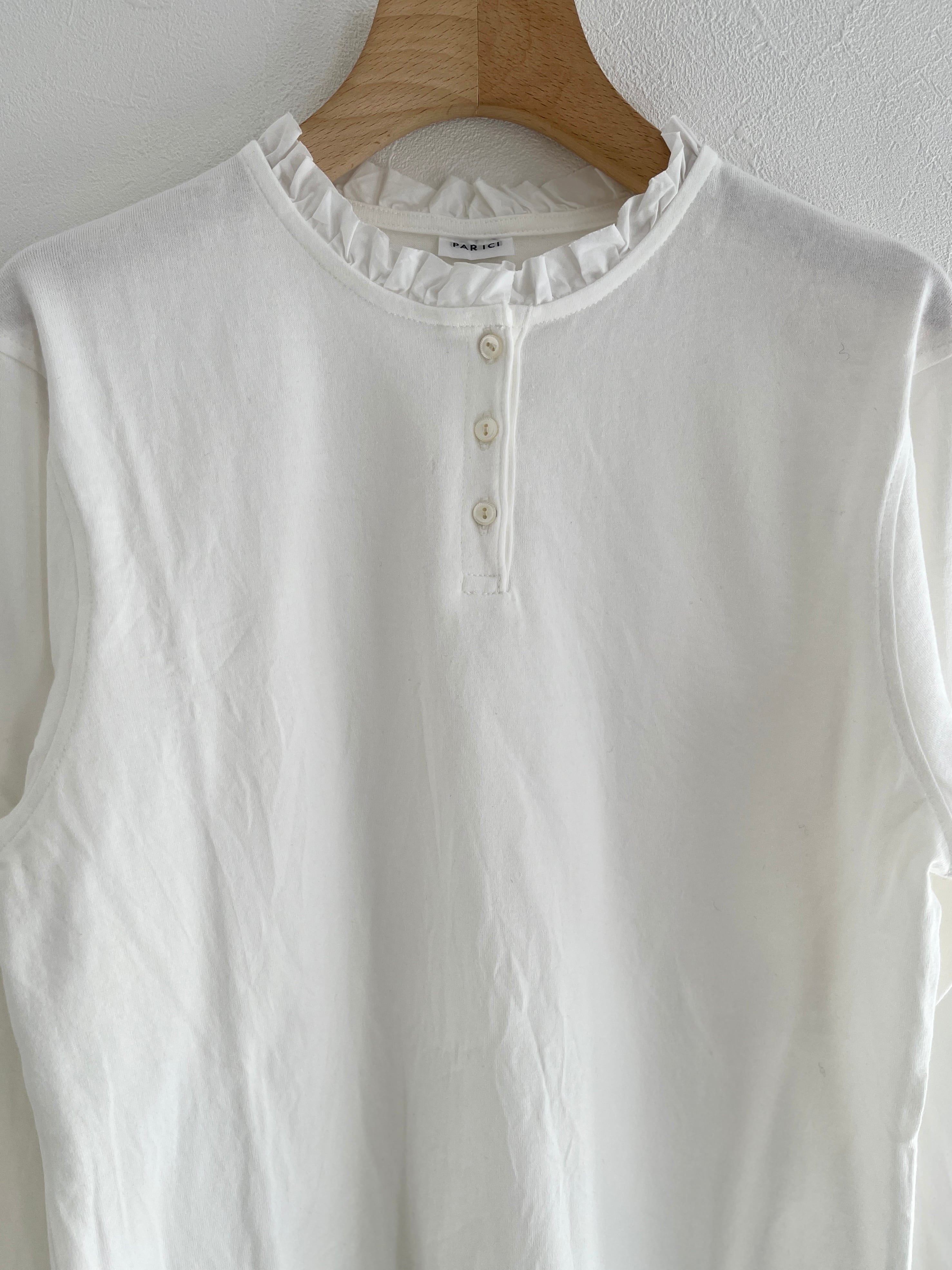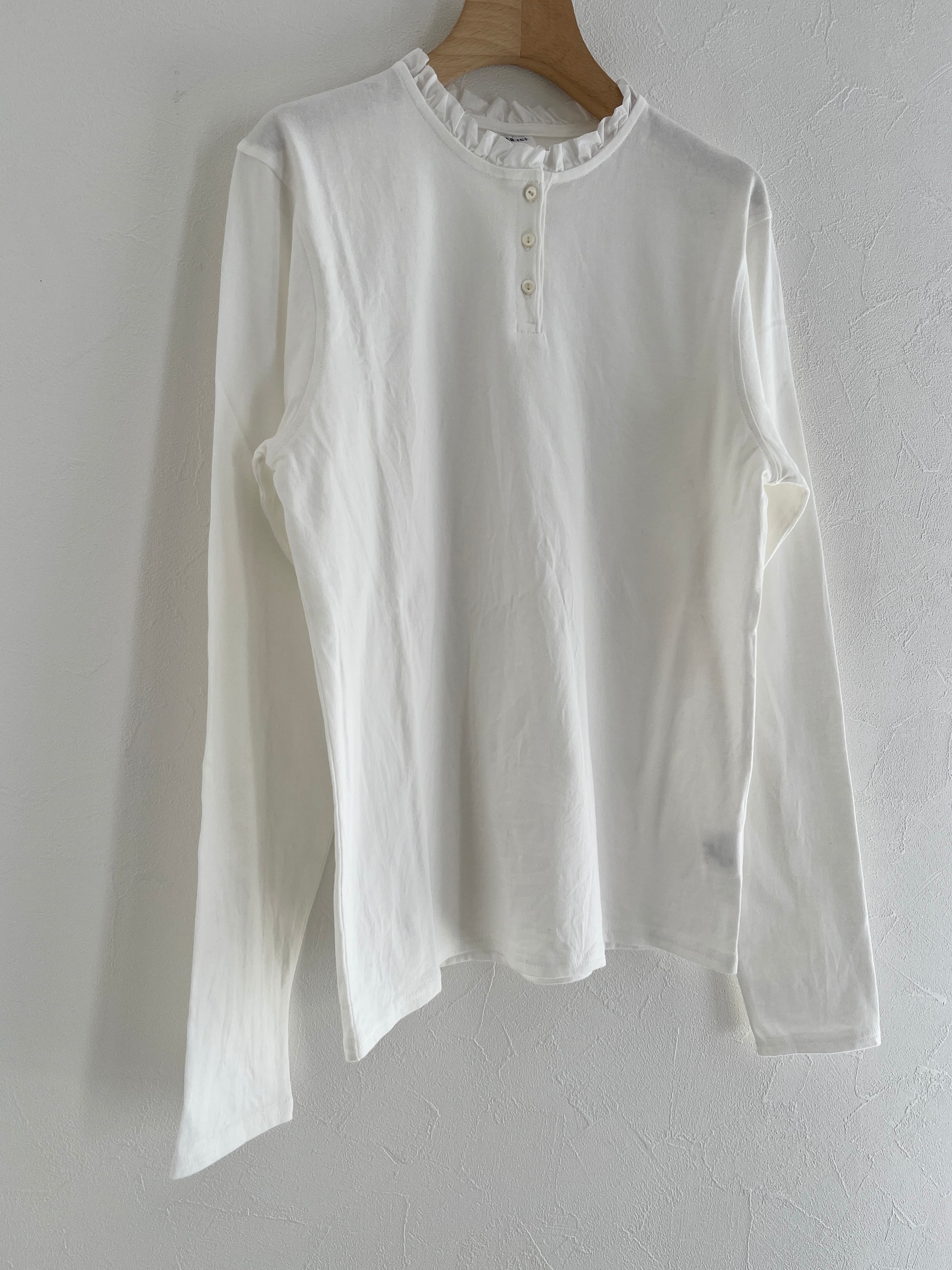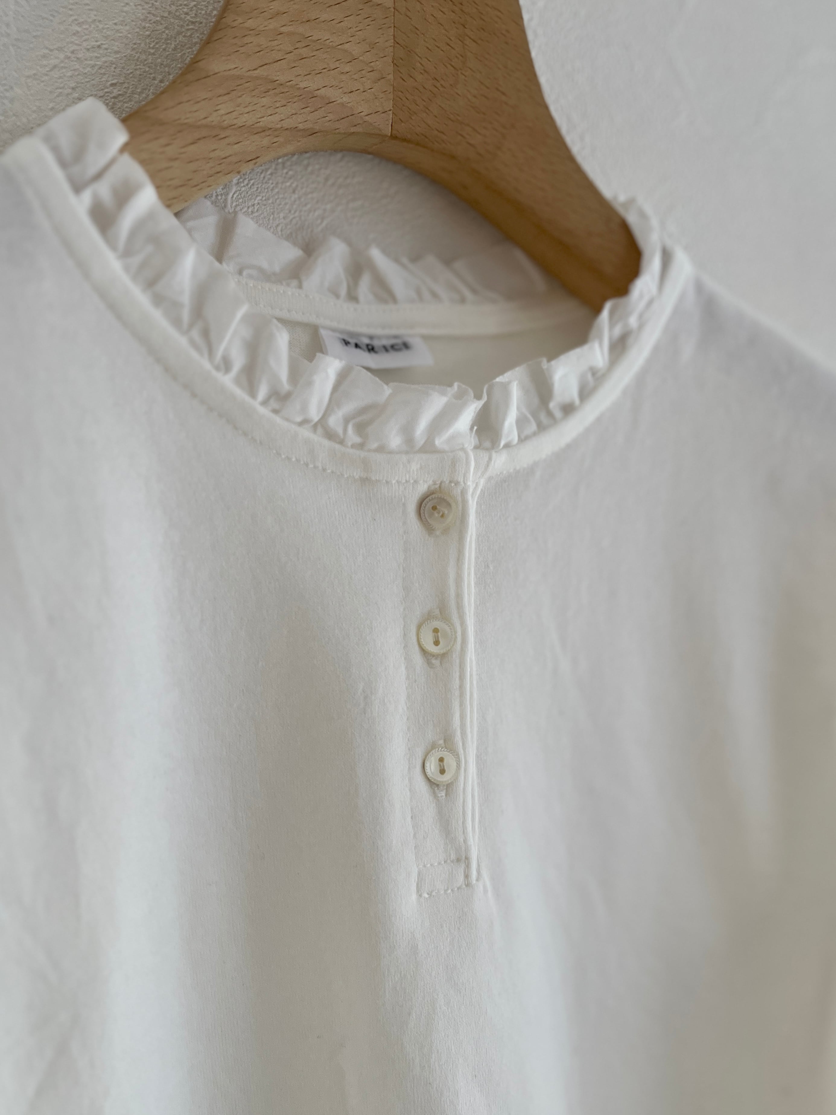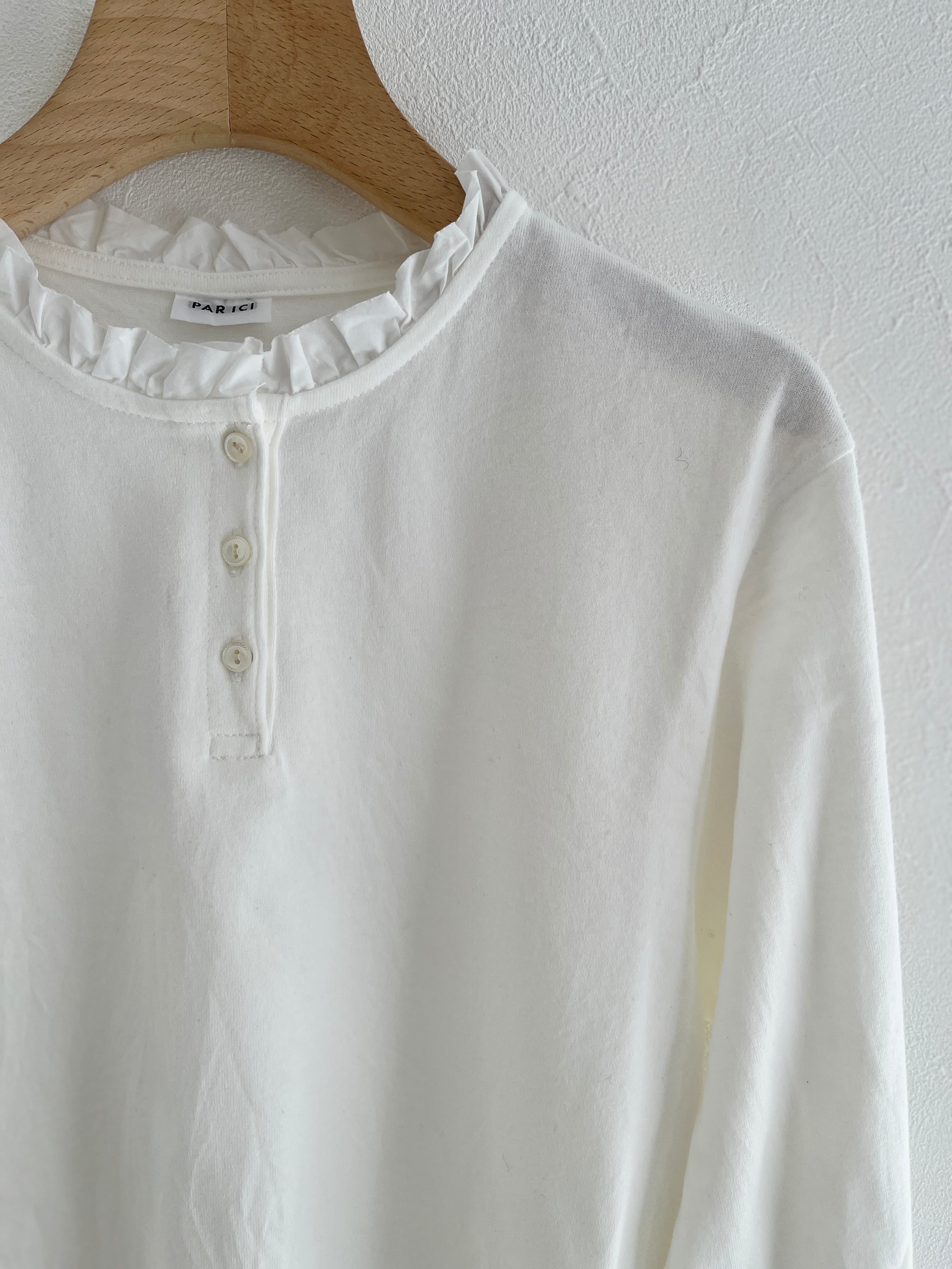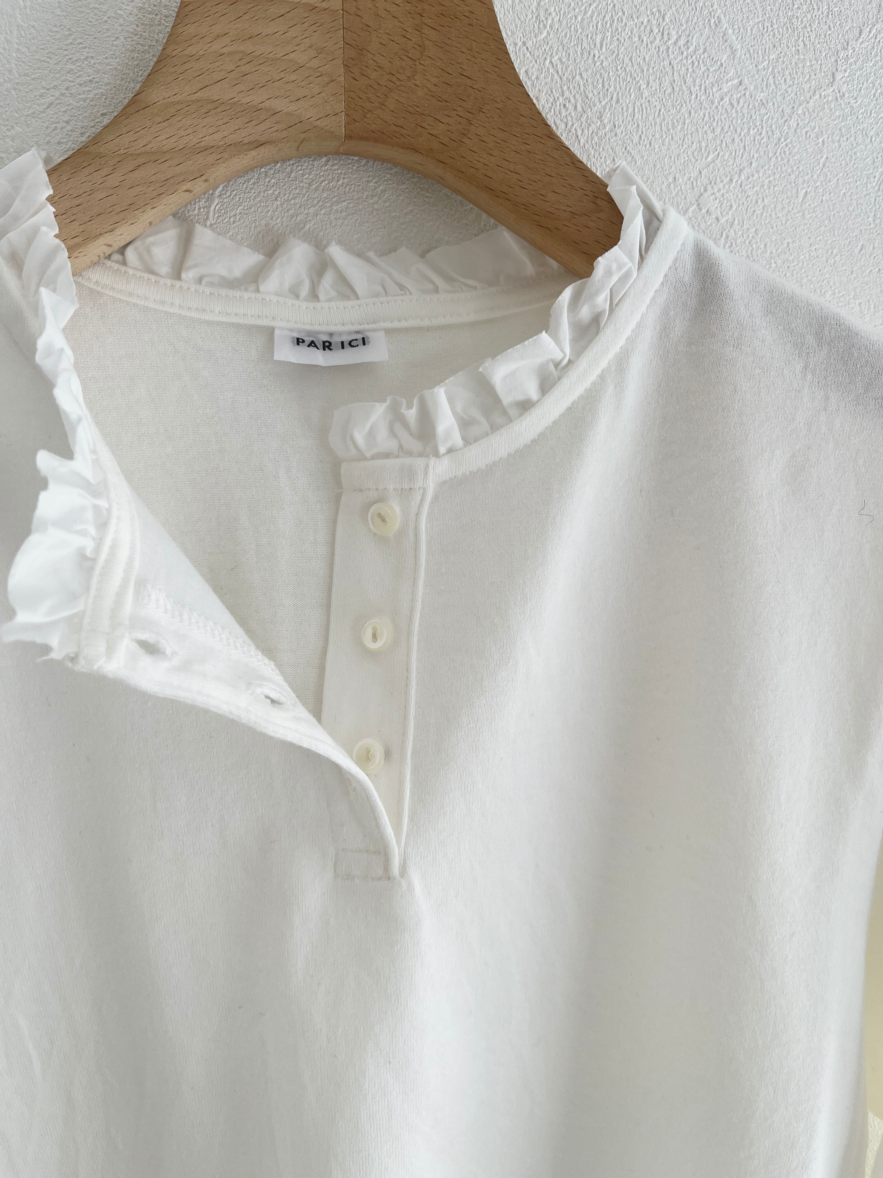 襟元のさりげないフリルがかわいらしい、レイヤードのスタイリングで活躍するカットソー。
