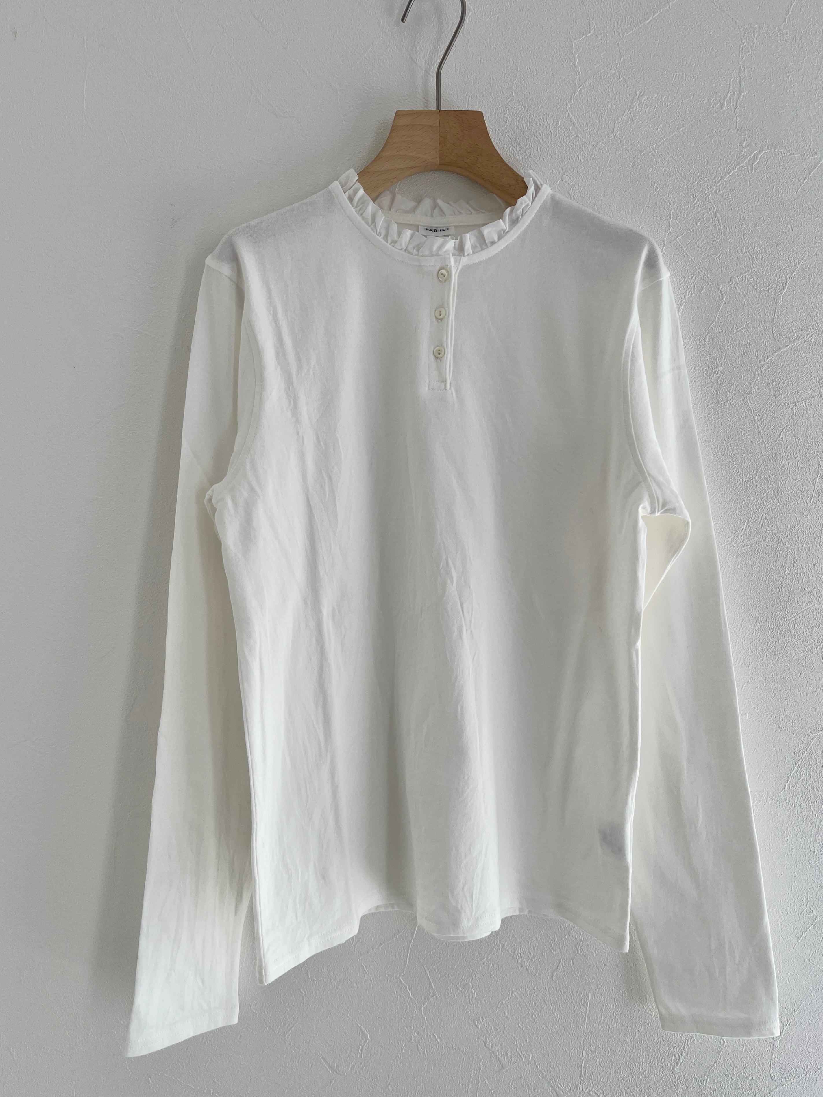 ソフトで滑らかな風合いを持つコーマフライス素材のボディに、しなやかで適度なハリ感のあるフリルを施し、ちょっぴり甘さのあるディテールをプラス。甘くなりすぎないよう、フリルは断ち切り仕様にすることでラフに仕上げられています。