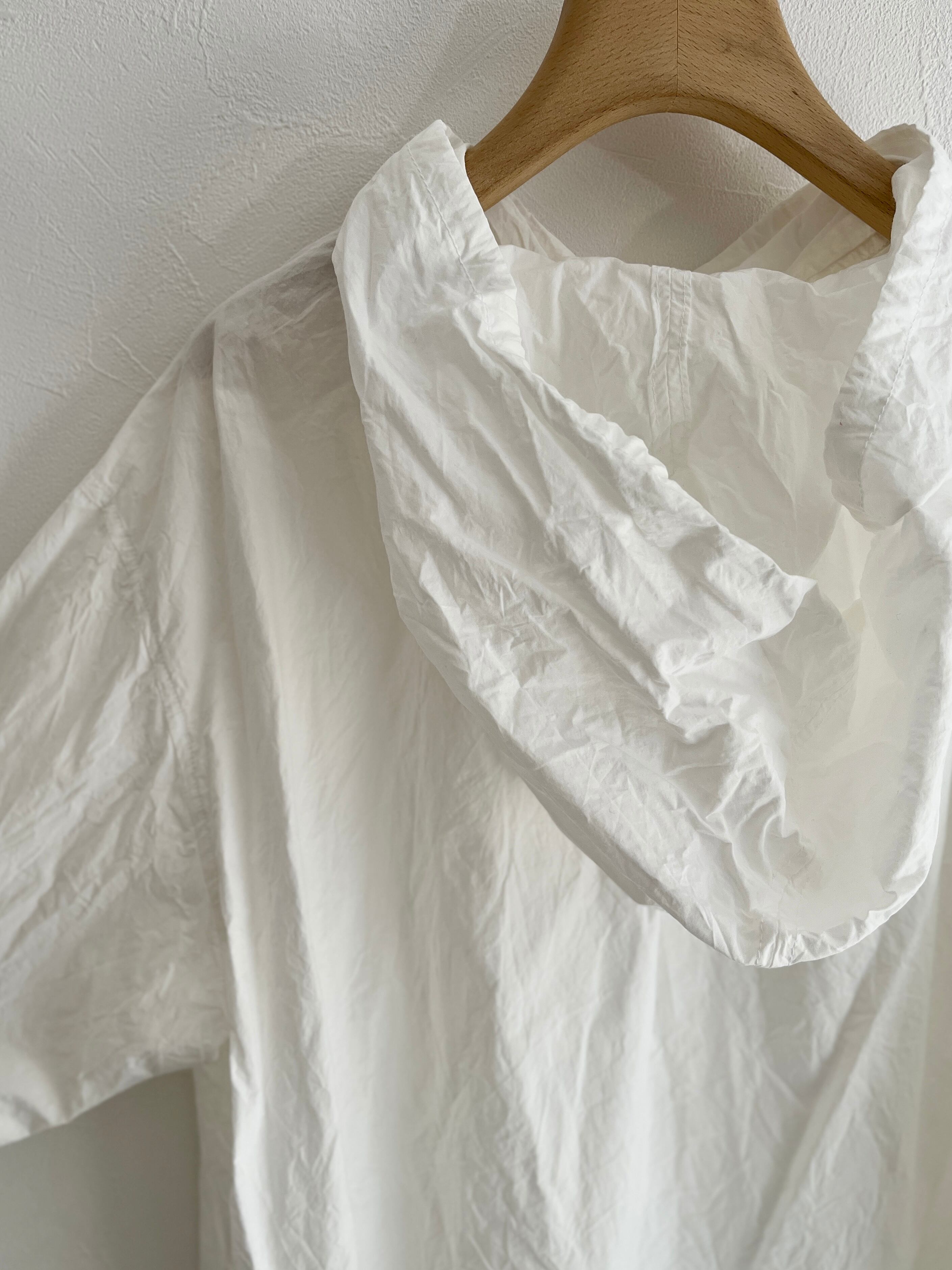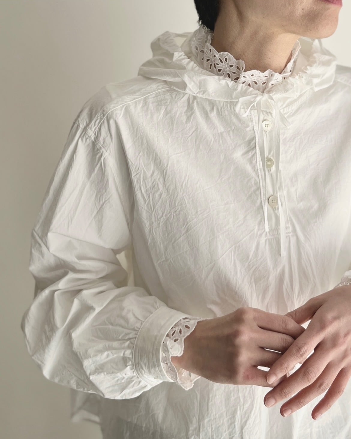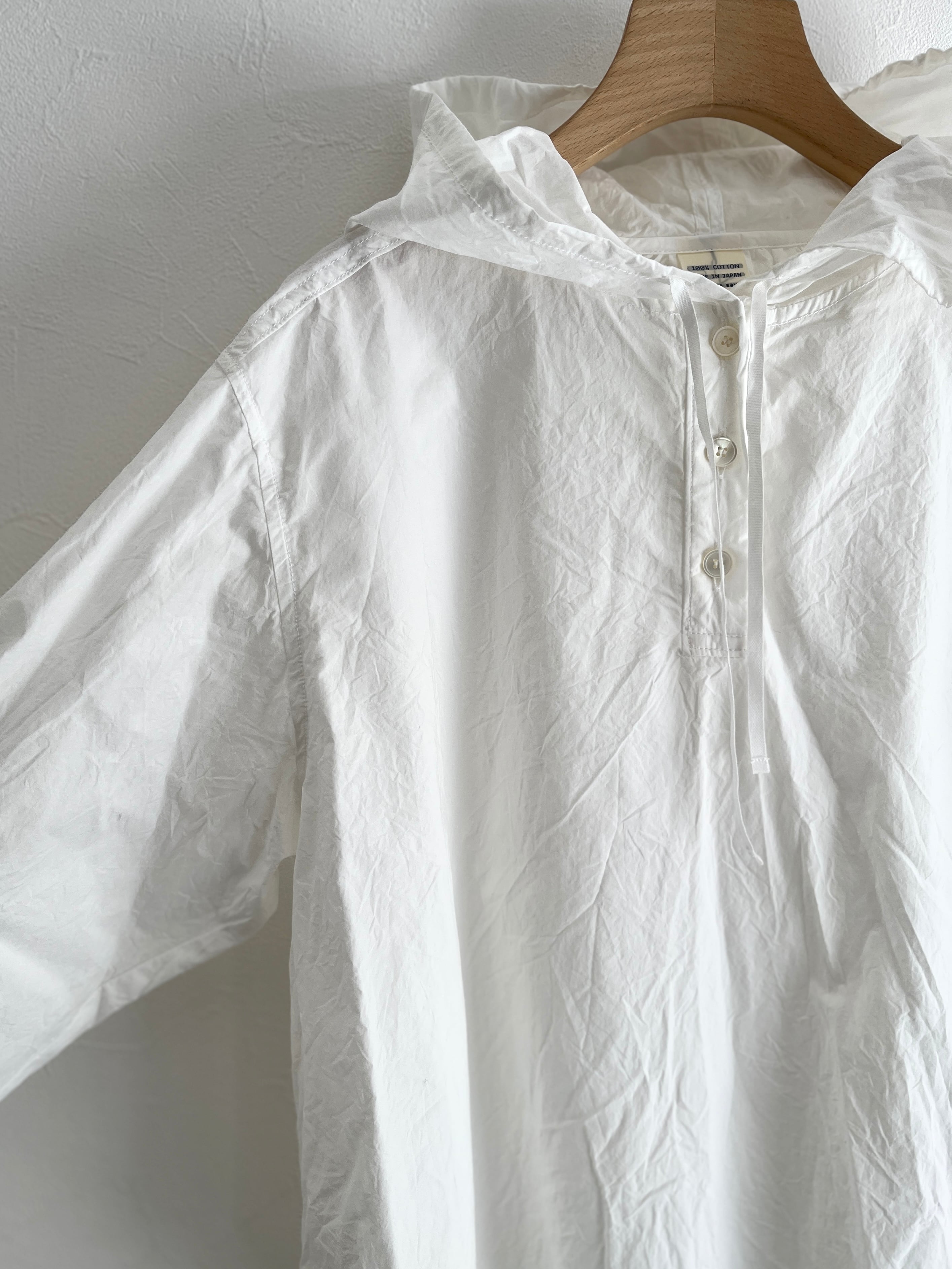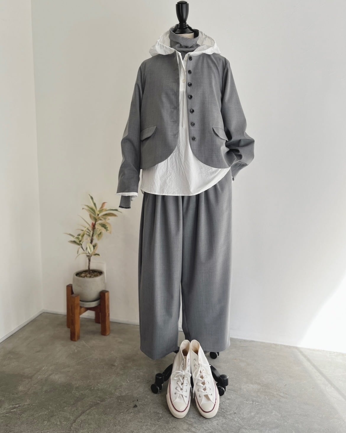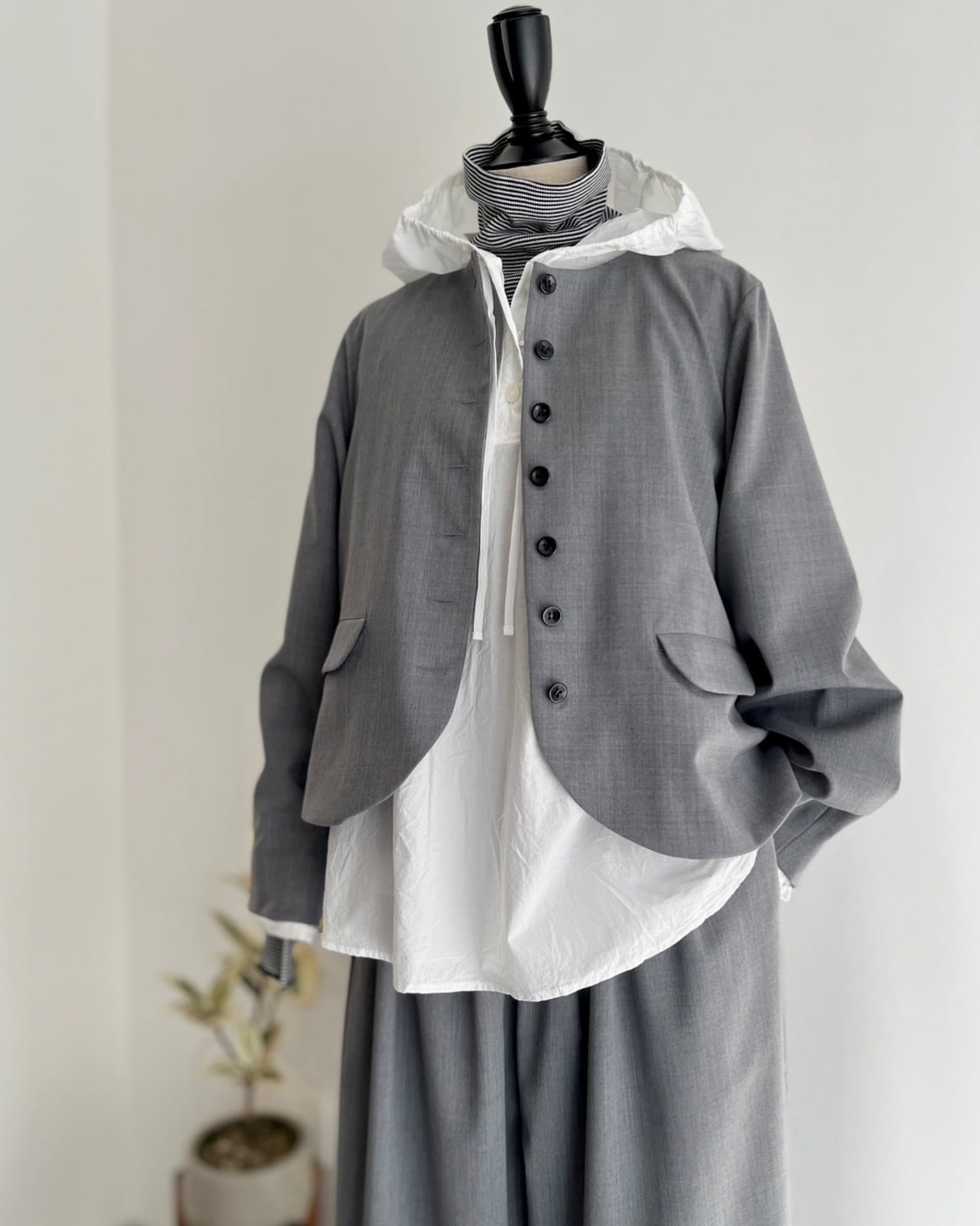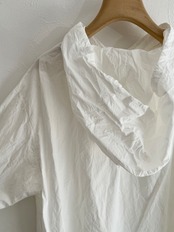 メンズに寄りすぎないようカフスにシャツのディテールを入れたり、後ろの衿ぐりにはギャザーを寄せたりこだわりの1着。
