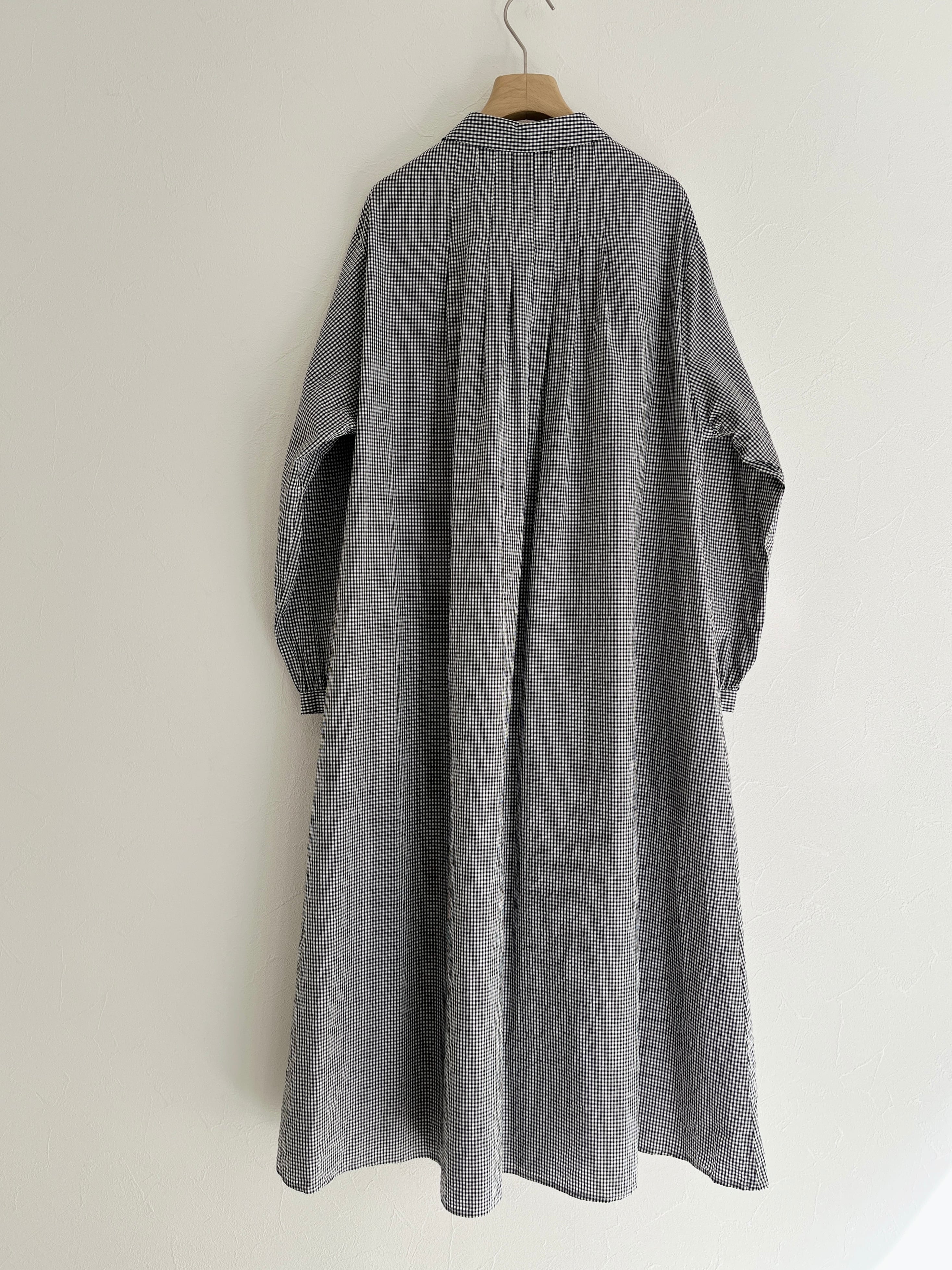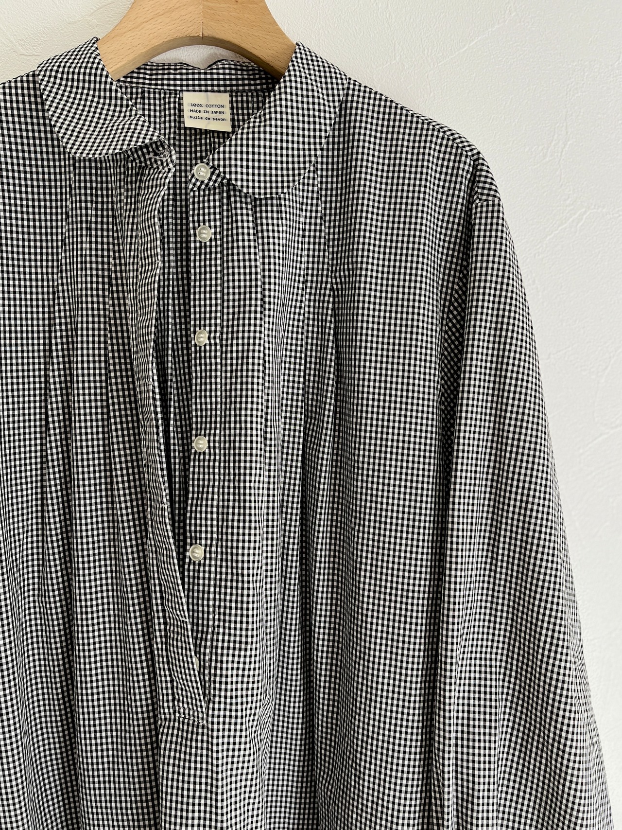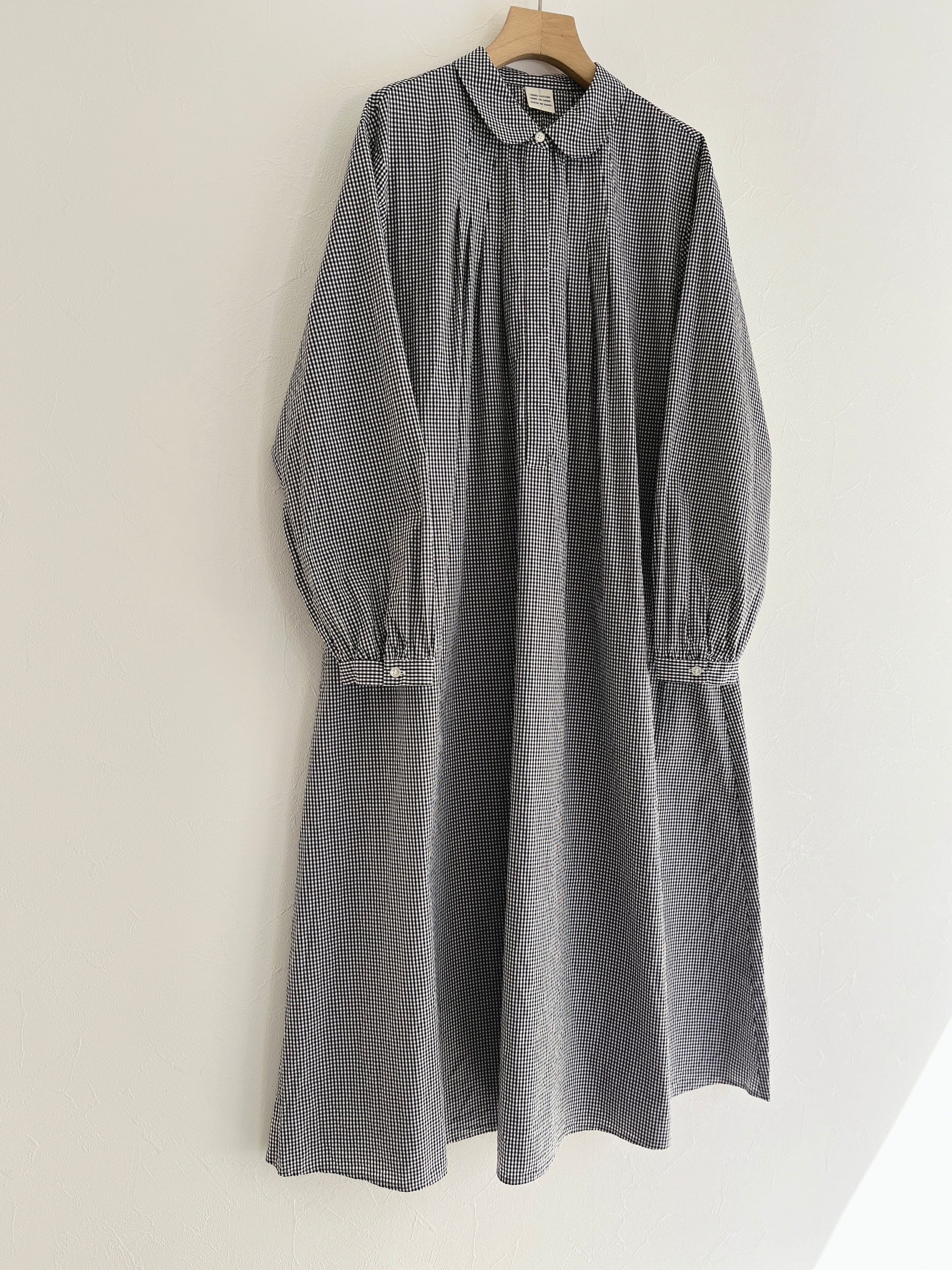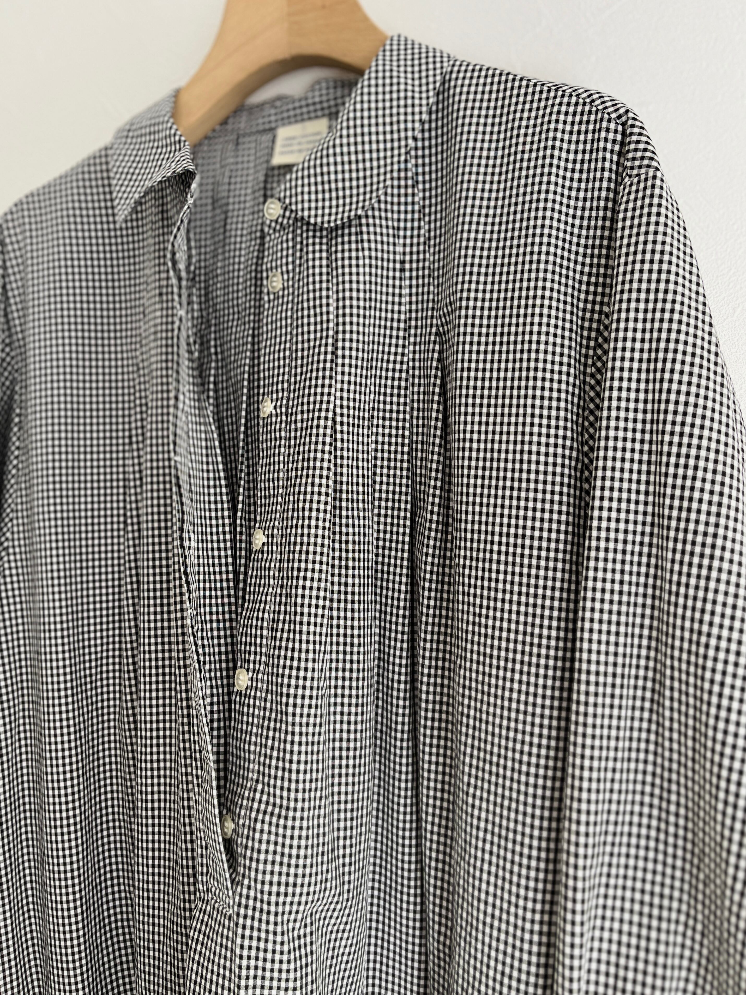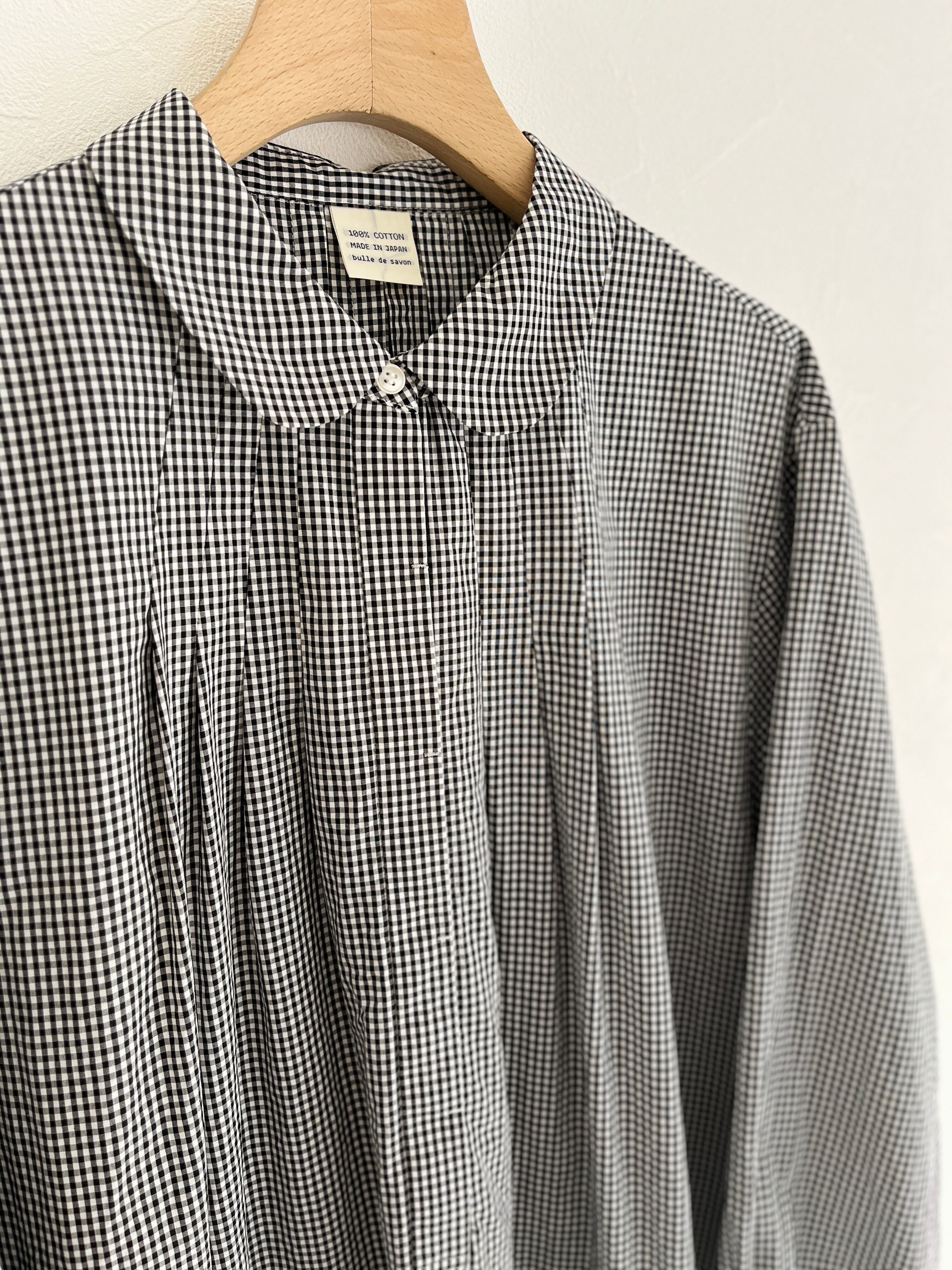 きりっとした丸衿と胸元に並んだタックがポイントのシャツとワンピースのシリーズ。