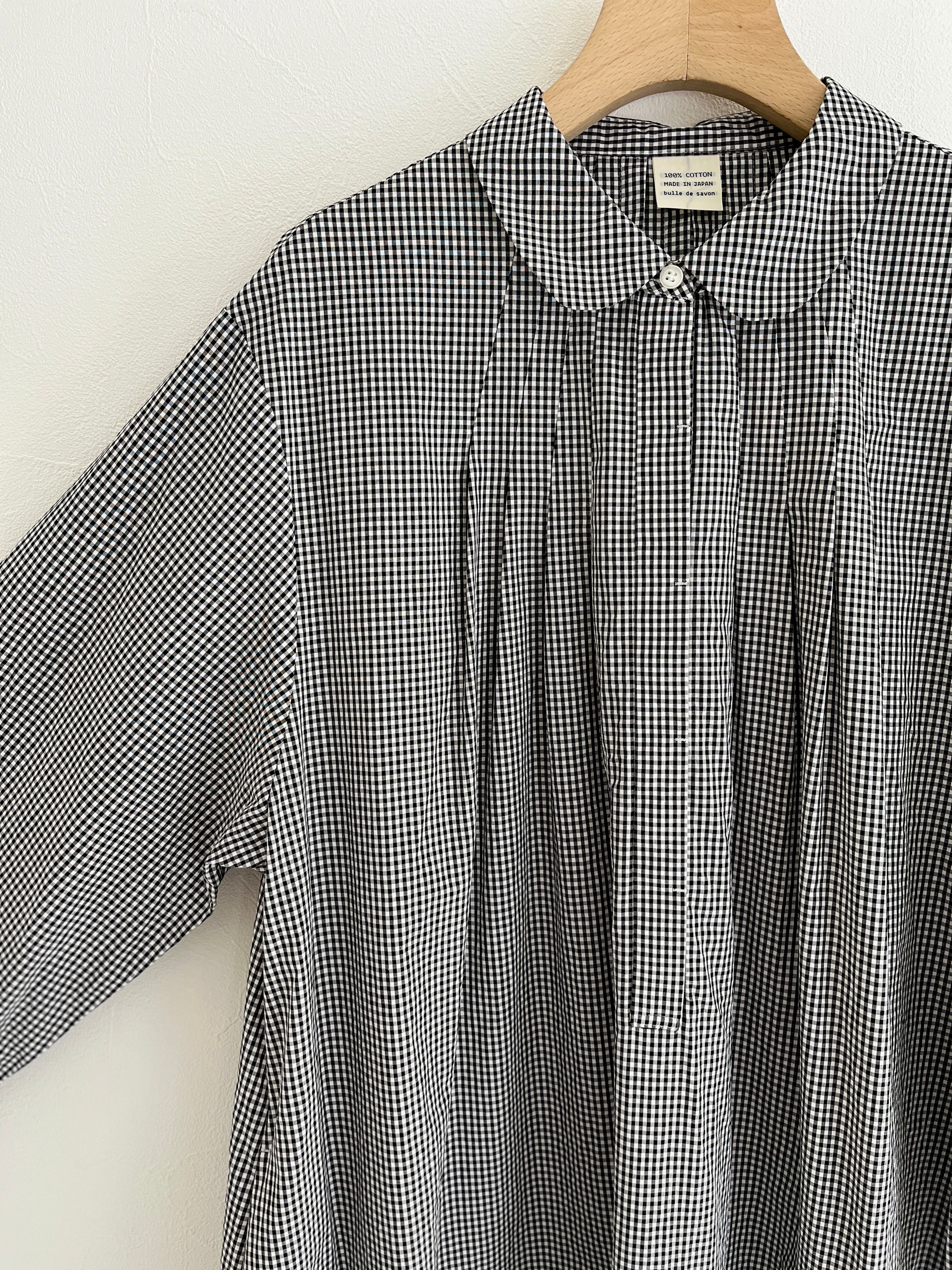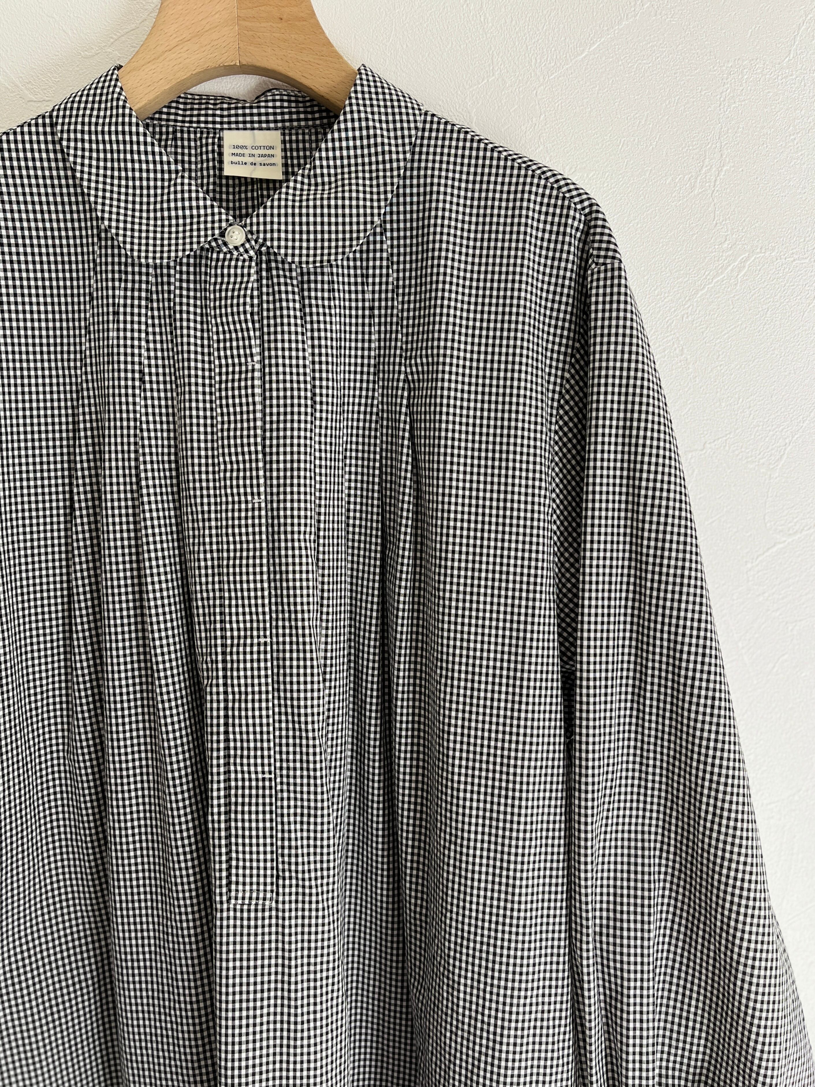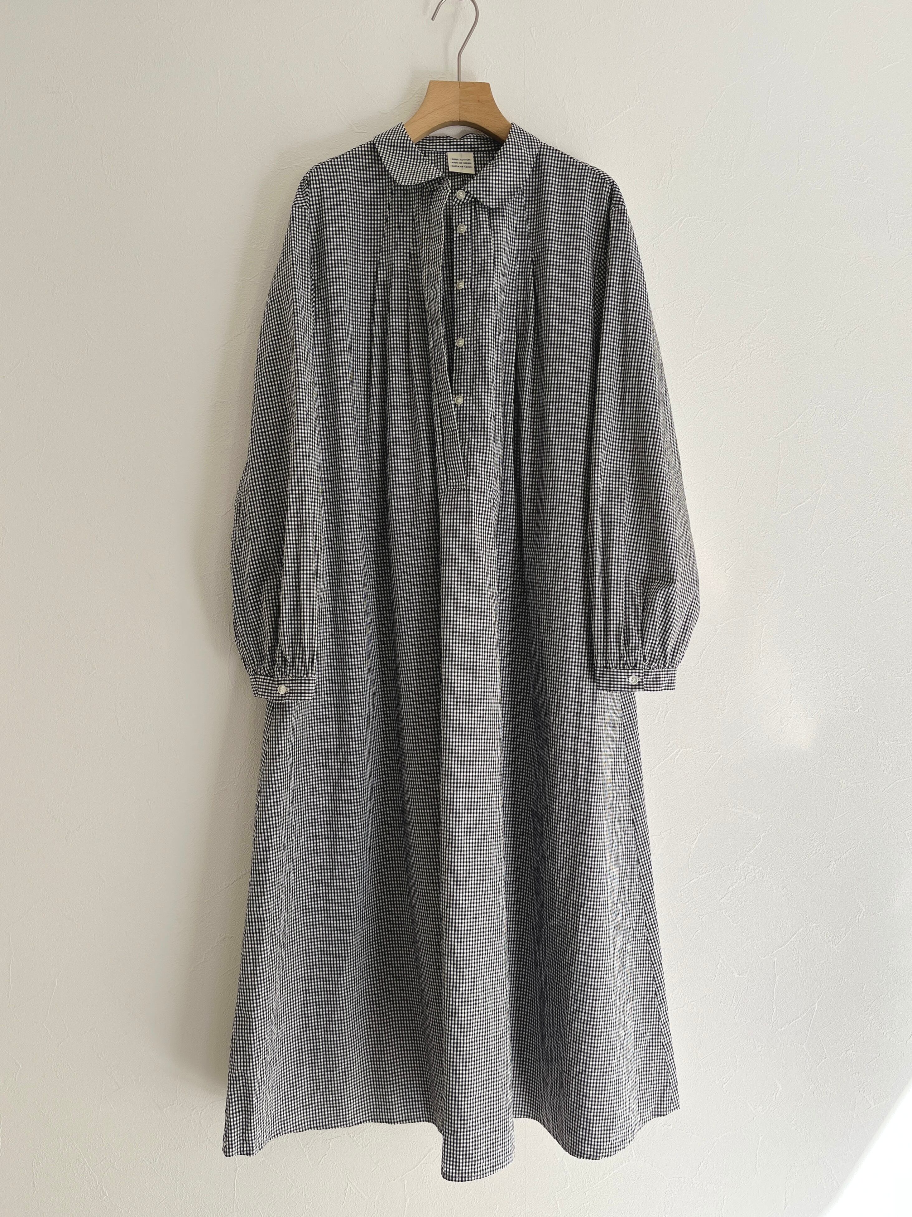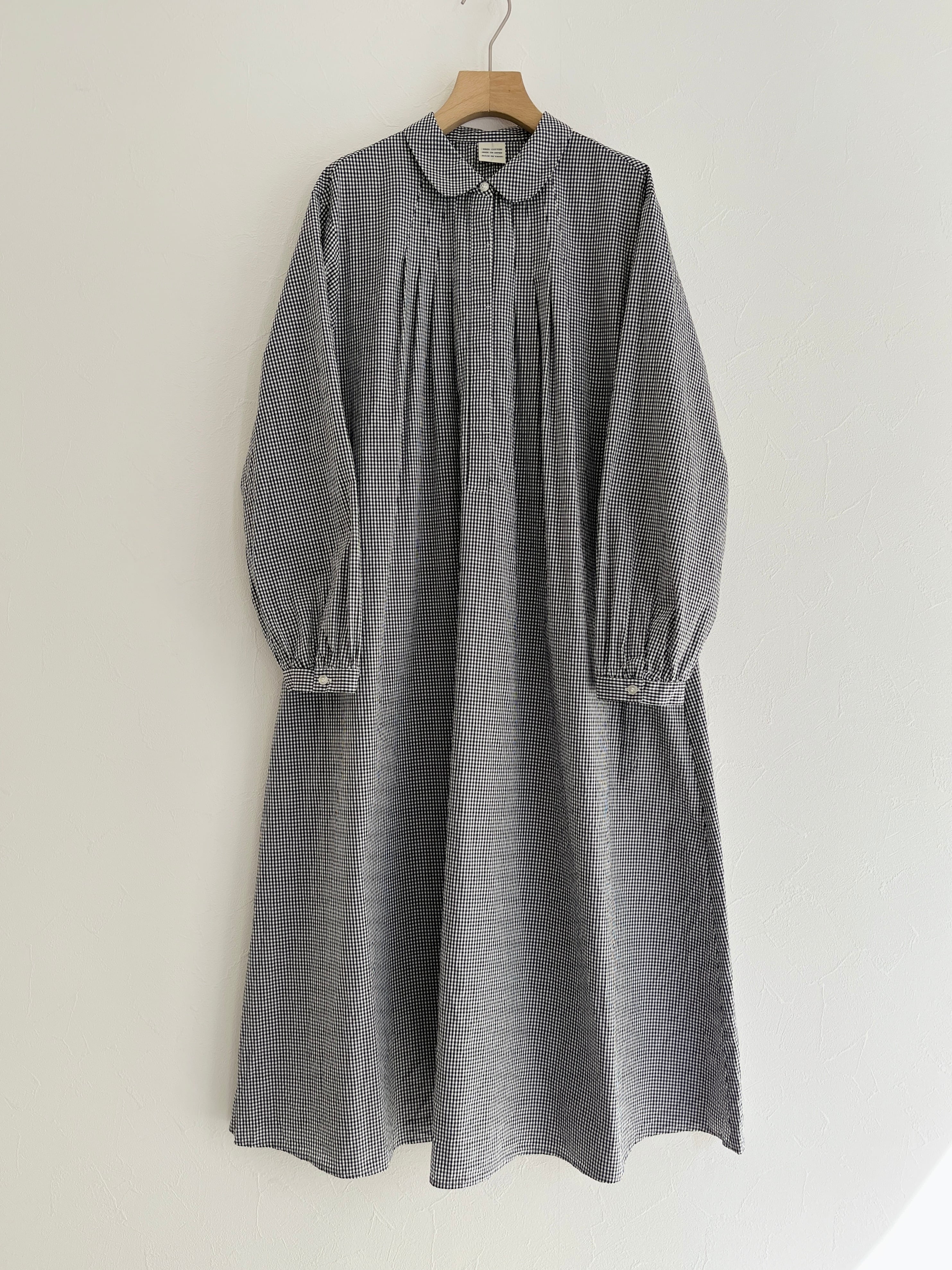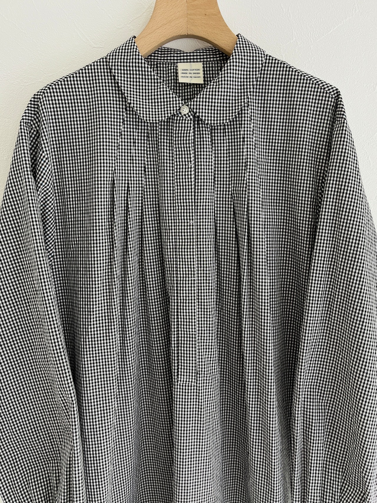 きりっとした丸衿と胸元に並んだタックがポイントのシャツとワンピースのシリーズ。