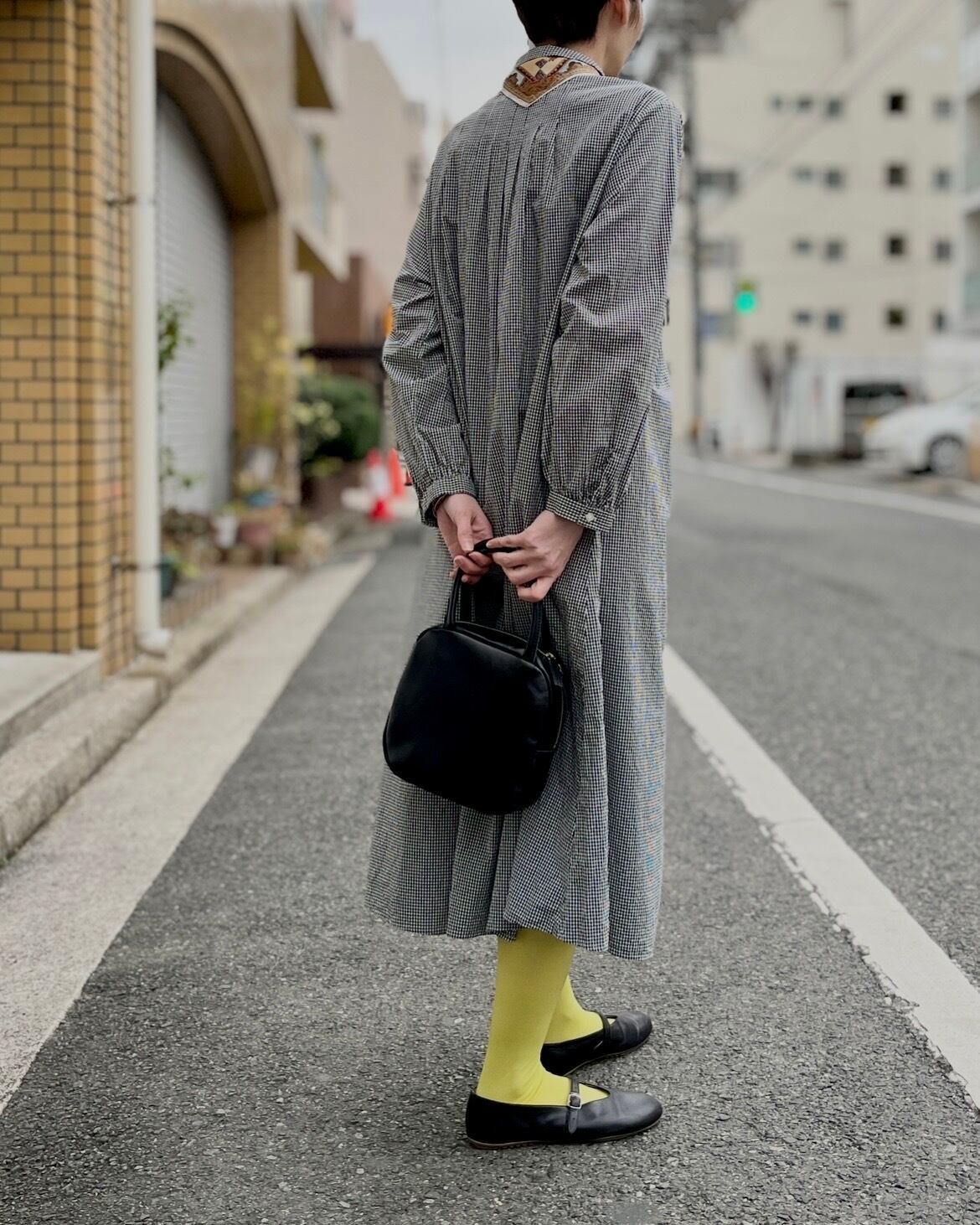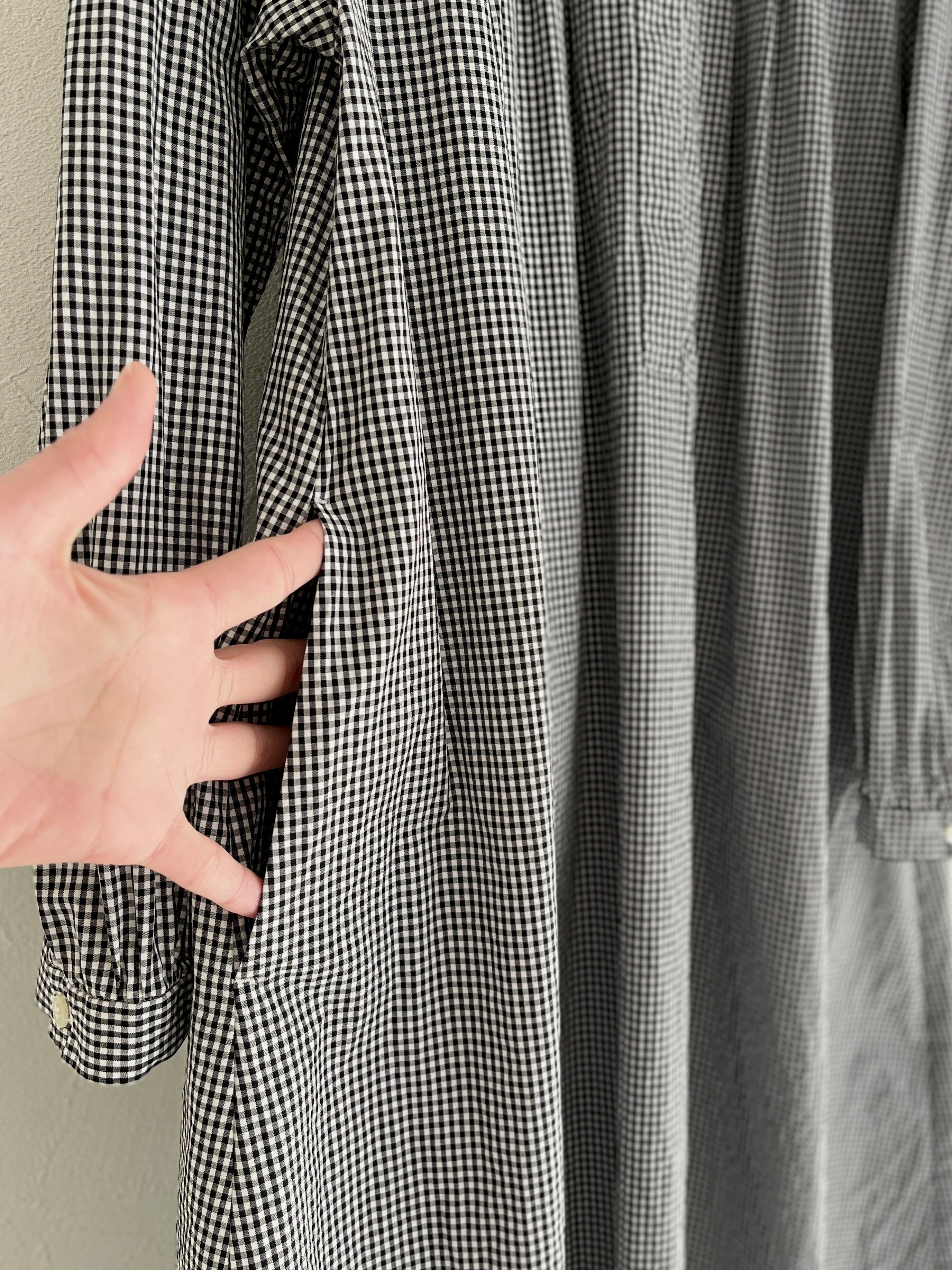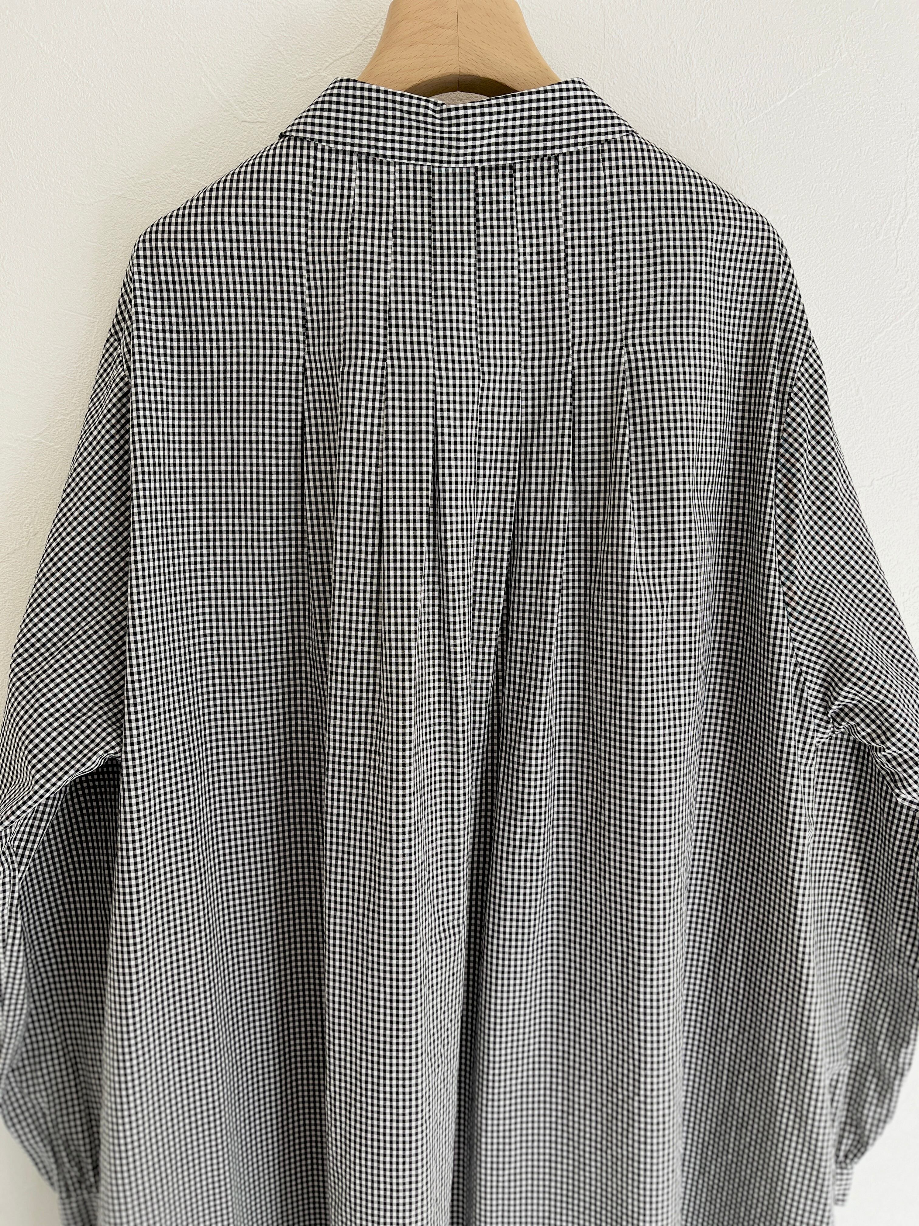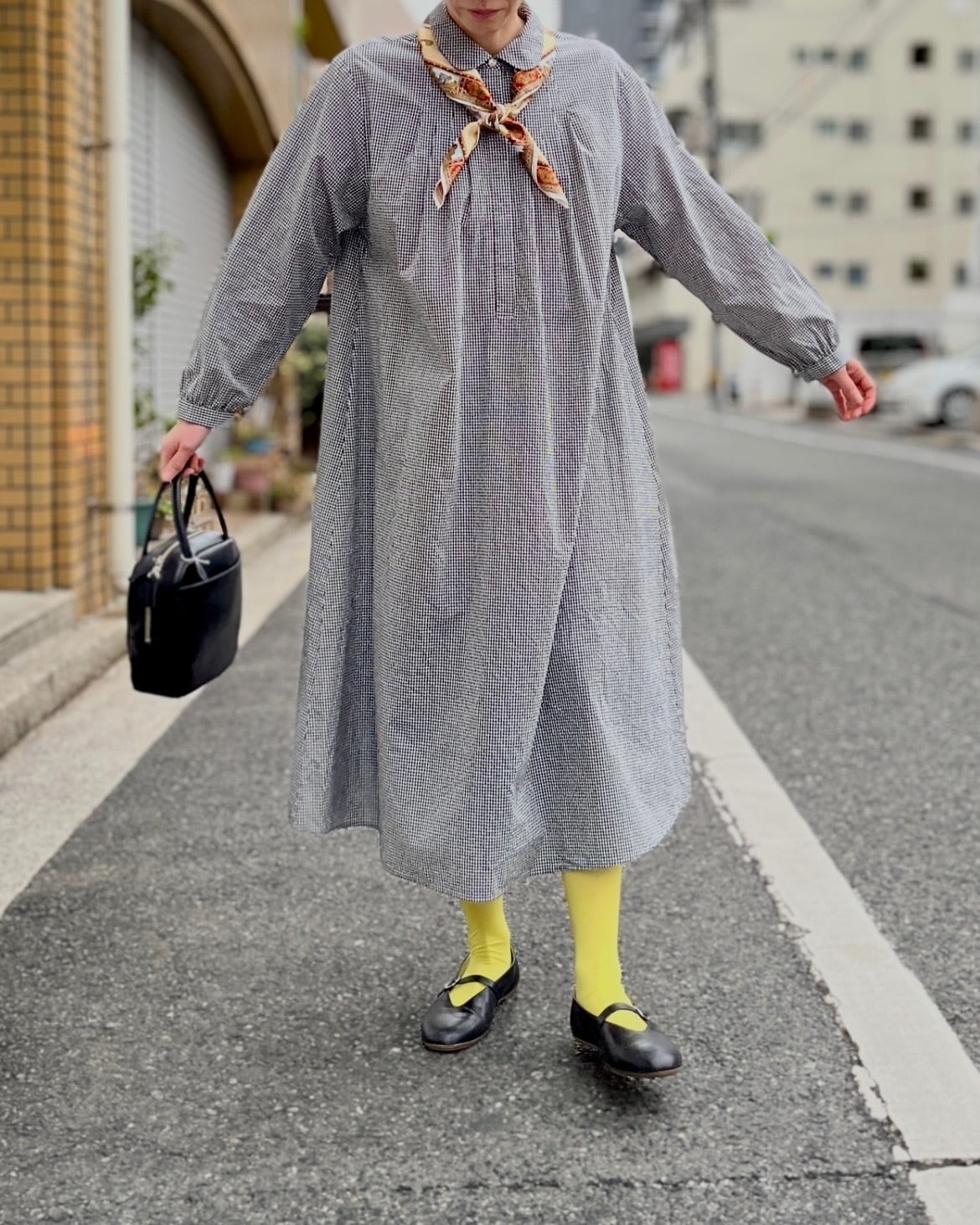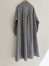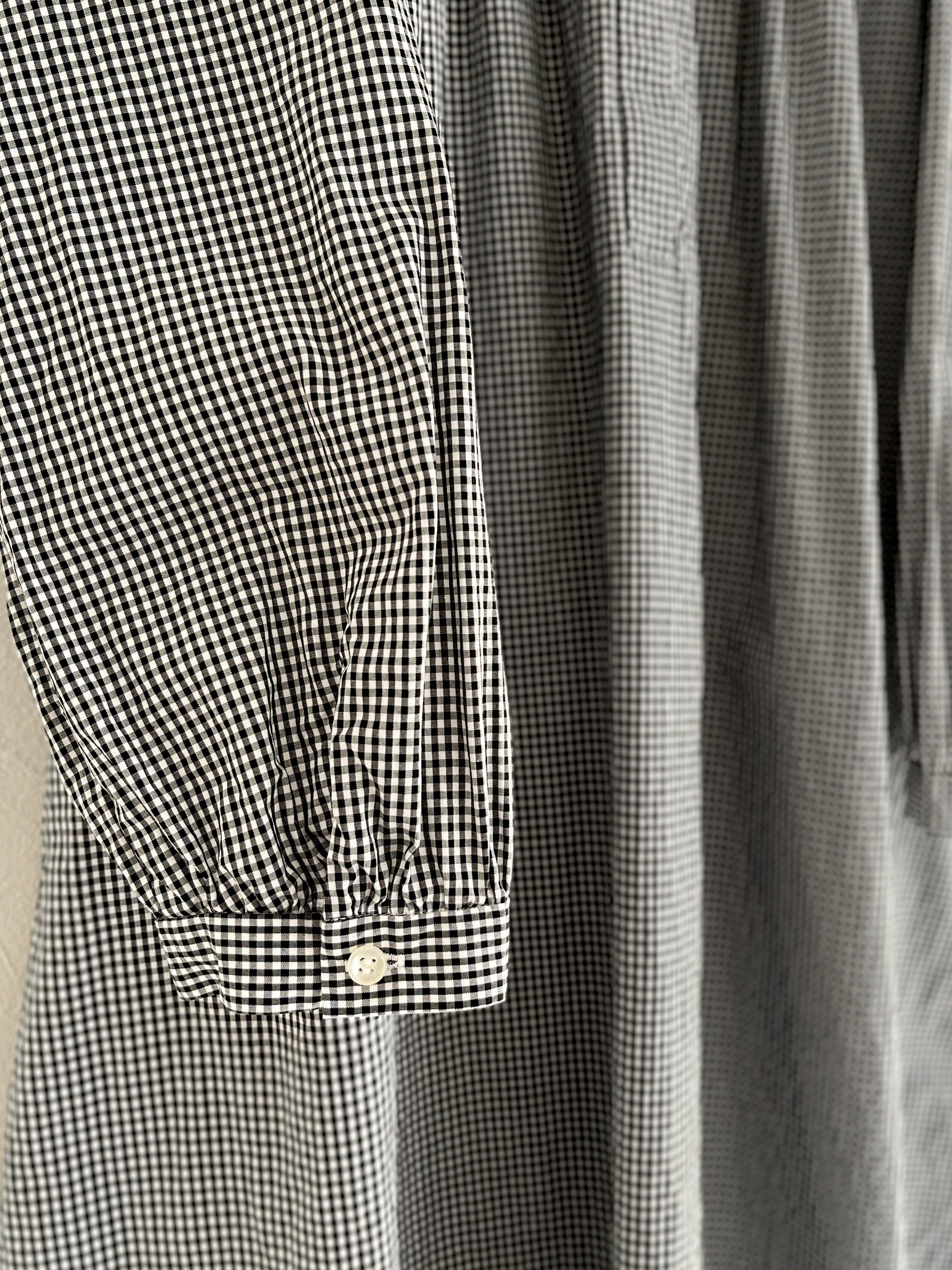 きりっとした丸衿と胸元に並んだタックがポイントのシャツとワンピースのシリーズ。