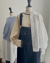 襟と袖口のバインダーがフレンチなイメージ。シャツやカーディガンとの重ね着もしやすいベーシックなシルエットですが、一枚着として着やすいよう、袖や身幅の太さ、肩の落ち感などボディラインに沿わないややゆとりを持たせたサイズ感に仕上げました。こちらのシリーズはハリのあるやや硬めの生地感ながらも、どんなシーズンにも着やすい厚みが使いやすい。