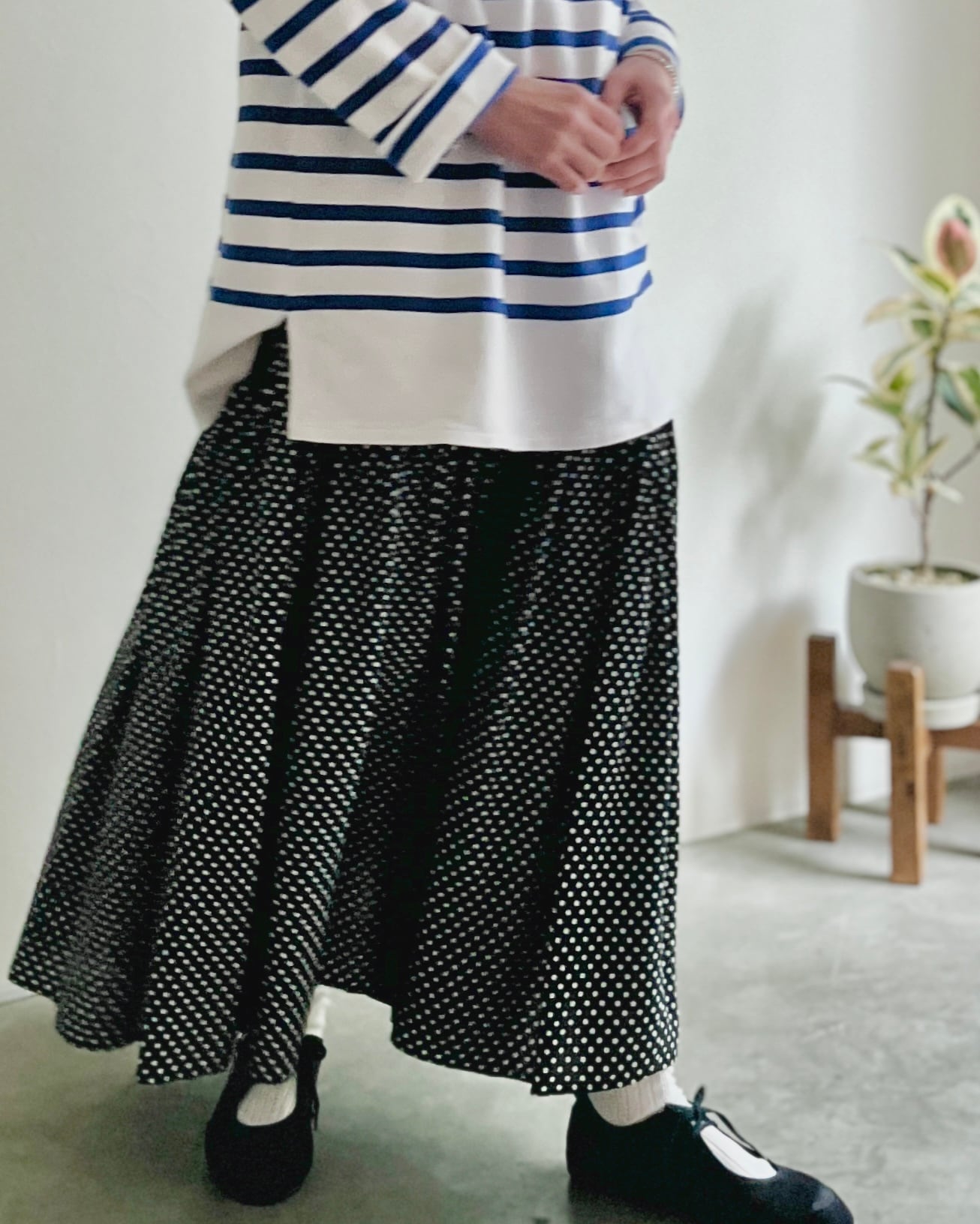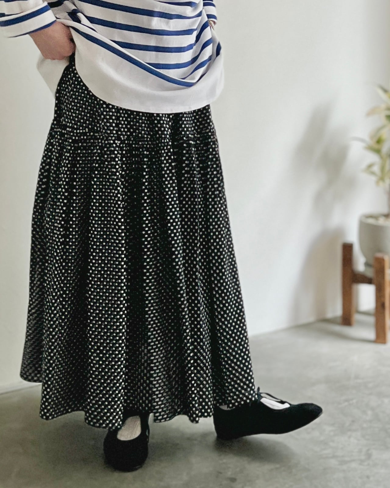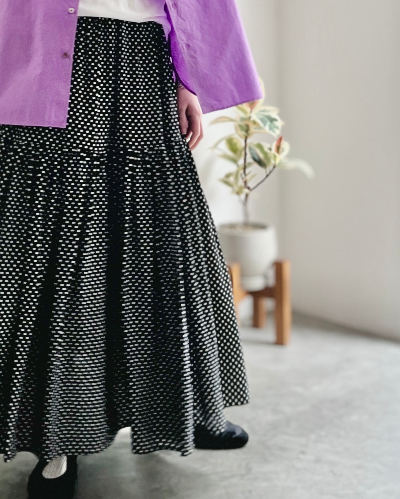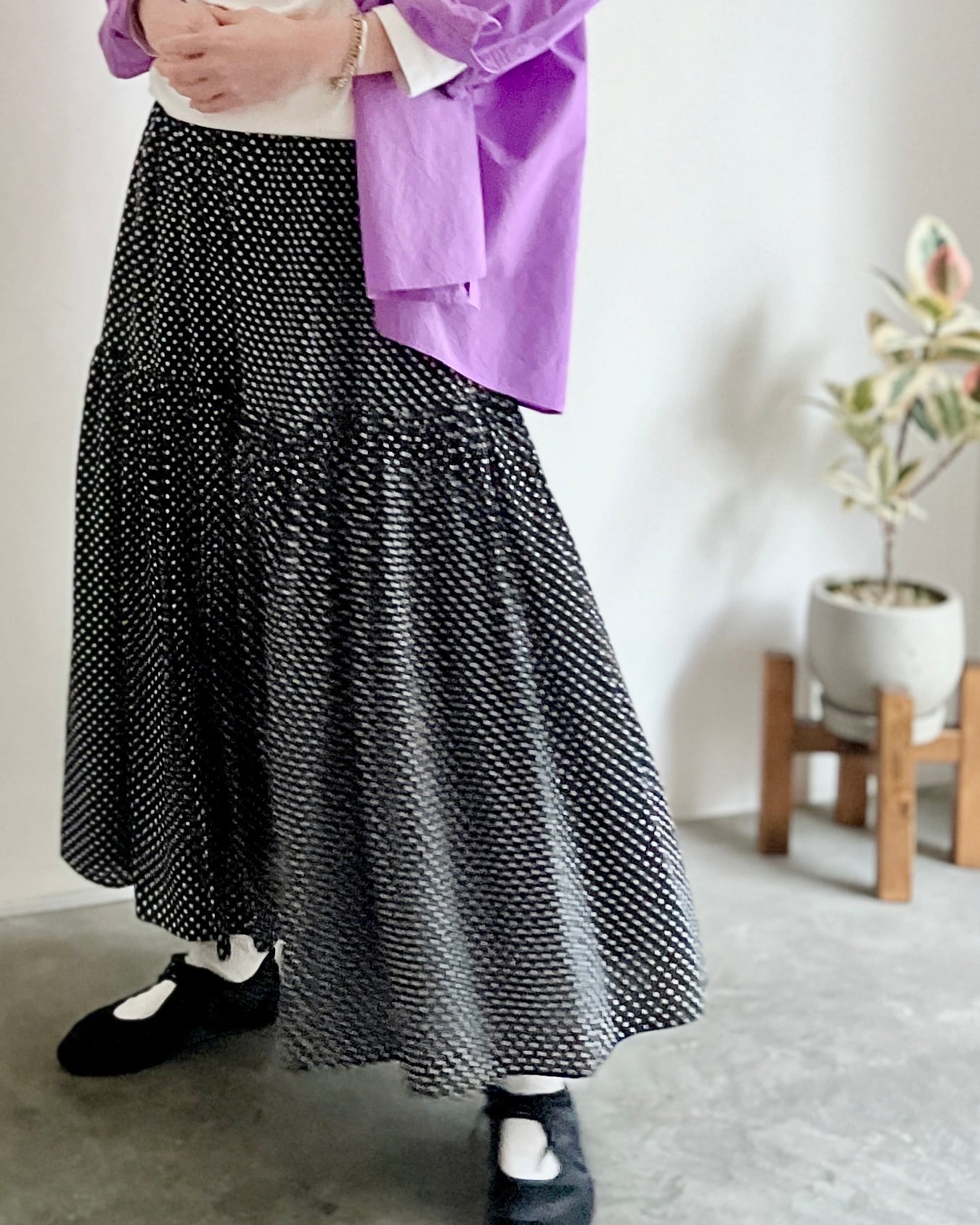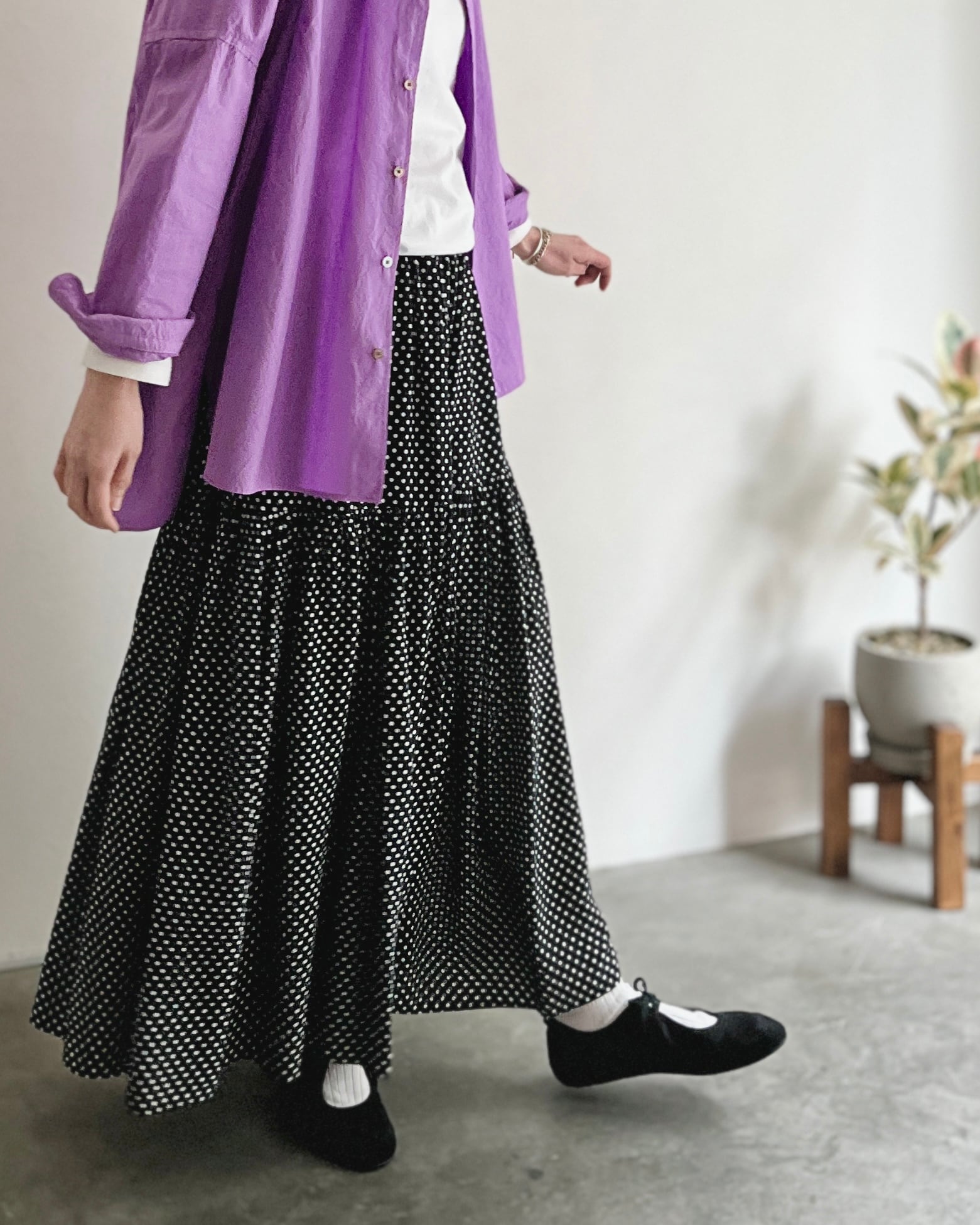 動きとともにゆったりとした揺れを描くスカートです。