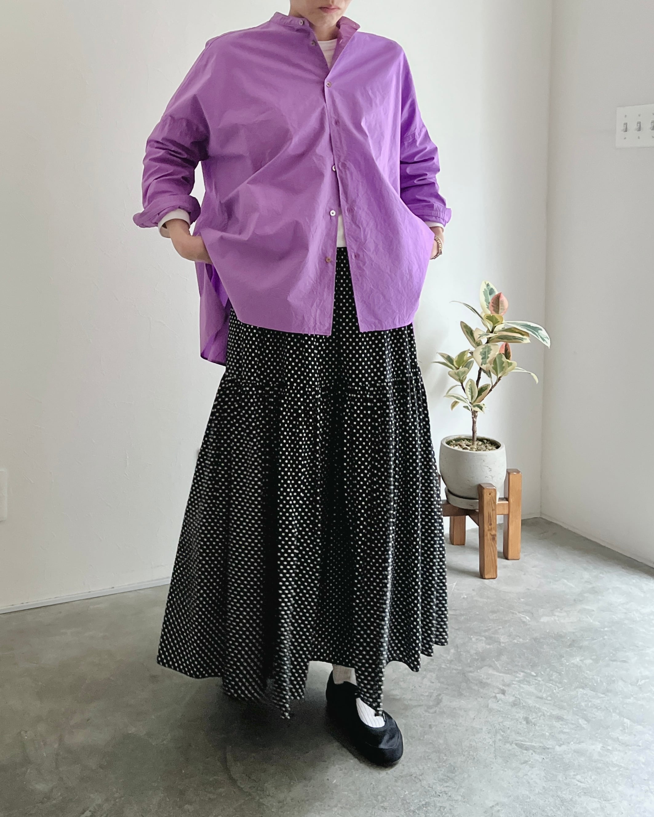 レーヨンに綿とキュプラを織り合わせたオリジナル素材は、撚糸の段階から調整を重ねることで、ほどよい柔らかさと上品な微光沢感、そしてわずかなシボ感が溶け合い、豊かな表情を生み出しています。