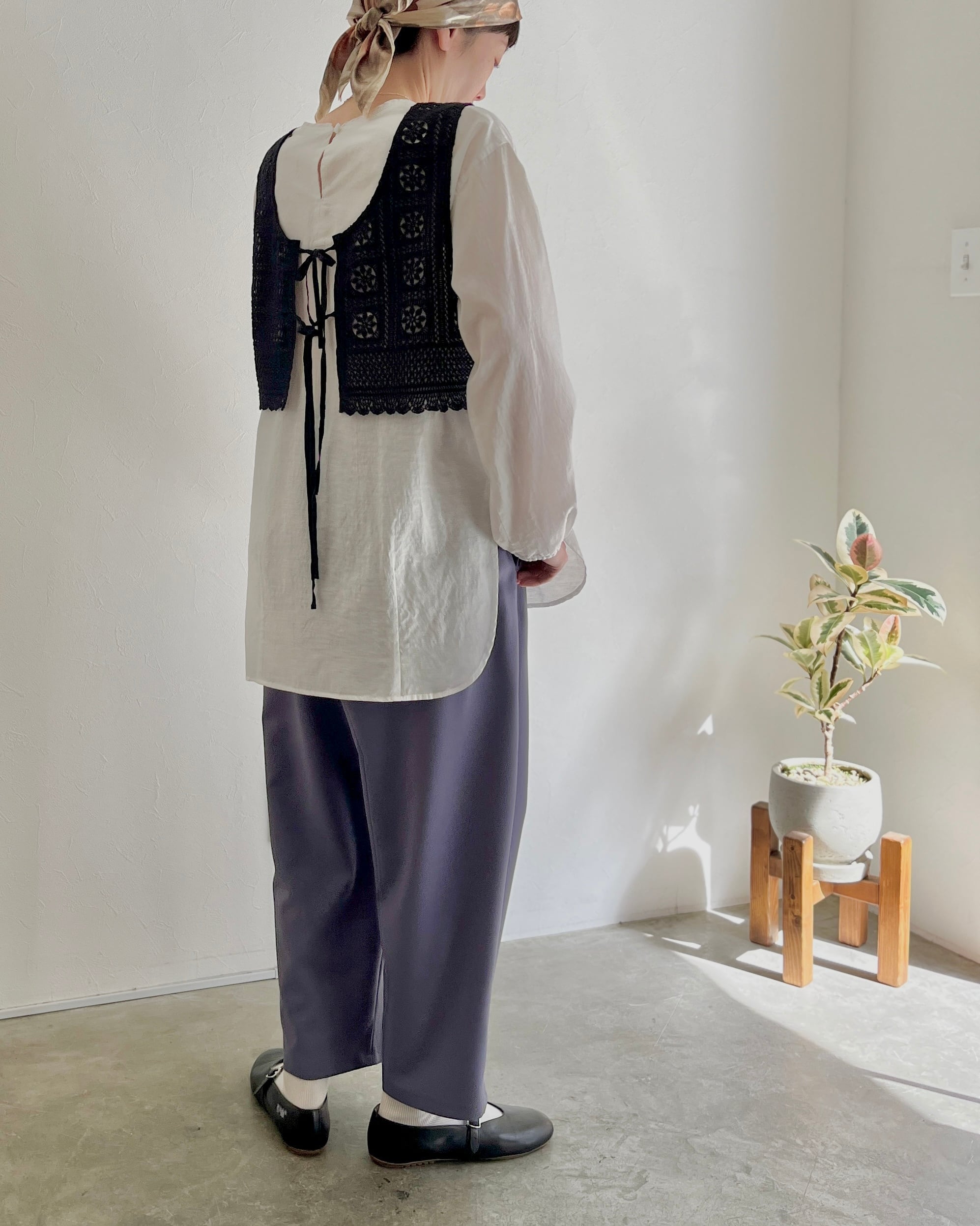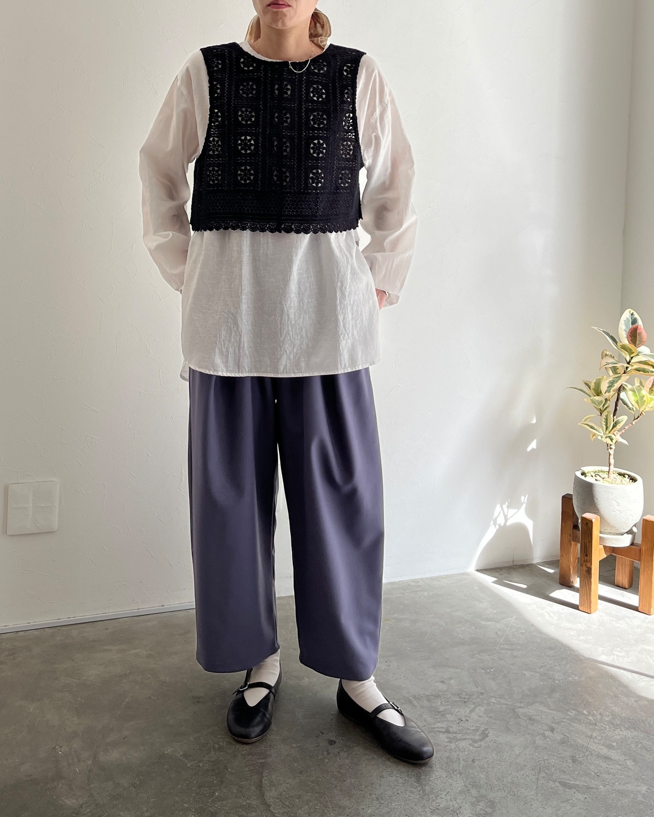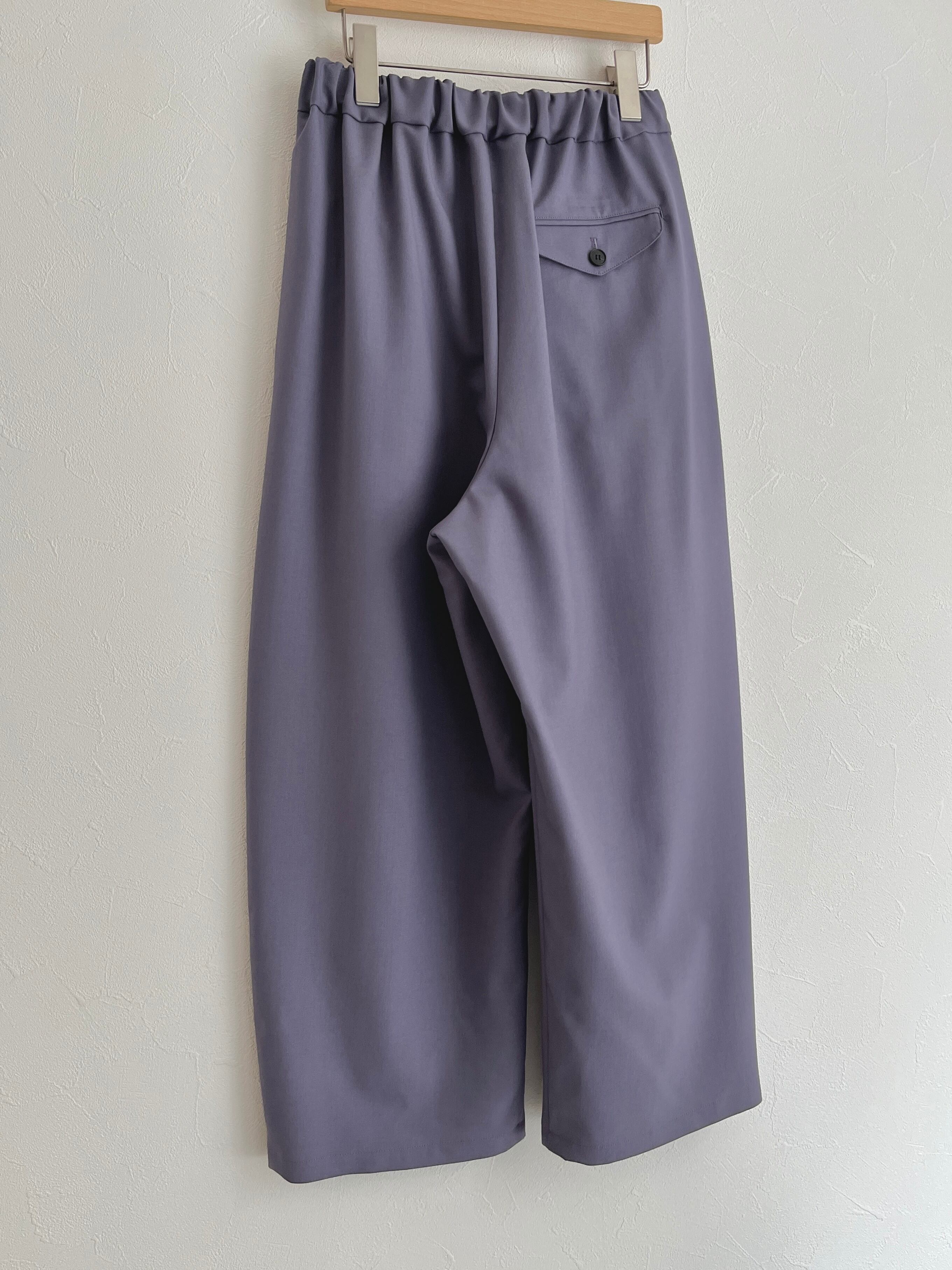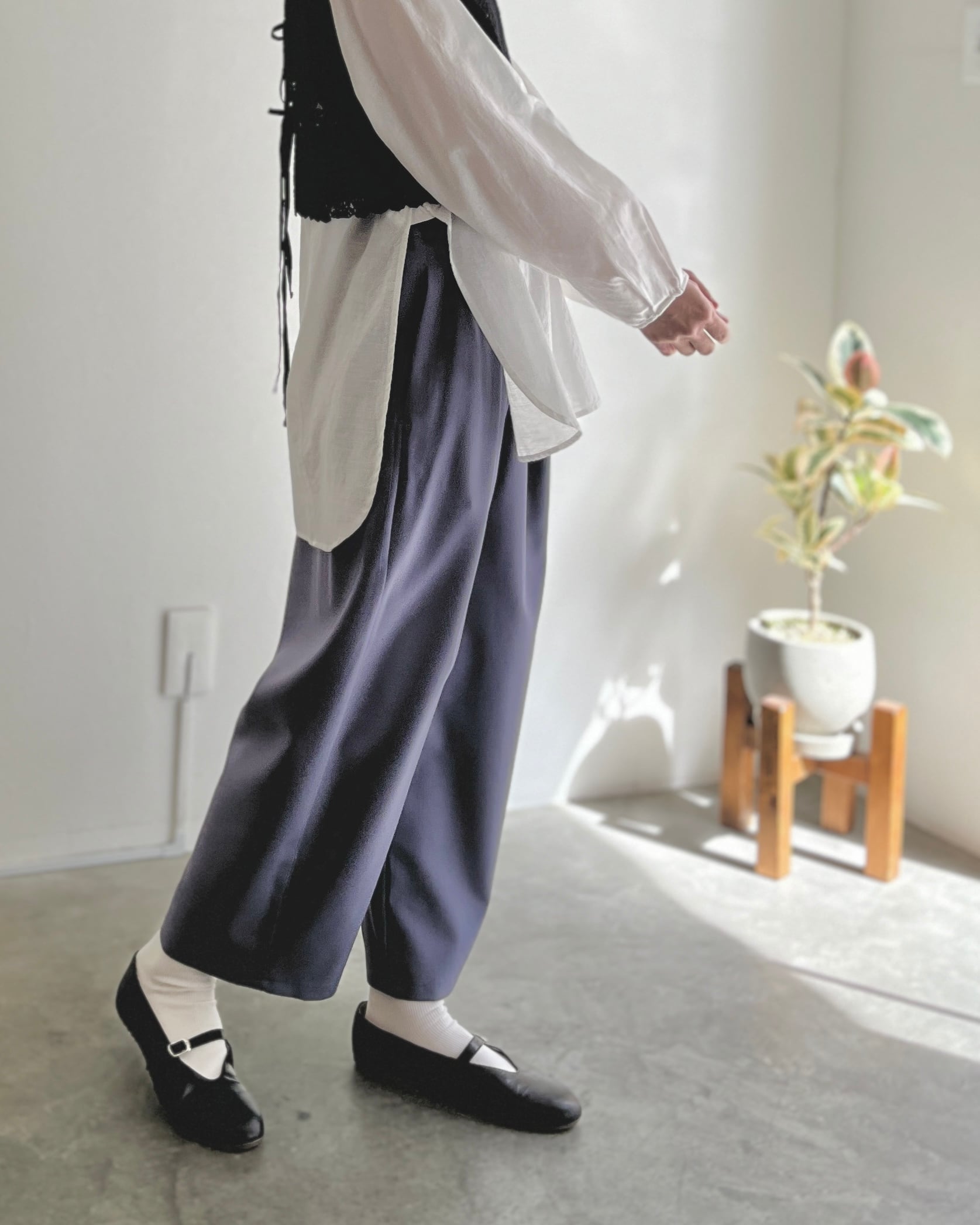 定番のウォッシャブルサマーウール生地で、yuni人気シルエットのゴムタックパンツを仕立てました。