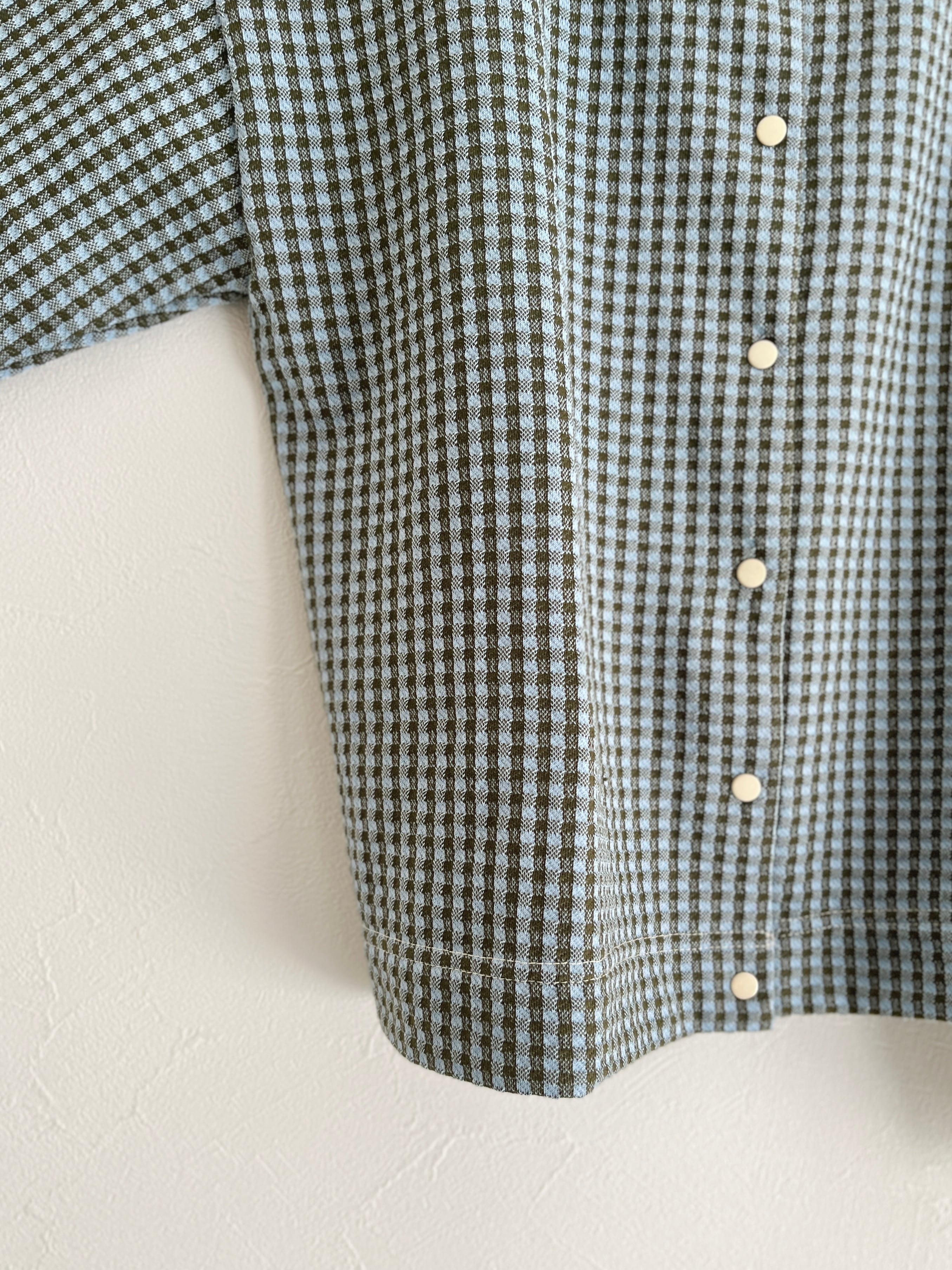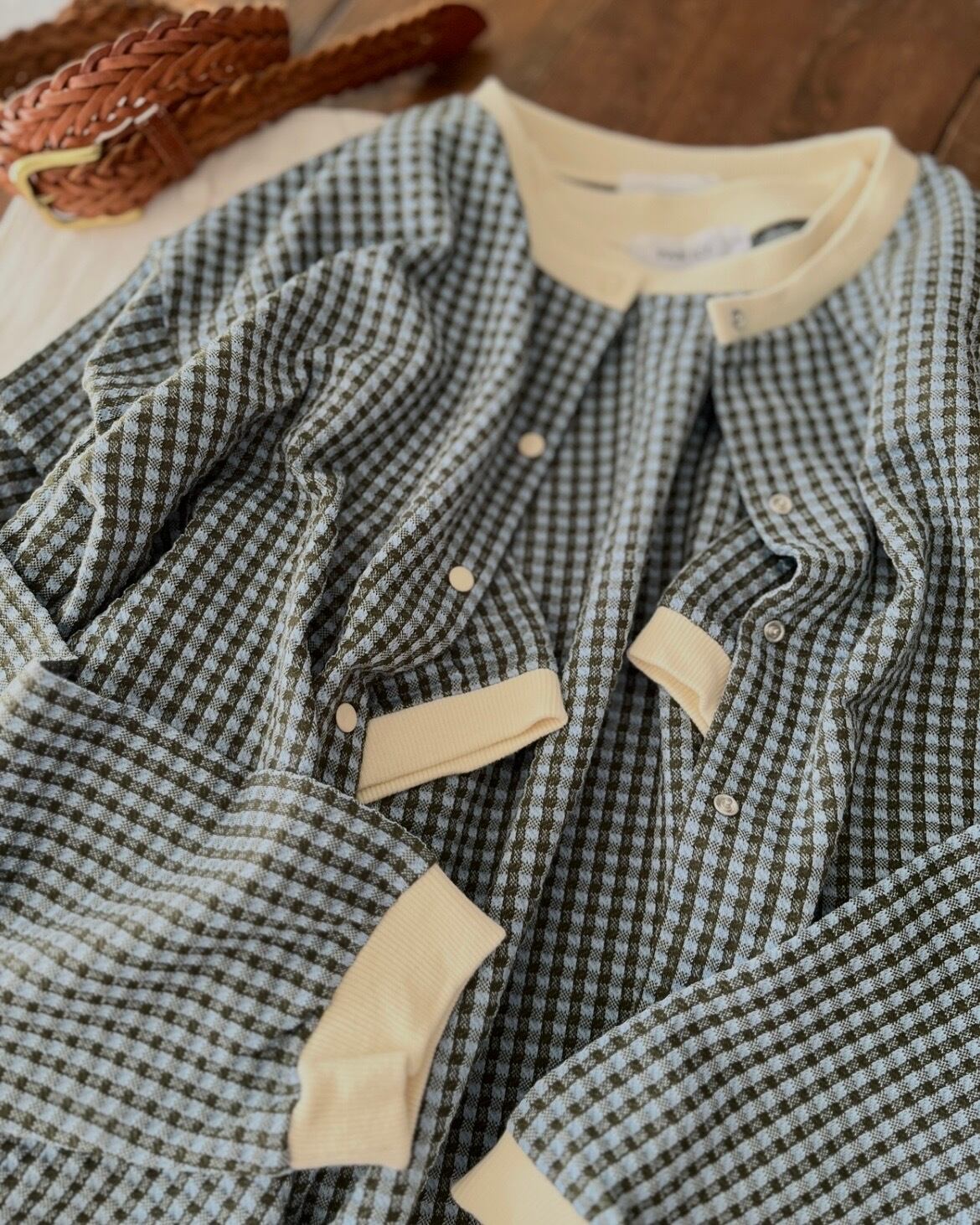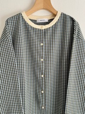 切り替えになった配色の襟と袖がポイント。前を閉じてプルオーバーのように着ても、スナップボタンが目立ってかわいい。スナップボタンはきちんと感のあるメタル素材。ツヤツヤしすぎずカジュアルなアイテムと馴染みます。
