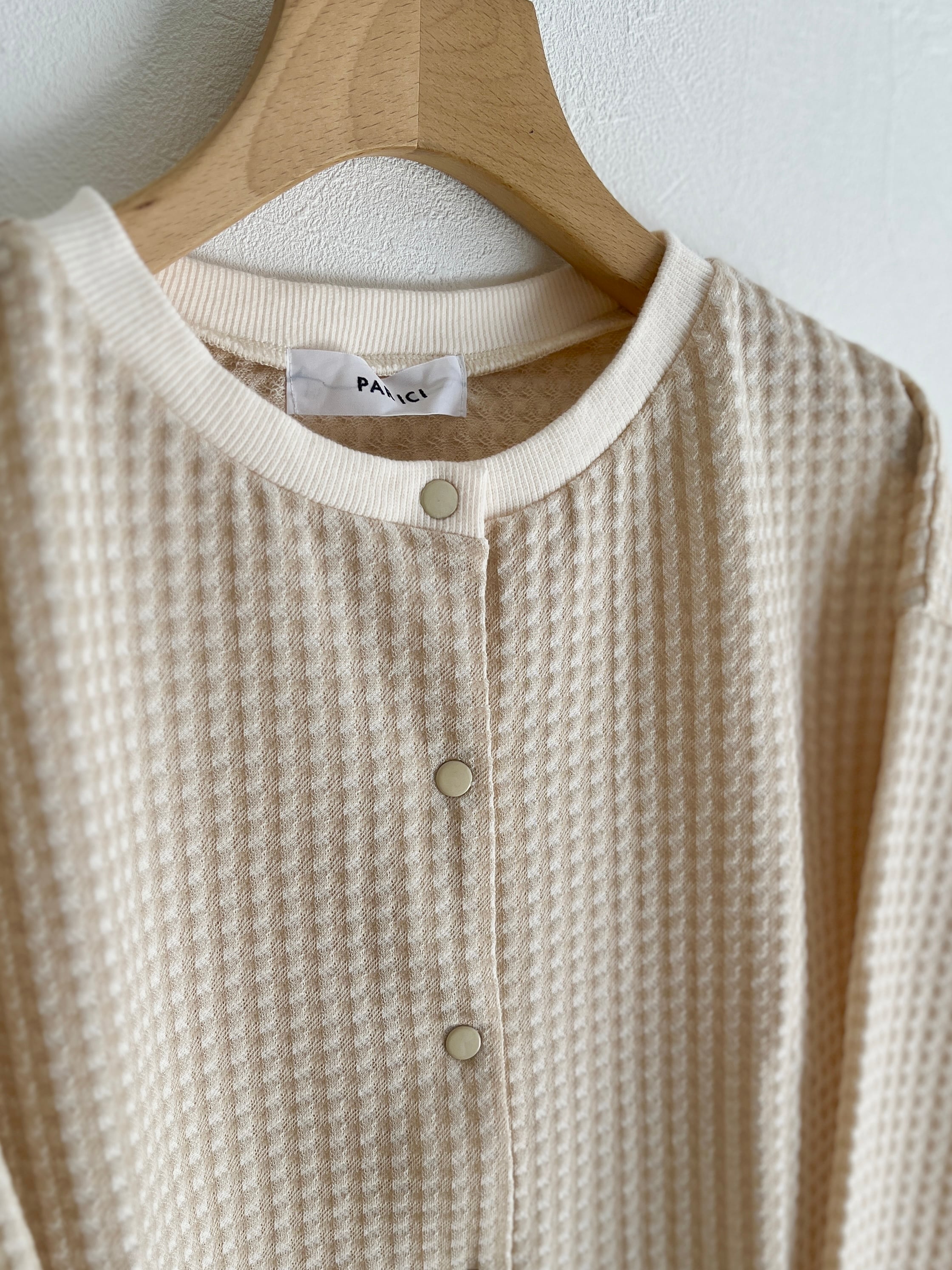 切り替えになった配色の襟と袖がポイント。前を閉じてプルオーバーのように着ても、スナップボタンが目立ってかわいい。スナップボタンはきちんと感のあるメタル素材。ツヤツヤしすぎずカジュアルなアイテムと馴染みます。