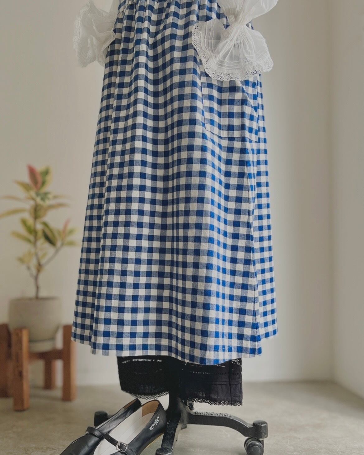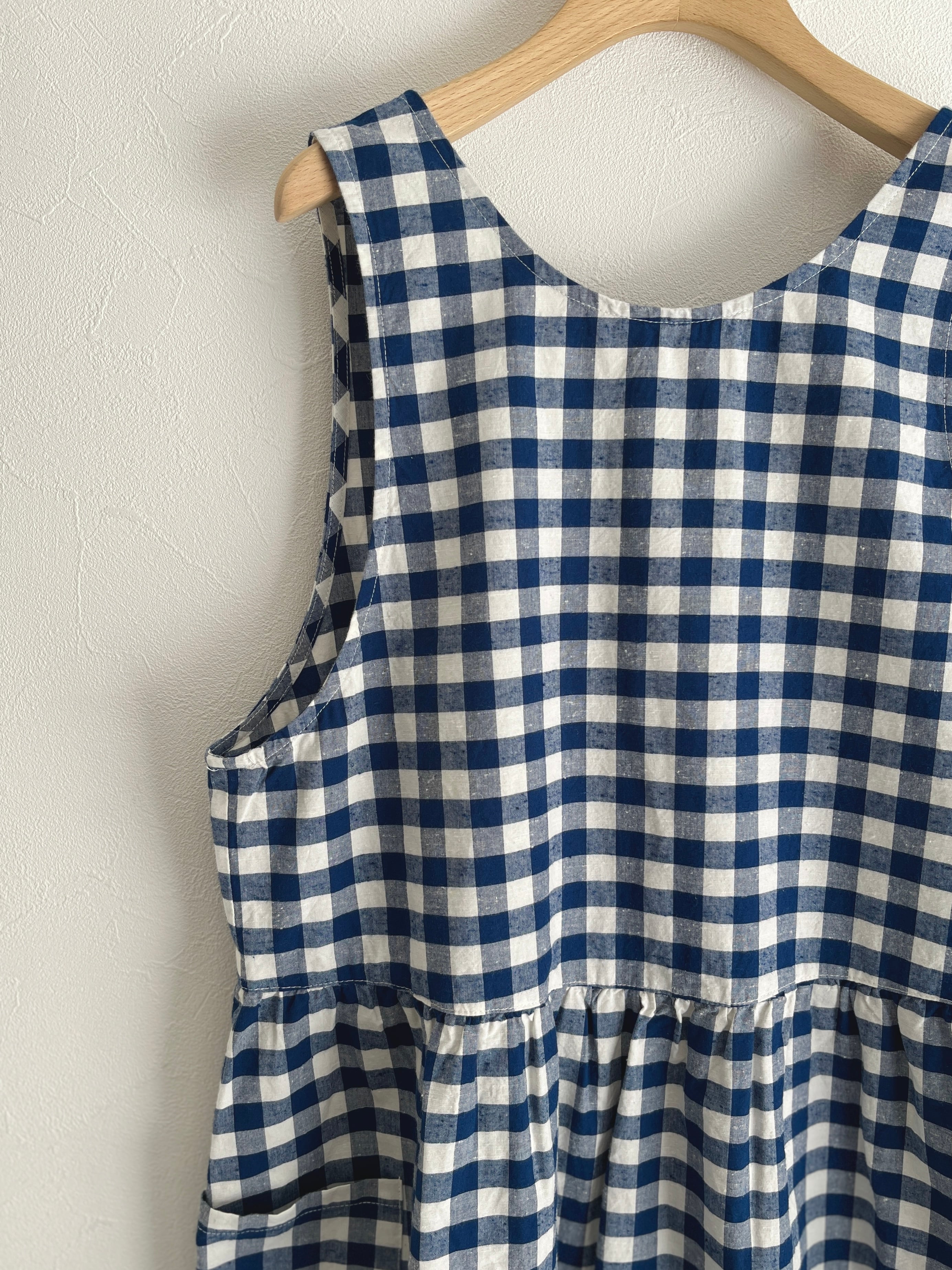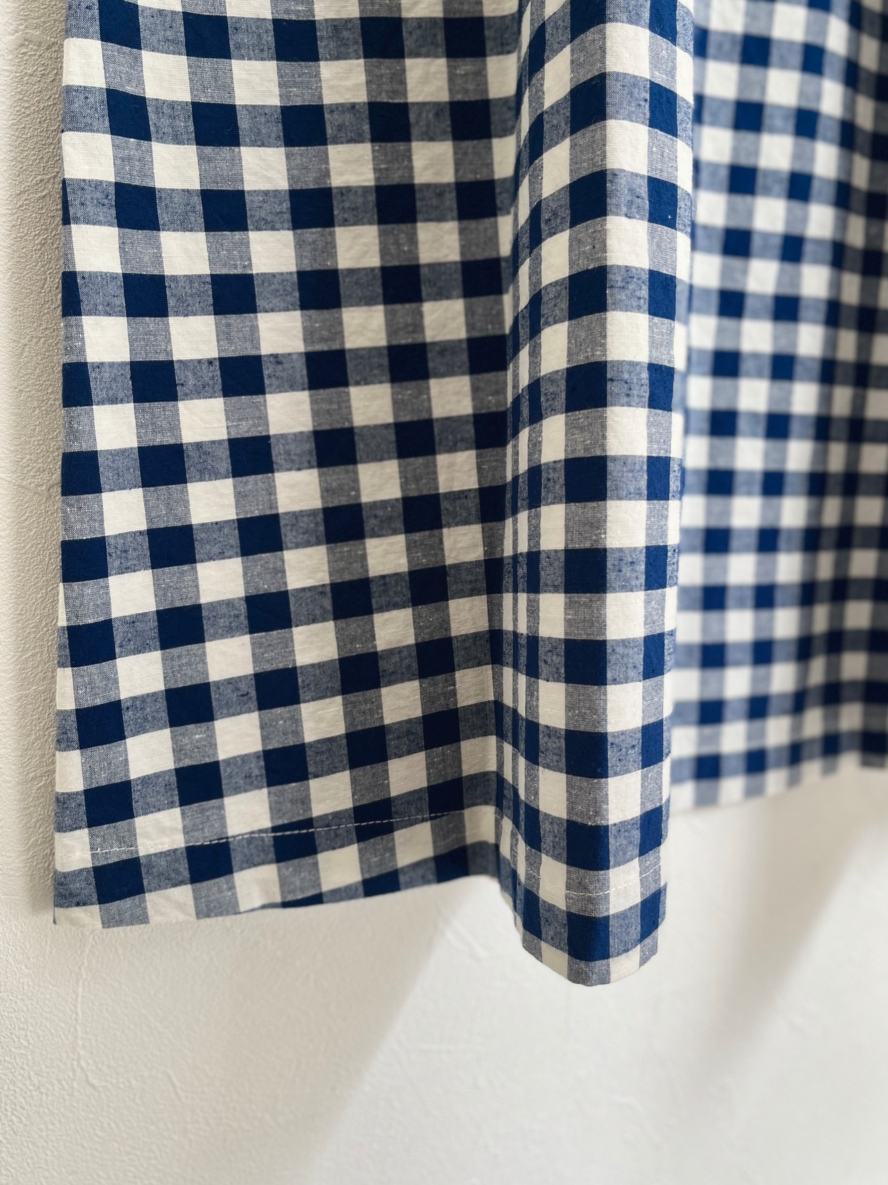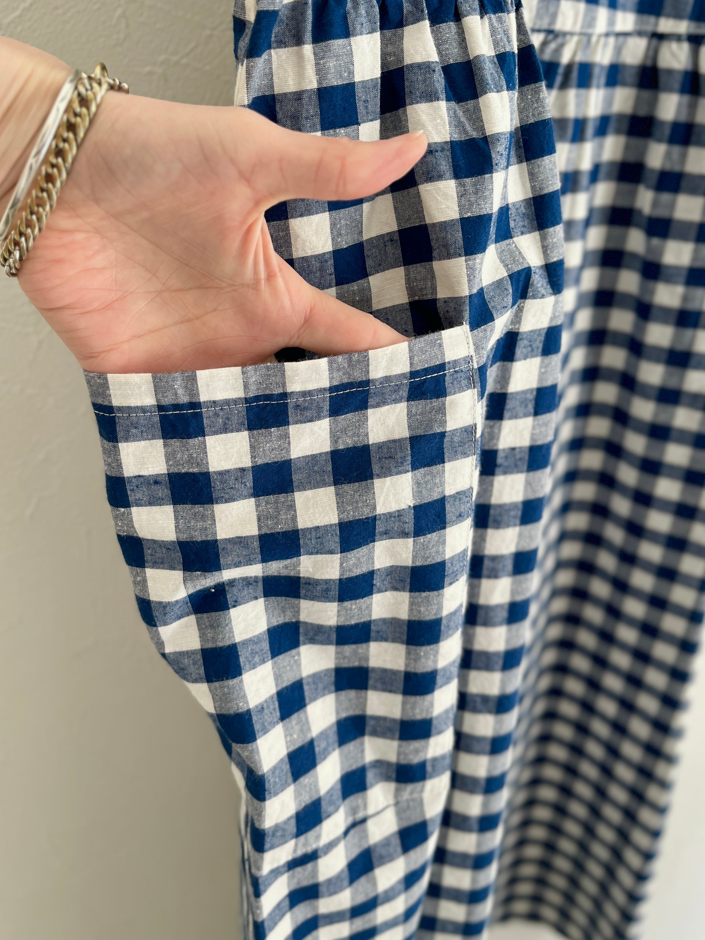 絶妙な大きさの格子柄で程よい甘さのギンガムチェック(アオ)と清涼感がありながらも落ち着いたコンのオリジナルテキスタイル。