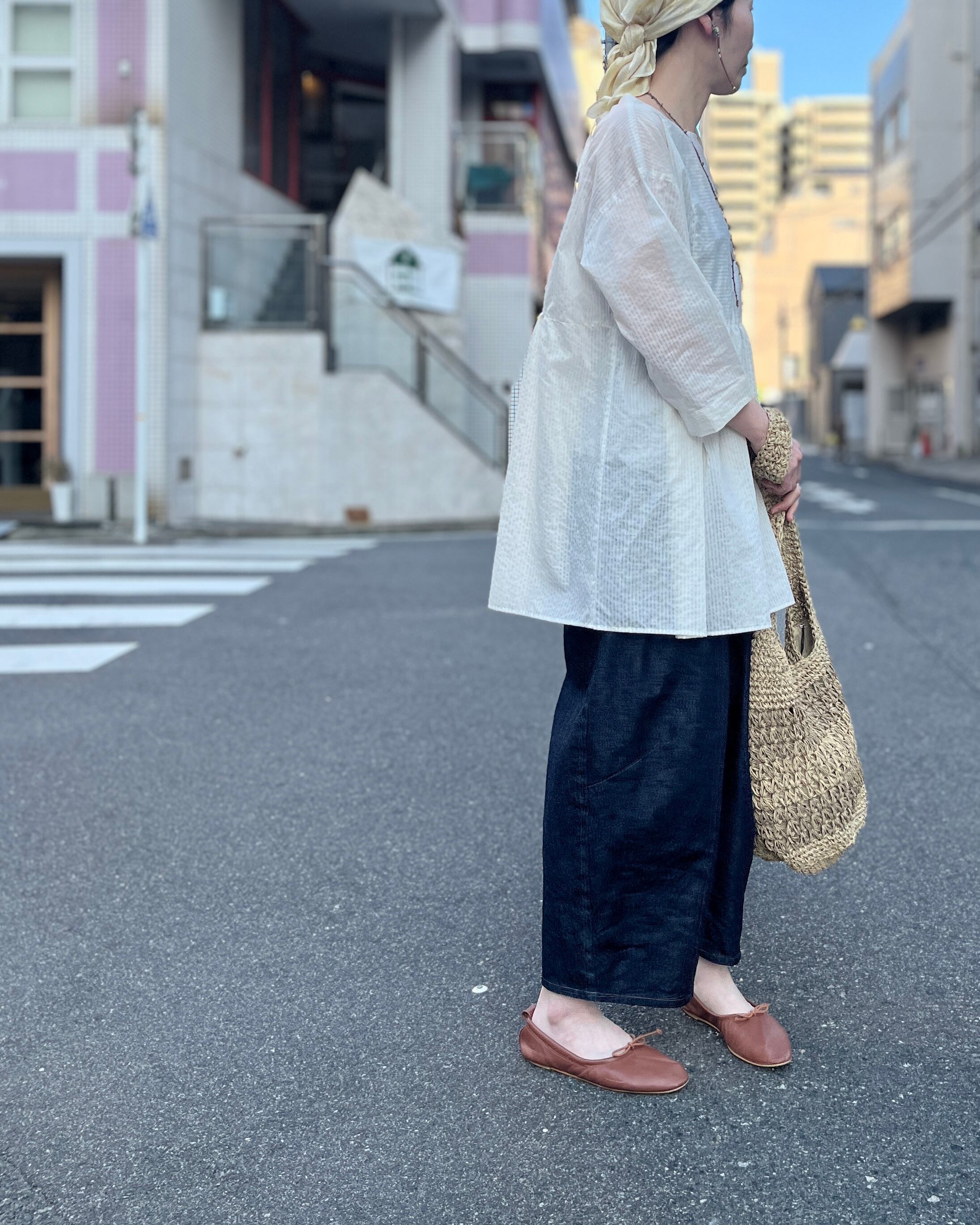 胸下の切り替えからたっぷりと入れたギャザーが、素材の軽やかさと程よい張りを活かし、ふわりとした美しいシルエットを描きます。