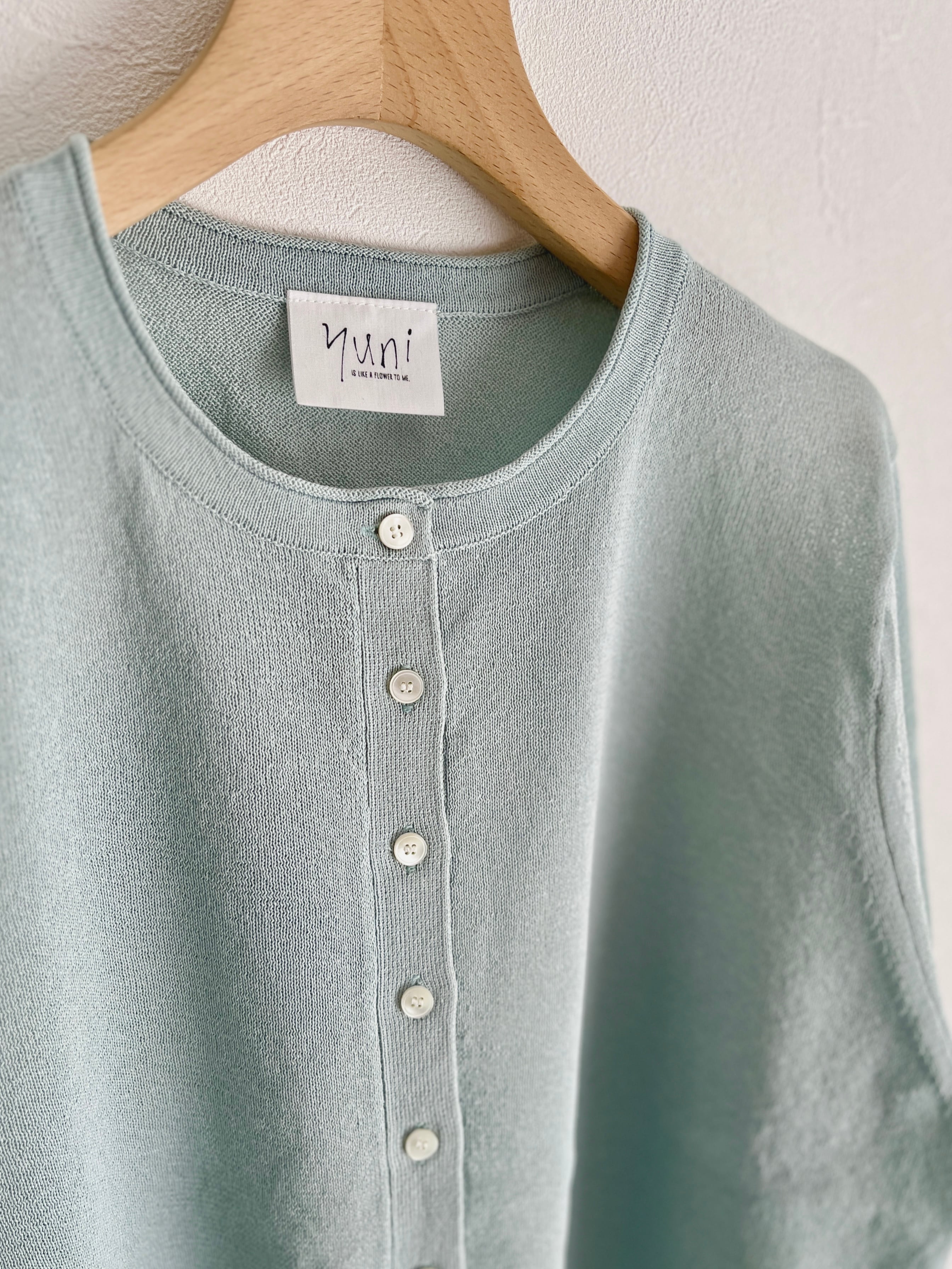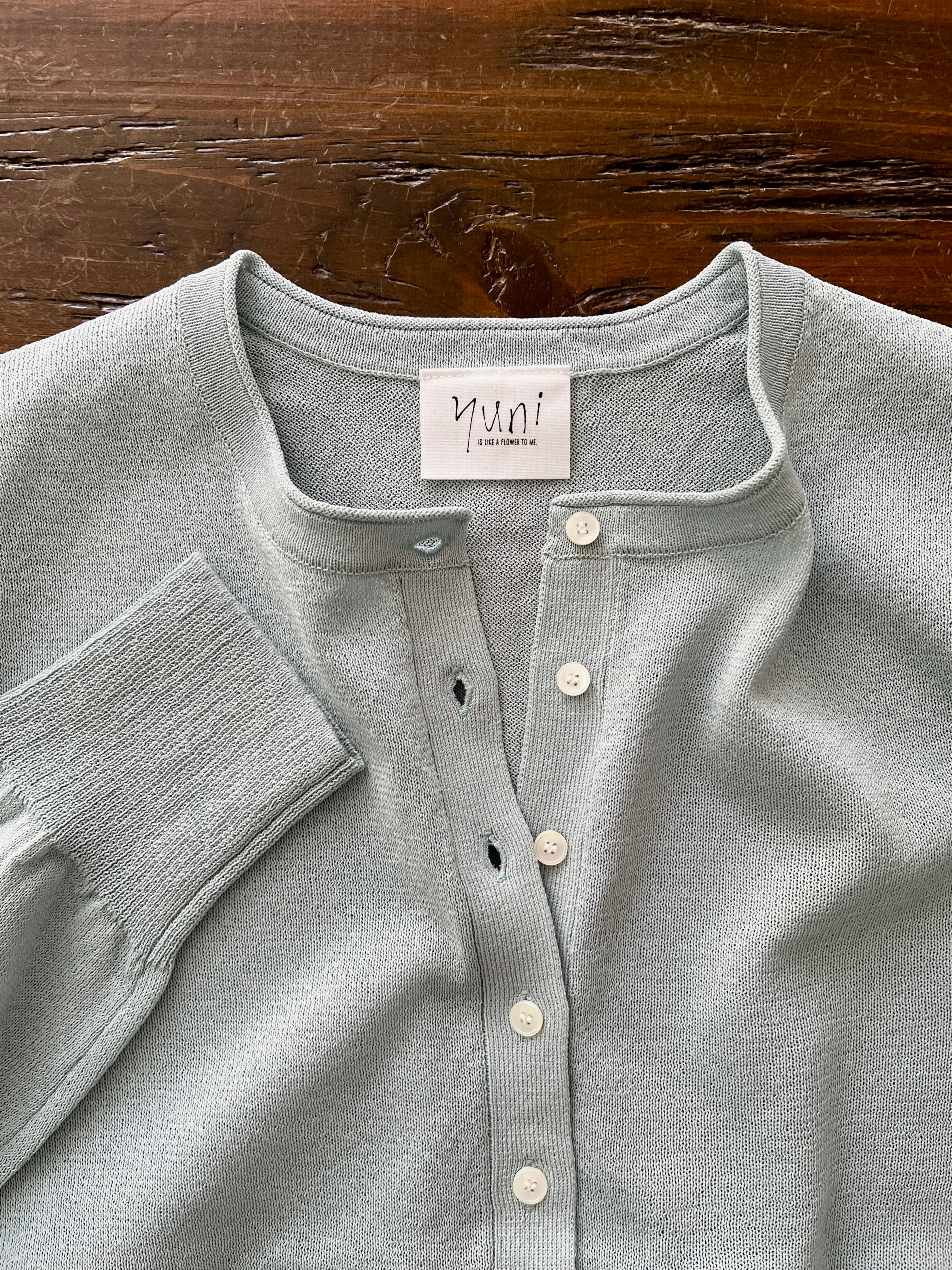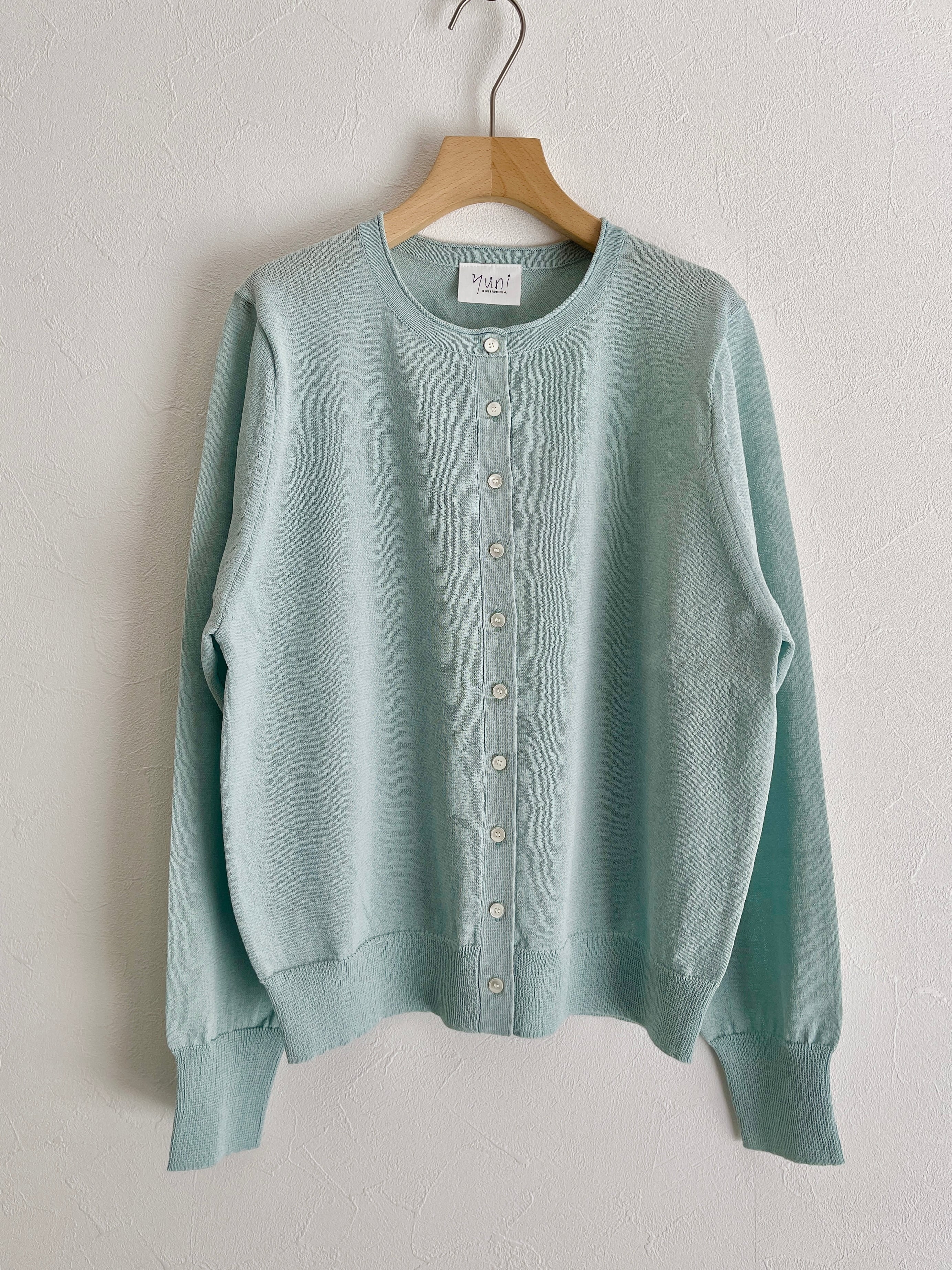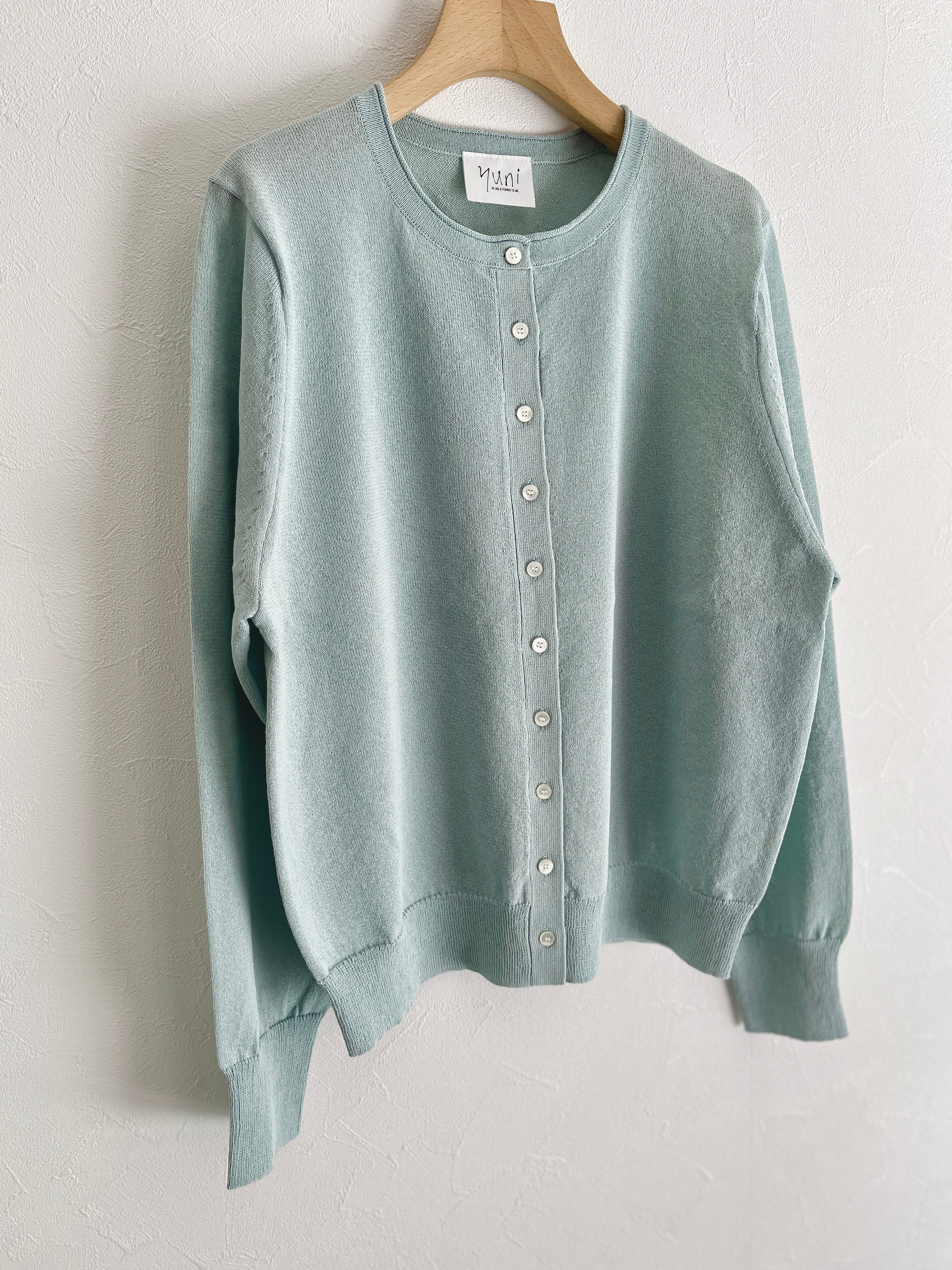 定番の丸首カーディガンも、紙素材が加わることでぐっと表情豊かになりました。