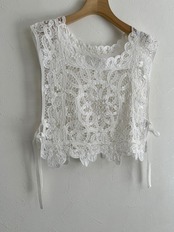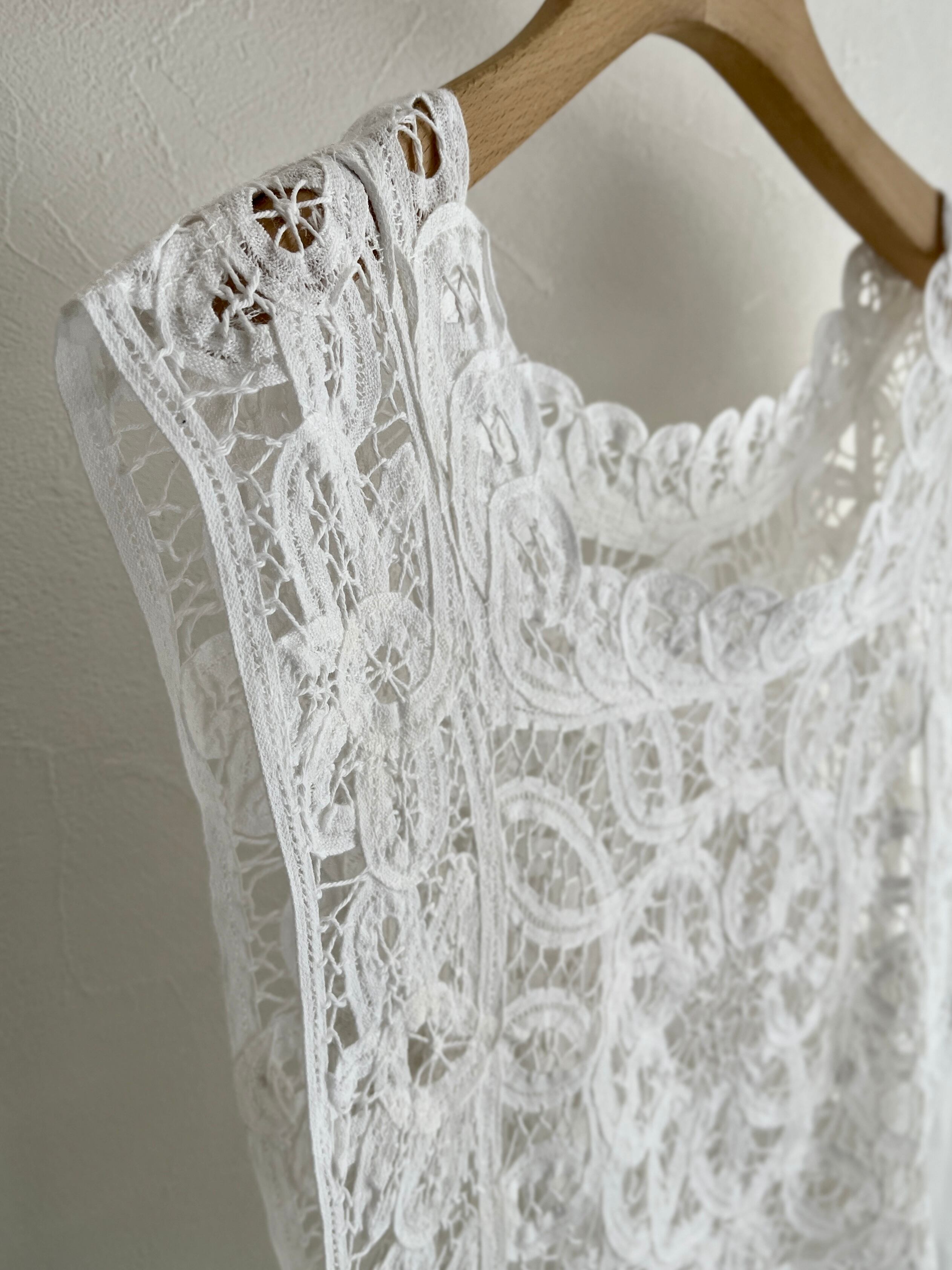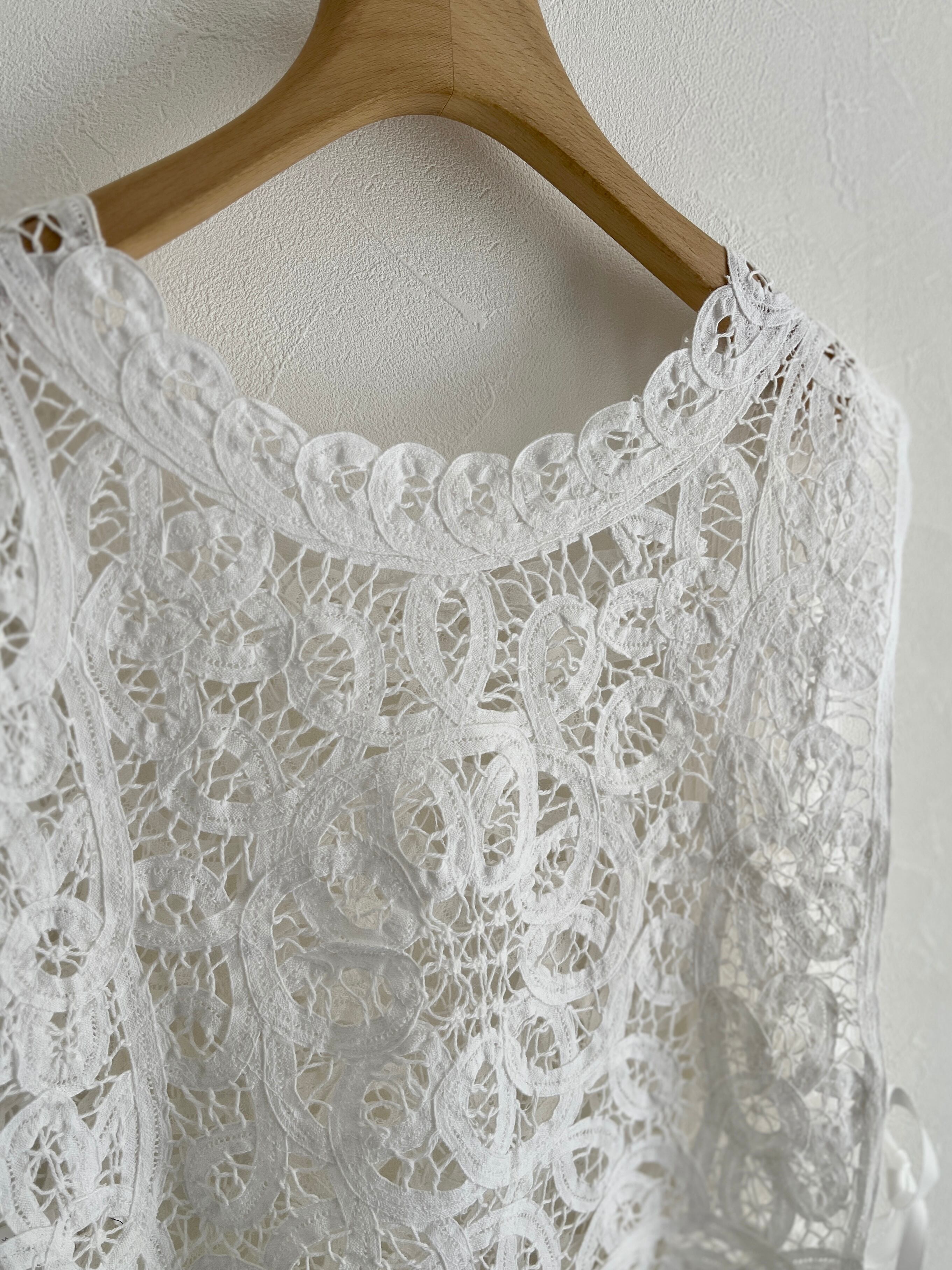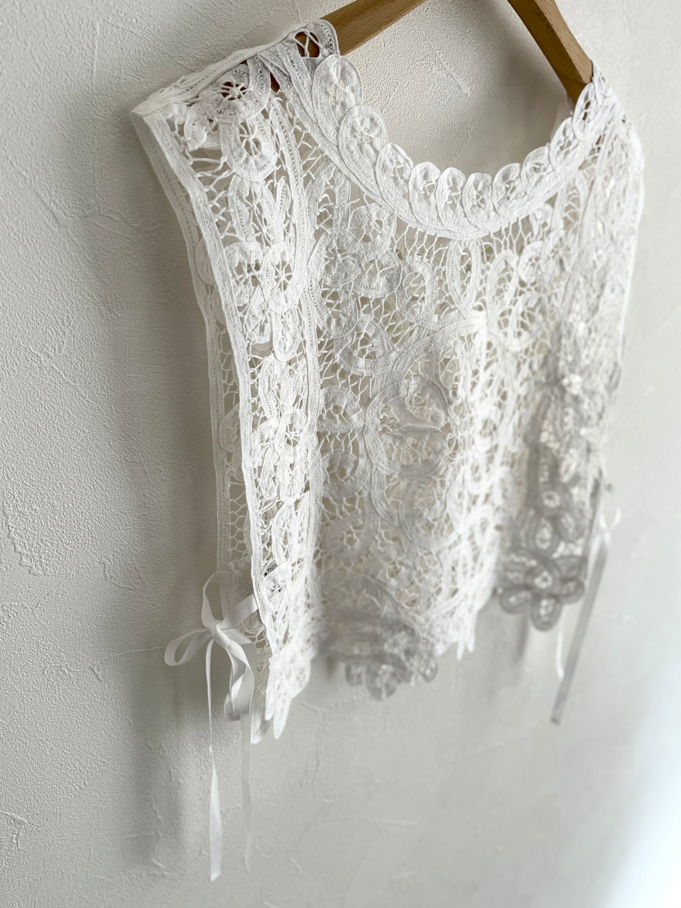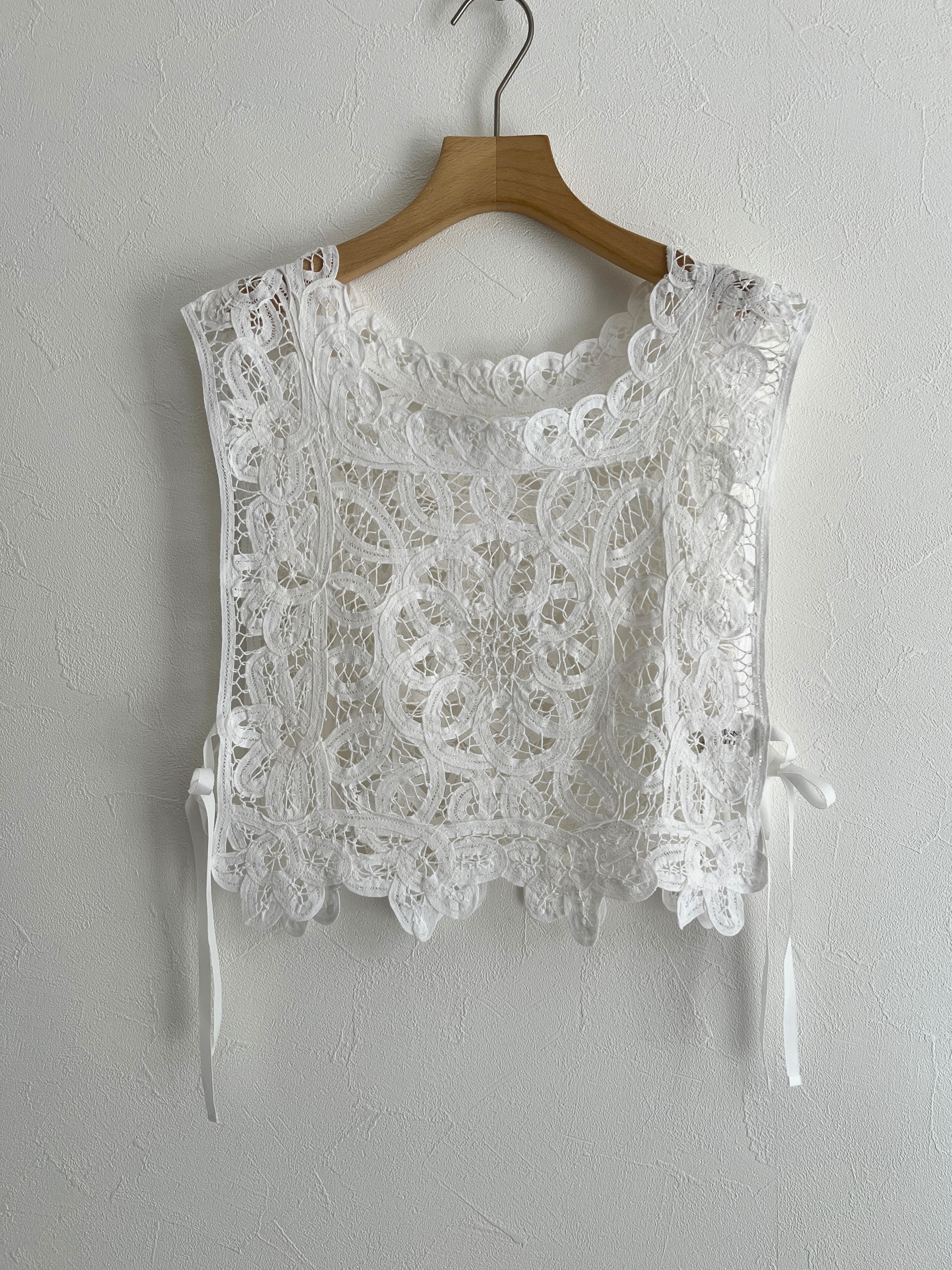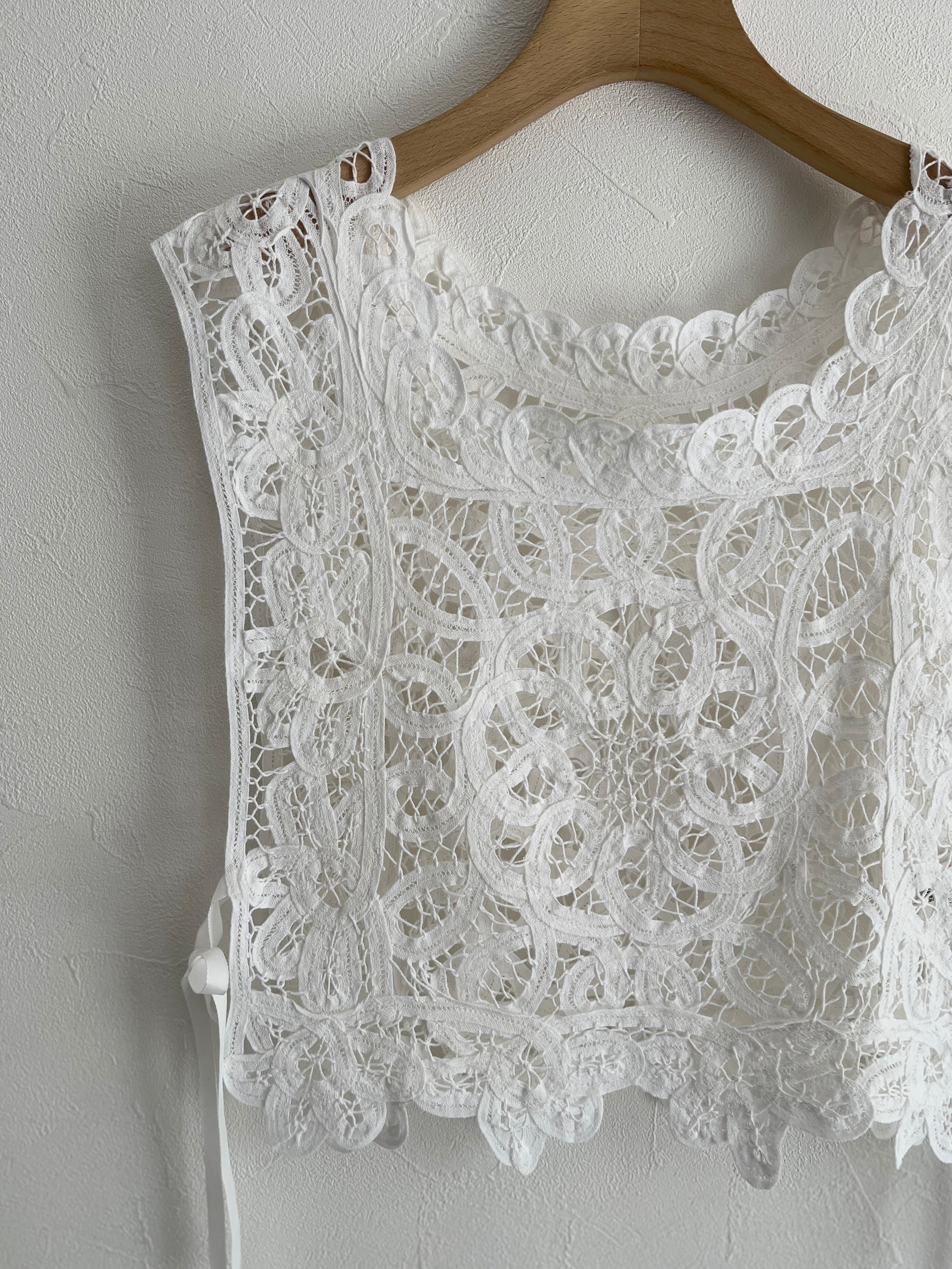繊細なバテンレースを使用したヴィンテージライクなレースベスト。