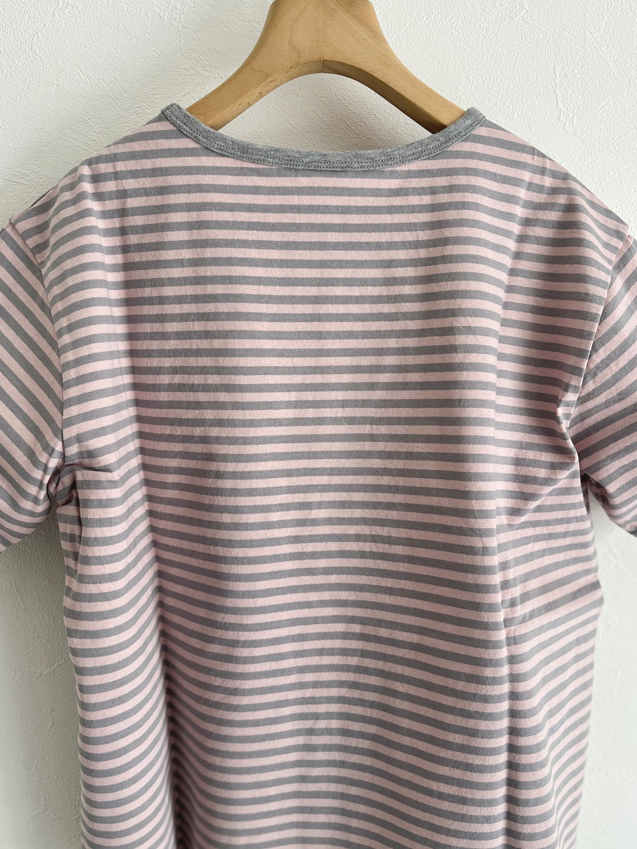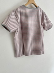 襟と袖口のバインダーがフレンチなイメージ。シャツやカーディガンとの重ね着もしやすいベーシックなシルエットの半袖ですが、一枚着として着やすいよう、袖や身幅の太さ、肩の落ち感などボディラインに沿わないややゆとりを持たせたサイズ感に仕上げました。こちらのシリーズはハリのあるやや硬めの生地感ながらも、どんなシーズンにも着やすい厚みが使いやすい。