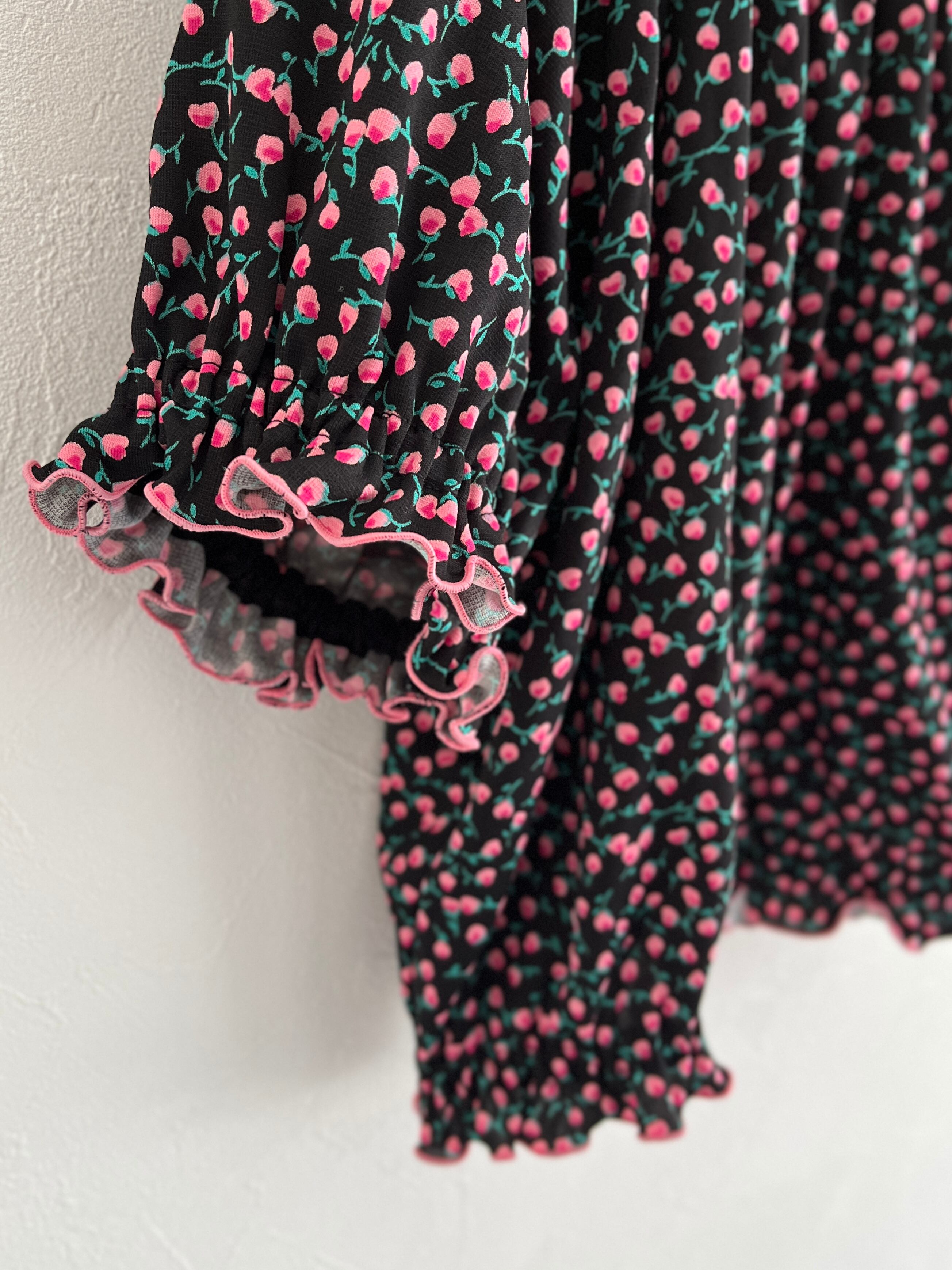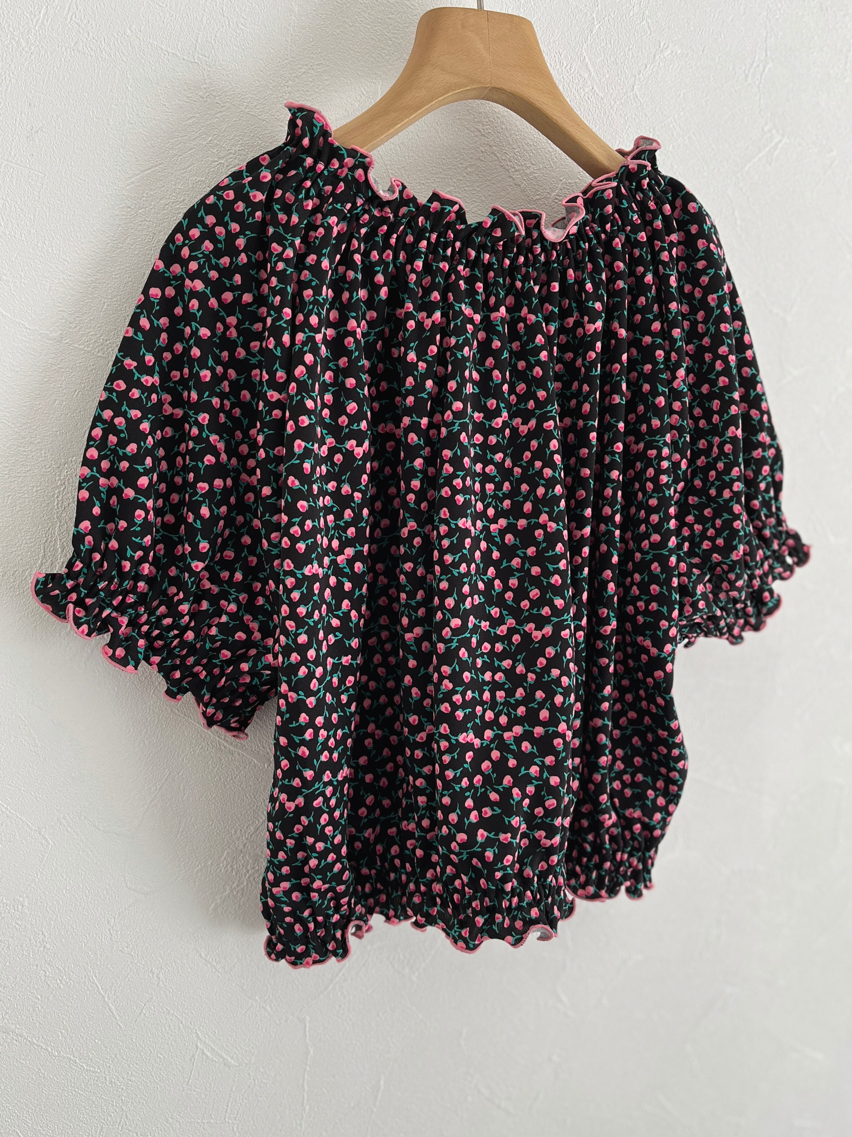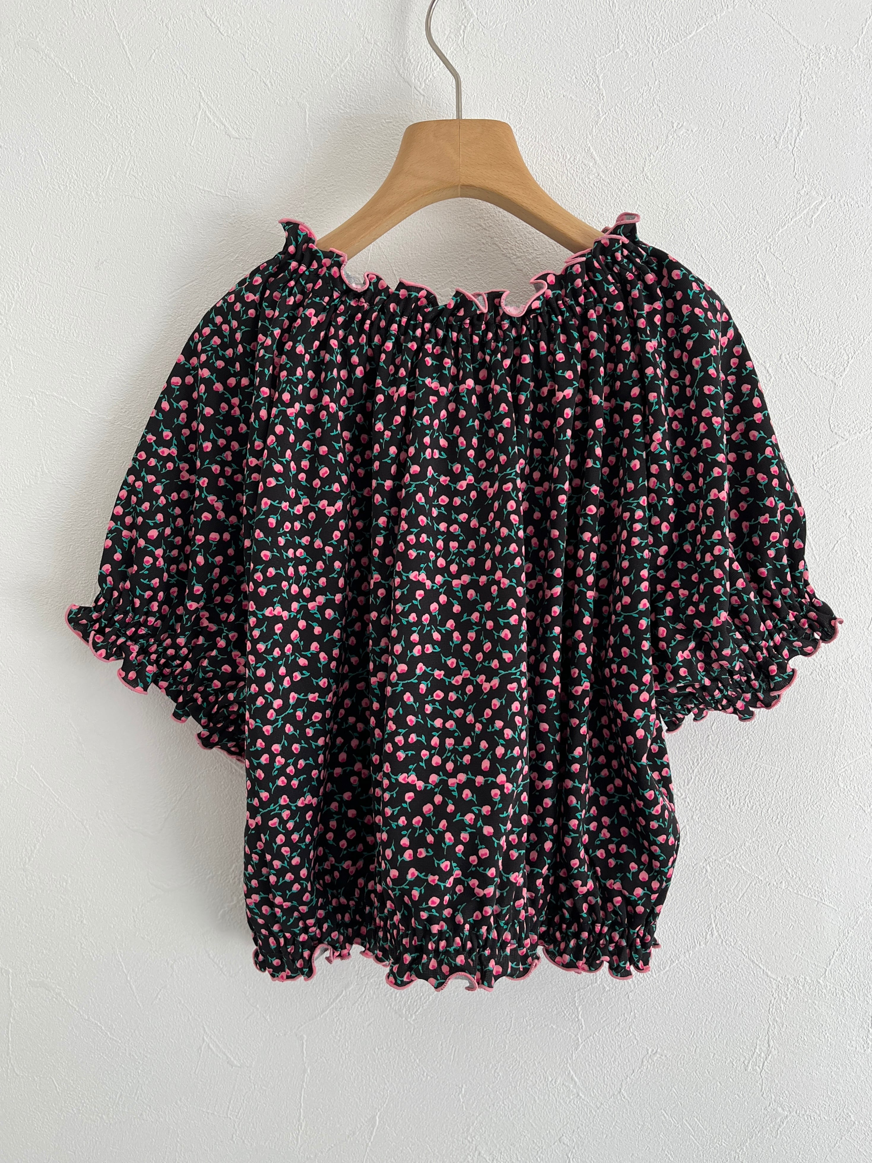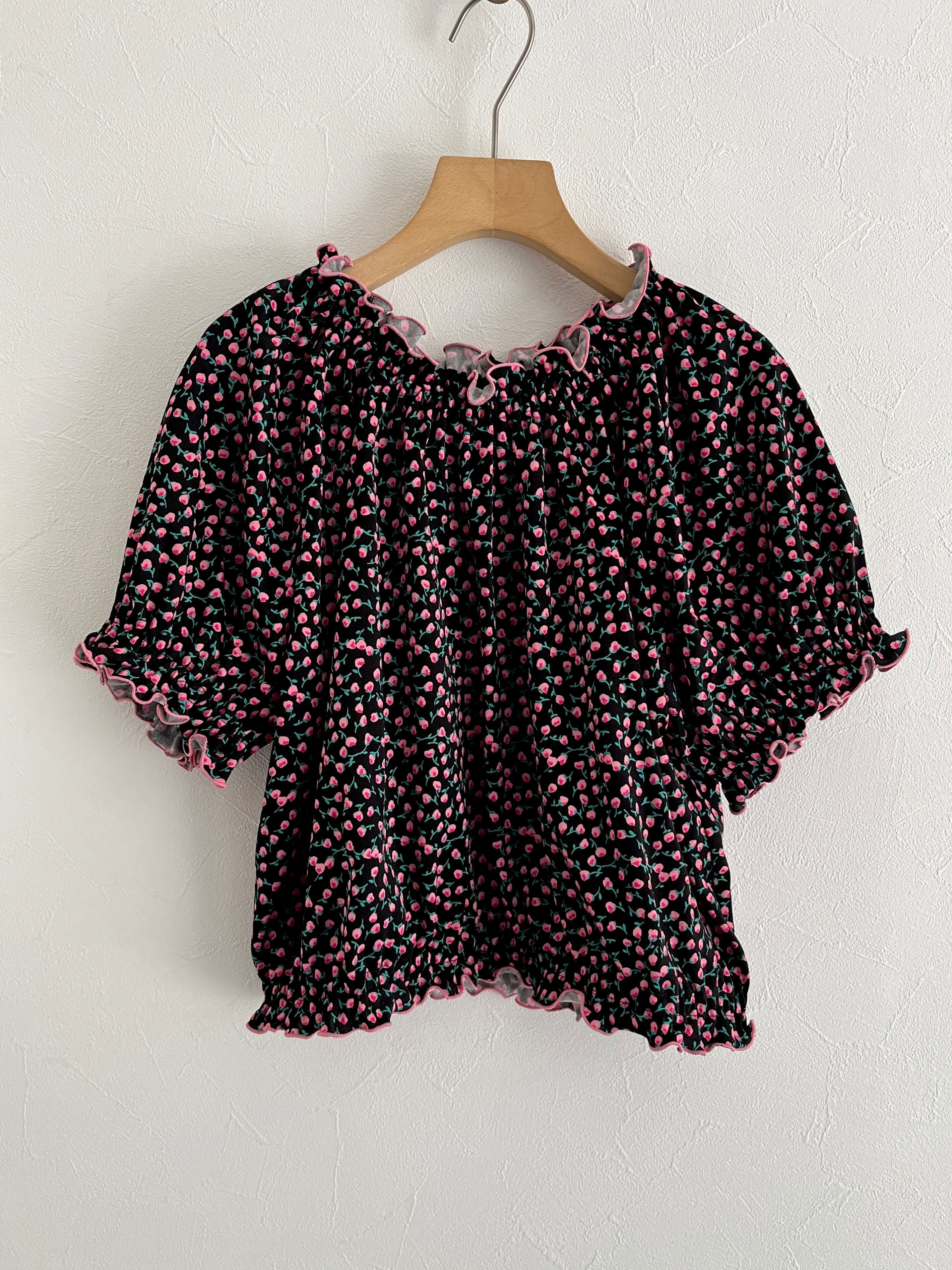小さなお花が鮮やかにプリントされたパフスリーブブラウス。