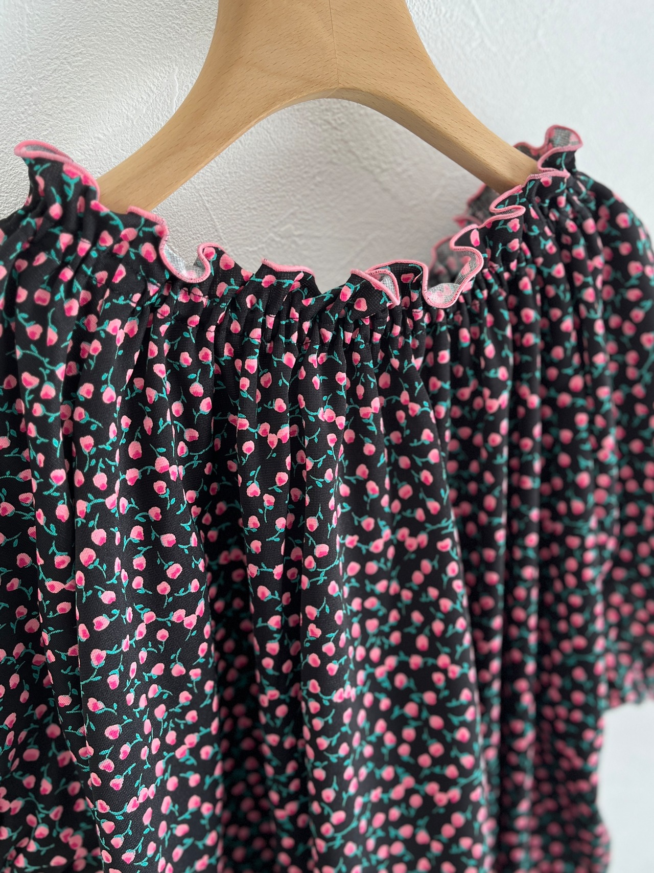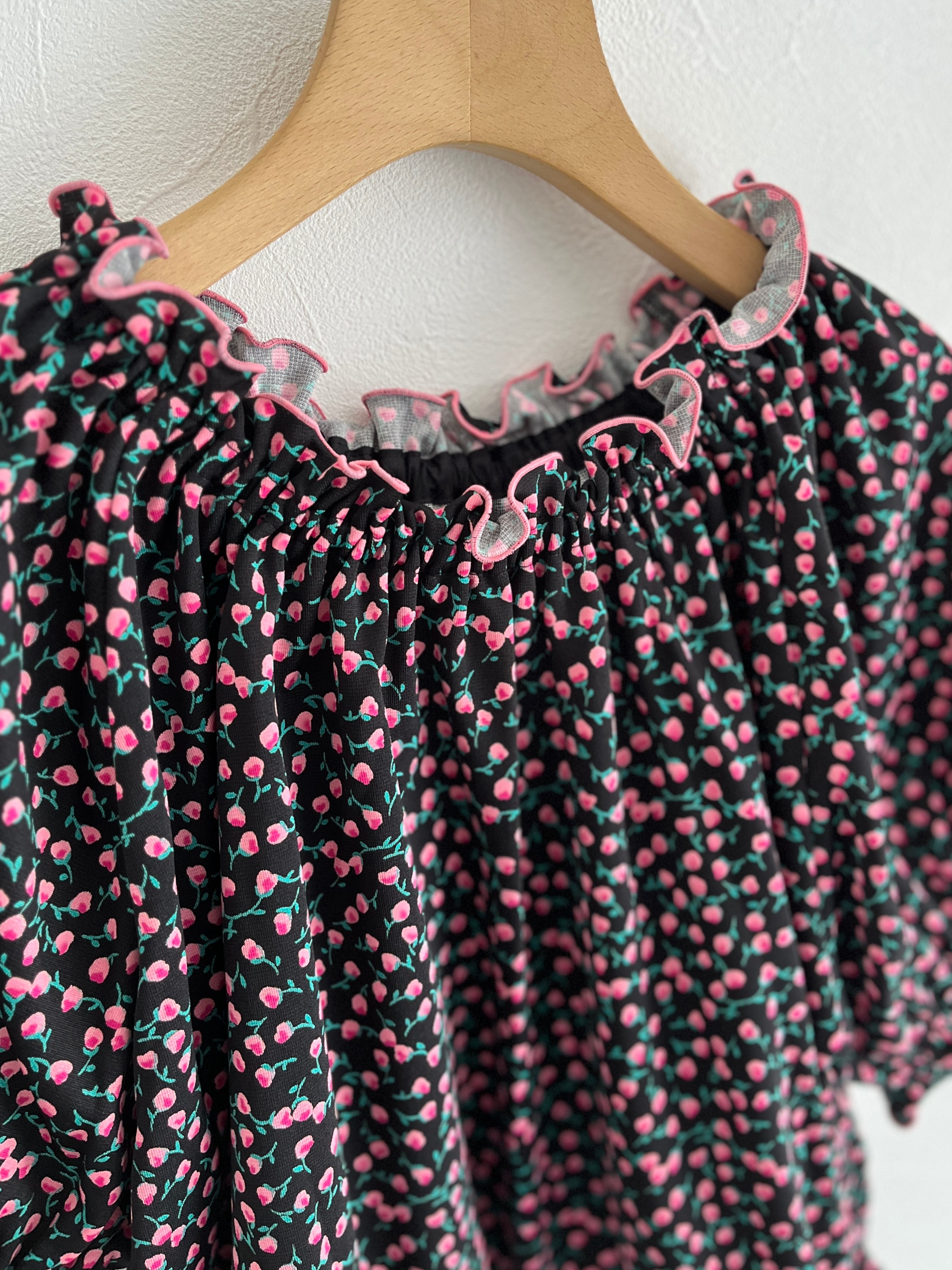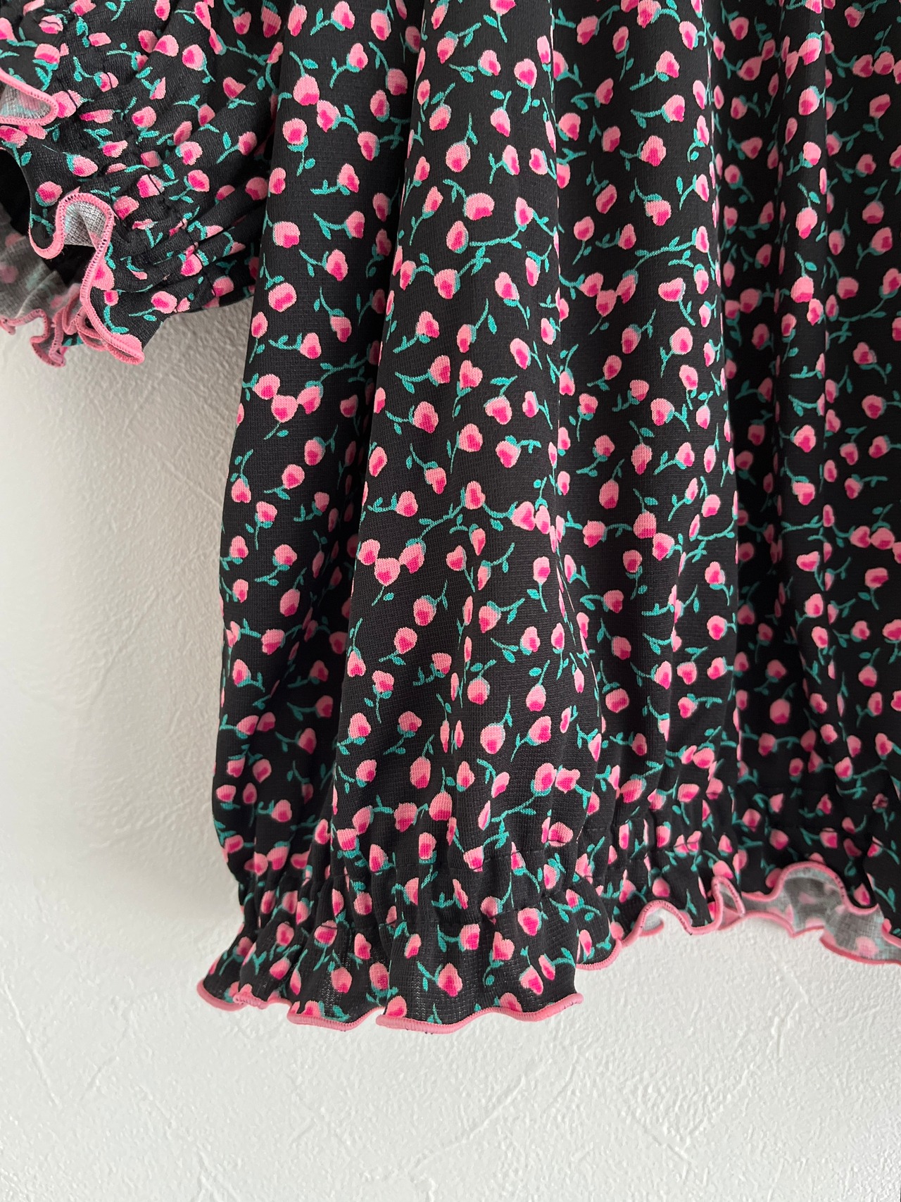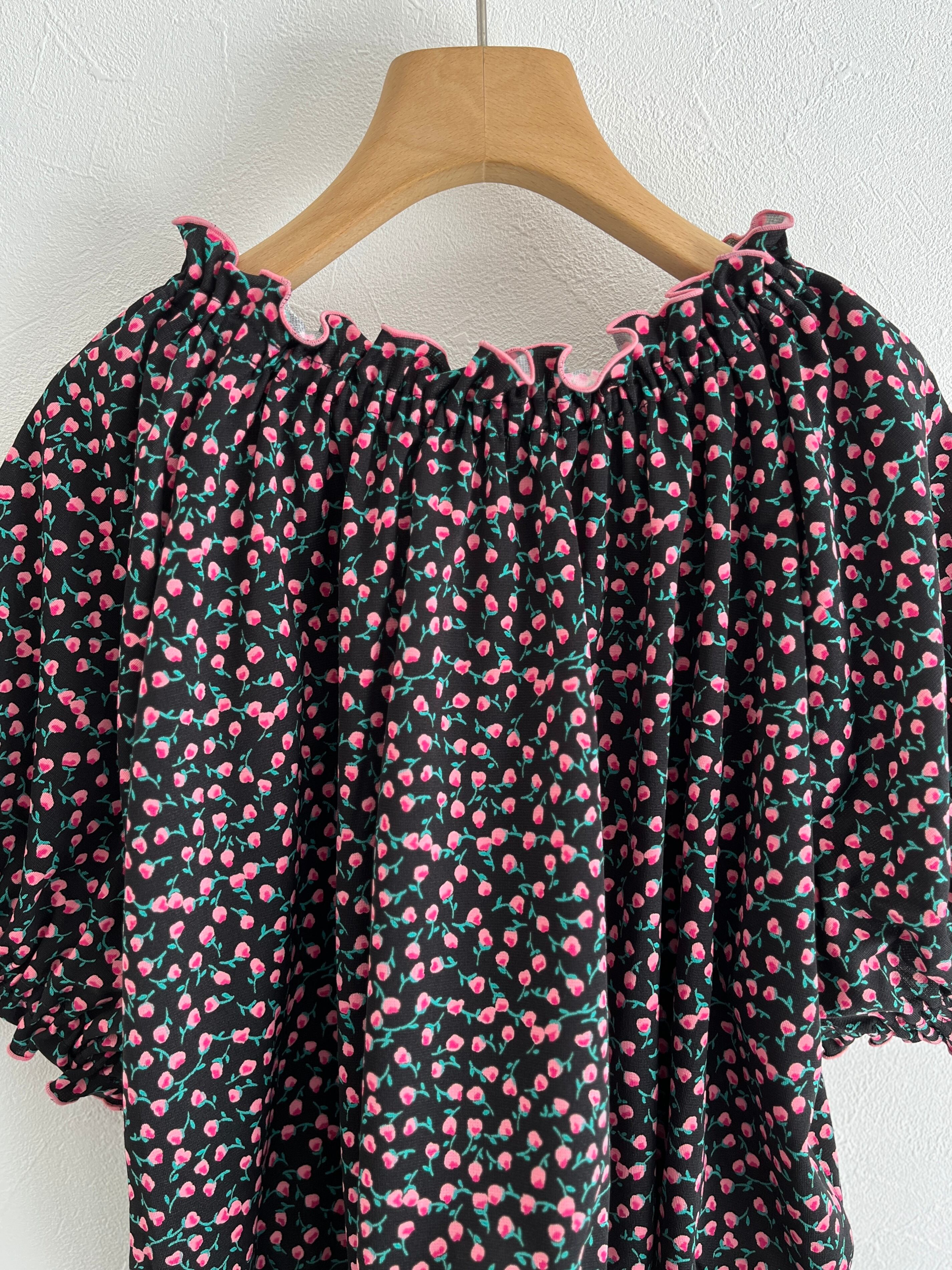 小さなお花が鮮やかにプリントされたパフスリーブブラウス。