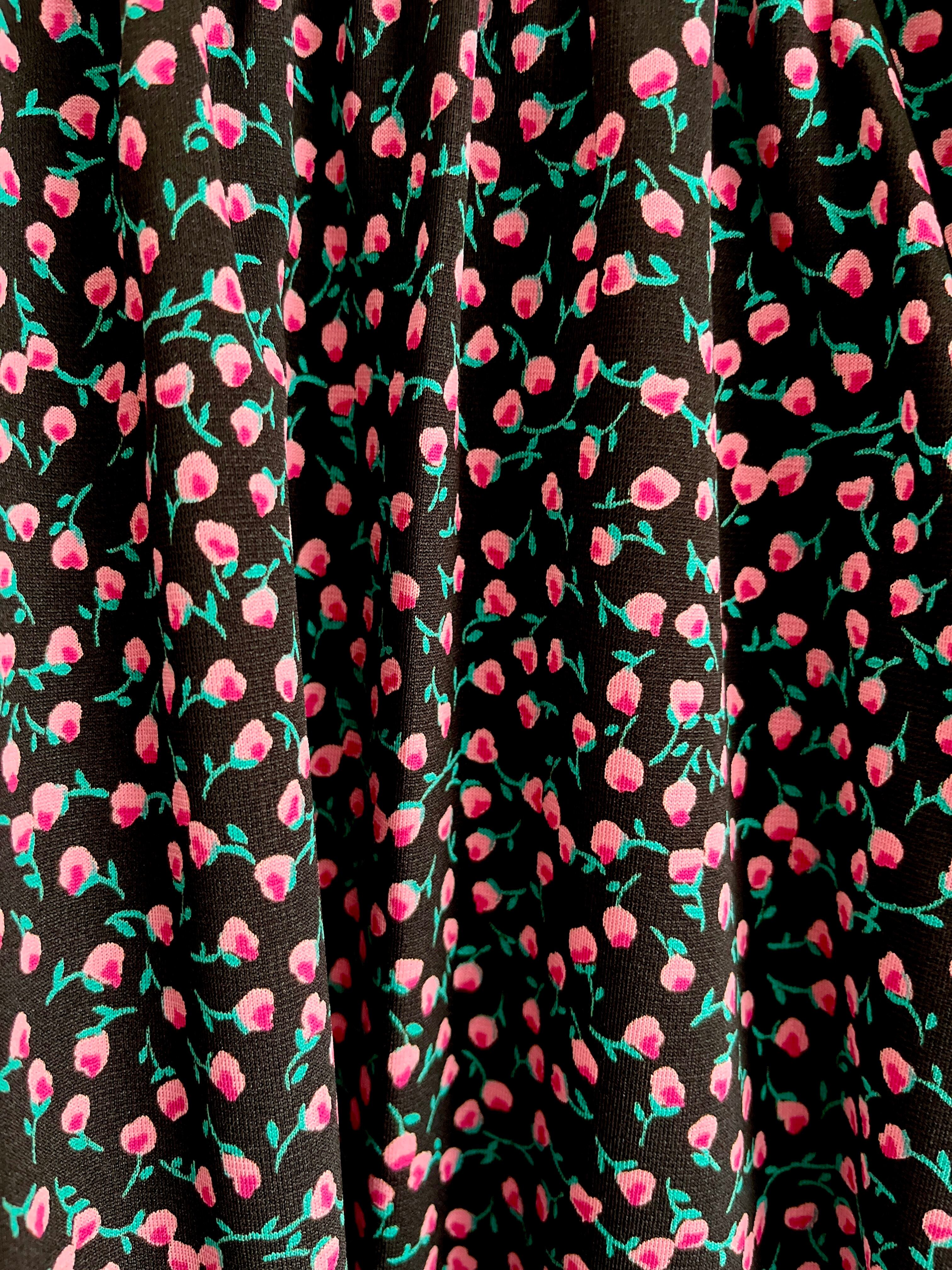 可憐な小さなバラをカジュアルな素材にプリントすることで、古着のようなレトロな印象に仕上げました。