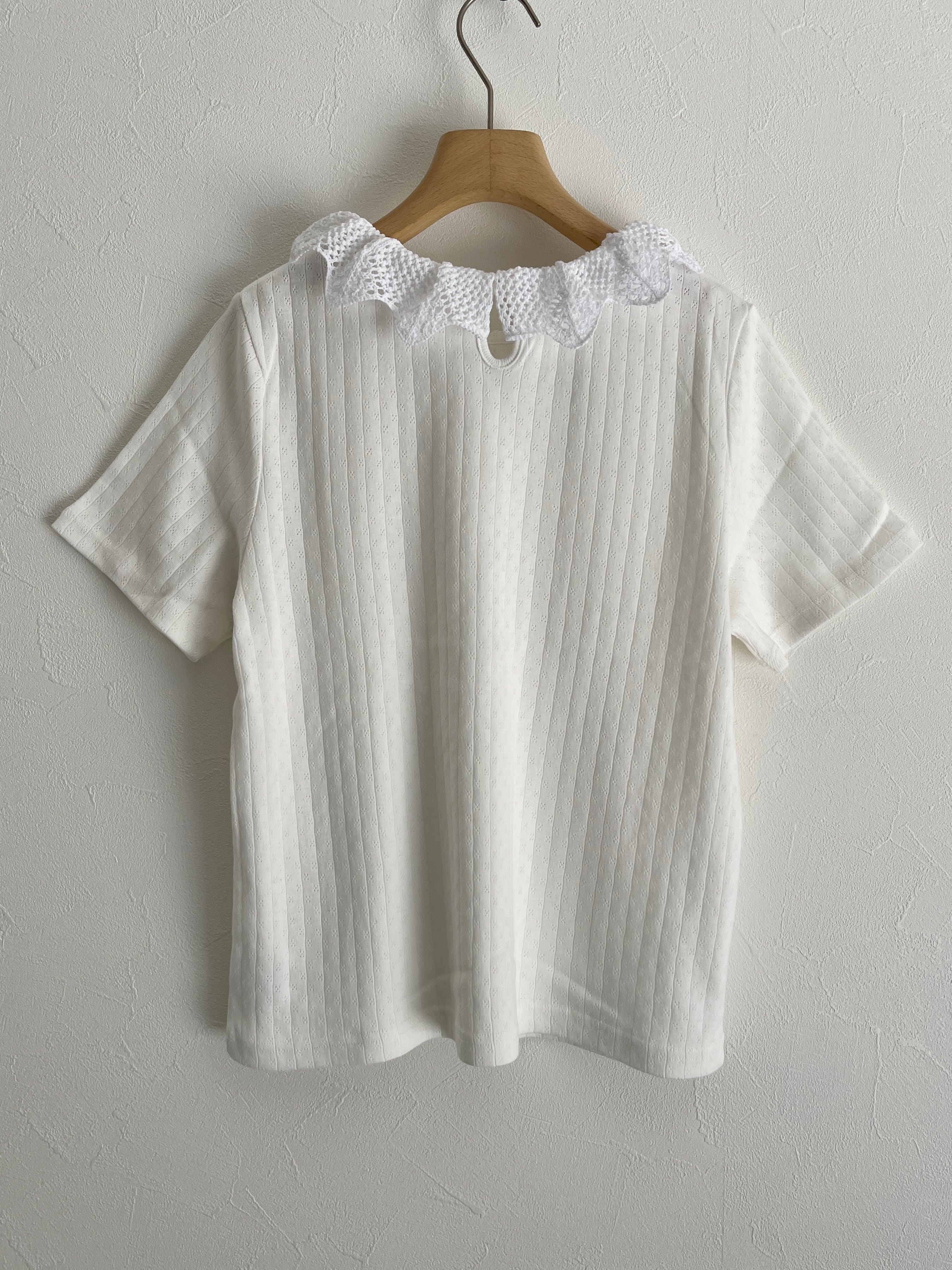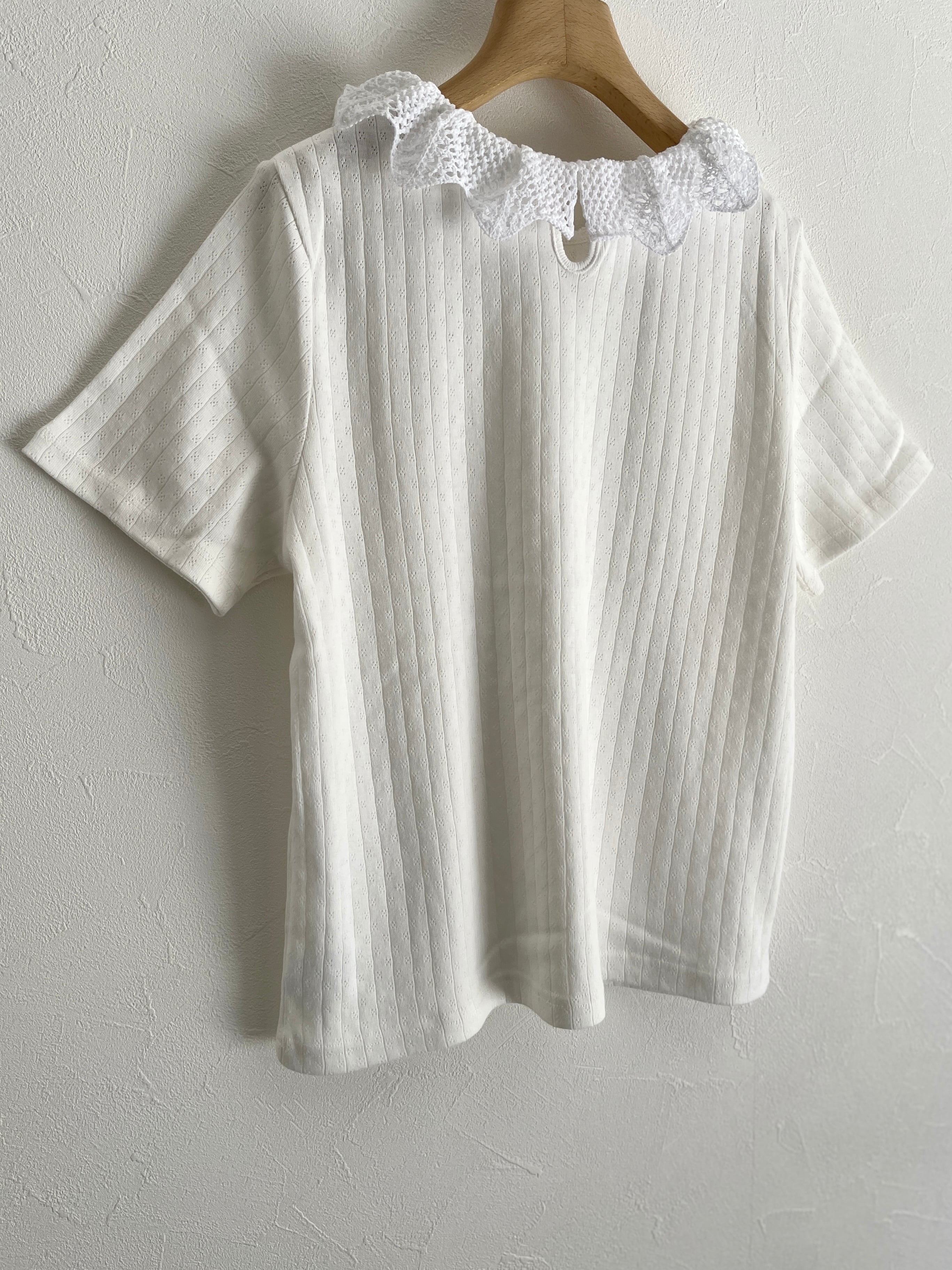 透かし編みのニット襟を針抜きのカットソーにドッキングしたTシャツ。